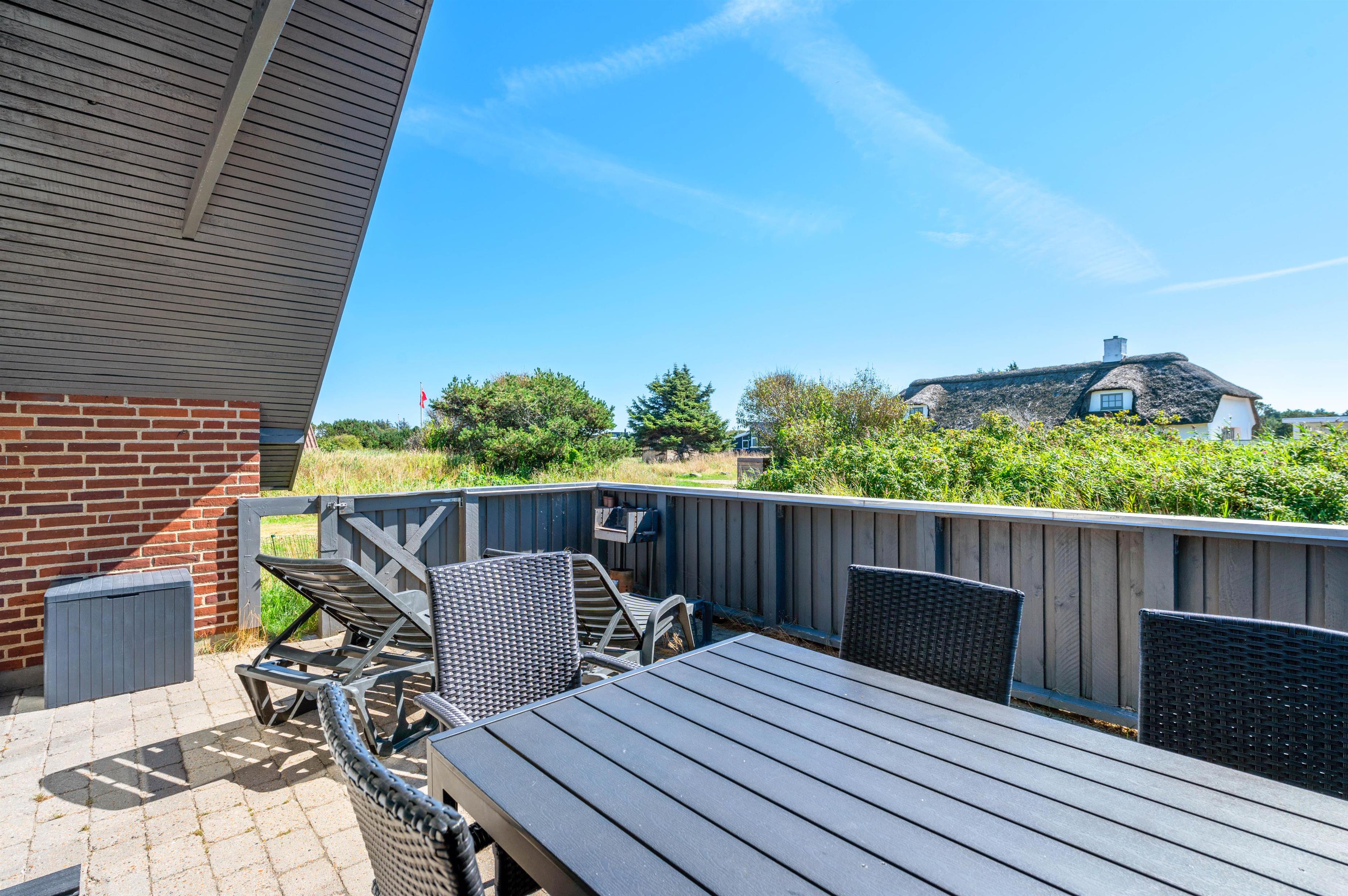 Fra det lyse opholdsrum har I direkte adgang til en af husets terrasser, som er både lukket og afskærmet. Her kan hundene løbe frit omkring, uden at I behøver at frygte, at de stikker af. Der er endda lavet en lille åbning i hegnet, så hundene kan følge med i, hvad der sker ude i den vestjyske natur.