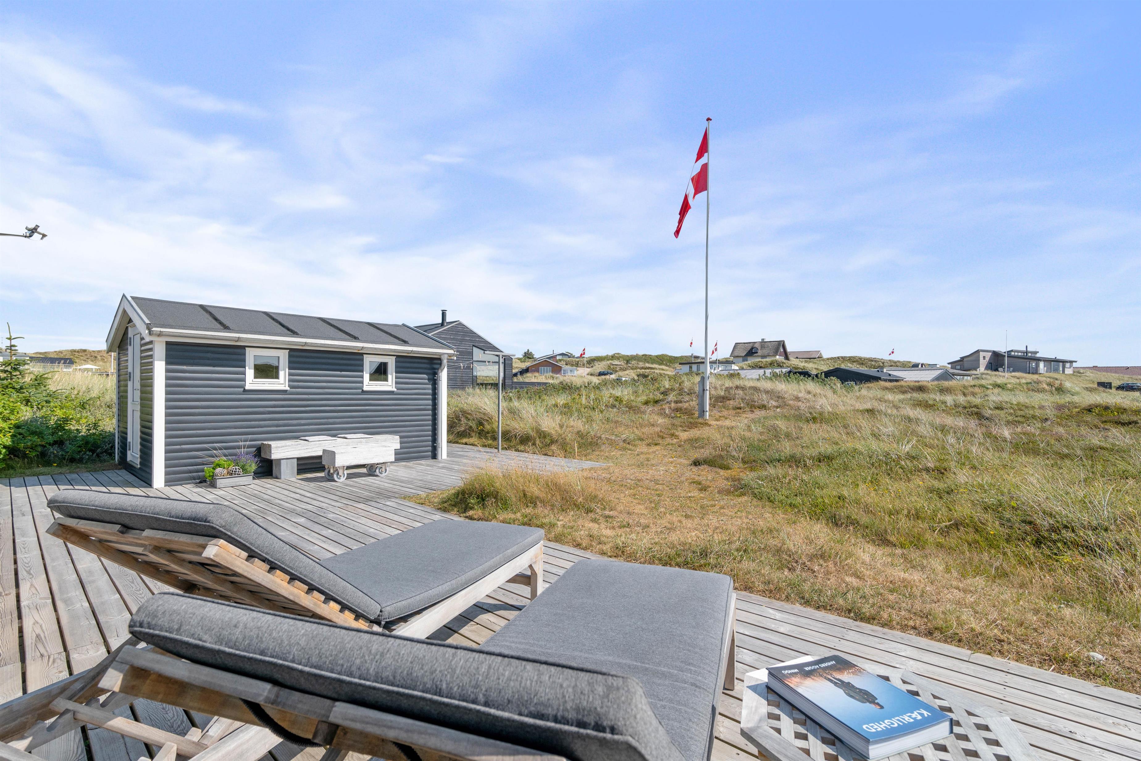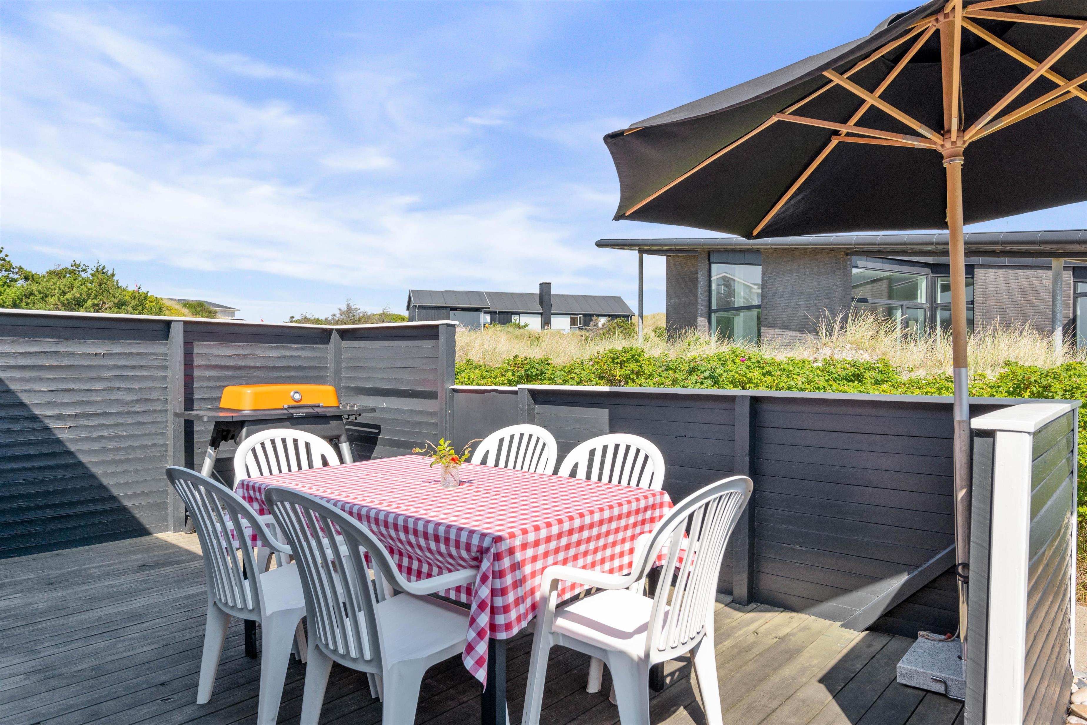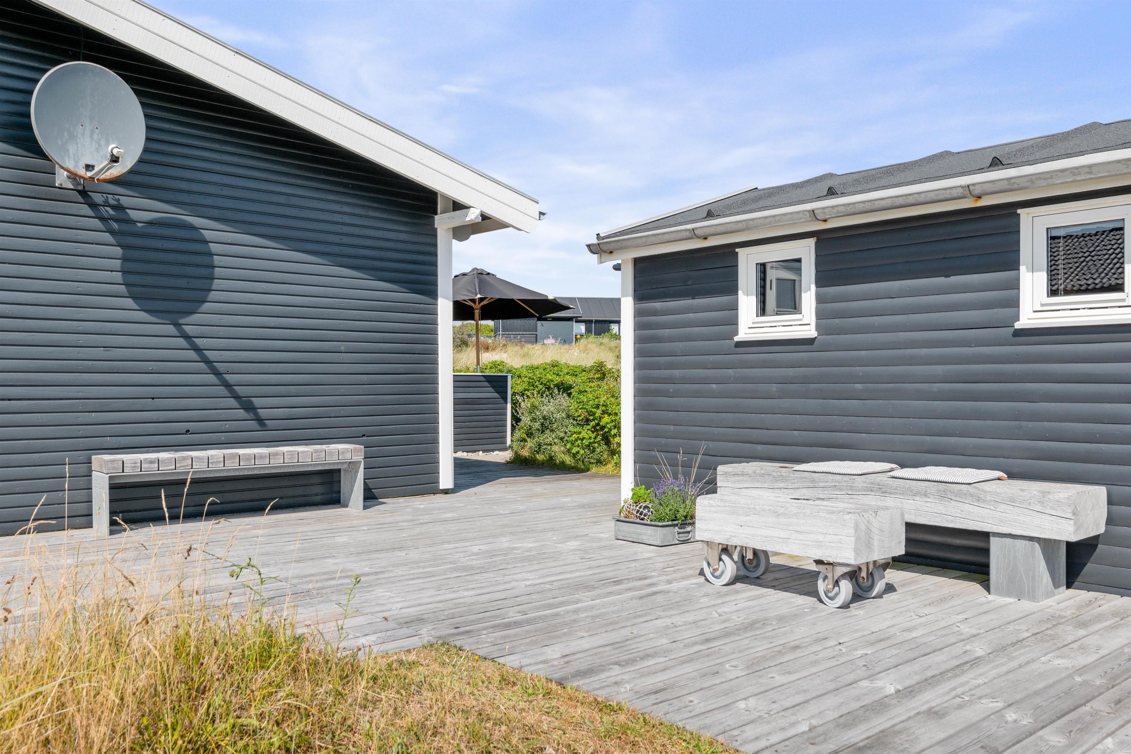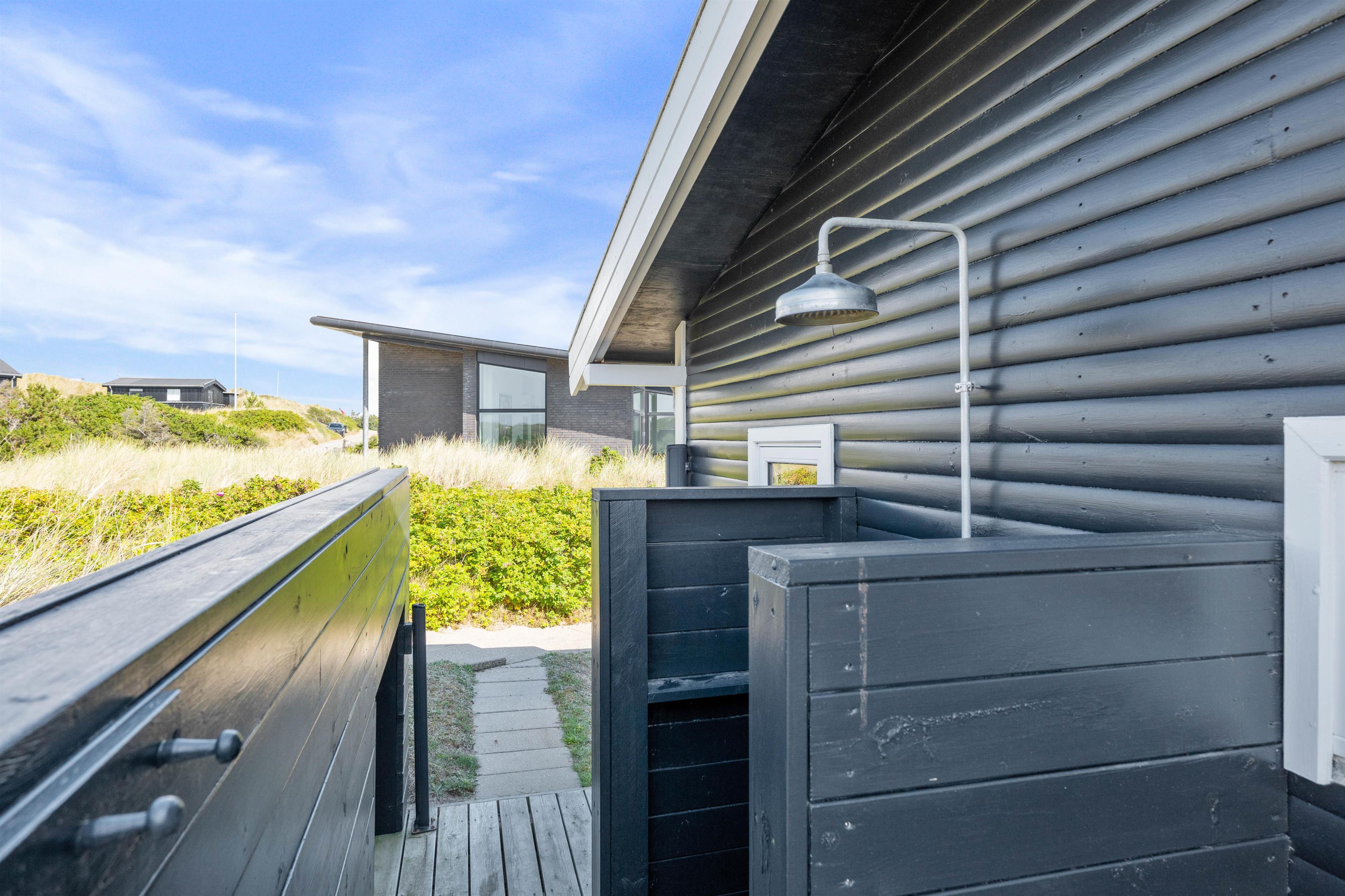 Udover den afskærmede og lukkede terrasse, så kan I også følge træterrassen hele vejen rundt om huset, og finde flere forskellige hyggelige lækroge, hvor I på de gode sommerdage kan sætte jer til rette med en god bog og noget koldt til ganen. En praktisk udebruser sikrer også, at I kan skylle sandet af efter en dag på stranden. Bruseren er til benyttelse i månenderne fra april til November.