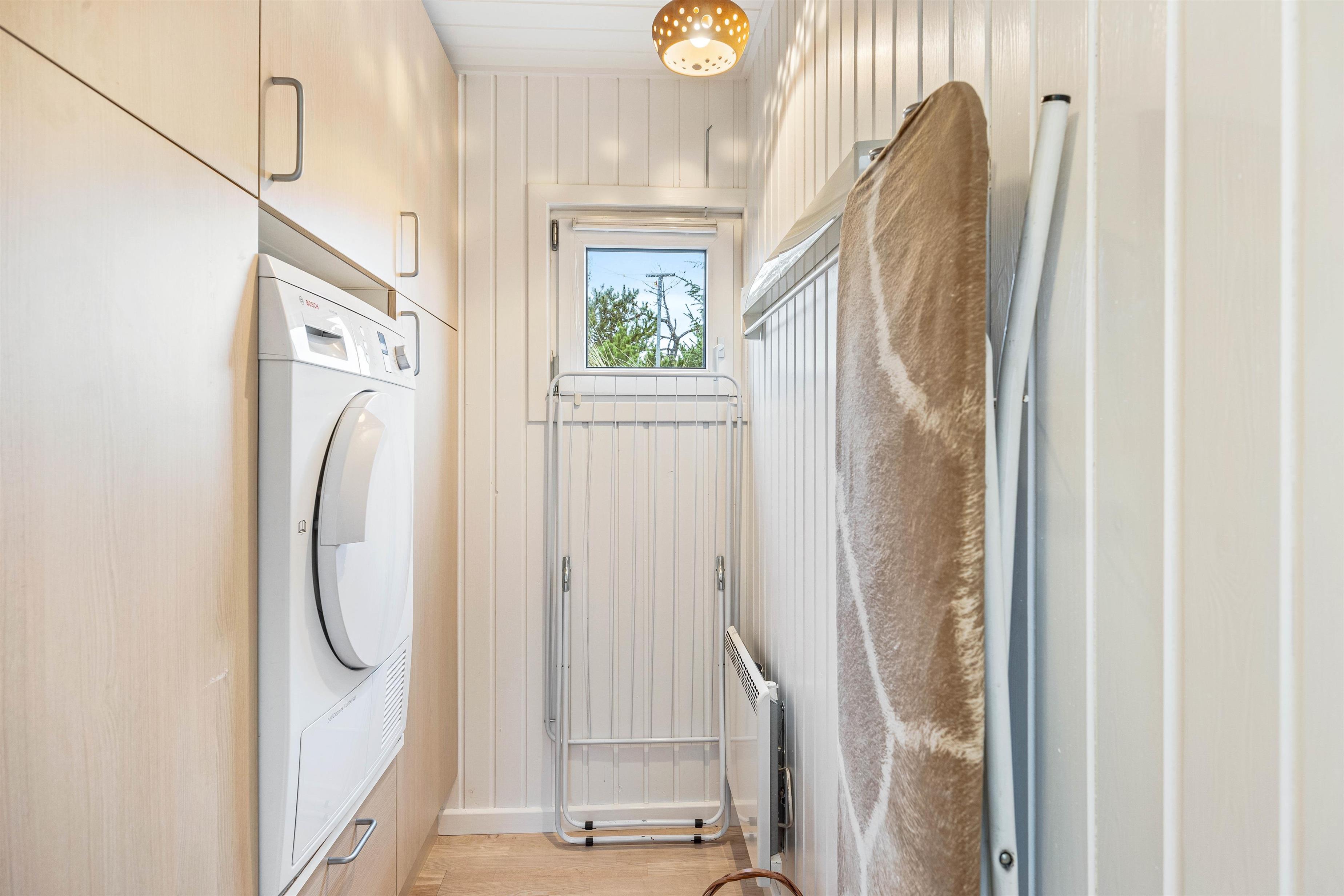 Brændeovnen i stuen giver den typiske feriehusstemning og en ekstra dosis hygge. Ved siden af brændeovnen er der installeret en energibesparende luft-til-luft-varmepumpe, som sørger for hyggelig varme. Der er installeret vaskemaskine og tørretumbler i feriehuset, så I kun behøver at tage jeres yndlingstøj med på ferie.