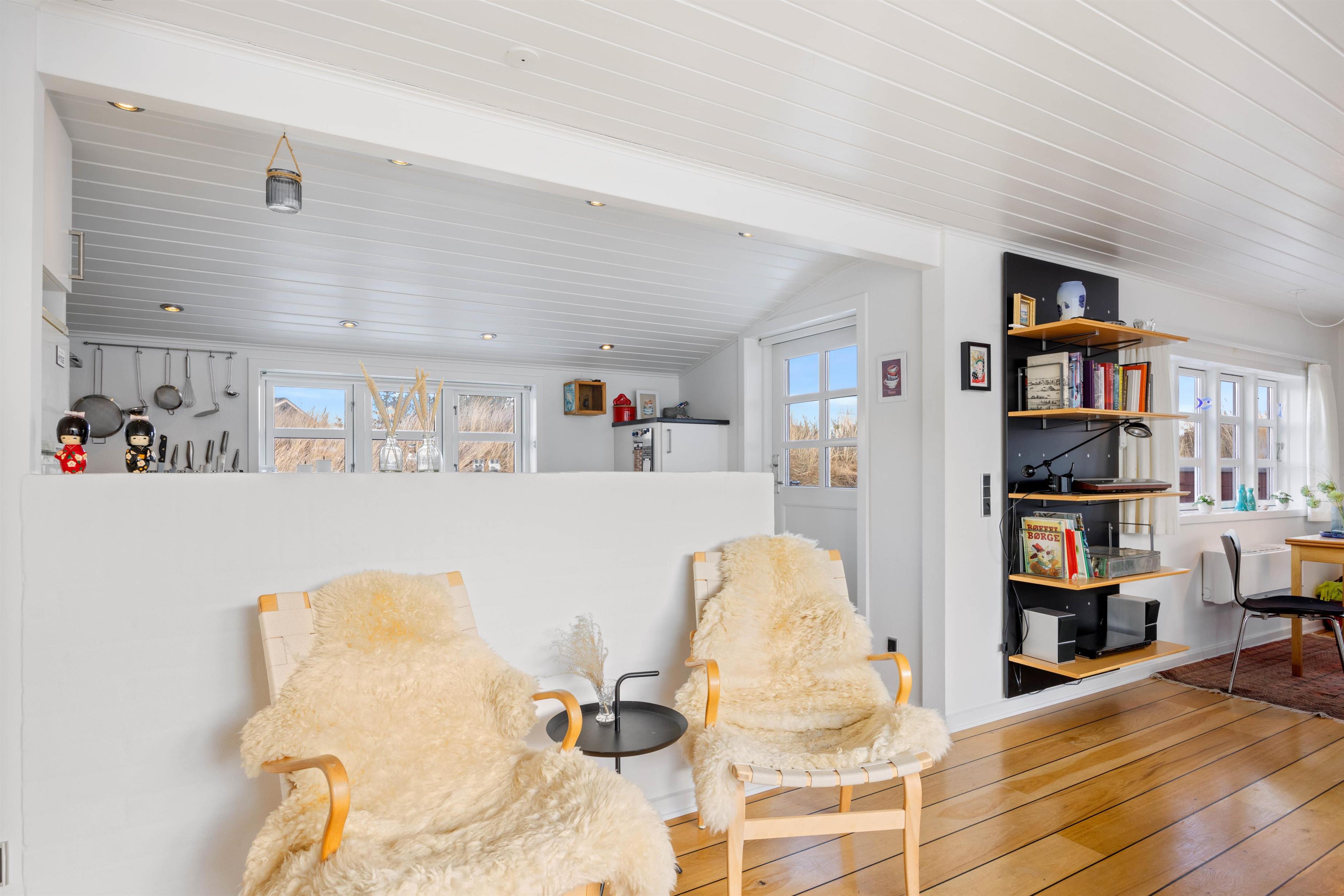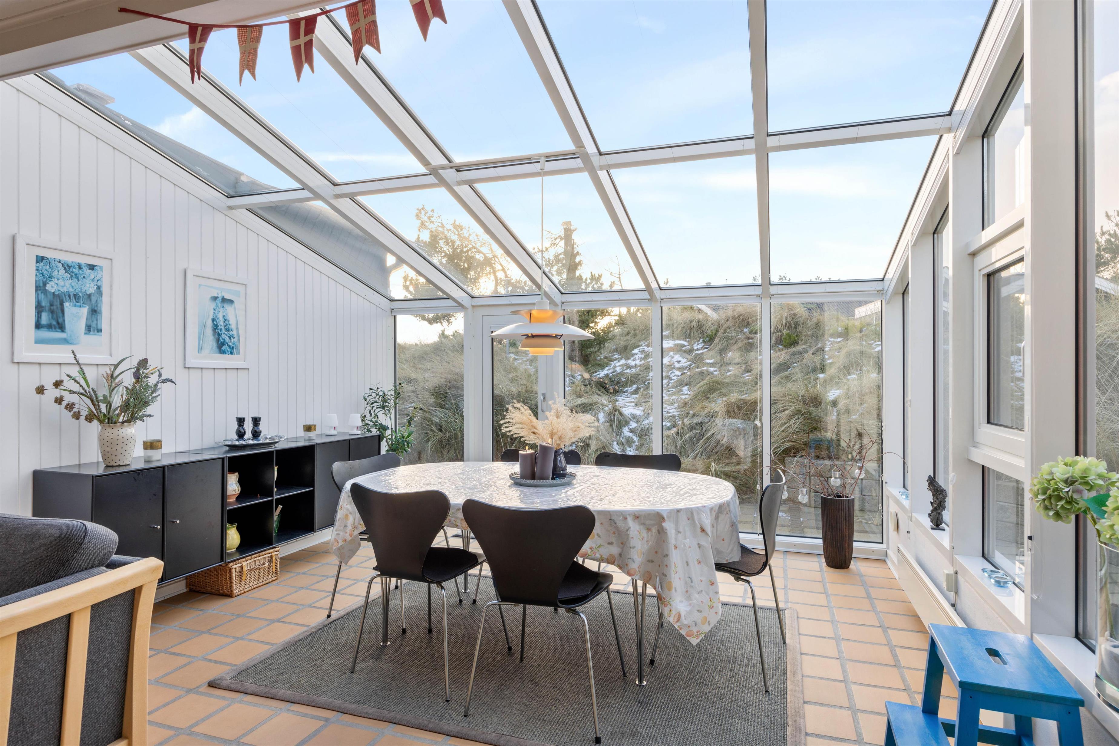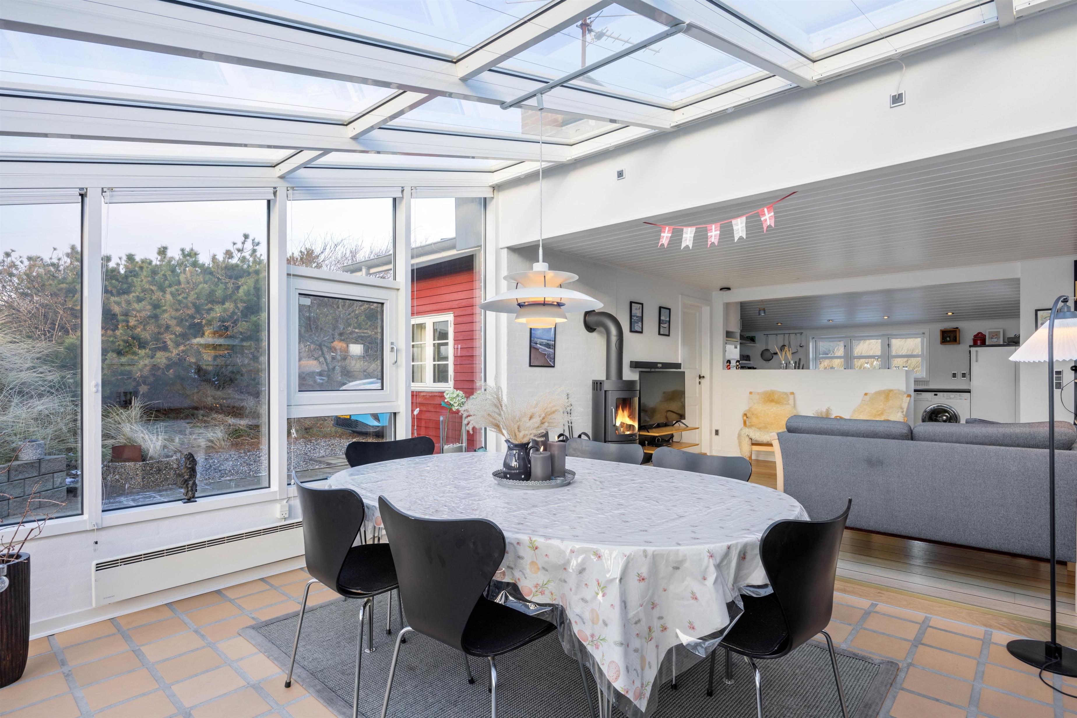 Når I træder ind i feriehuset på Nordsøvej 306 i Søndervig, bliver I mødt af et lyst, åbent og hyggeligt opholdsrum, der indbyder til mange timer sammen. Opholdsrummet forbinder stue, spiseplads og køkken. Her kan I sammen lave mad, spille spil eller planlægge ugens aktiviteter. En del af stuen er udformet som udestue og giver jer følelsen af at sidde midt i naturen.