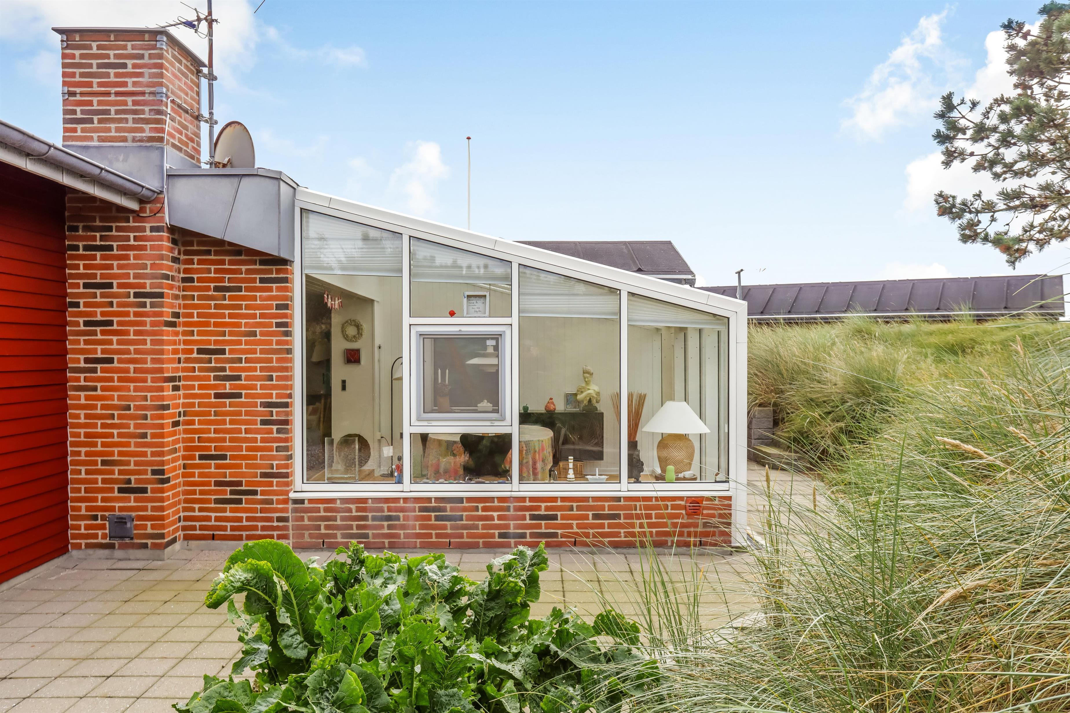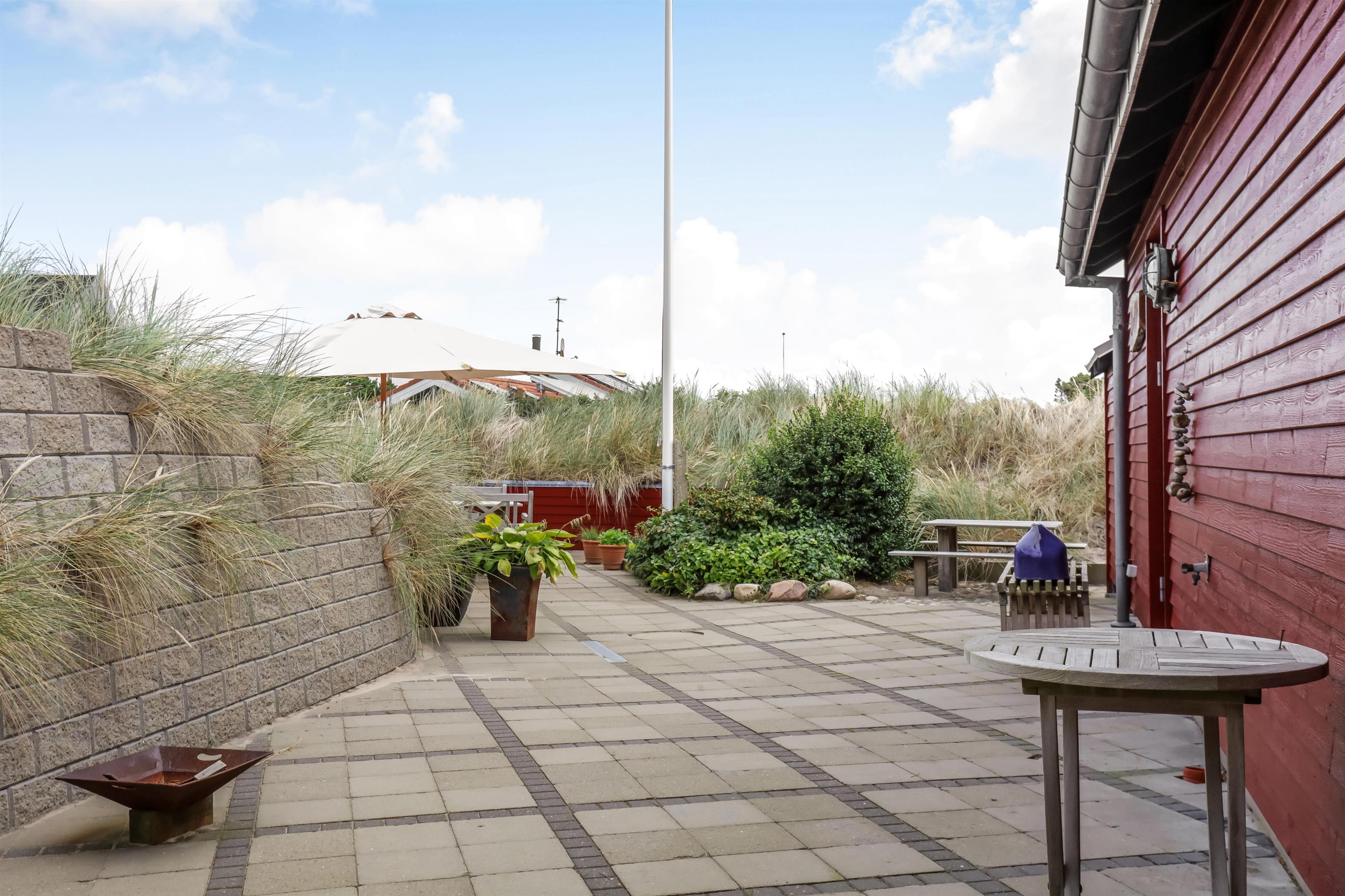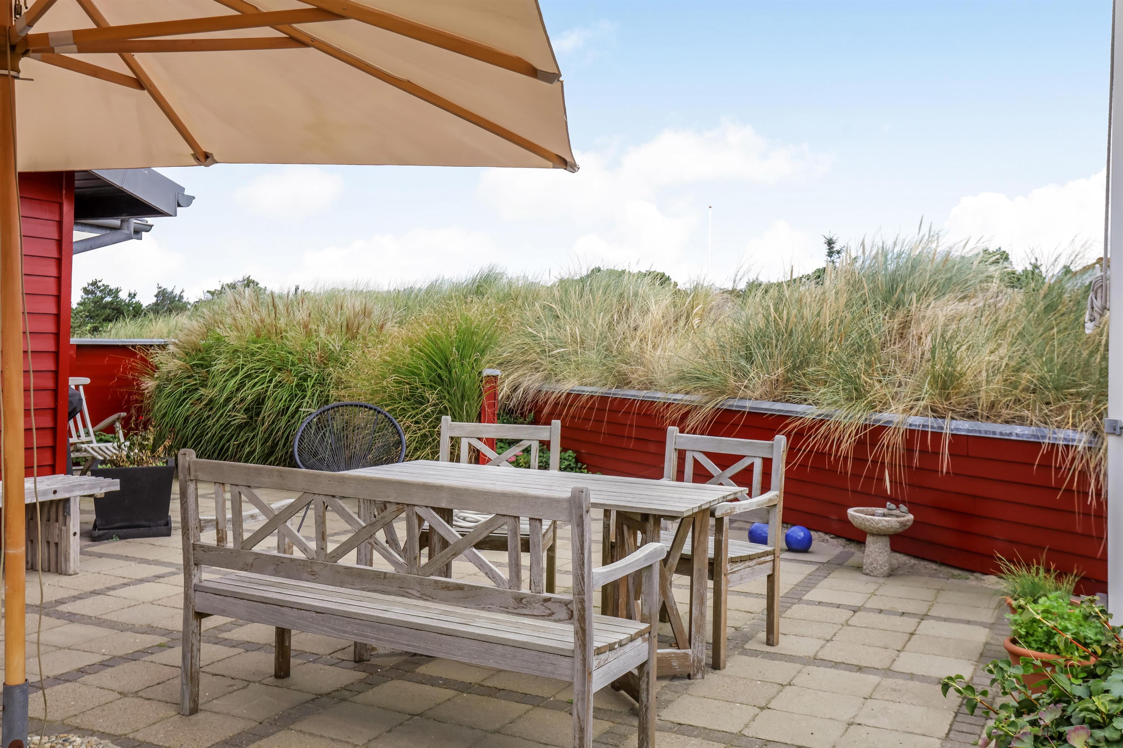 Feriehuset står på en 1379 m2 stor naturgrund. Fra opholdsstuen er der udgang til den store terrasse, som er udstyret med havemøbler. Her kan I nyde den friske Vesterhavsluft og en kold drink. Efter en spændende feriedag kan I runde dagen af med en hyggelig grillaften og nyde en lun sommeraften på terrassen.