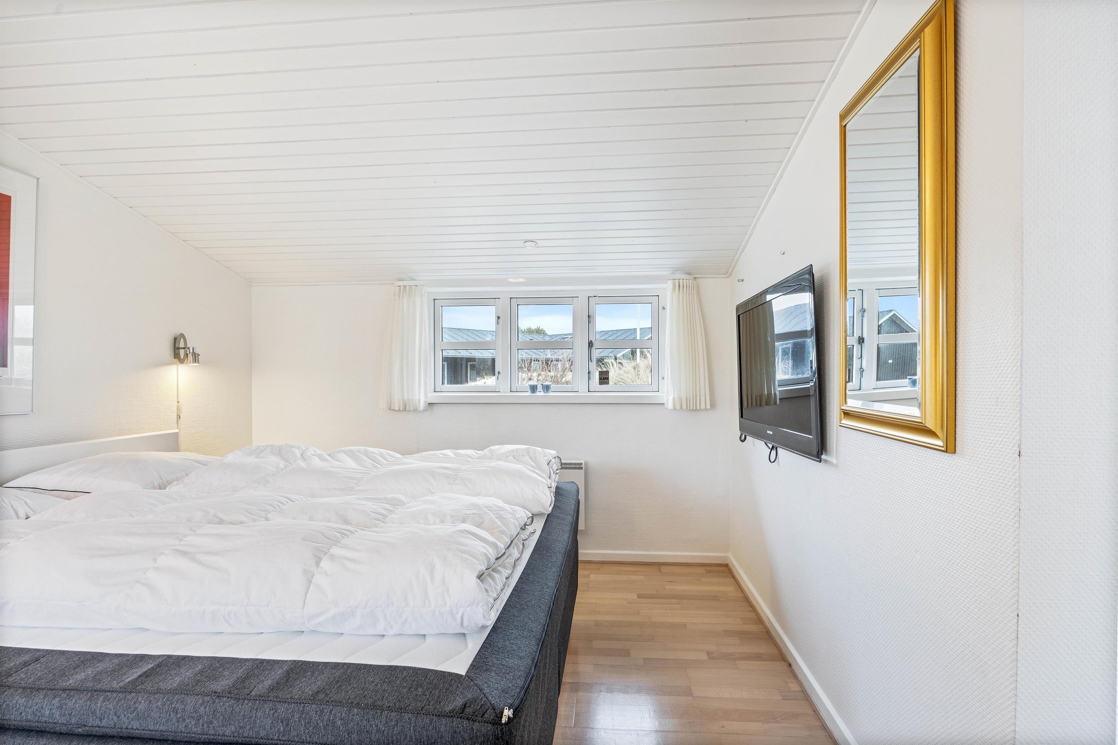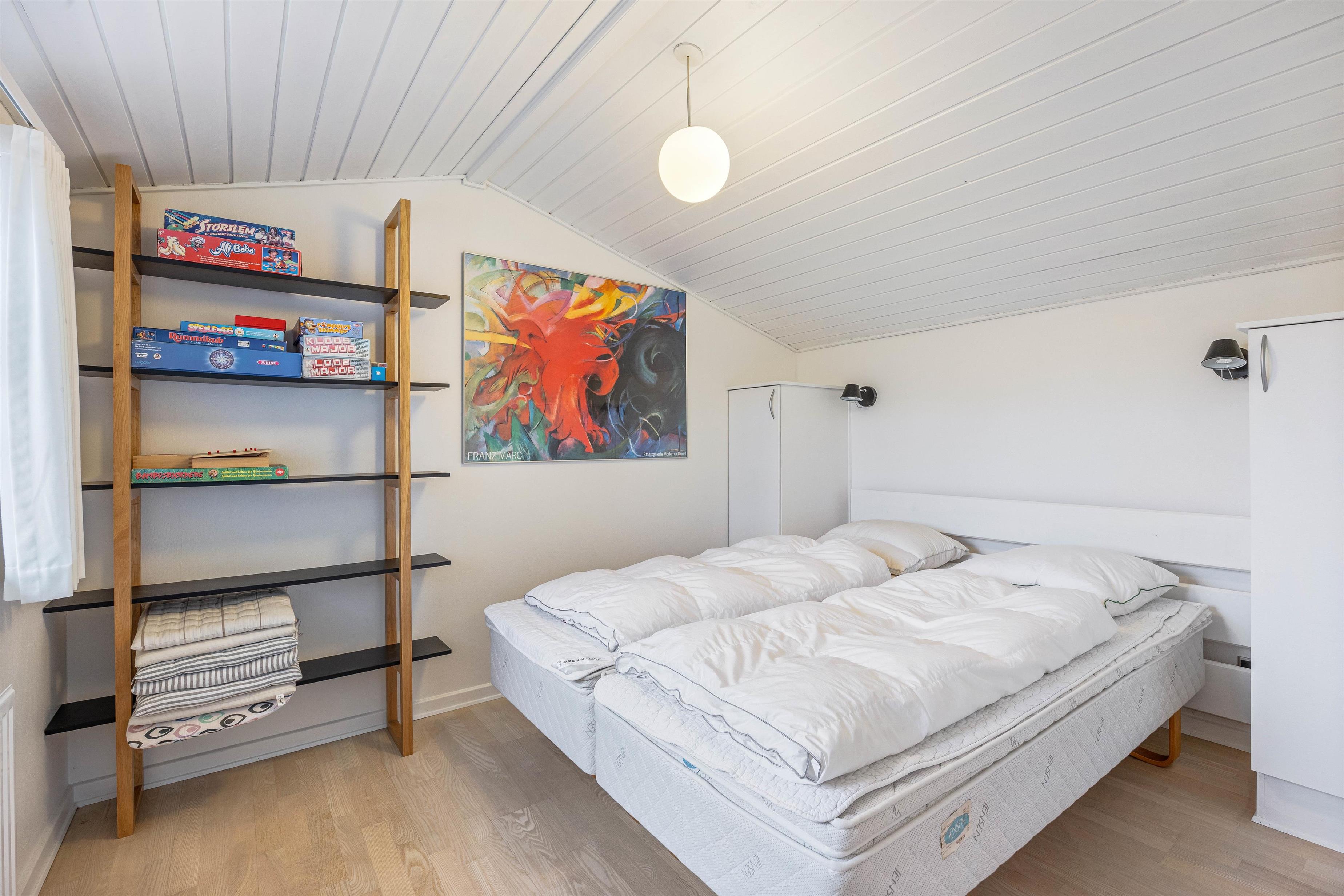 Om aftenen kan I slappe af i de to soveværelser, der hver er udstyret med en dobbeltseng, og lade batterierne op. I feriehusets badeværelse er der installeret gulvvarme, så man ikke får kolde fødder på kolde dage. Efter en lang gåtur på stranden kan I varme op i feriehusets egen sauna og igen få varmet kroppen igennem.