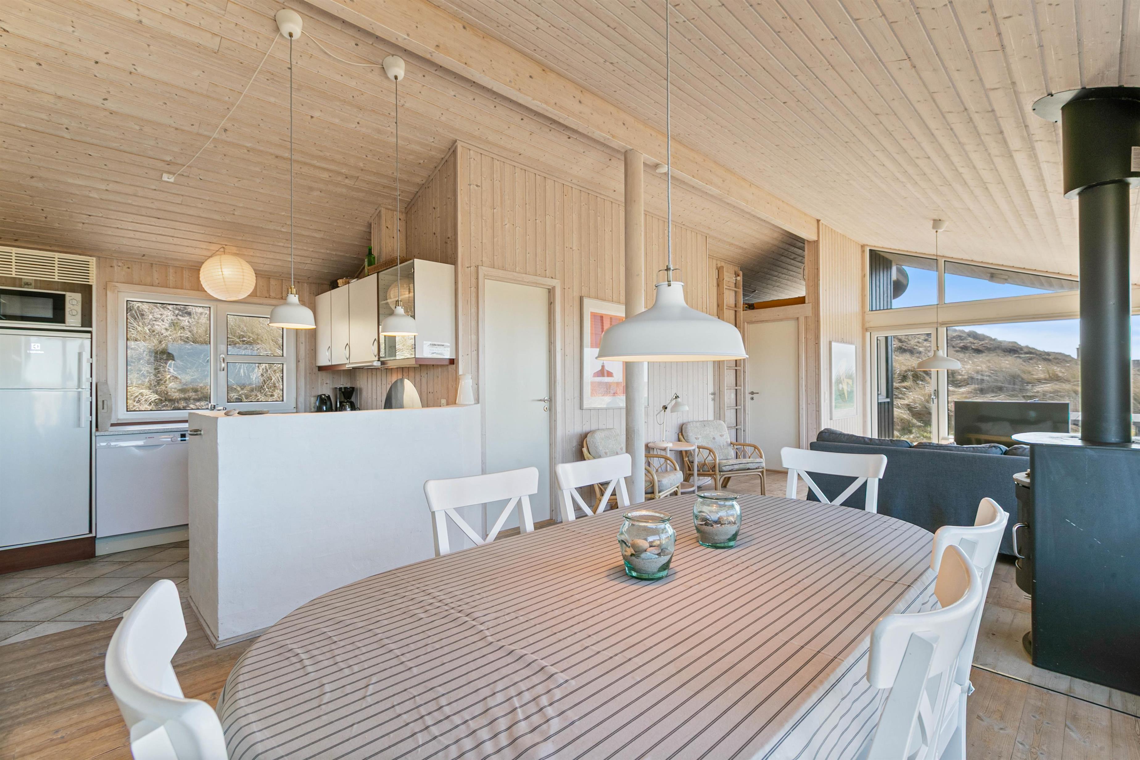 Køkken og stue er samlet i ét stort, lyst opholdsrum med brændeovnen som naturligt samlingspunkt. Her kan I nyde den smukke havudsigt både fra sofaen og spisebordet, mens I slapper af med en god bog eller samles om et lækkert feriemåltid. Også fra to af soveværelserne er der en skøn udsigt til havet, som giver en helt særlig feriestemning fra morgenstunden.