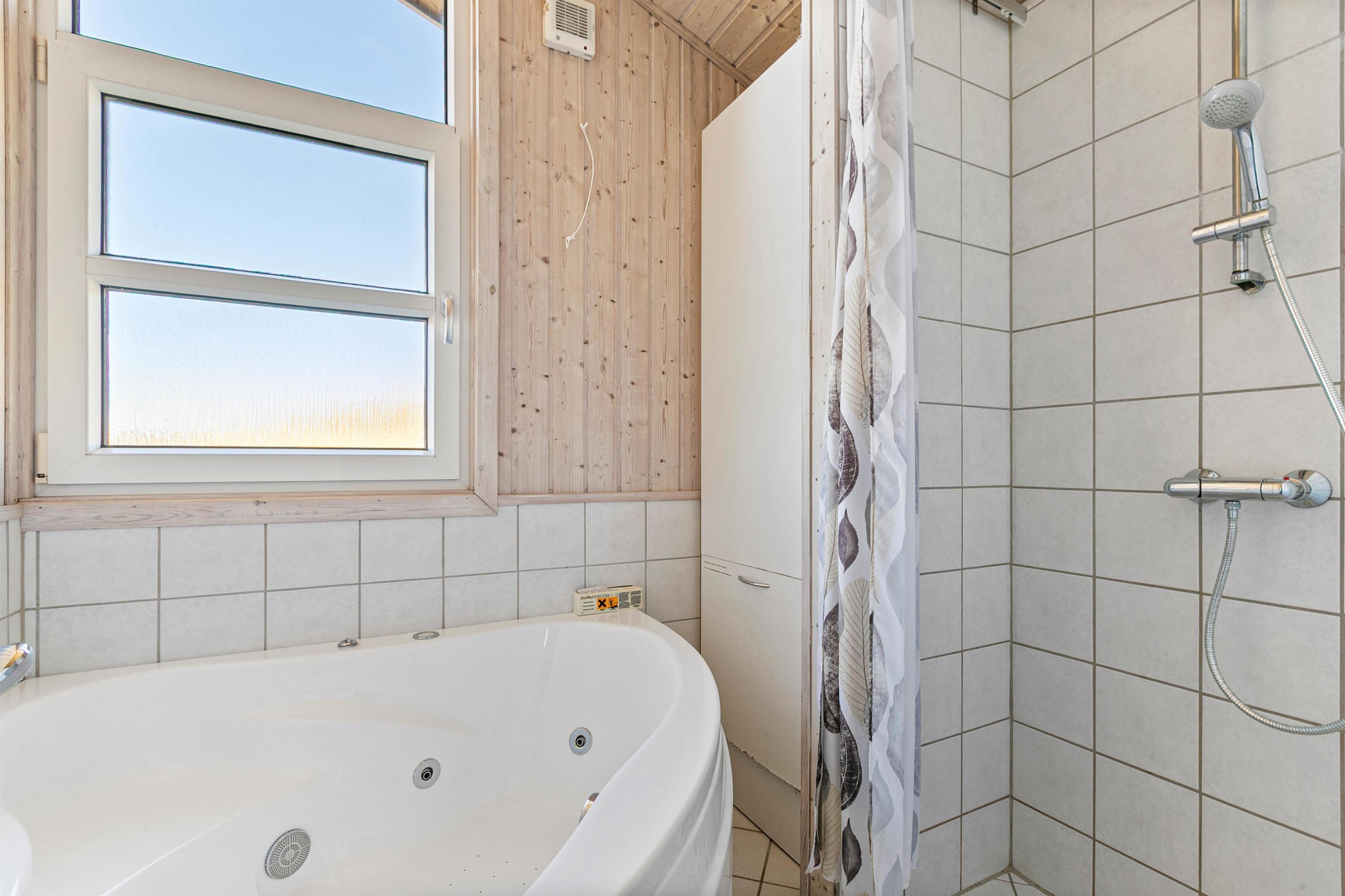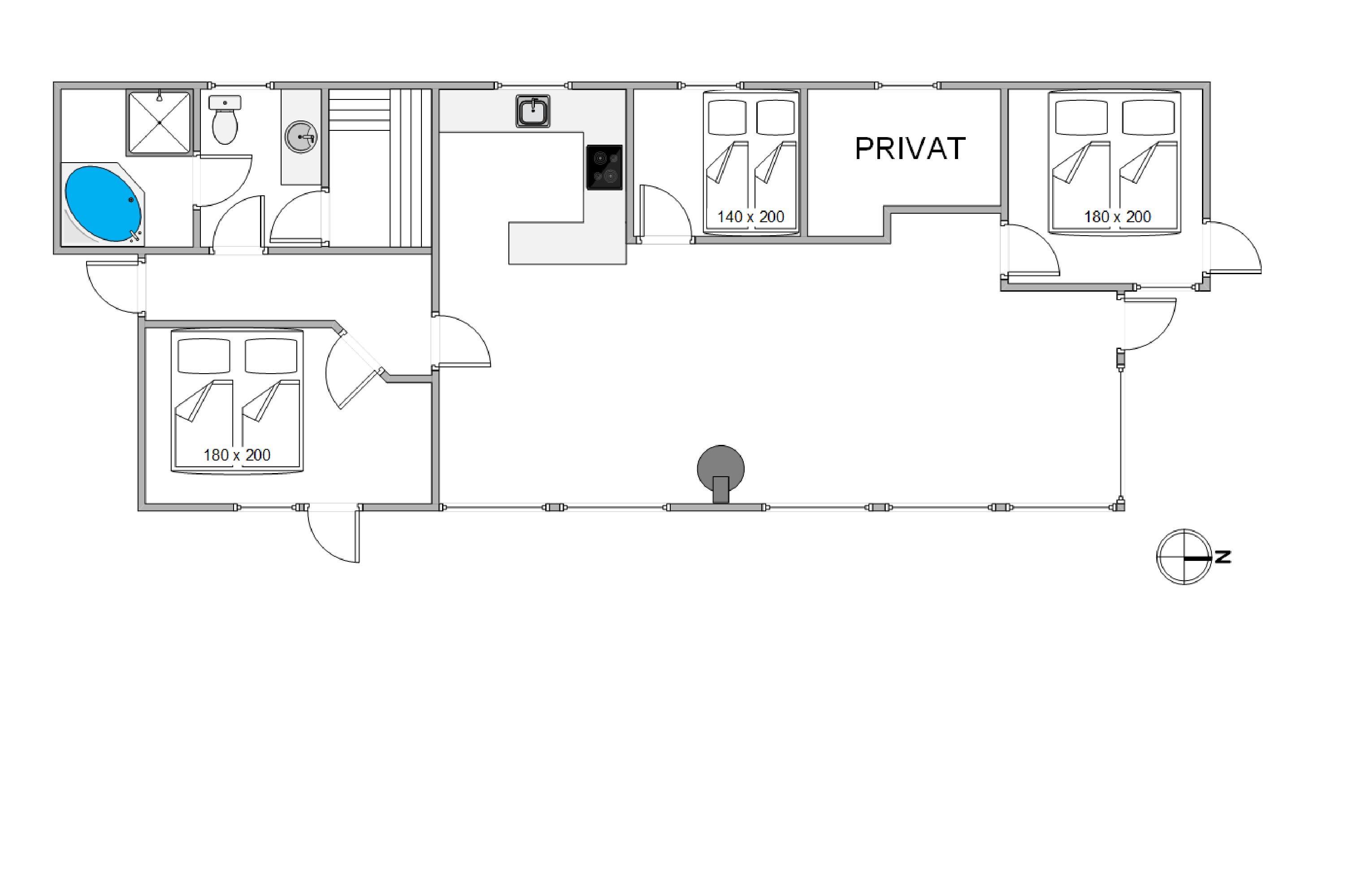 Det moderne køkken er fuldt udstyret med alle nødvendigheder, herunder opvaskemaskine, som gør oprydningen nem og hurtig, så I får mere tid til afslapning og oplevelser. Badeværelset byder på ekstra komfort med gulvvarme samt en indbydende tømmespa og sauna – perfekt til velvære og afslapning efter en dag ved Vesterhavet.