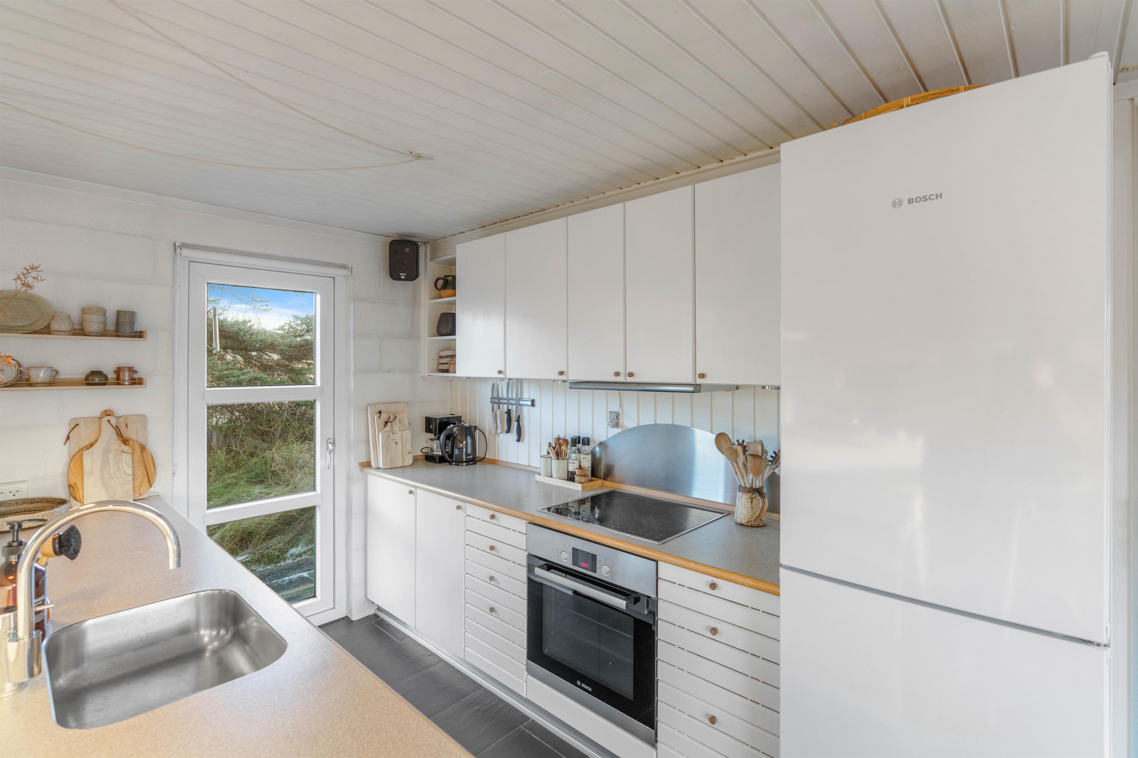 Sommerhuset består af i alt 111m2, og er moderne indrettet med lyse vægge og lofter. De sorte klinker skaber sammen med indretningen en god kontrast i husets ellers enkle stil. Overalt i huset er der store vinduer, som sørger for et flot lysindfald fra morgen til aften. Huset har desuden en flot udestue, som er perfekt til de dage, hvor vejret ikke er helt godt nok til at sidde udevendigt. Denne udestue giver en fantastisk fornemmelse af den smukke omkringliggende natur.
