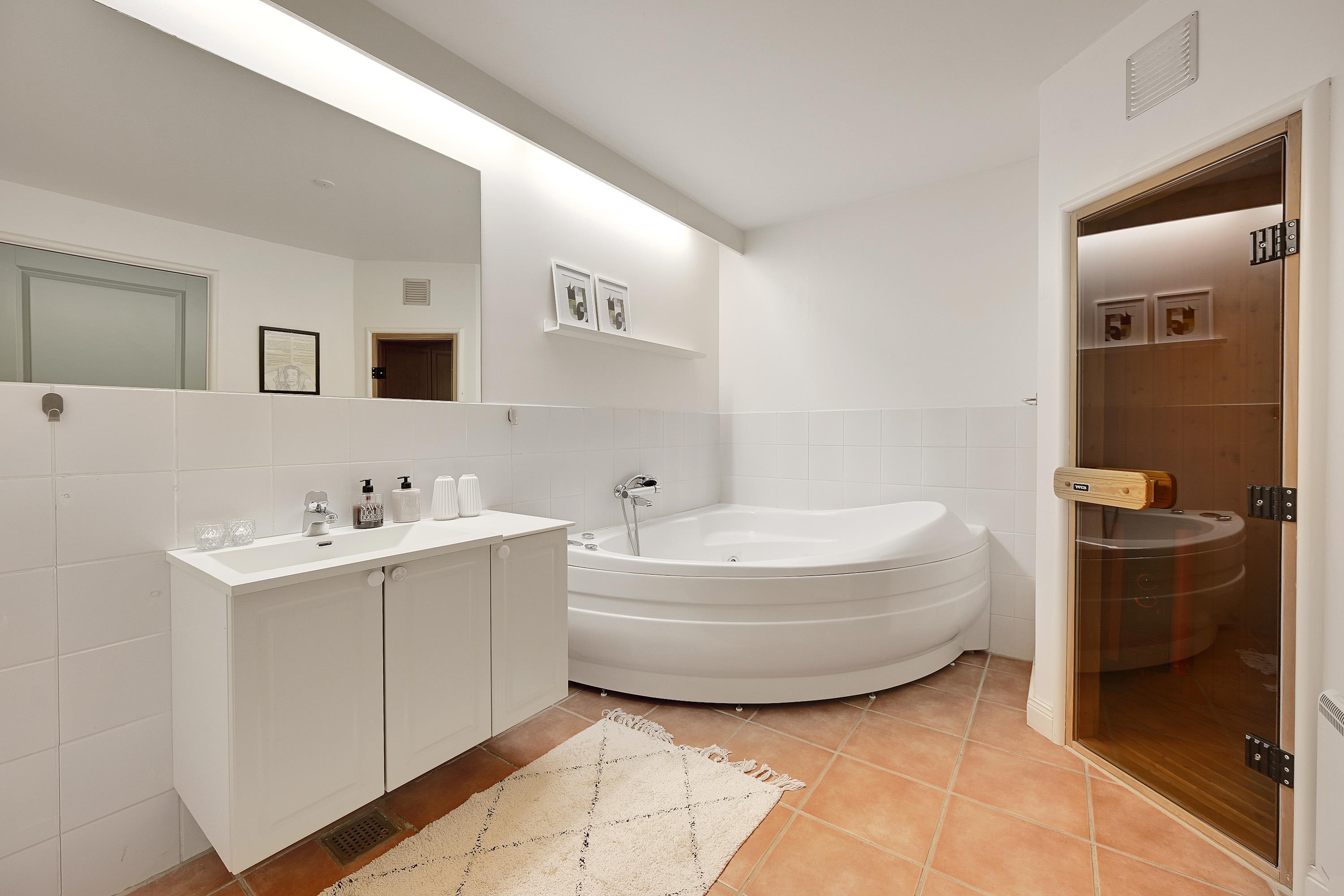 Indvendigt får I en lys og hyggelig ferielejlighed og en fredfyldt atmosfære, som gør, at I med det samme vil falde godt til. Skal I værne lidt ekstra om jer selv og hinanden, kan I tænde for saunaen eller starte spabadet og bruge en aften i ro og fred i varmen. De praktiske opgaver bliver også minimeret, da der både er en opvaskemaskine, vaskemaskine og tørretumbler til rådighed. Heller ingen grund til at bekymre sig om kolde fødder om morgenen, da der er gulvvarme i badeværelset.