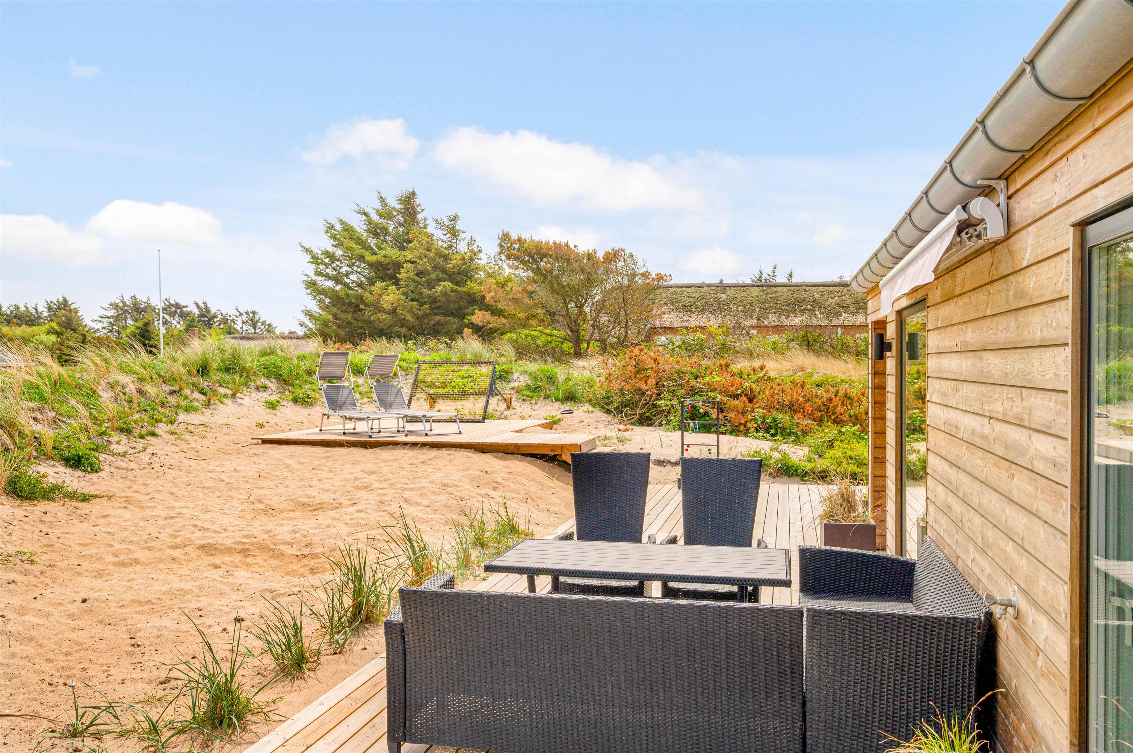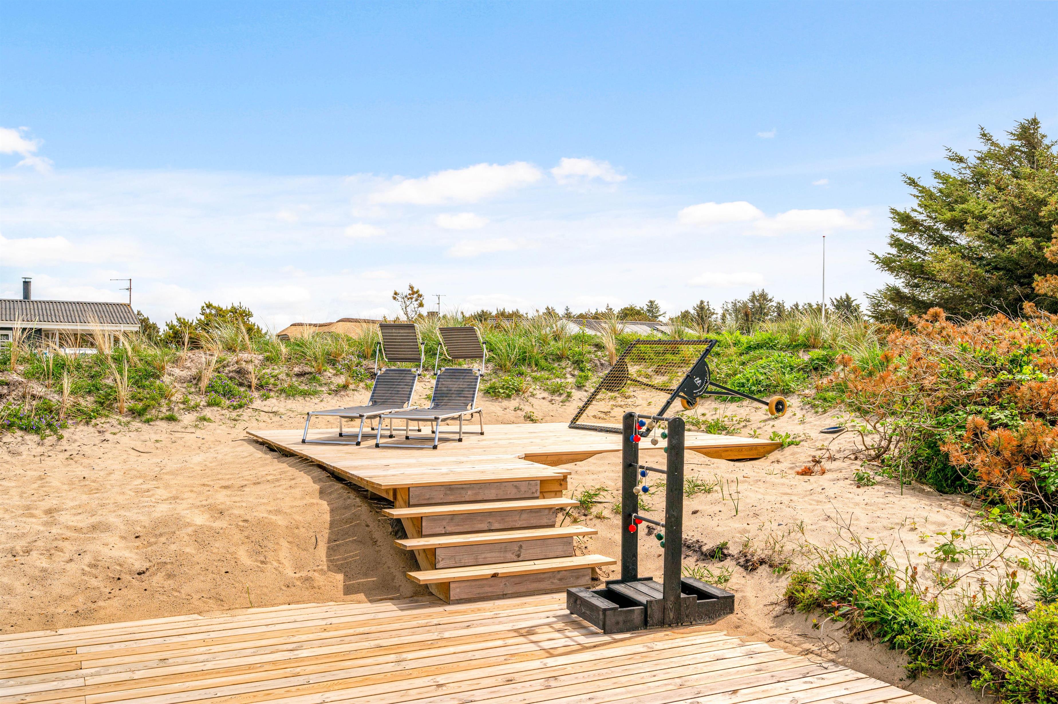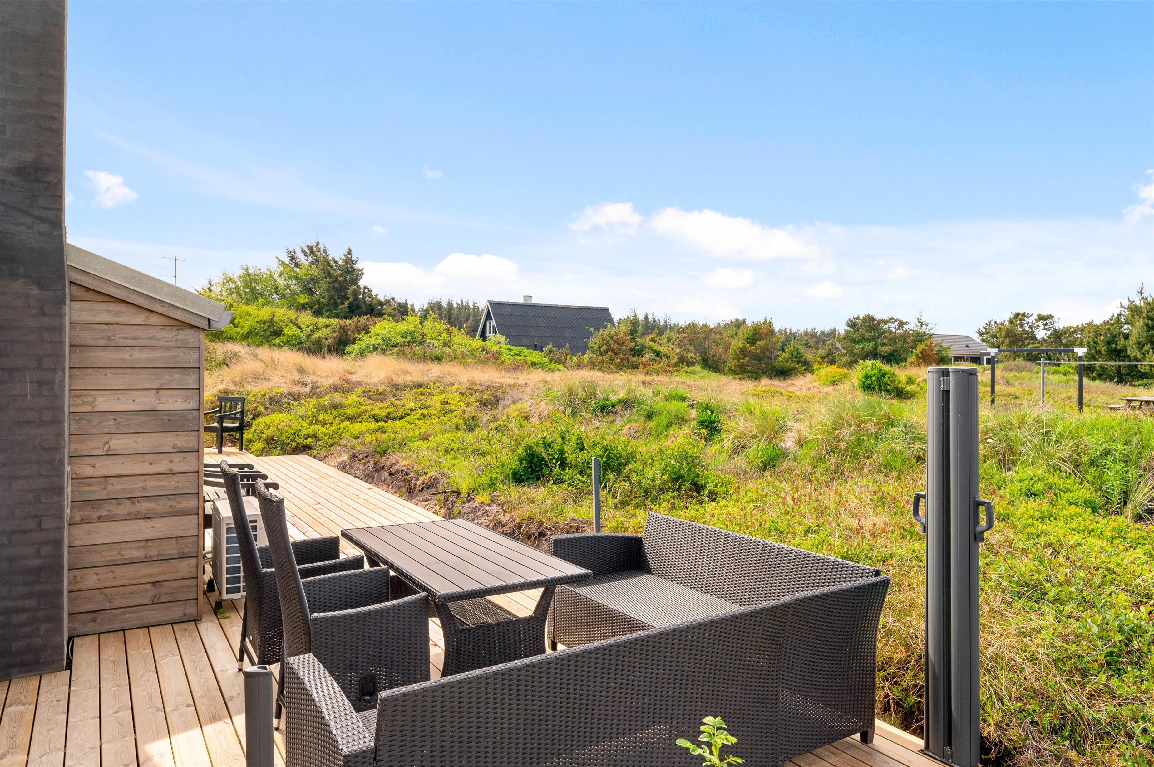 Kun 800 meter fra sommerhuset ligger Vesterhavet, som I hurtigt kan nå til, når I trænger til en frisk gåtur eller en dukkert i vandet. Når I kommer tilbage til sommerhuset, kan I skylle sandet af tæerne under udebruseren. Denne udebruser kan benyttes fra april til november.