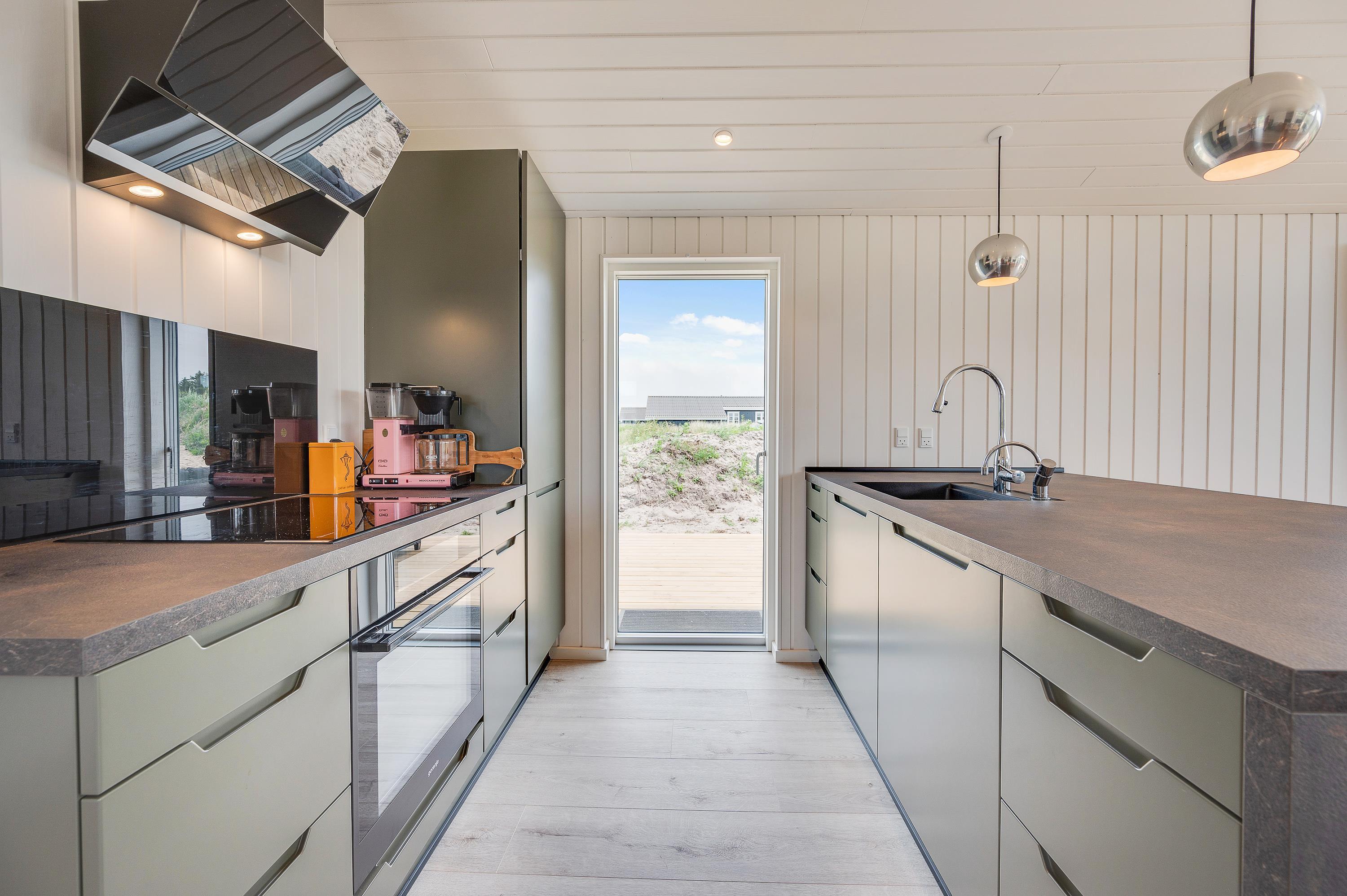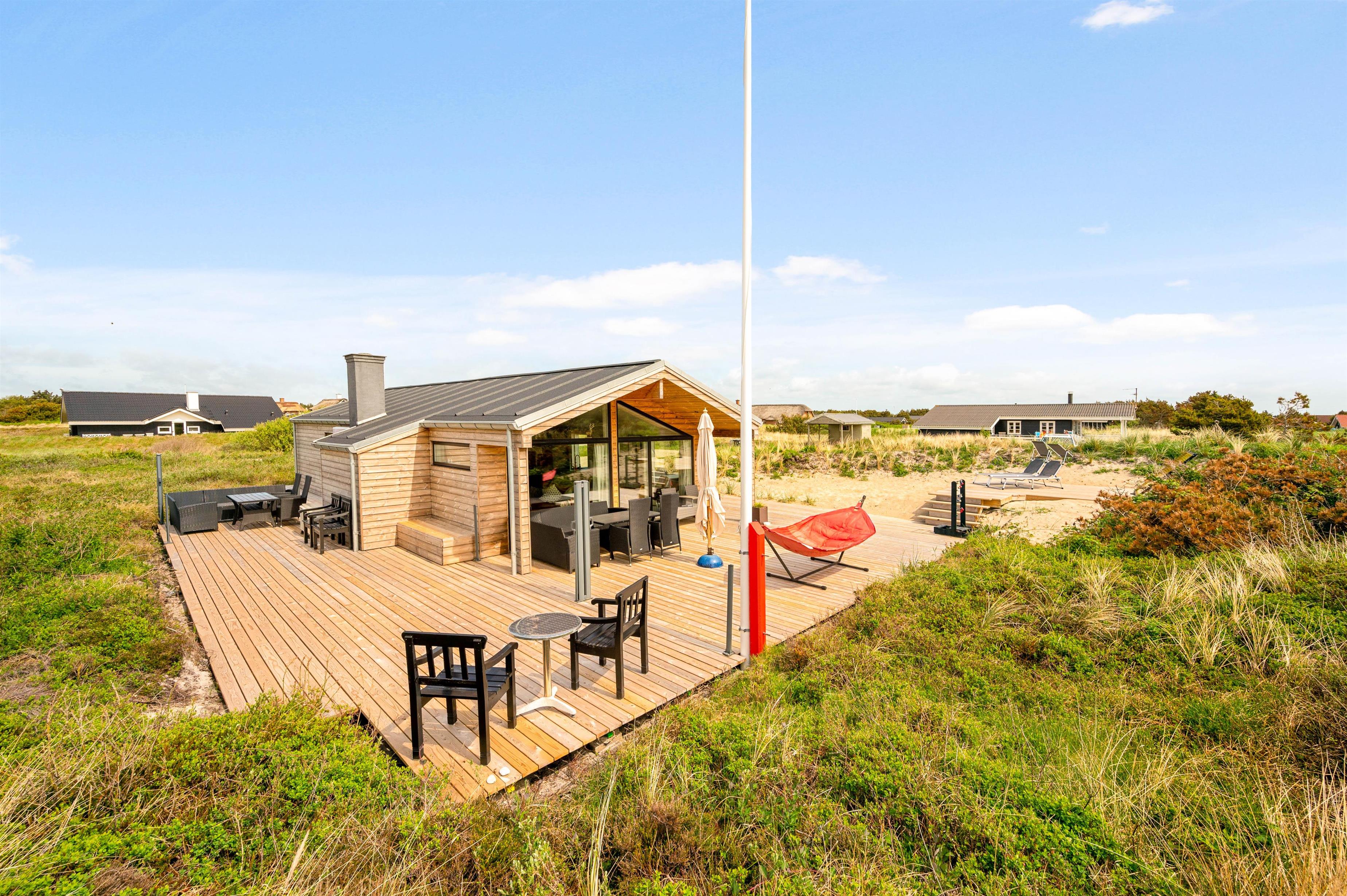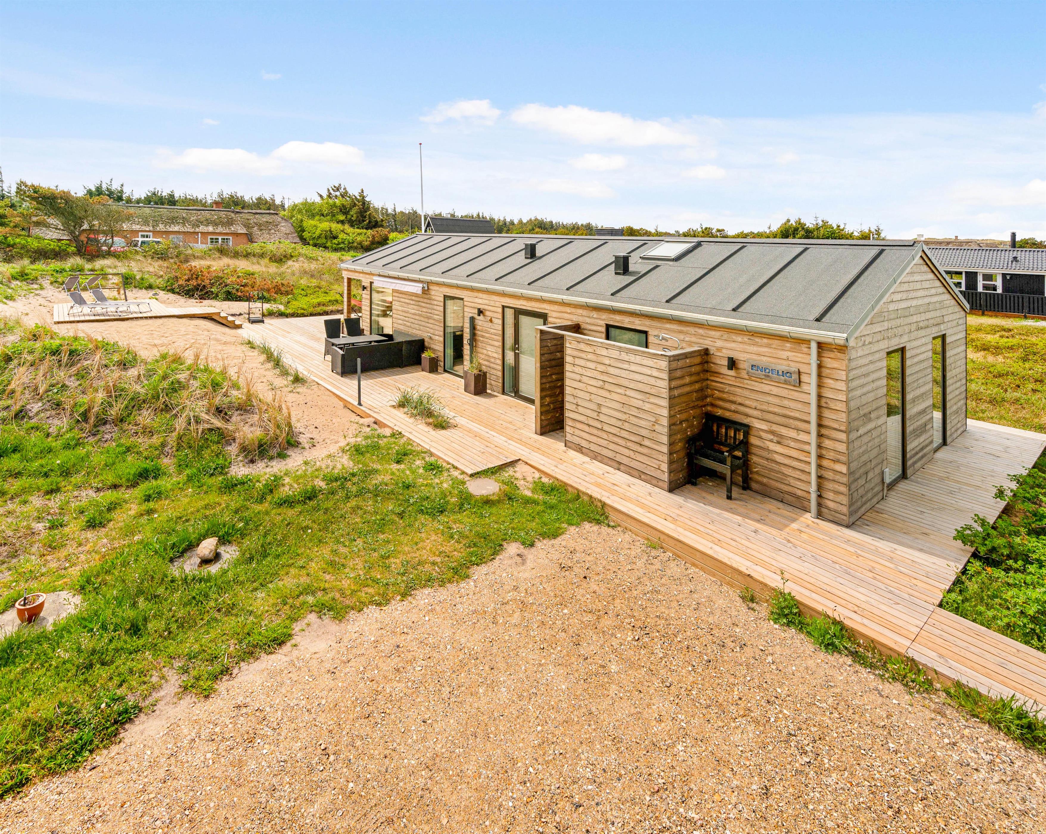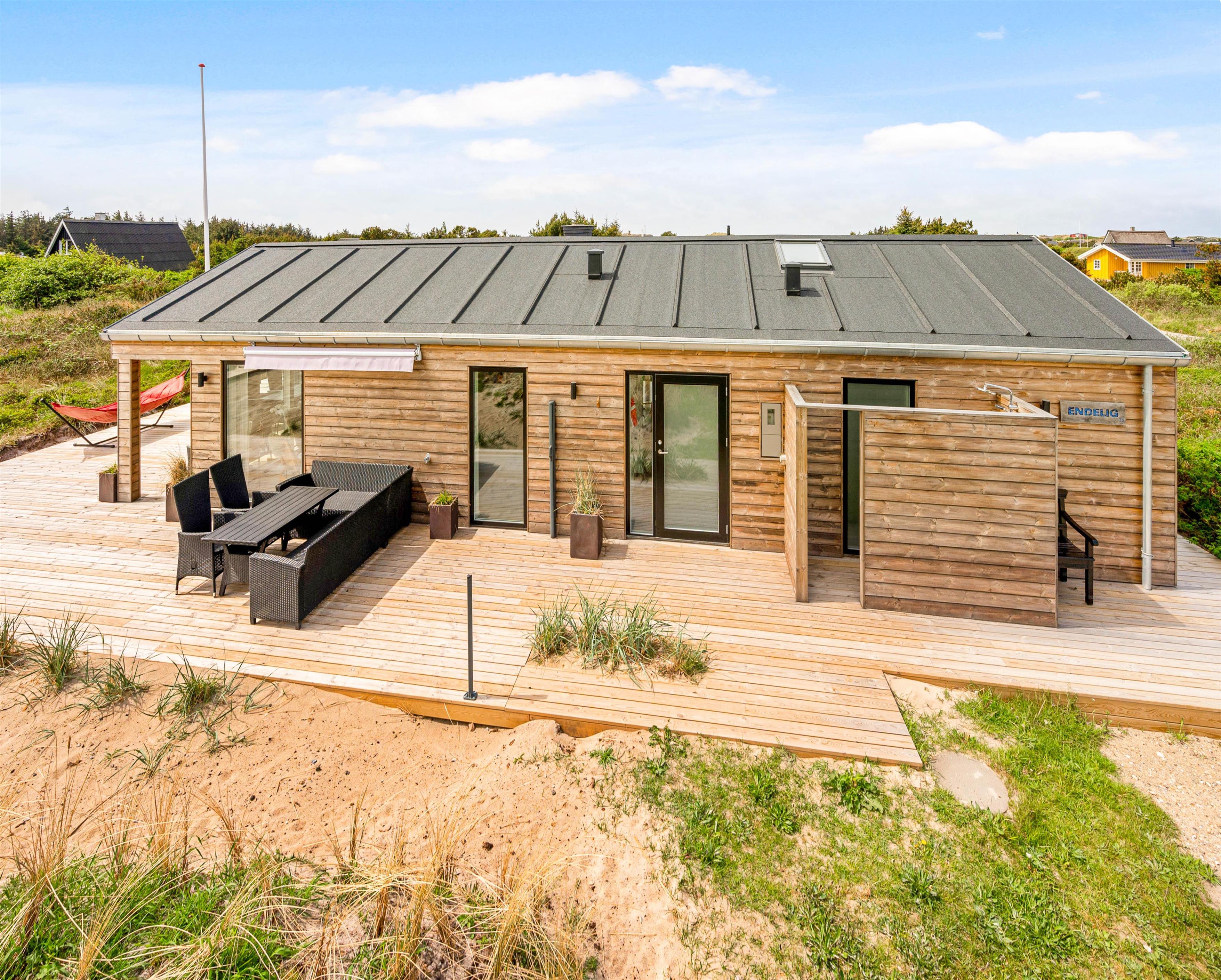 Kun 800 meter fra sommerhuset ligger Vesterhavet, som I hurtigt kan nå til, når I trænger til en frisk gåtur eller en dukkert i vandet. Når I kommer tilbage til sommerhuset, kan I skylle sandet af tæerne under udebruseren. Denne udebruser kan benyttes fra april til november.