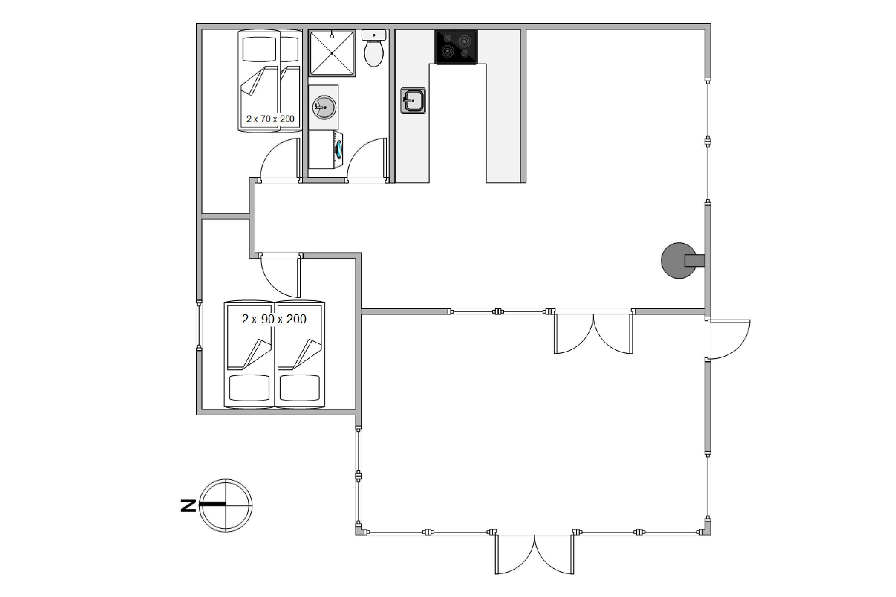 Sommerhusets to hyggelige soverum består af en komfortabel dobbeltseng og en funktionel køjeseng, hvilket giver mulighed for overnatning for både par og familier. Det moderne badeværelse er udstyret med gulvvarme, der sikrer varme fødder på kølige morgener.
