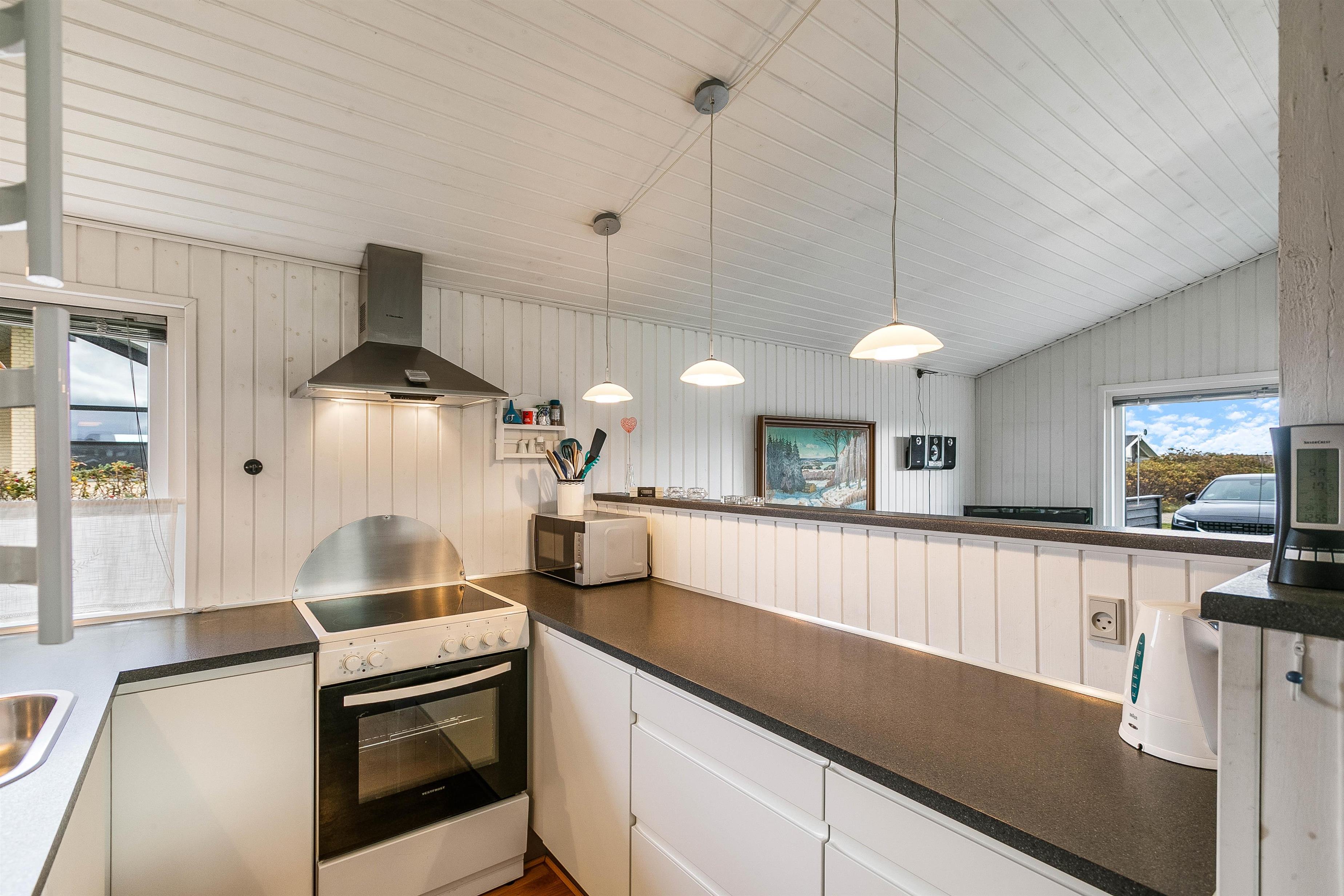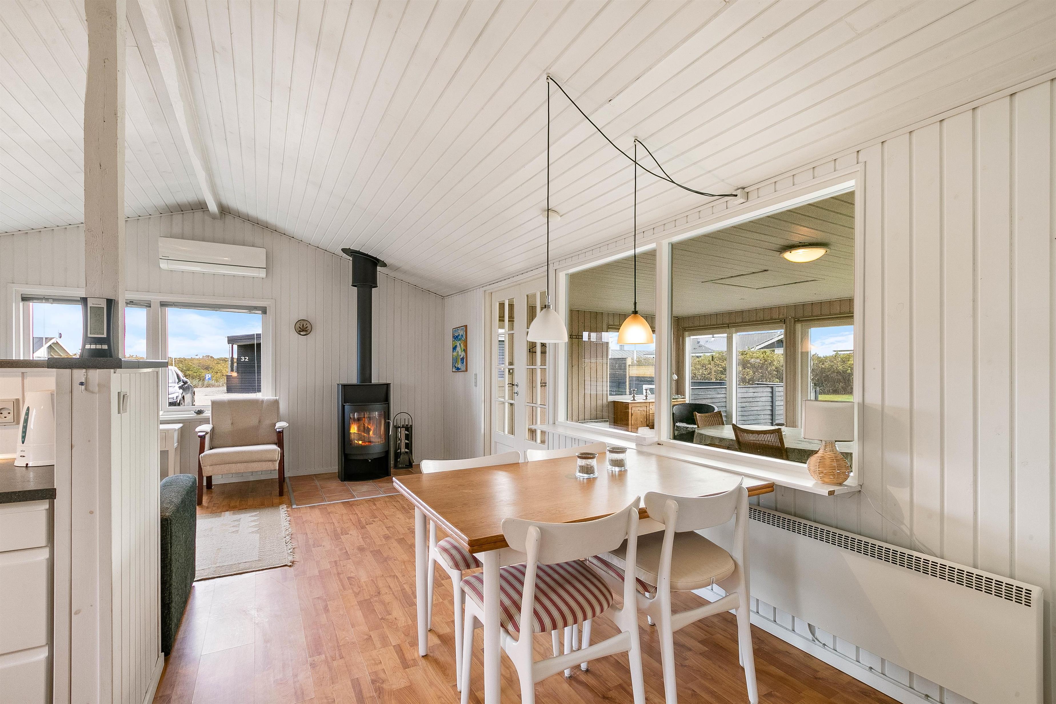 Sommerhuset i Søndervig er lyst og indbydende indrettet, og I vil hurtigt falde til i det lille feriehjem, som med sine små pyntedetaljer i stue og køkken har noget ekstra personligt og charmerende over sig. Det åbne, kombinerede køkkenalrum og stuerum bliver familiens mødested, og her kan I samles om madlavningen eller til en afslappende aften på sofaen, mens brændeovnen knitrer i baggrunden. For at gøre opholdet så behageligt som muligt, finder du både opvaskemaskine og vaskemaskine i sommerhuset, som gør det let at opretholde den daglige husholdning.