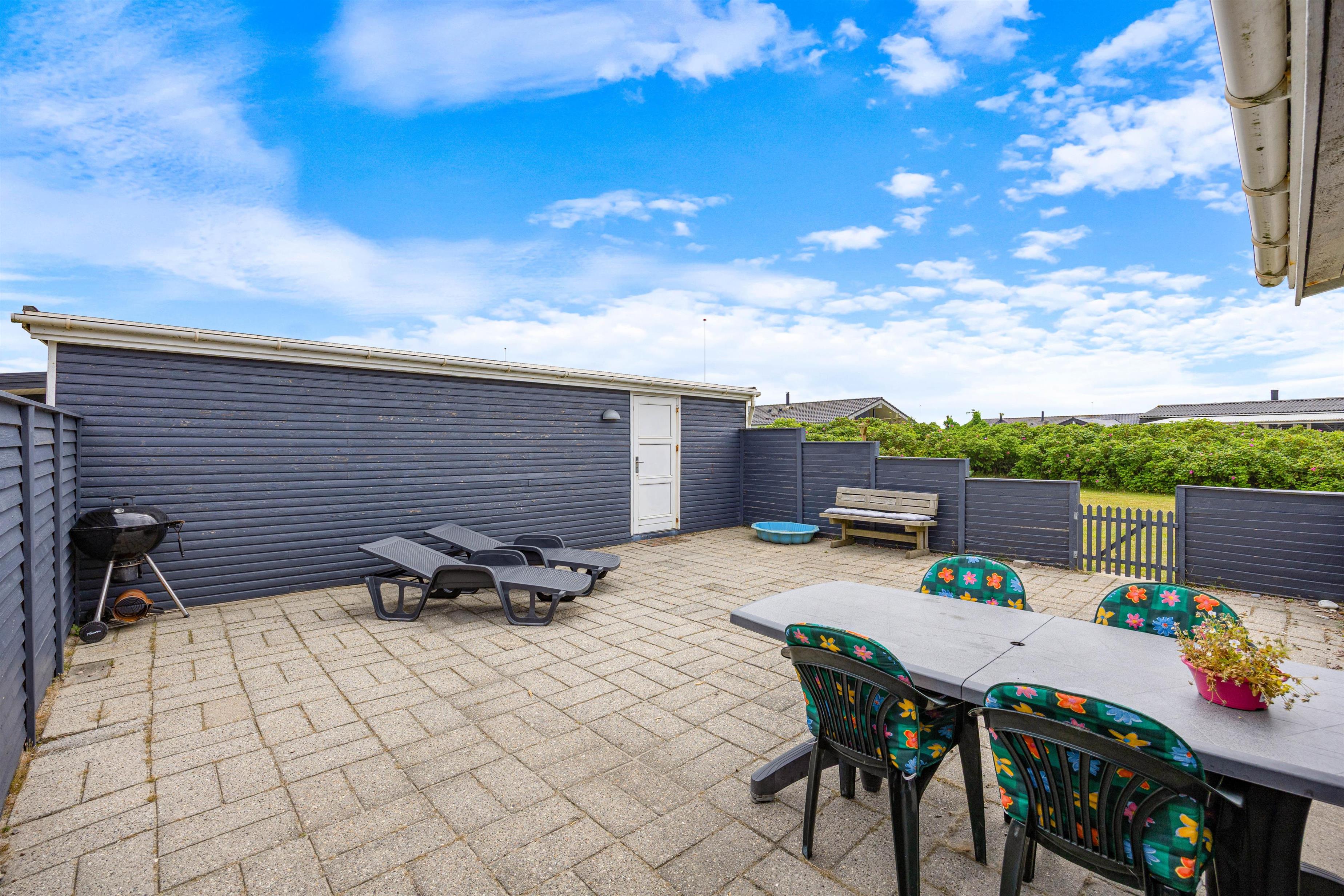 På de varme solskinsdage kan I rykke ud på den fine, lukkede terrasse, hvor I roligt kan lade børnene og hunden løbe rundt, mens I læner jer tilbage i liggestolene eller er i gang med at forberede aftenens middag på grillen. Rundt om huset går også en stor græsplæne, hvor der kan leges og spilles bold dagen lang.