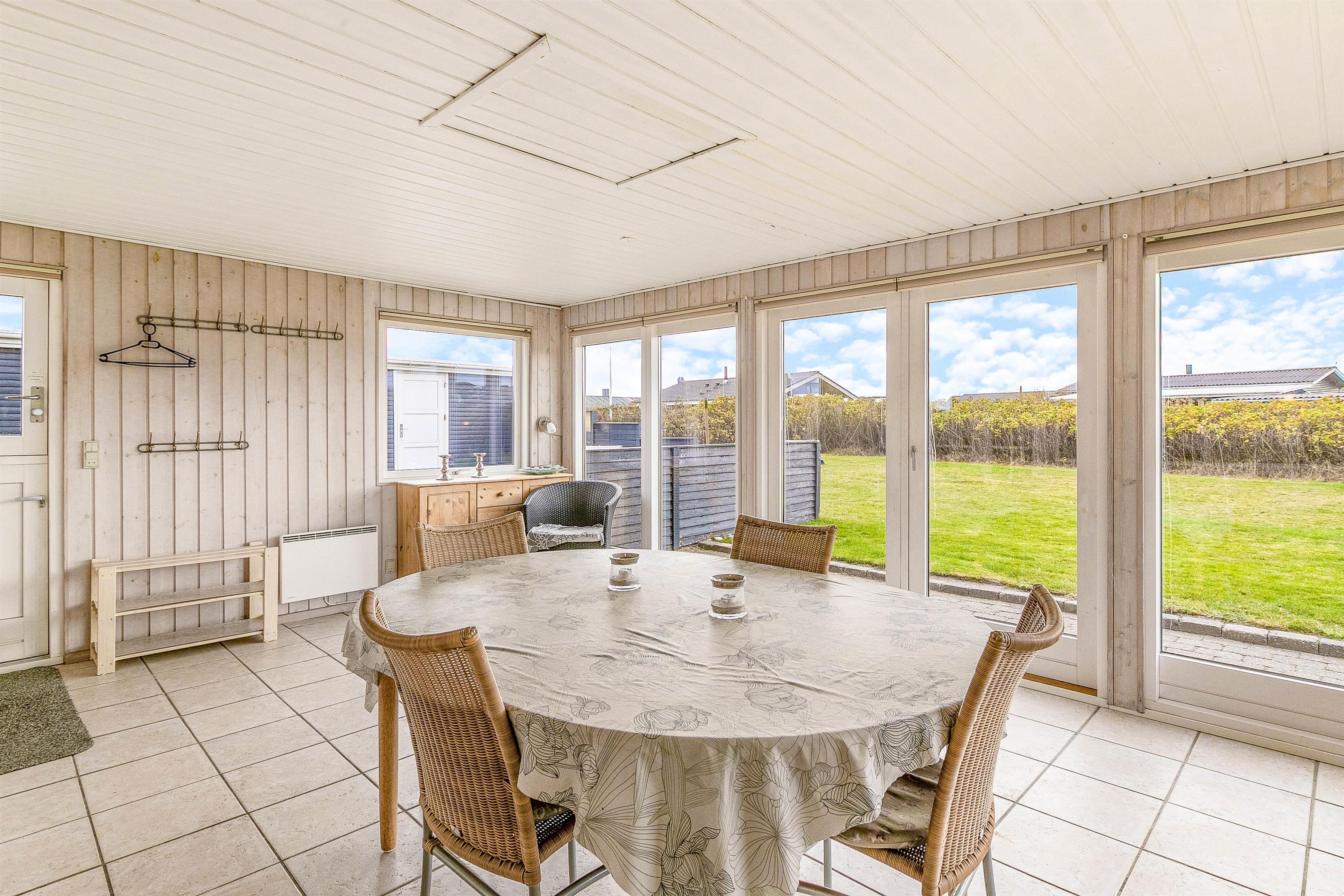 Et af husets highlights er den hyggelige udestue, hvor I har udsyn til den grønne have og resten af det livlige ferieområde i Søndervig - et oplagt sted at drikke eftermiddagskaffen eller tage et spil kort, når vejret ikke er helt med jer.