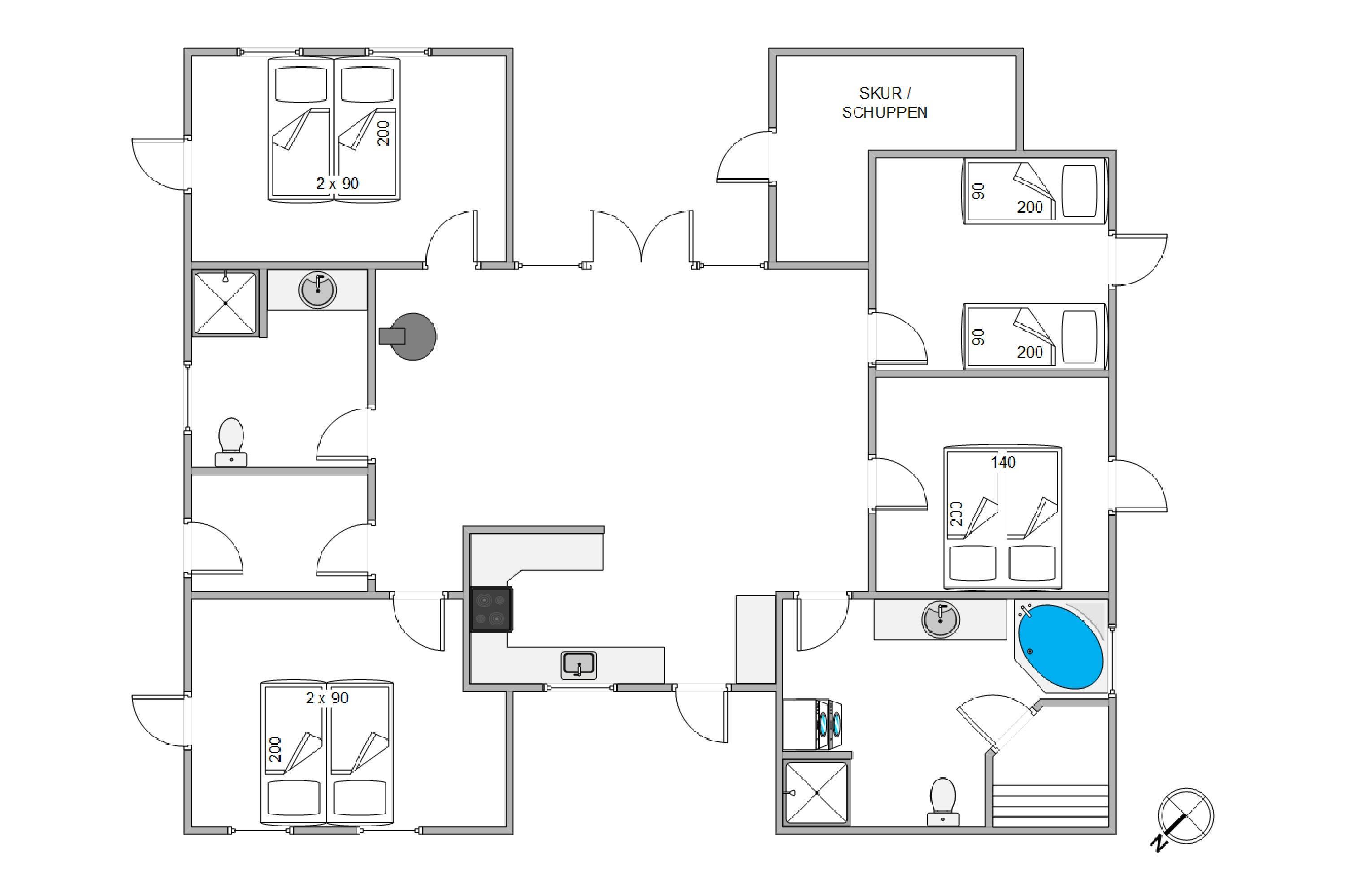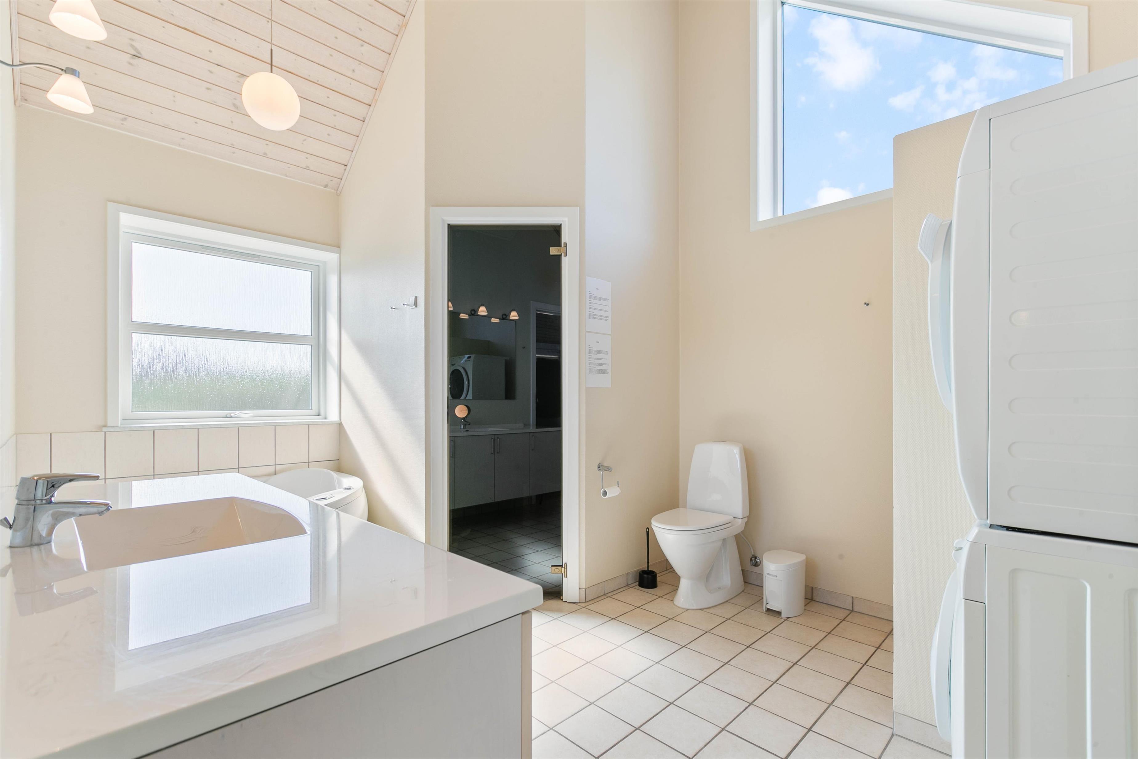 Hele vejen rundt om feriehuset er der lagt fliser, samt der også er flere forskellige kroge, hvor I kan nyde det danske vejr. De flere forskellige kroge sikrerm at I uanset vindretning kan nyde lidt frisk luft mens i sidder i læ. Hvis I ønsker at samle alle på terrassen, kan I også dette. Her er det sær belejligt, at feriehuset har en stor og afskærmet terrasse. Her kan I nyde noget læ og privatliv, og hvis vejret er til det, er der intet mere lækkert end at nyde en lækker bøf fra grillen her på terrassen, alt i mens I kan høre Vesterhavets brusen i baggrunden