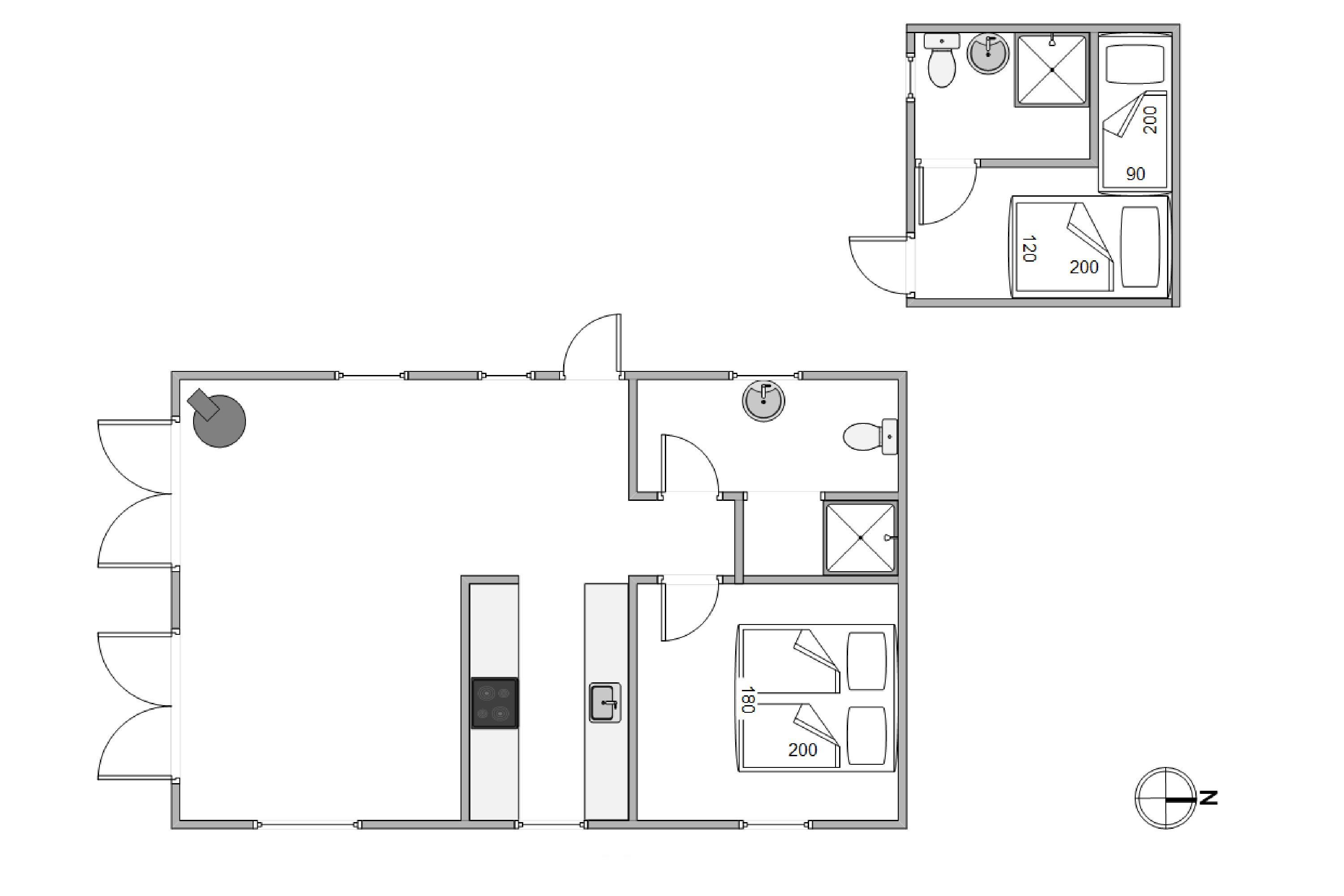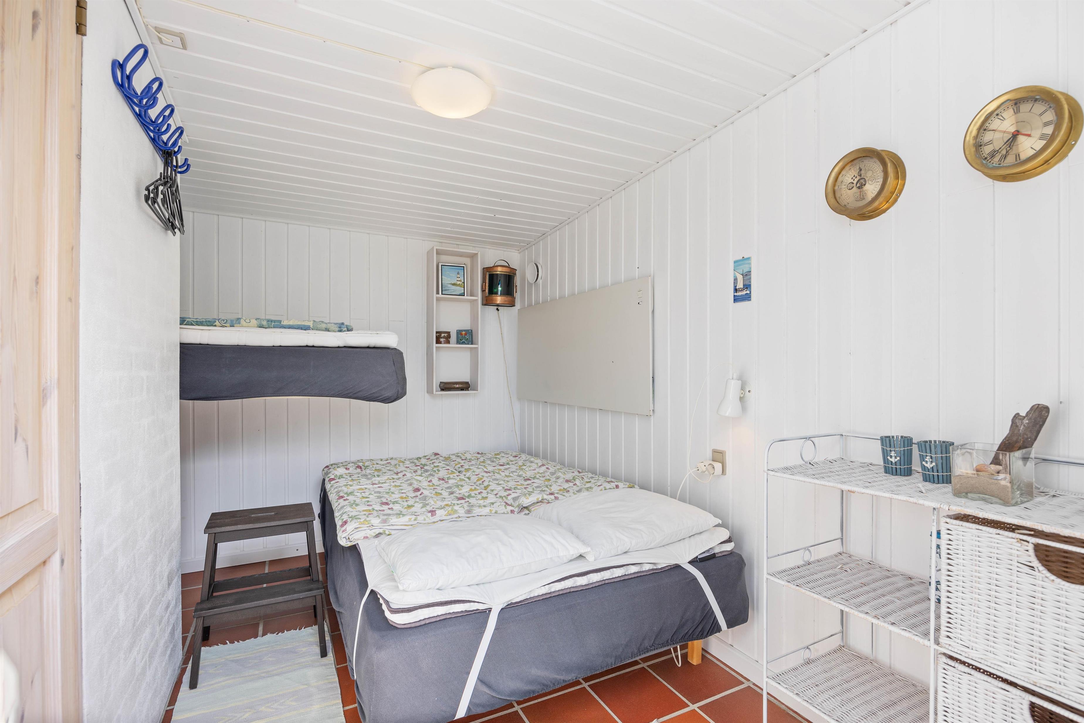 Når I træder ind i sommerhuset, vil I blive mødt af masser af feriestemning. Væggene er beklædt med træ, og loftet er åbnet til kip – det giver sammen med brændeovnens flammer den hyggeligste atmosfære og de perfekte rammer for samvær med familien. Der er 2 gode soveværelser, hvoraf det ene er indrettet med en dobbeltseng og det andet er indrettet med to enkeltsenge. Den femte soveplads finder i på hemsen.
