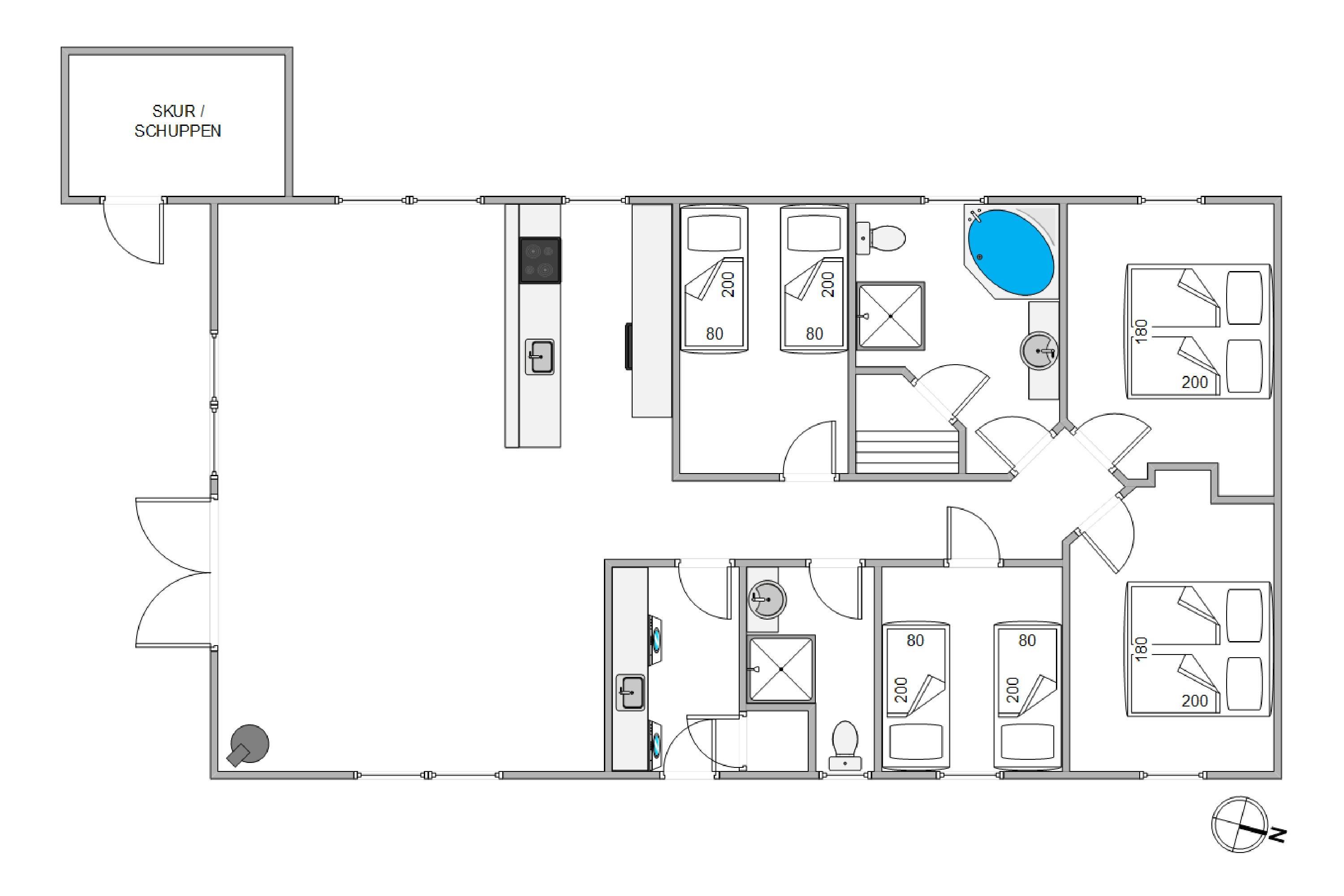 Inde i huset vil du blive mødt af en indbydende stue, der er smukt indrettet med komfortable møbler og en hyggelig brændeovn, perfekt til de kølige aftener. Der er også et moderne køkken, som er fuldt udstyret med alt, hvad I har brug for til at tilberede jeres favoritmåltider. Sommerhusets fire soveværelser er alle rummelige og komfortable, så alle kan få en god nats søvn. Der er flere badeværelser, så ingen behøver at stå i kø til toilettet. Det ene badeværelse indeholder både spa og sauna og skaber unikke muligheder for at slappe af sammen, slippe hverdagens stress og jag og nyde den behagelig varme fra enten boblebadet eller saunaen, efter en god tur til vandet.