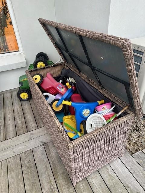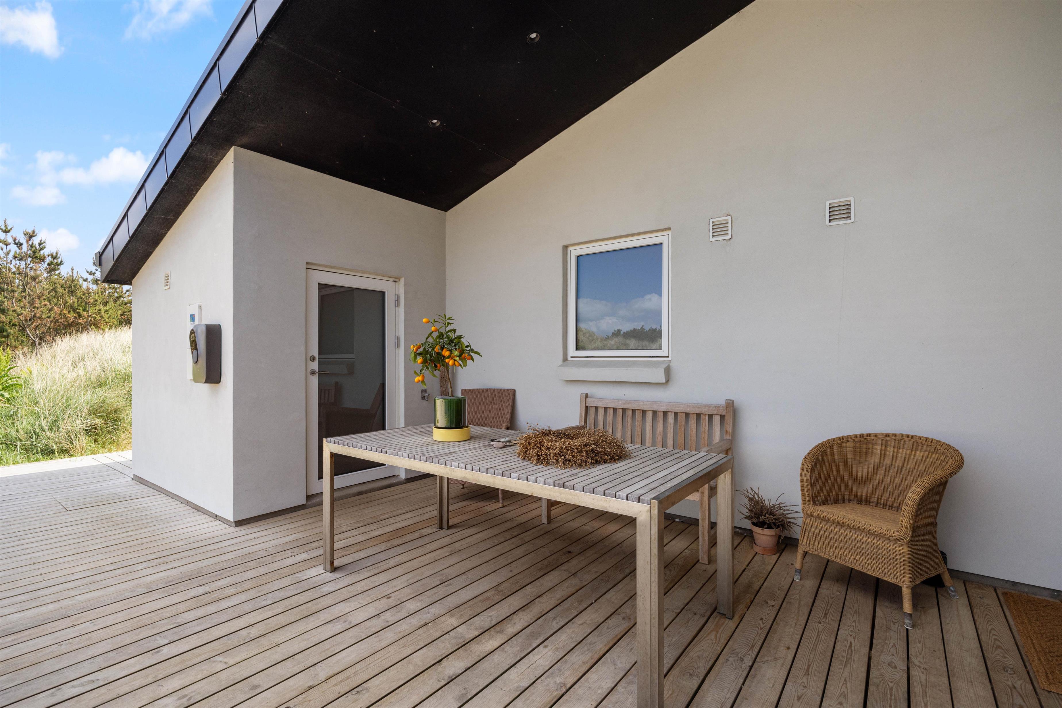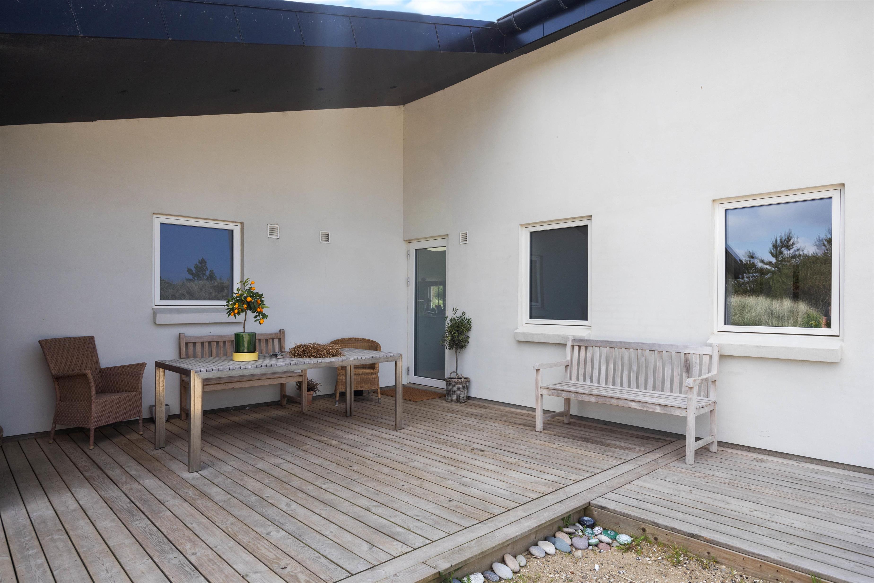 Desuden råder sommerhuset også over en varmepumpe, som opretholder et behageligt indeklima. Hvis vejret er godt, har I mulighed for at nyde nogle skønne solskinstimer på den 250 m2 skønne træterrasse. Derudover er der et vaskerum, hvor I finder en vaskemaskine og en tørretumbler.