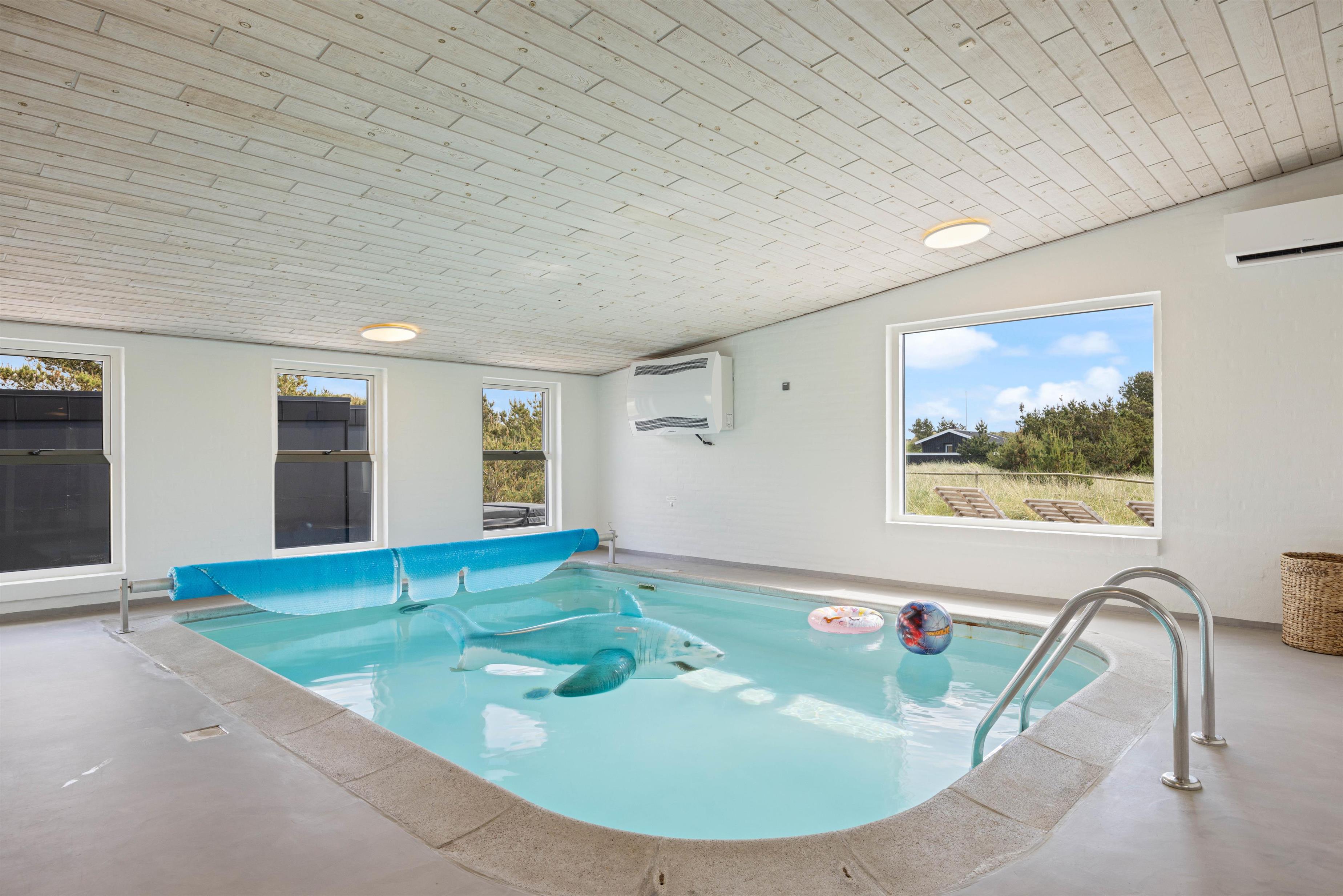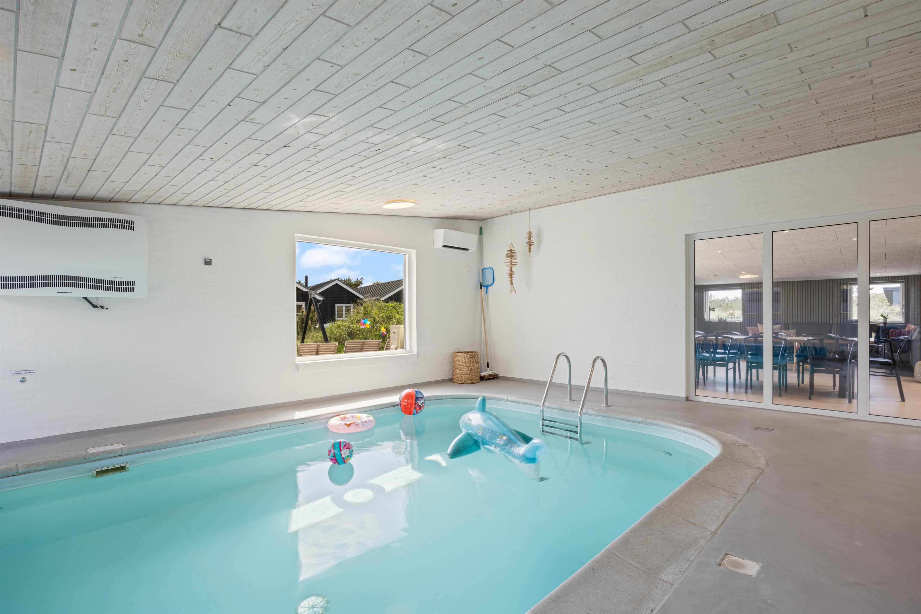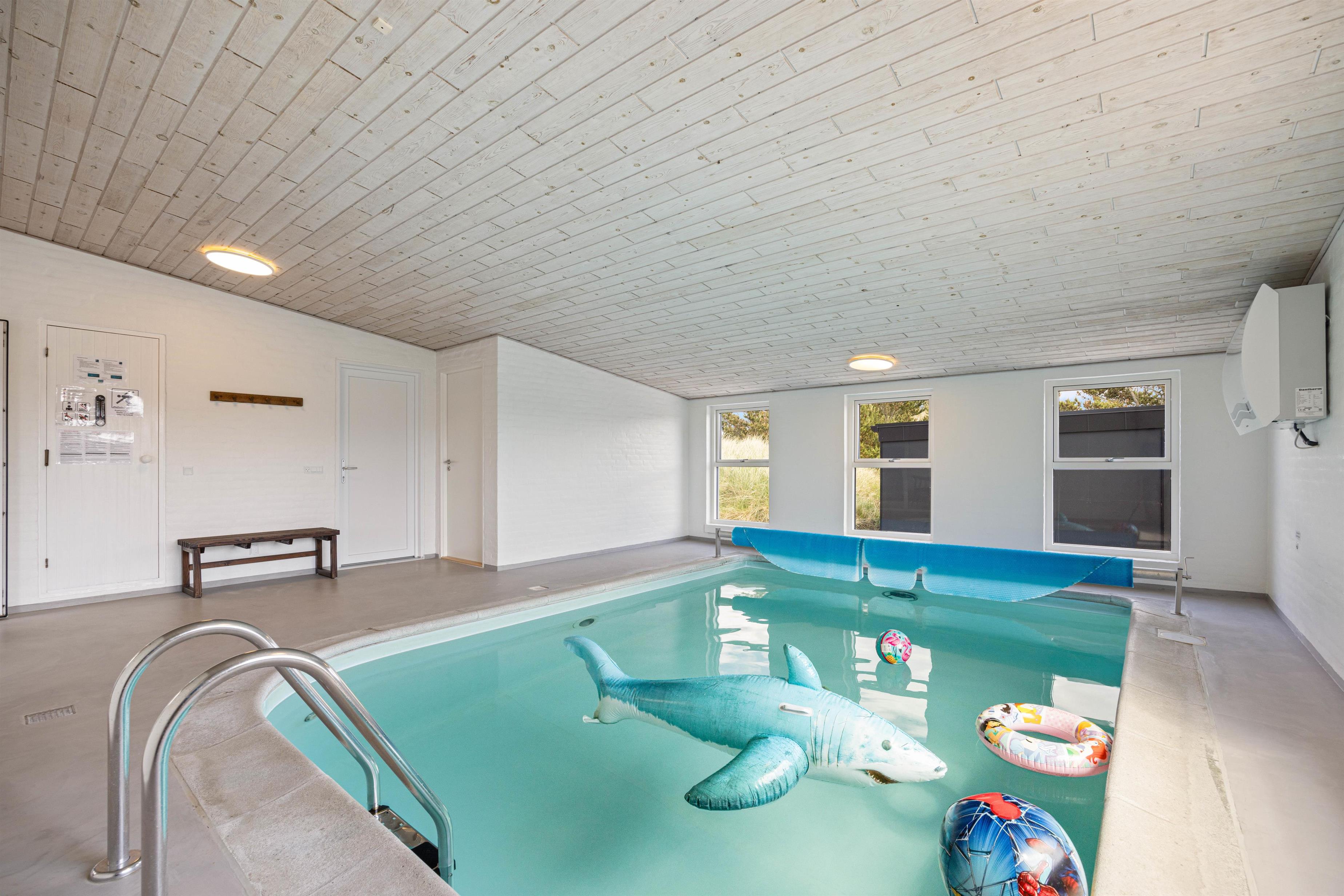 Swimmingpoolen indbyder i den grad til vandplaskeri og er på forhånd opvarmet, når I kommer. Vandværdierne i saltvandspoolen bliver elektronisk overvåget 24 timer i døgnet, så vandkvaliteten altid er helt i top. Der er svømmetræner i poolen og spaen fyldes op med vand fra poolen.
