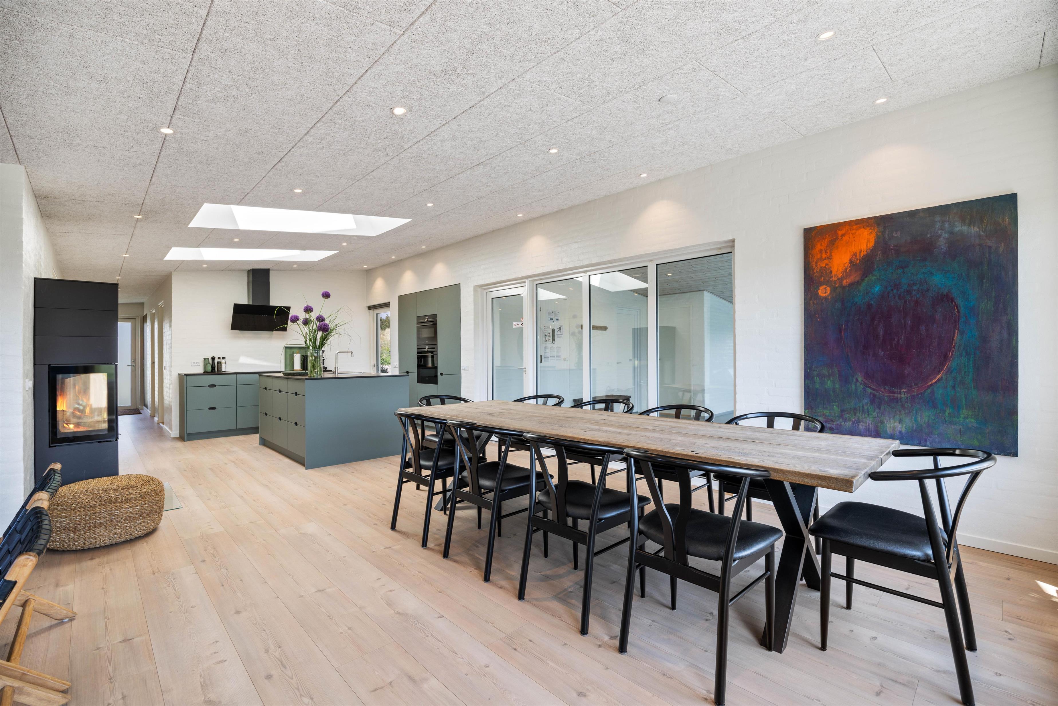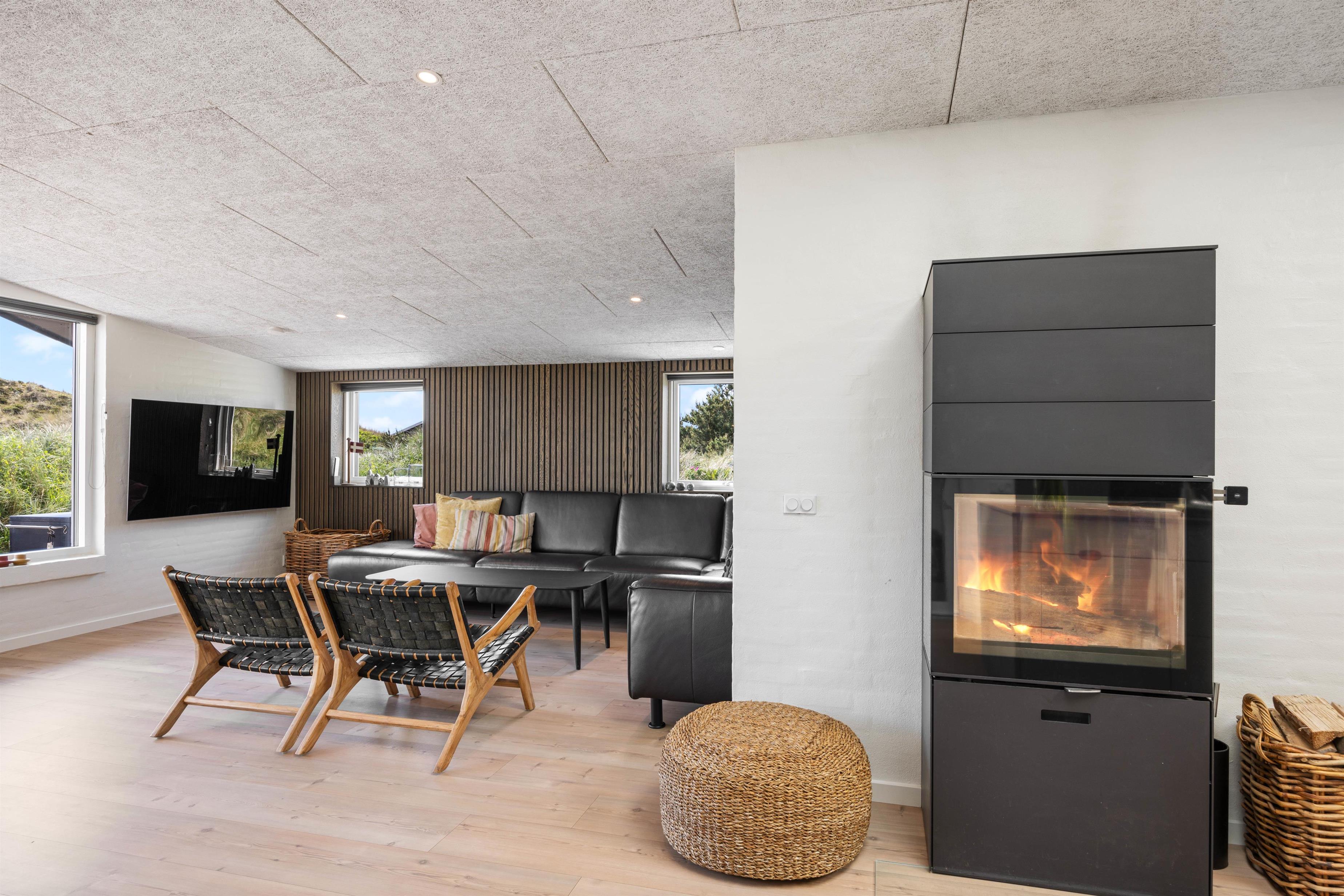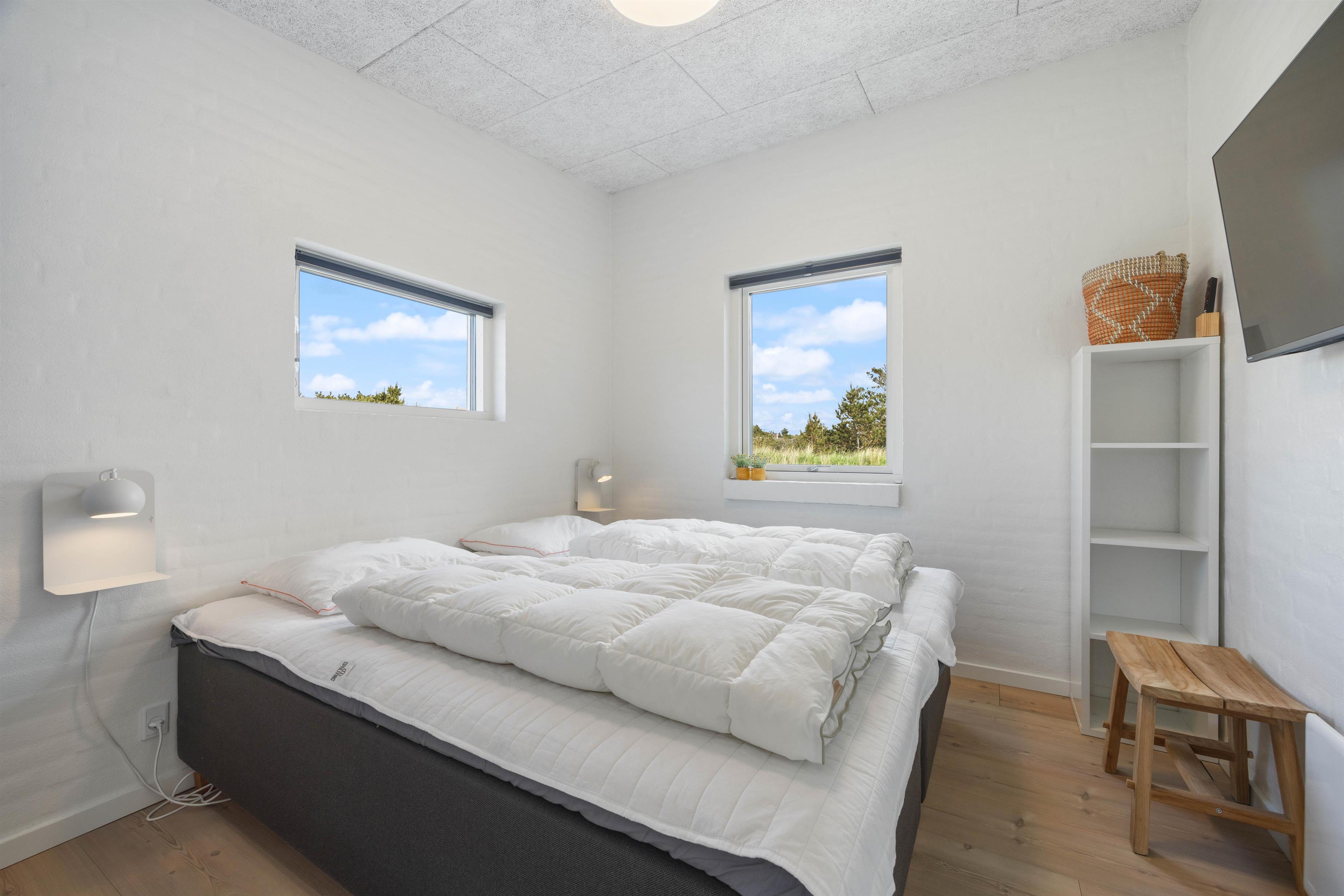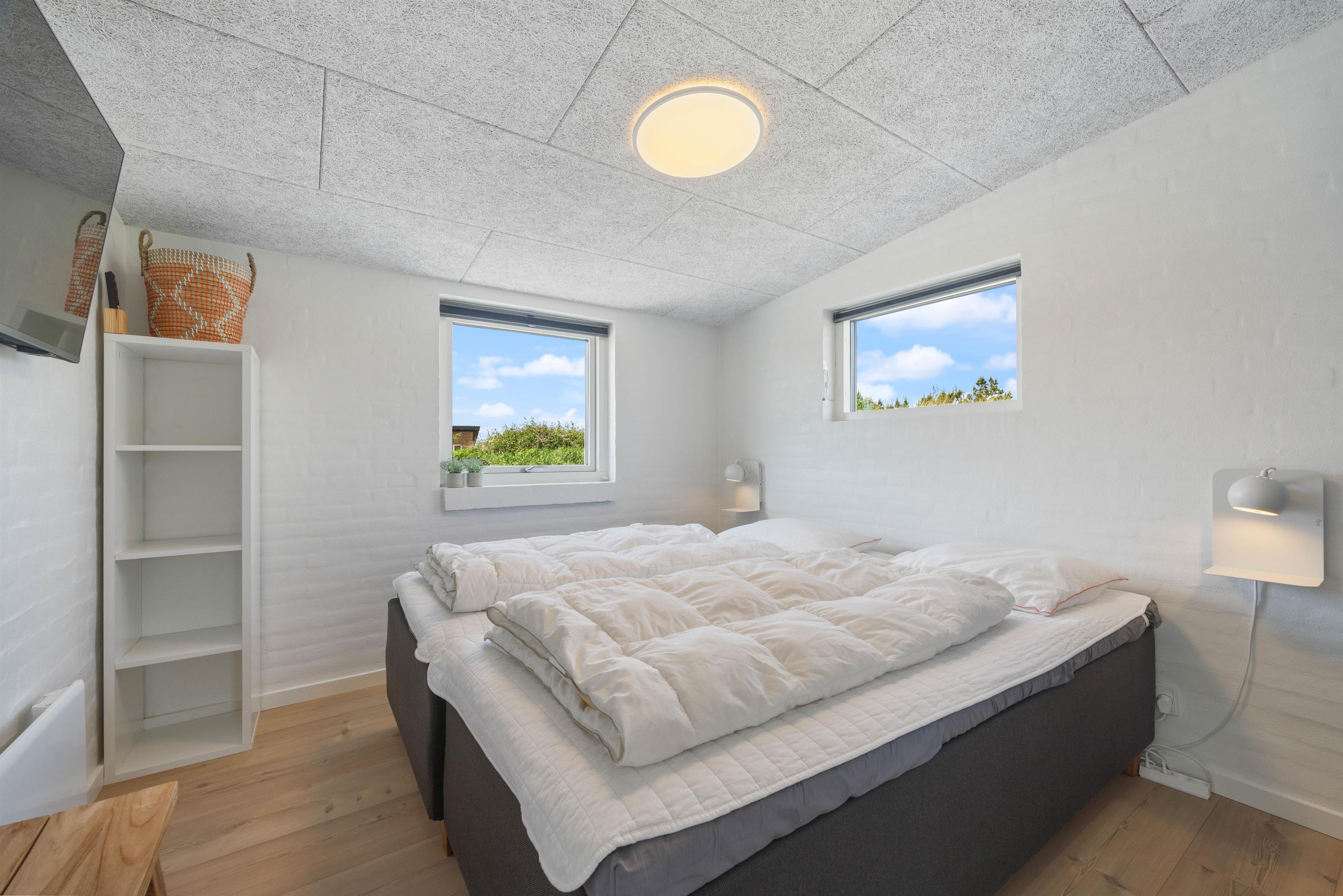 Det 192 kvadratmeter store sommerhus byder jer straks velkommen med dets lyse farver, store rum og lyse vinduespartier. Det store køkkenalrum er det naturlige centrum, hvorfra jeres aktiviteter kan planlægges. Stuen er indrettet med gode og behagelige møbler, som man straks får lyst til at dejse ned i med en god bog. Her er den skønne brændeovn også placeret, som både udsender hygge- og varmebølger. Der er desuden TV på alle værelser, og naturligvis trådløst internet i hele sommerhuset. Efter en lang dag ved stranden, kan I fordele jer i de 10 senge og få en god nattesøvn.