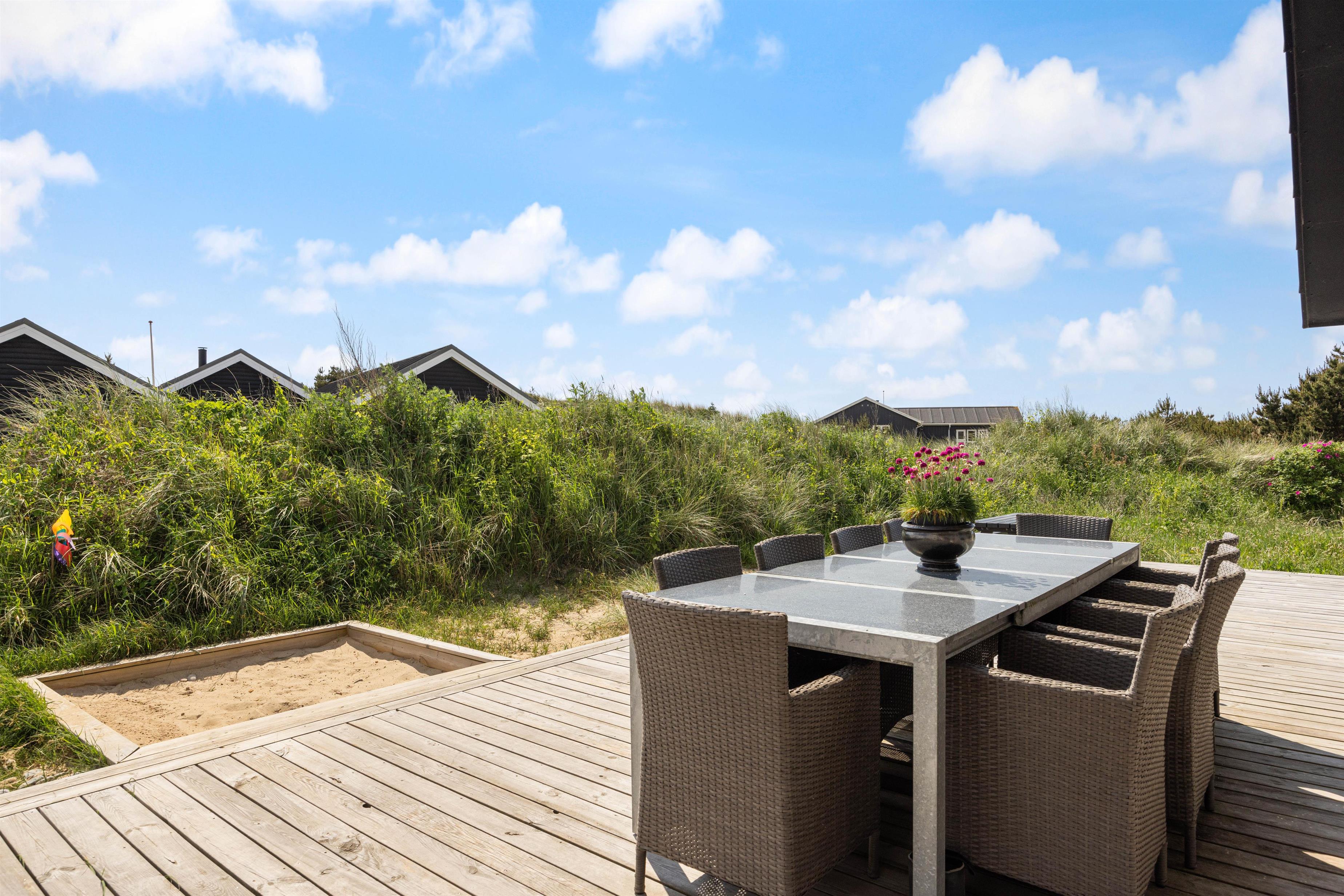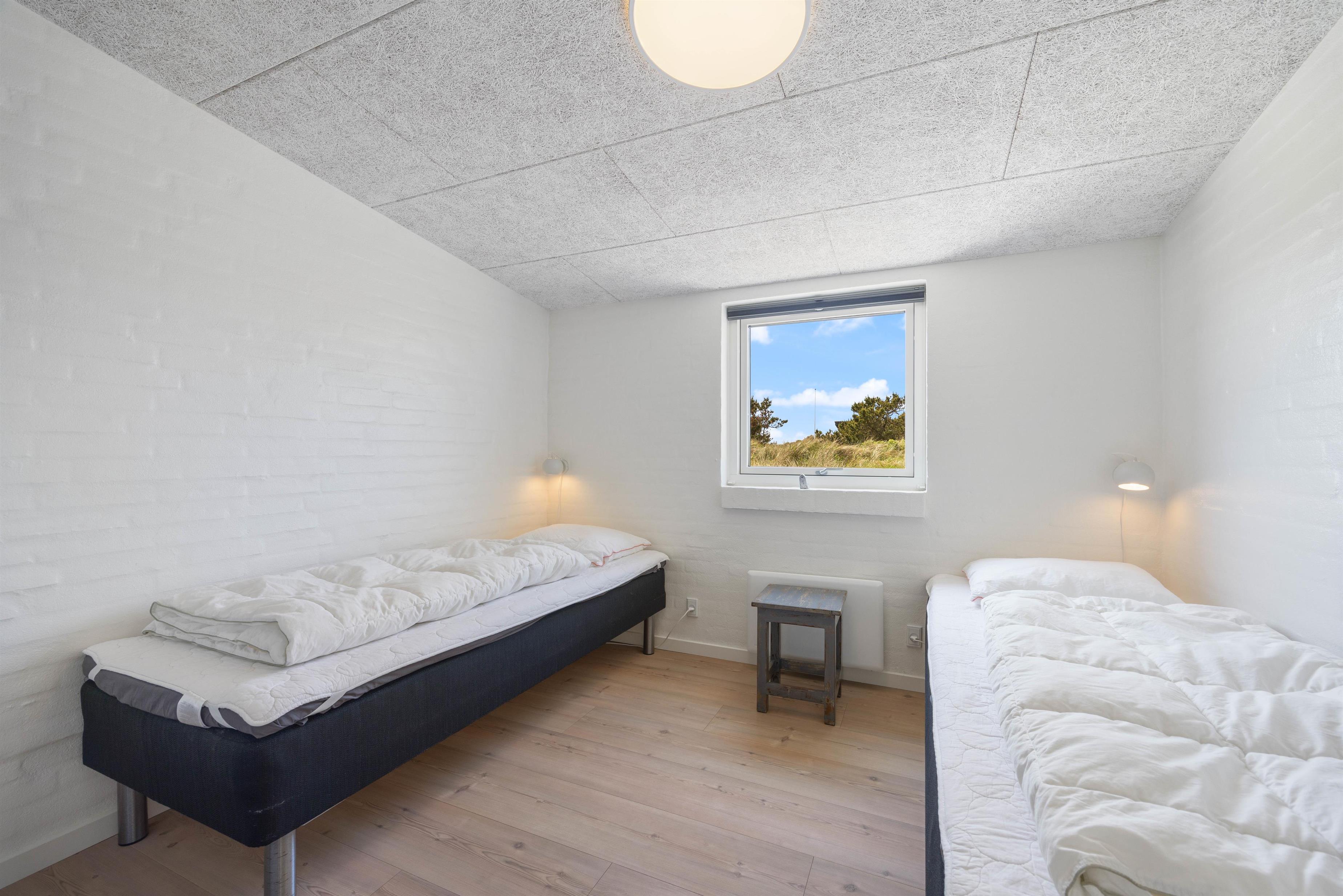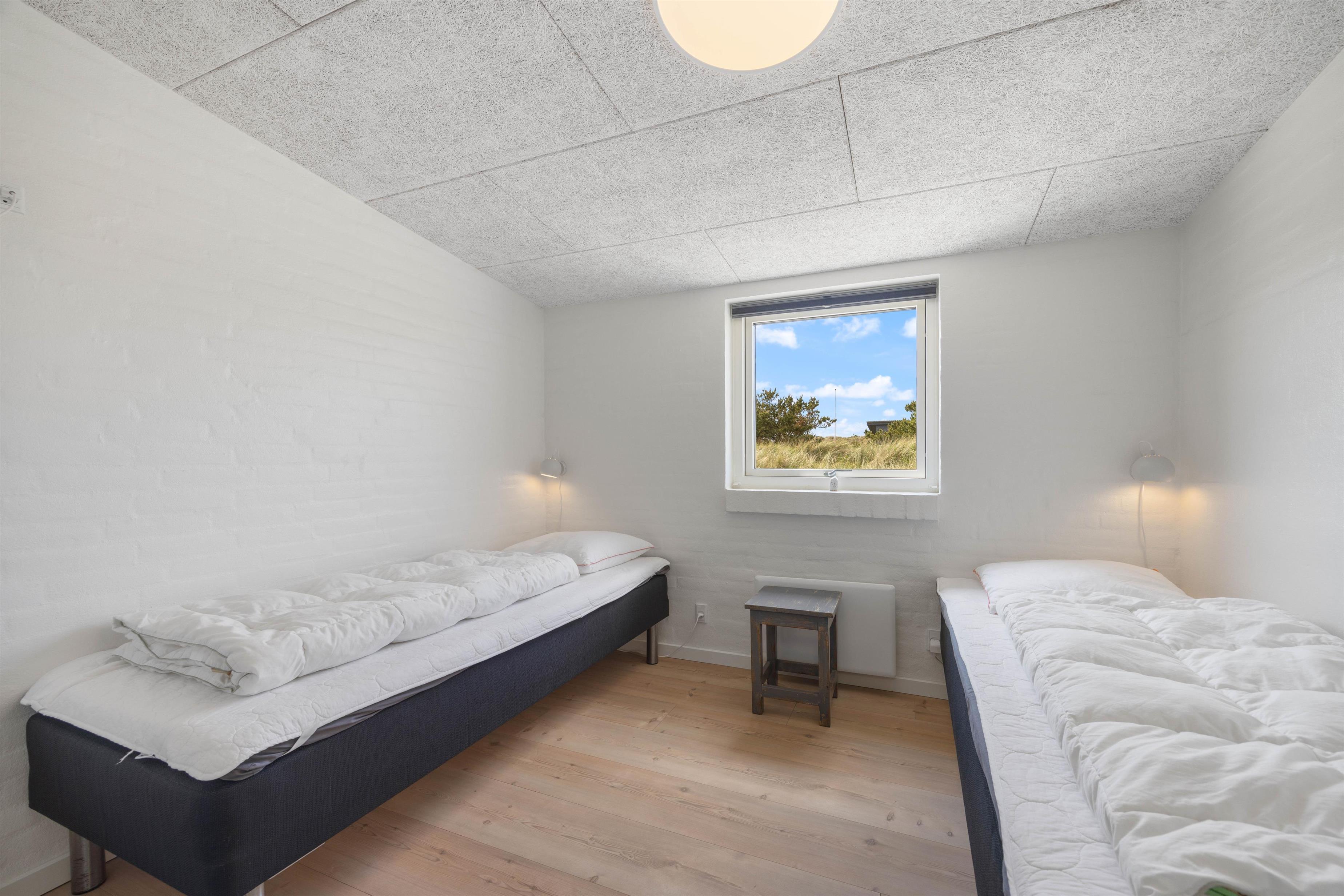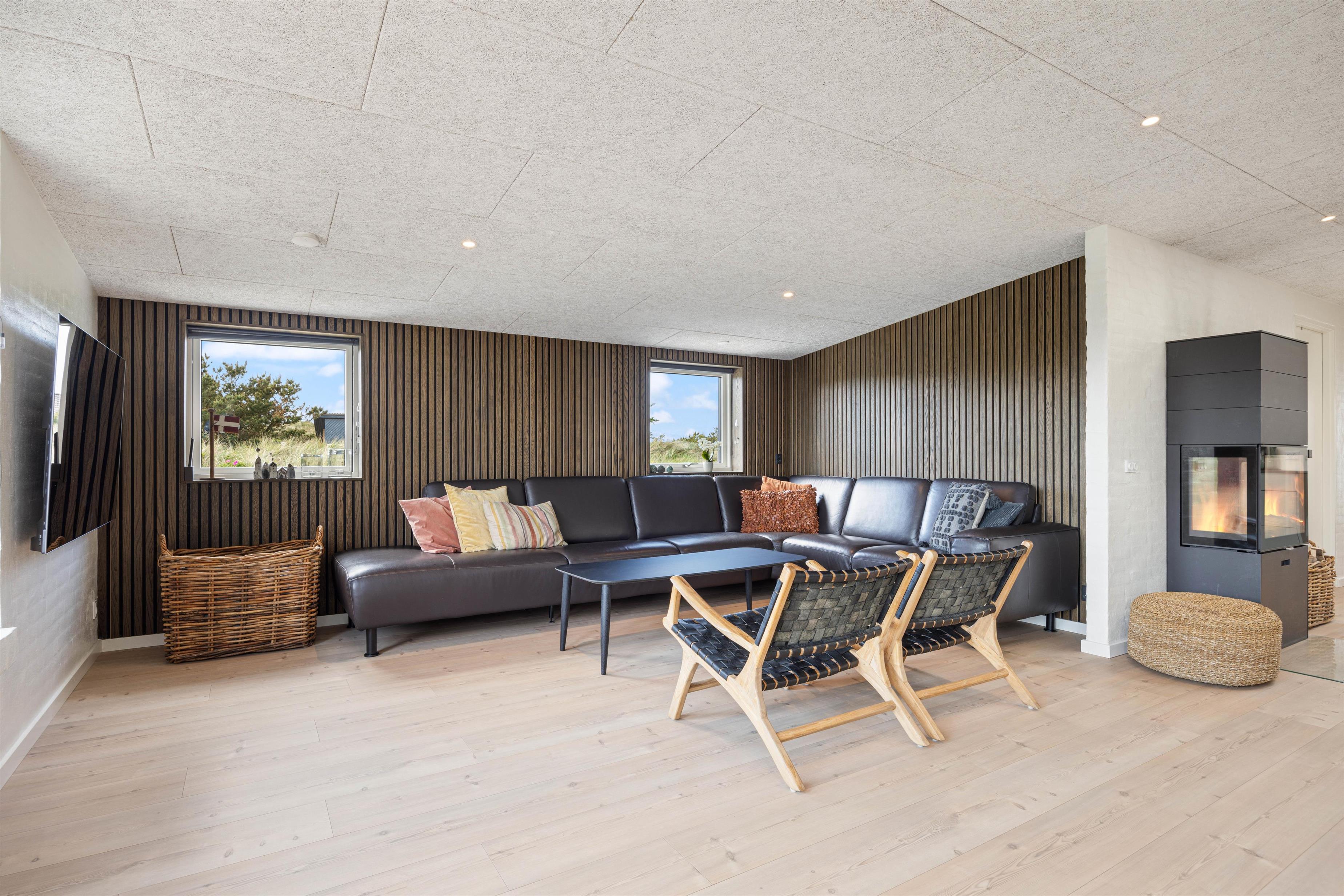Det 192 kvadratmeter store sommerhus byder jer straks velkommen med dets lyse farver, store rum og lyse vinduespartier. Det store køkkenalrum er det naturlige centrum, hvorfra jeres aktiviteter kan planlægges. Stuen er indrettet med gode og behagelige møbler, som man straks får lyst til at dejse ned i med en god bog. Her er den skønne brændeovn også placeret, som både udsender hygge- og varmebølger. Der er desuden TV på alle værelser, og naturligvis trådløst internet i hele sommerhuset. Efter en lang dag ved stranden, kan I fordele jer i de 10 senge og få en god nattesøvn.