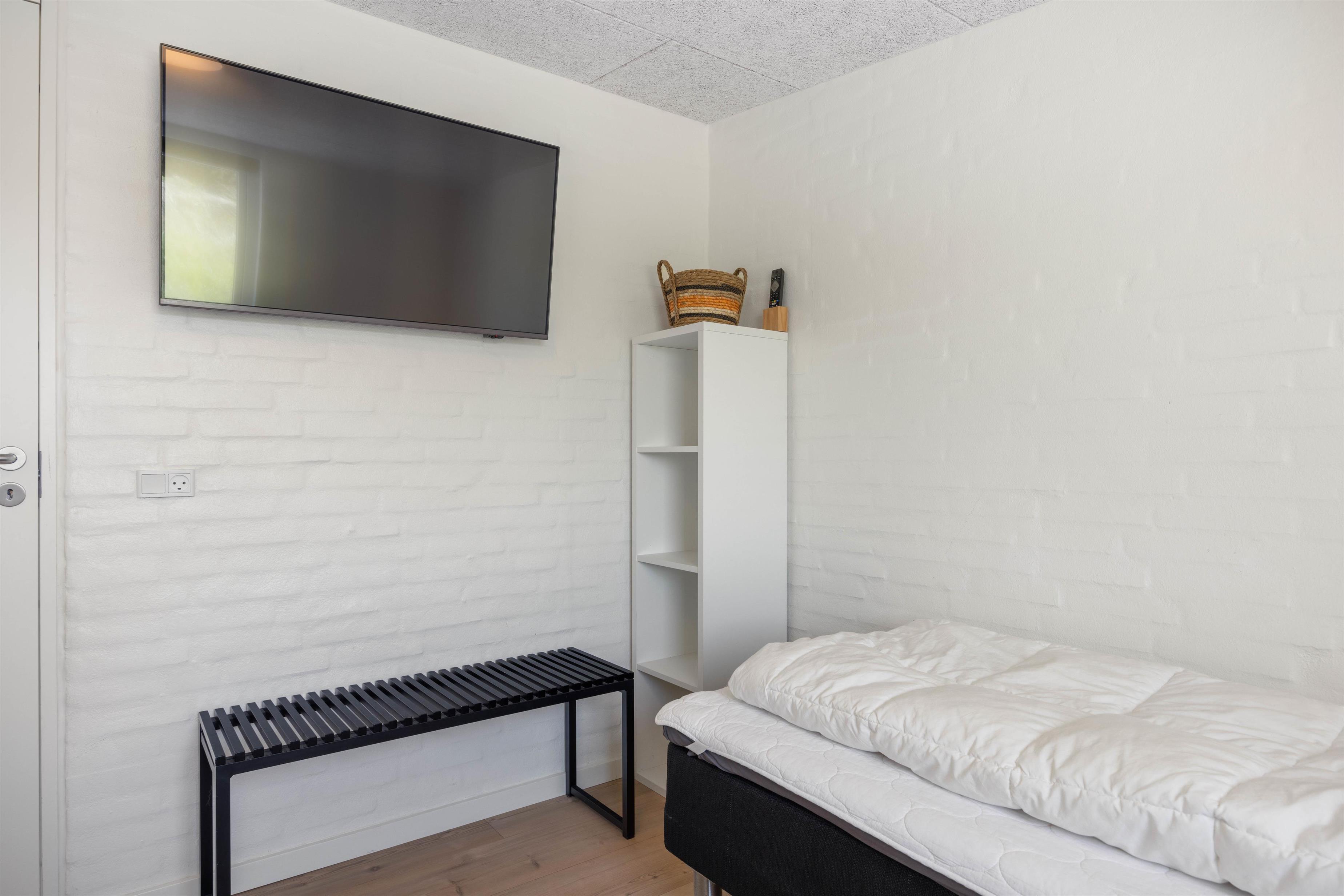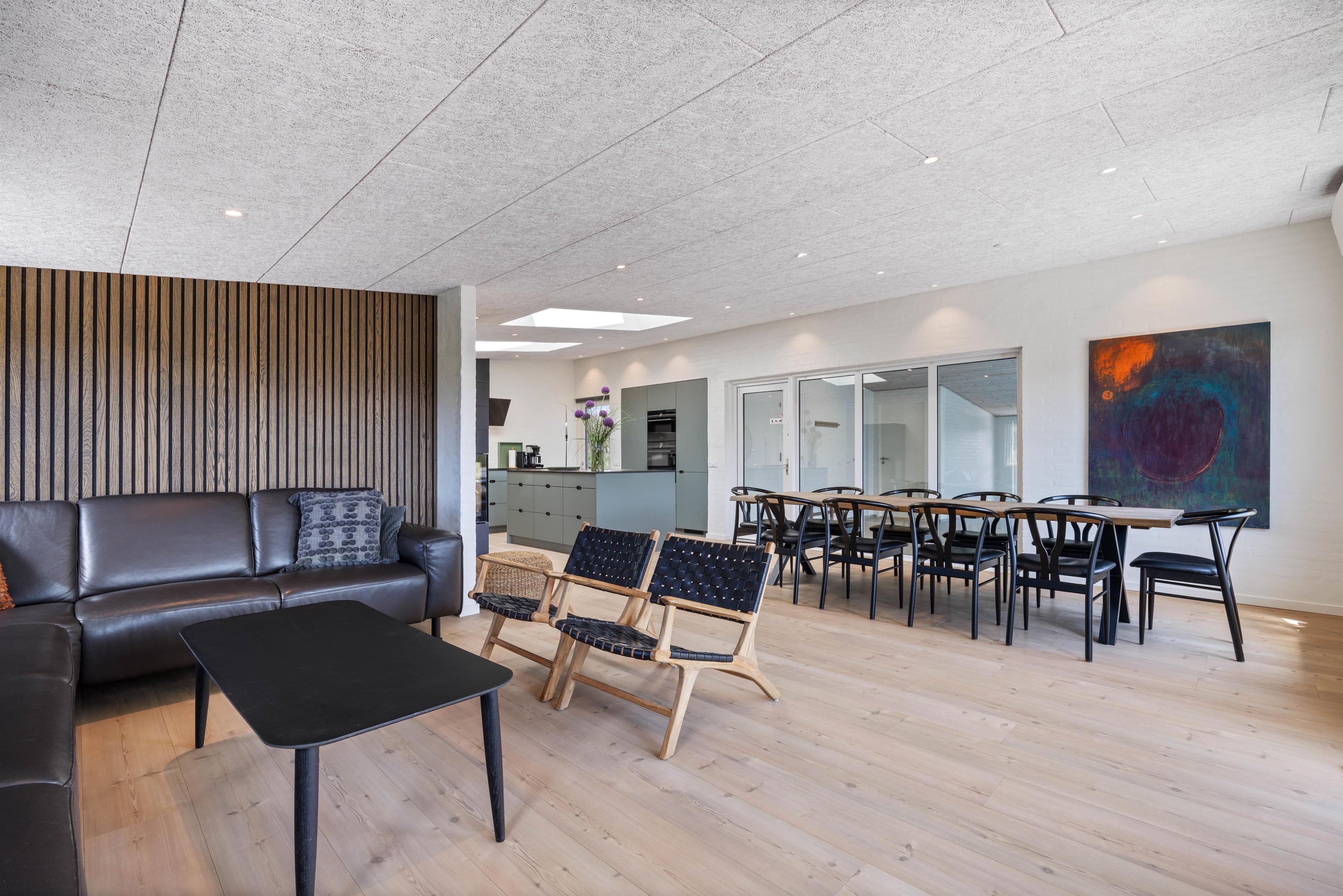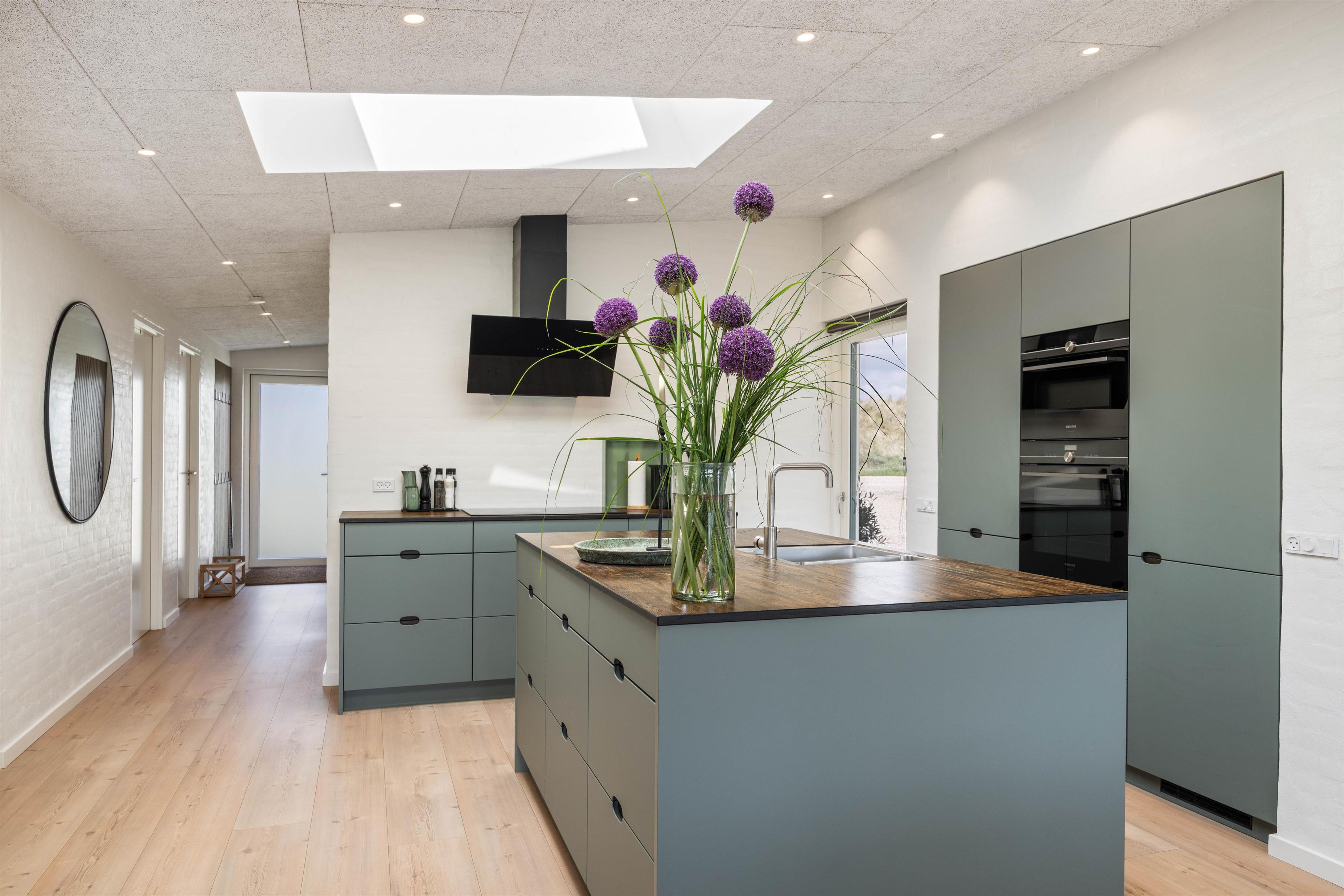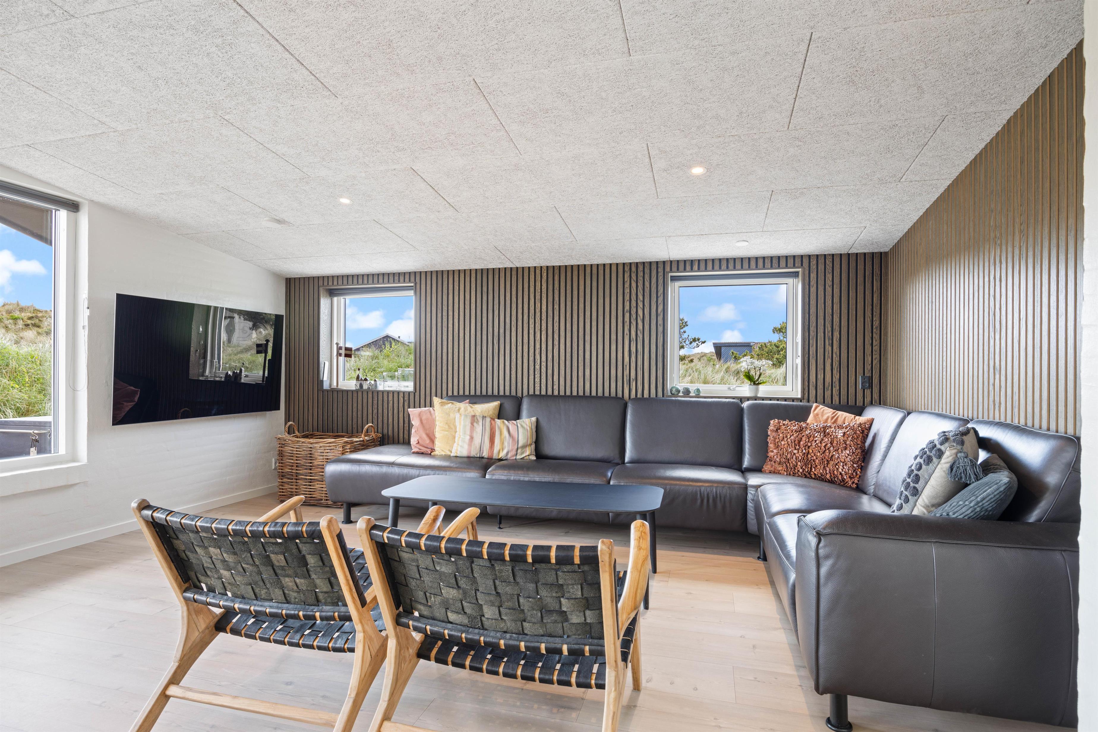Det 192 kvadratmeter store sommerhus byder jer straks velkommen med dets lyse farver, store rum og lyse vinduespartier. Det store køkkenalrum er det naturlige centrum, hvorfra jeres aktiviteter kan planlægges. Stuen er indrettet med gode og behagelige møbler, som man straks får lyst til at dejse ned i med en god bog. Her er den skønne brændeovn også placeret, som både udsender hygge- og varmebølger. Der er desuden TV på alle værelser, og naturligvis trådløst internet i hele sommerhuset. Efter en lang dag ved stranden, kan I fordele jer i de 10 senge og få en god nattesøvn.