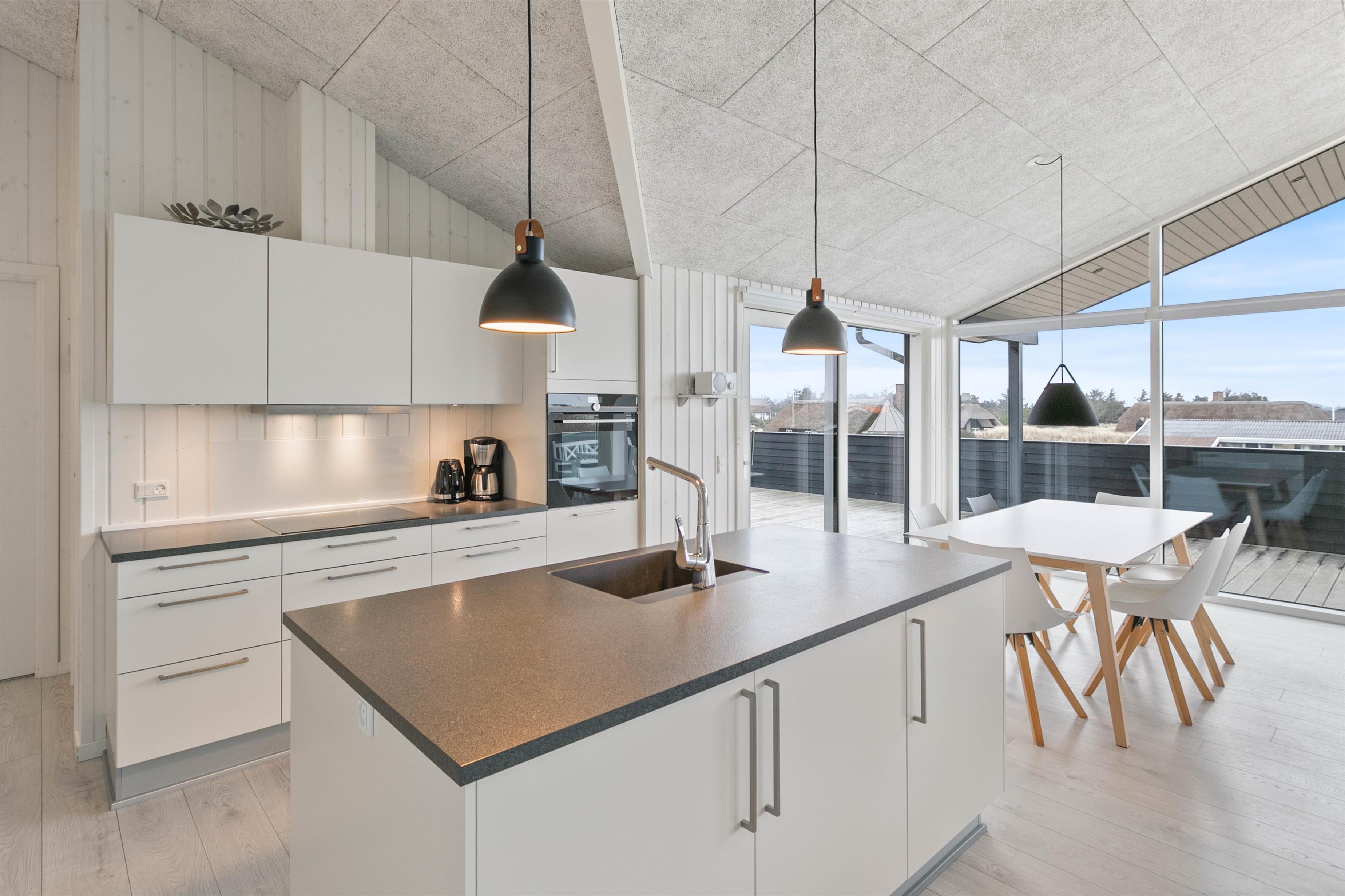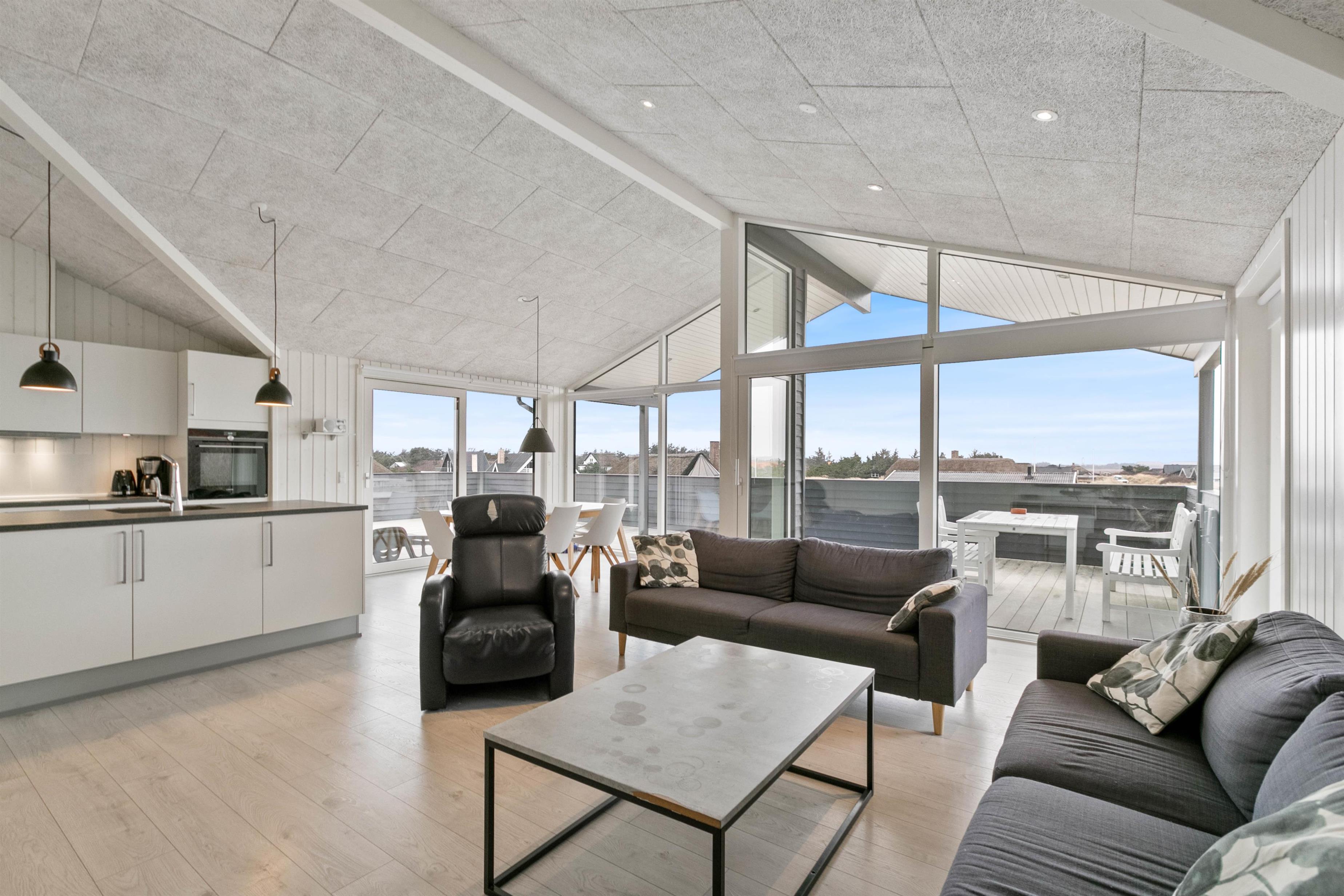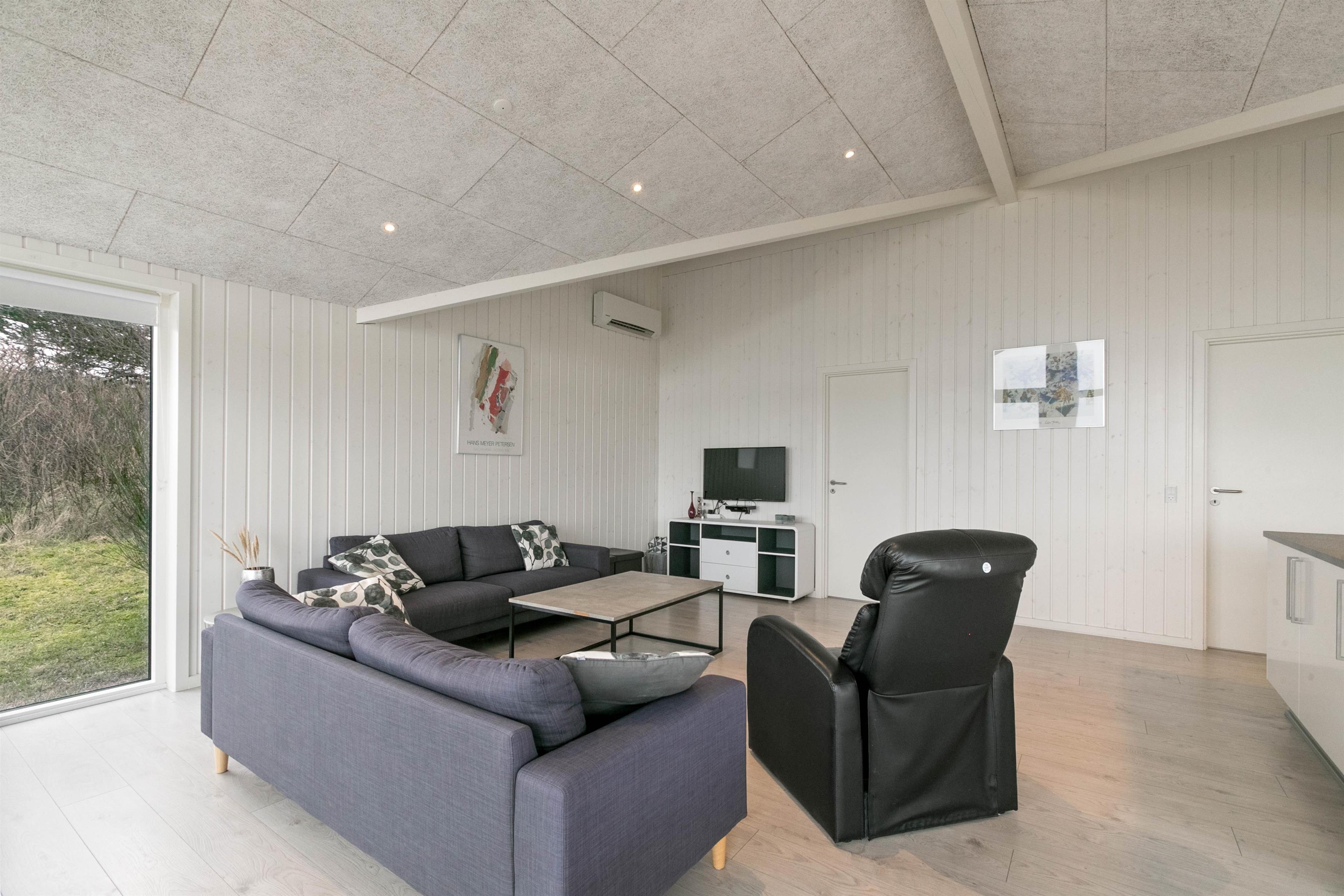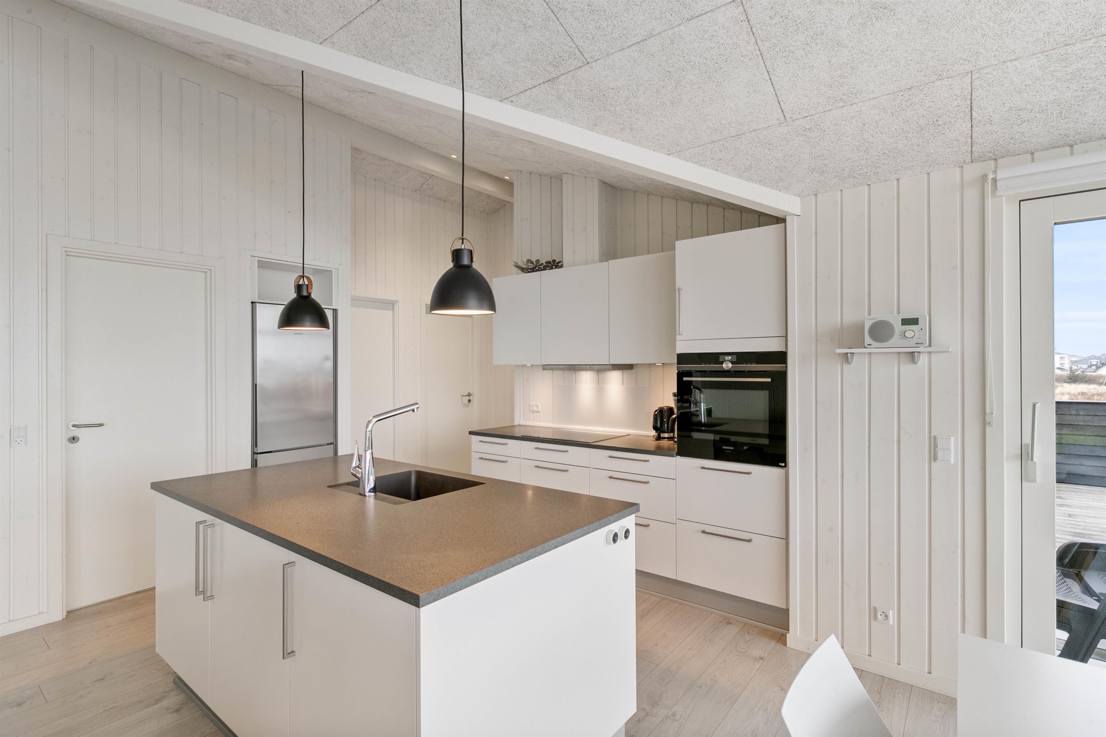 I det velindrettede ferierum er stue, køkken og spiseafdeling slået sammen til ét stort fællesrum, hvor rammerne er sat for en masse nye ferieminder med hele familien. Huset er rummeligt hele vejen igennem, den smagfulde indretning skaber en god ferieatmosfære og de store vinduer lukker solens lys indenfor. Det skønne troldtekts loft der går helt til kip, er også en fantastisk detalje ved dette hus, da det også skaber en god rummelig rumfornemmelse, hvor I virkelig kan slappe af.
