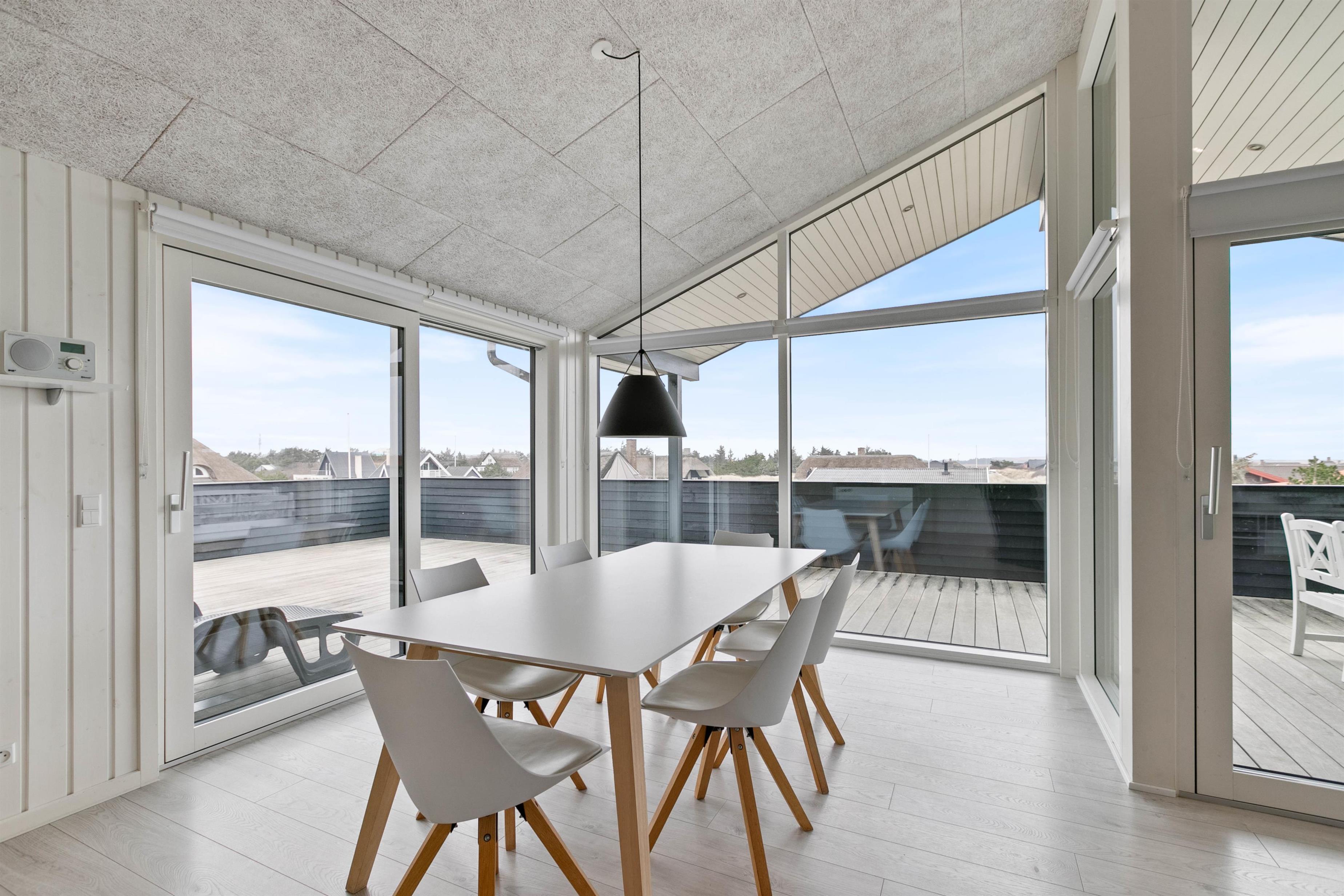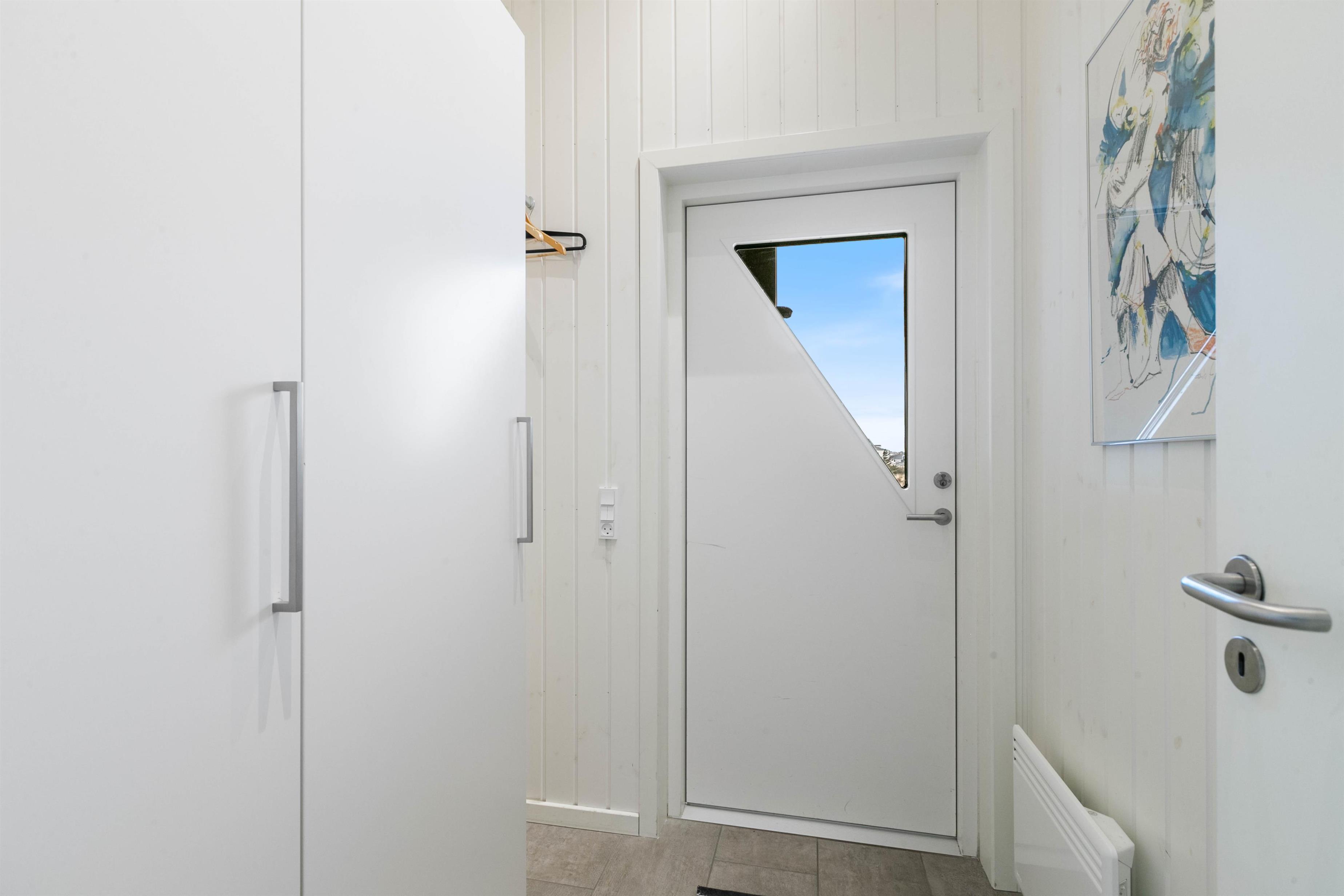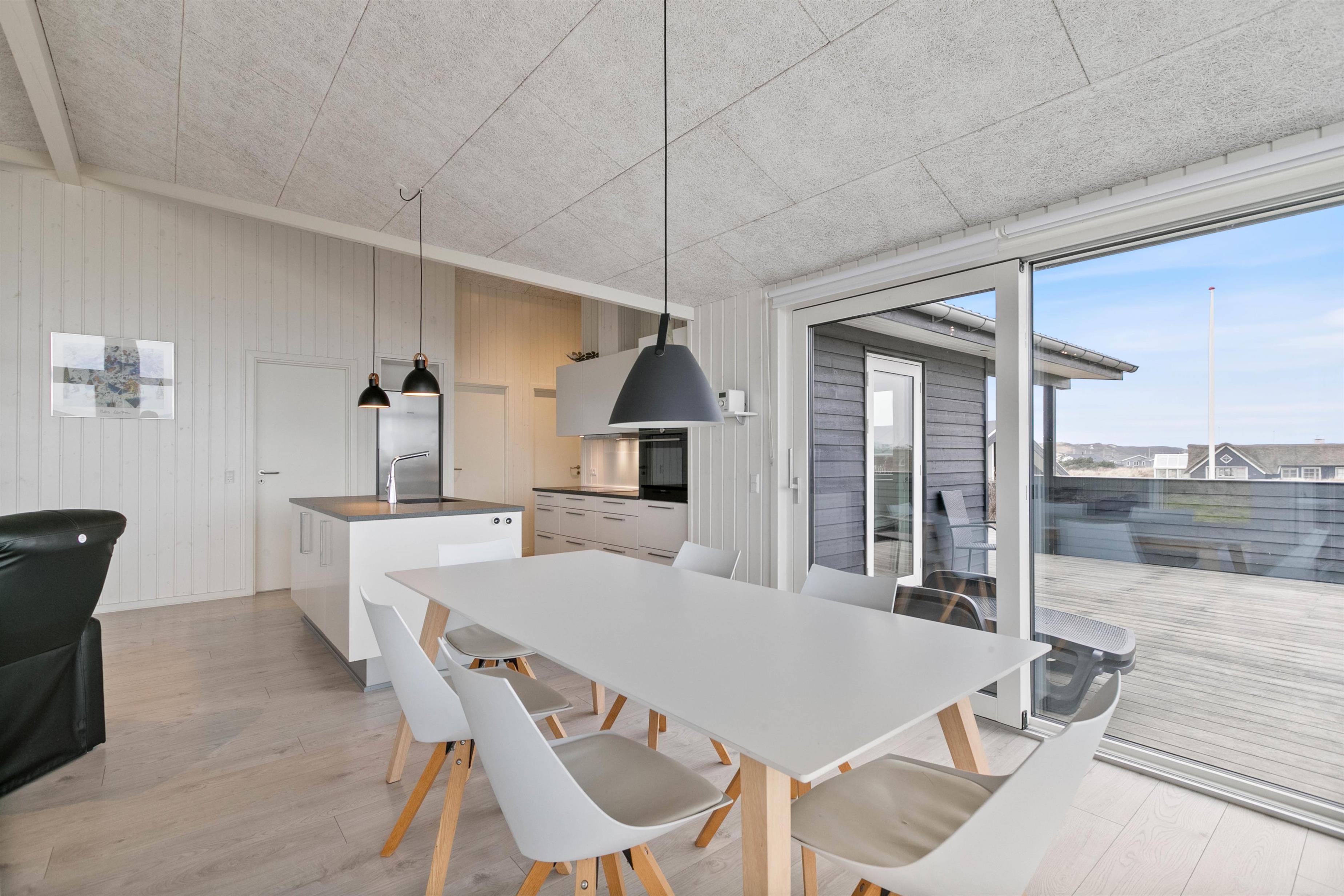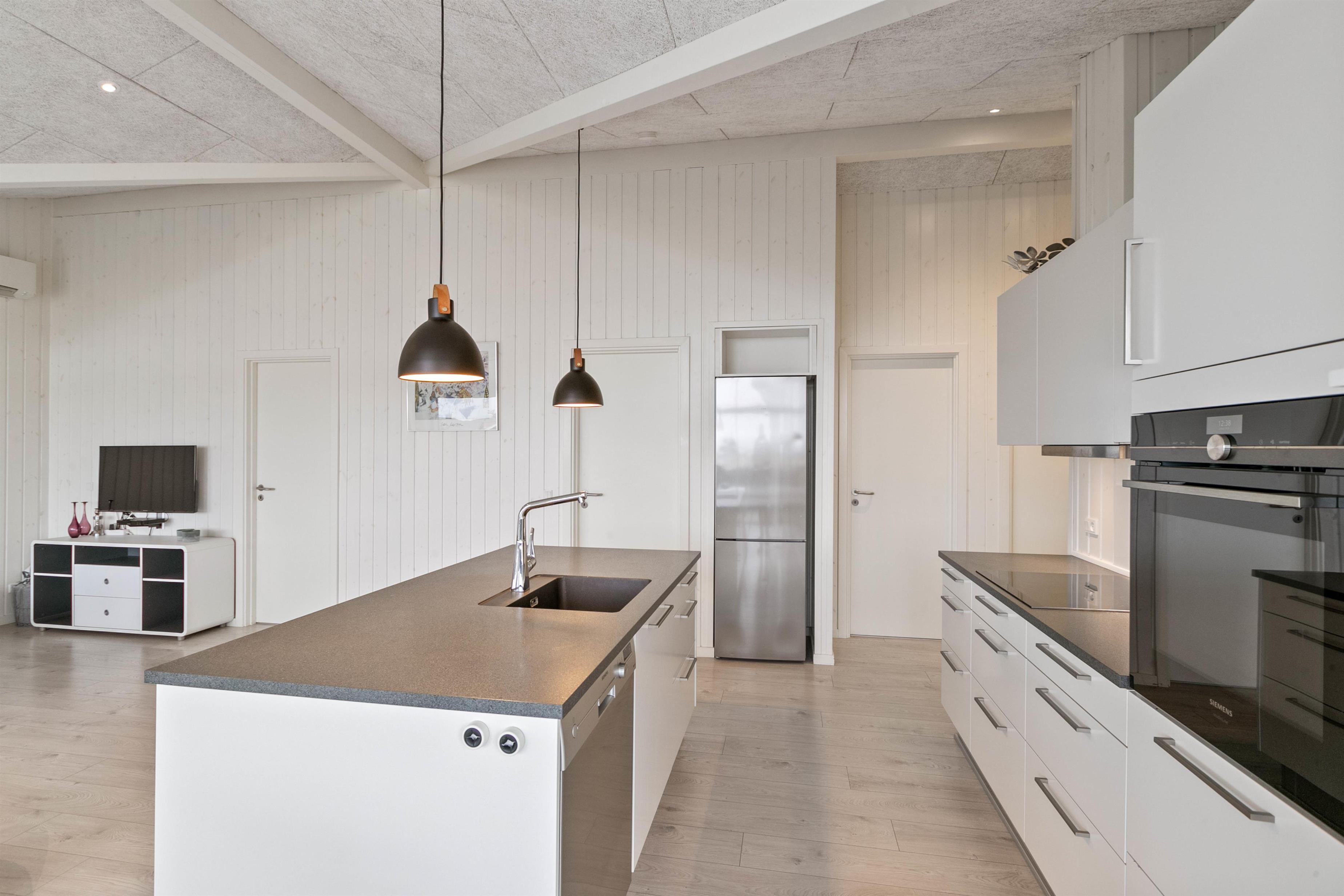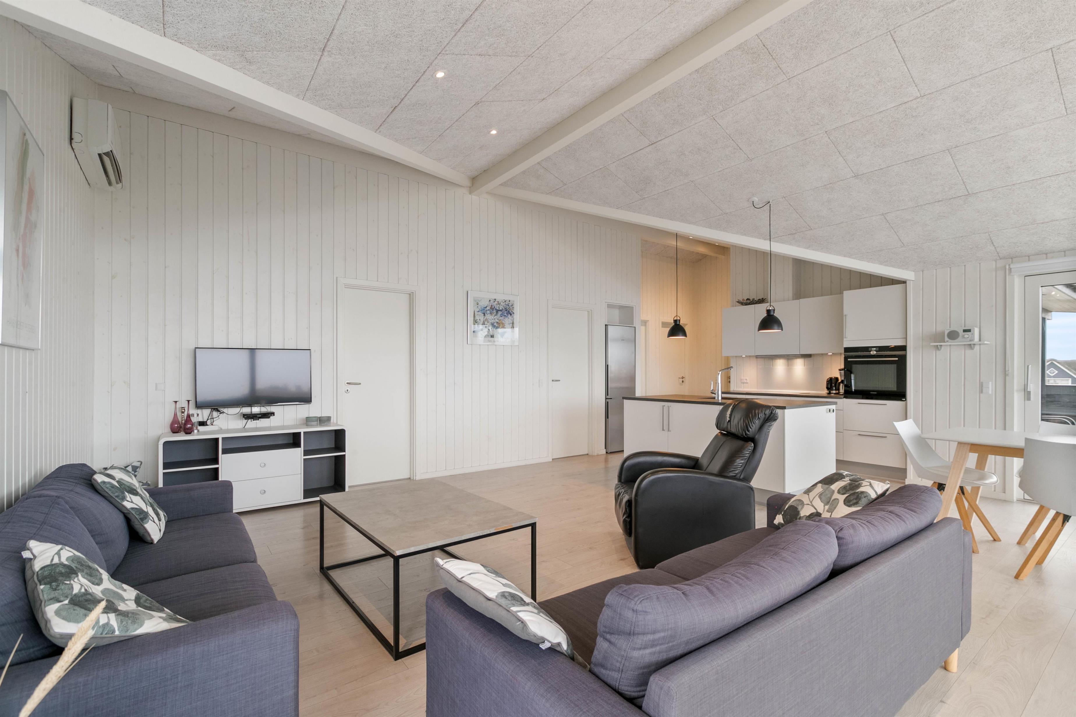 I det velindrettede ferierum er stue, køkken og spiseafdeling slået sammen til ét stort fællesrum, hvor rammerne er sat for en masse nye ferieminder med hele familien. Huset er rummeligt hele vejen igennem, den smagfulde indretning skaber en god ferieatmosfære og de store vinduer lukker solens lys indenfor. Det skønne troldtekts loft der går helt til kip, er også en fantastisk detalje ved dette hus, da det også skaber en god rummelig rumfornemmelse, hvor I virkelig kan slappe af.
