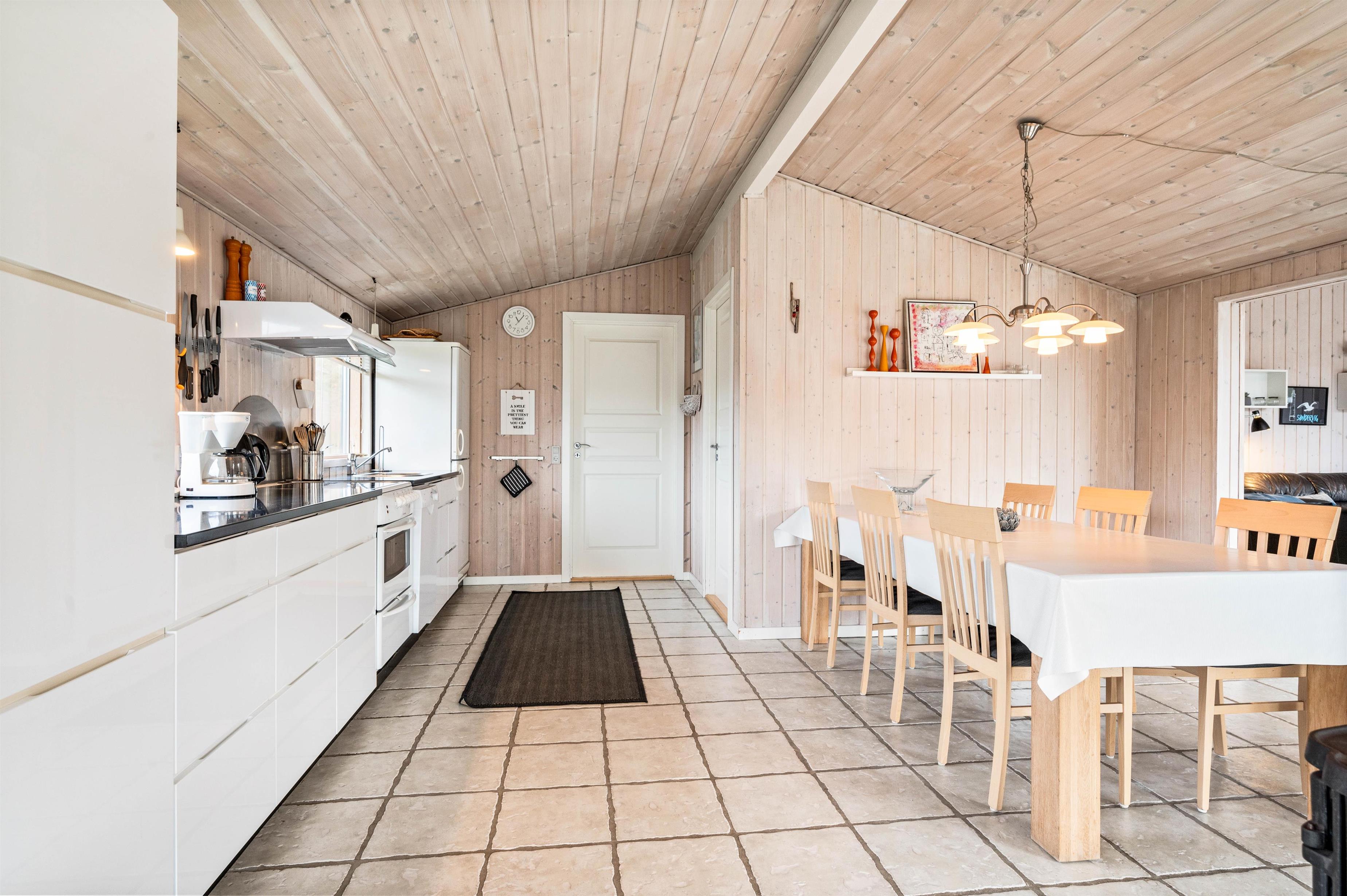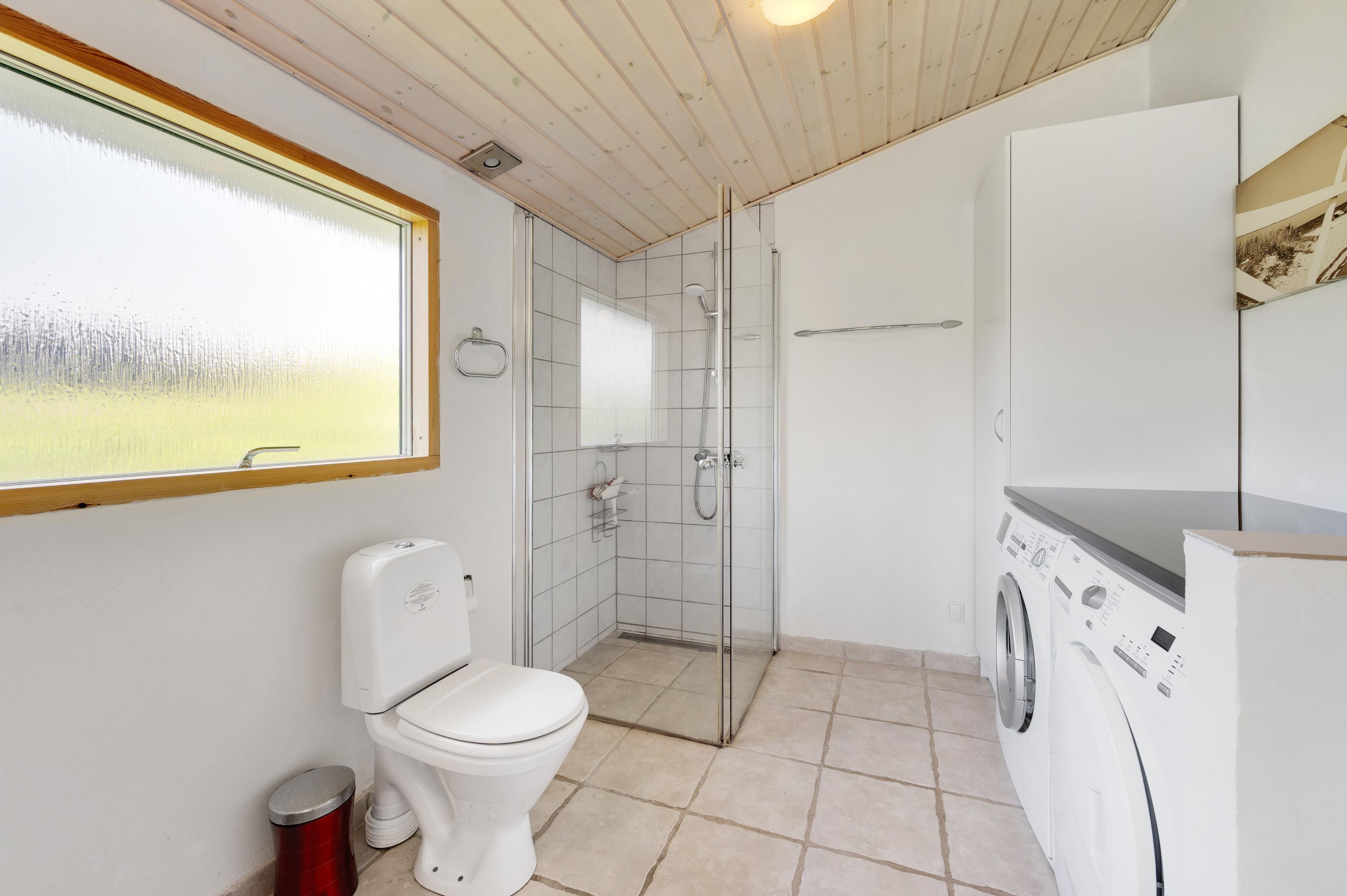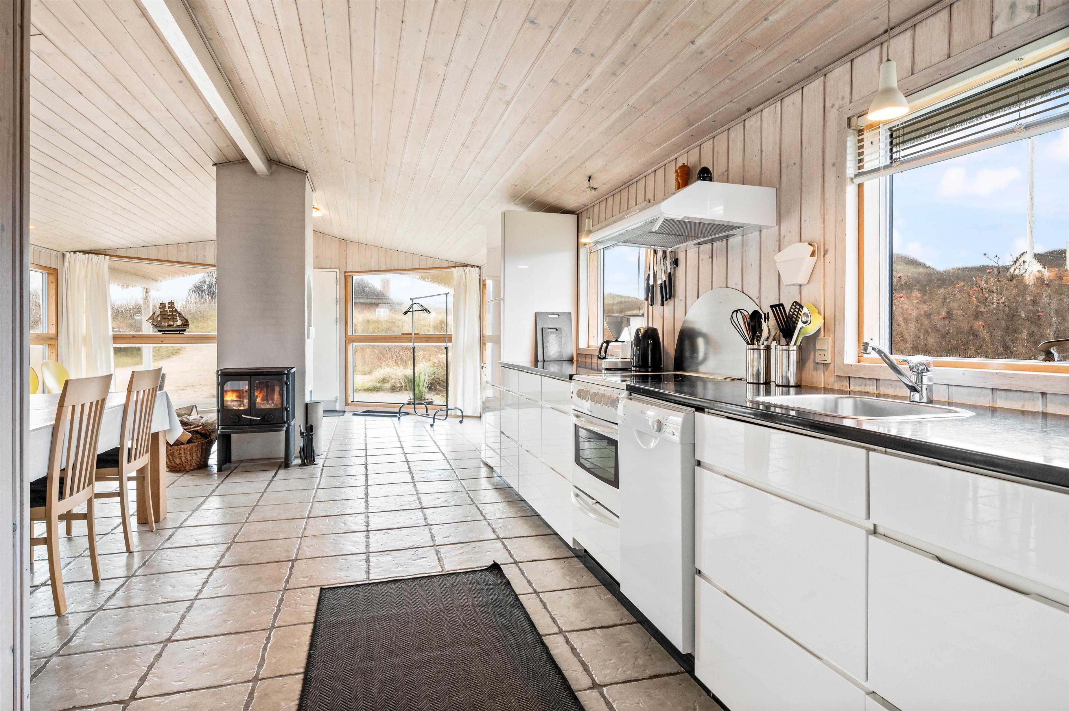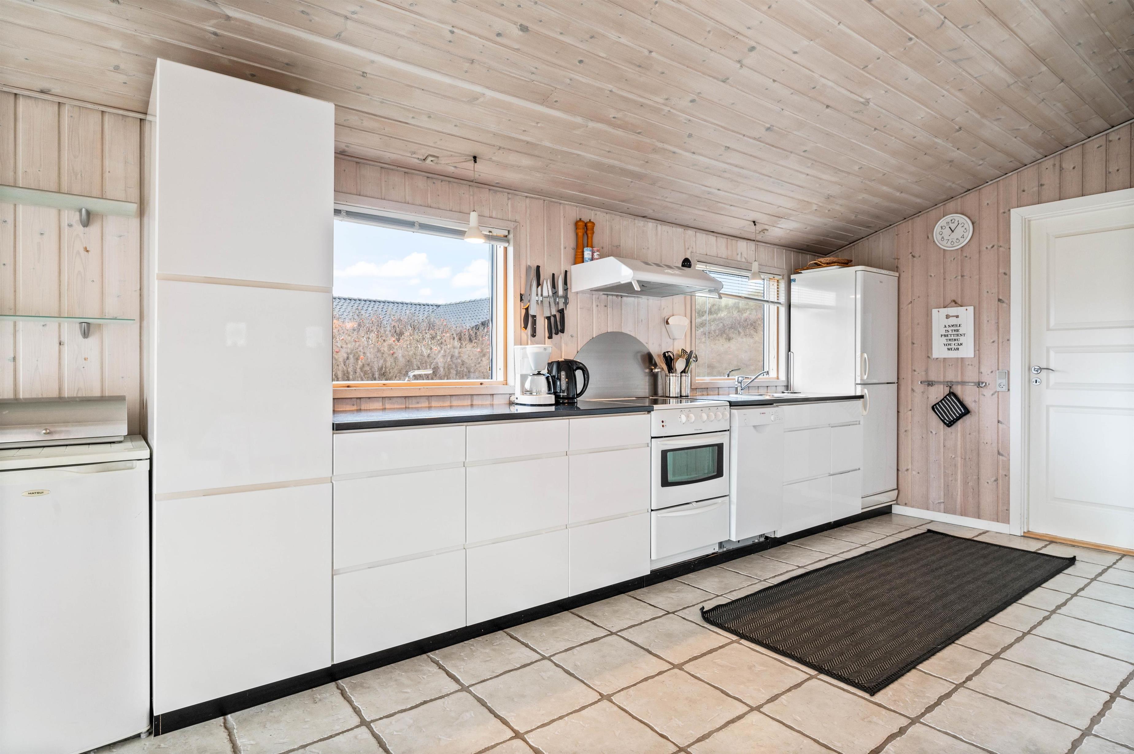 For jer, der elsker at kombinere hygge med funktionelle bekvemmeligheder, er dette sommerhus i Søndervig det ideelle valg. Køkkenet er fuldt udstyret med en opvaskemaskine, så I kan spare tid og nyde jeres ferie fuldt ud uden at skulle bekymre jer om opvasken. Det kombinerede spise- og opholdsområde inviterer til hyggelige måltider og afslappende aftener sammen. Desuden er der en vaskemaskine og tørretumbler, der giver ekstra bekvemmelighed under jeres ophold. Sommerhuset har også et redskabsrum, der kan aflåses, hvilket giver ekstra sikkerhed for jeres ejendele.