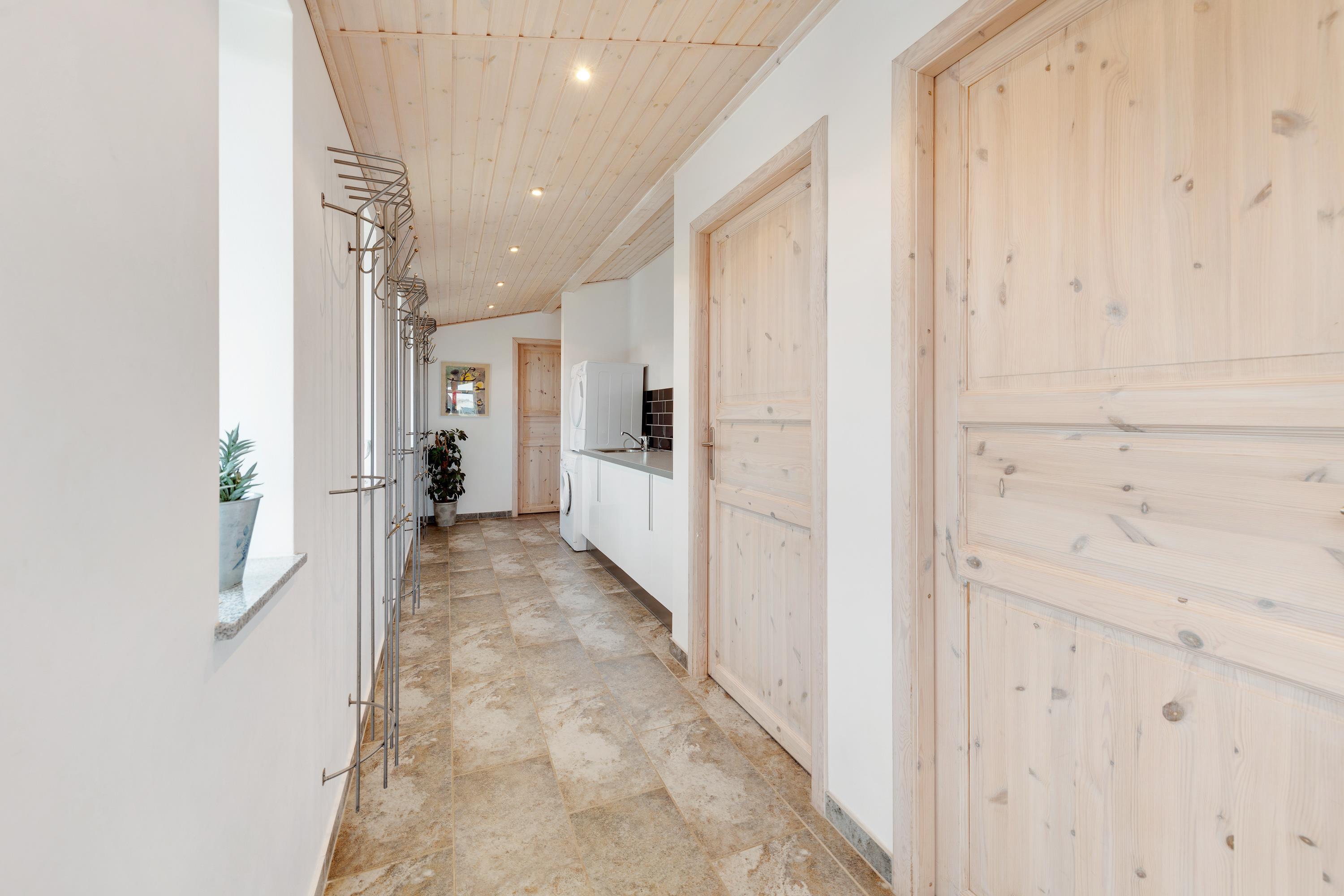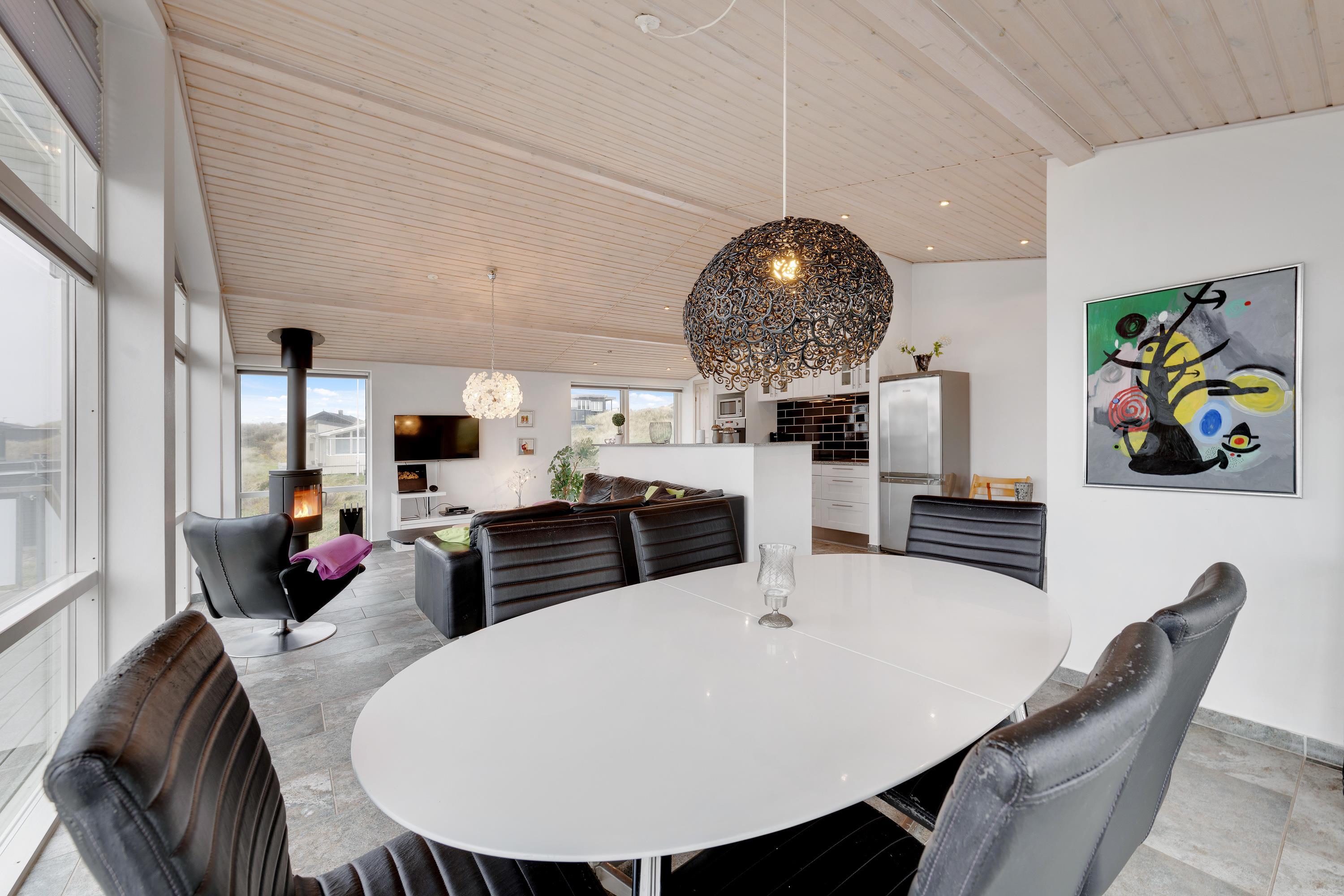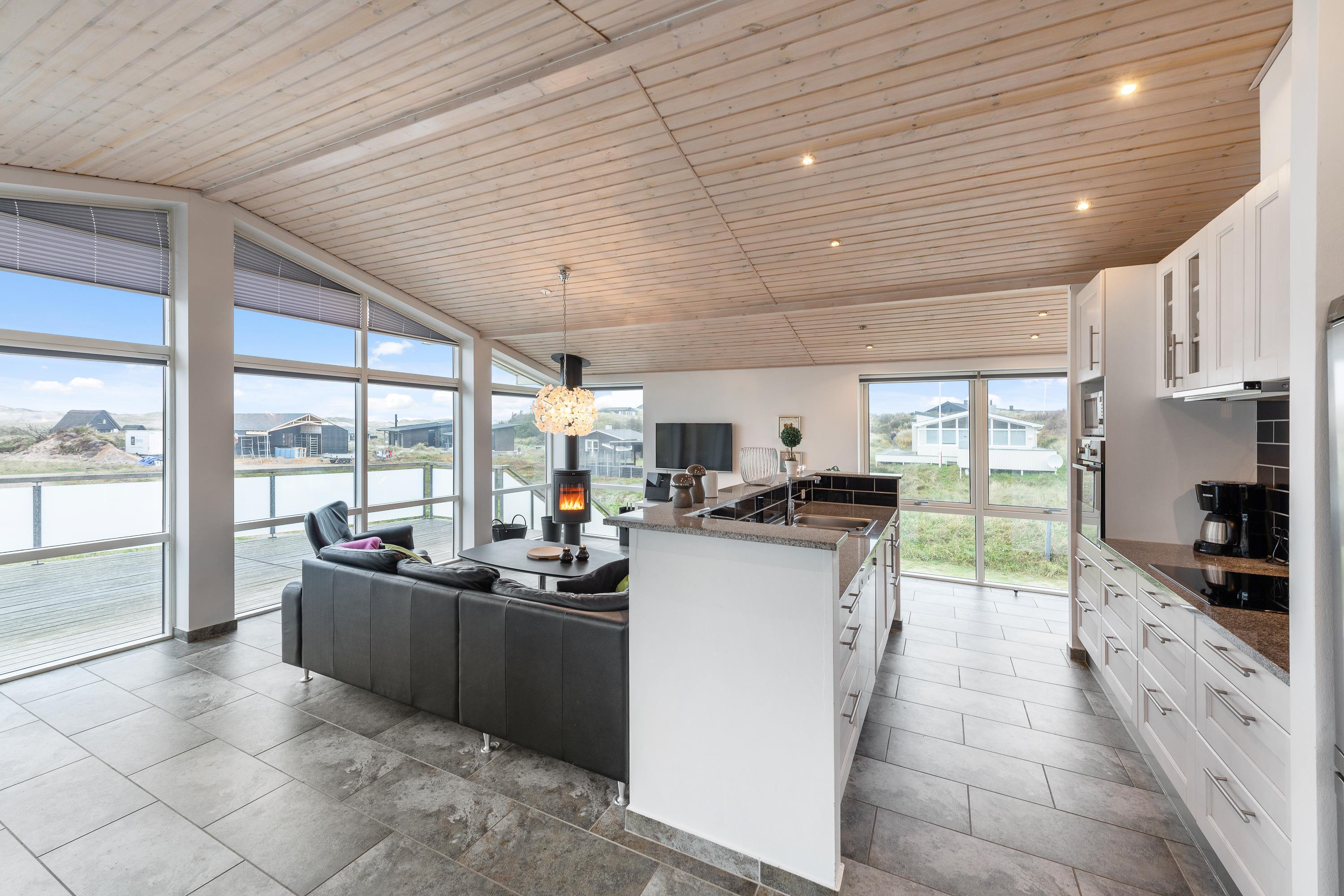 Feriehuset har en flot og moderne indretning med masser af gode, praktiske detaljer, som giver en følelse af afslapning og velvære. Efter en lang og aktiv dag ude kan I eksempelvis hoppe en tur i husets spabad eller nyde en lækker middag i spisestuen. De store vinduer, som går fra gulv til loft skaber en flot panorama-udsigt over det omkringliggende landskab og inviterer både lys og naturen indenfor. Huset er praktisk indrettet med klinkegulv og har desuden tre store, lyse soverum og to flotte badeværelser.
