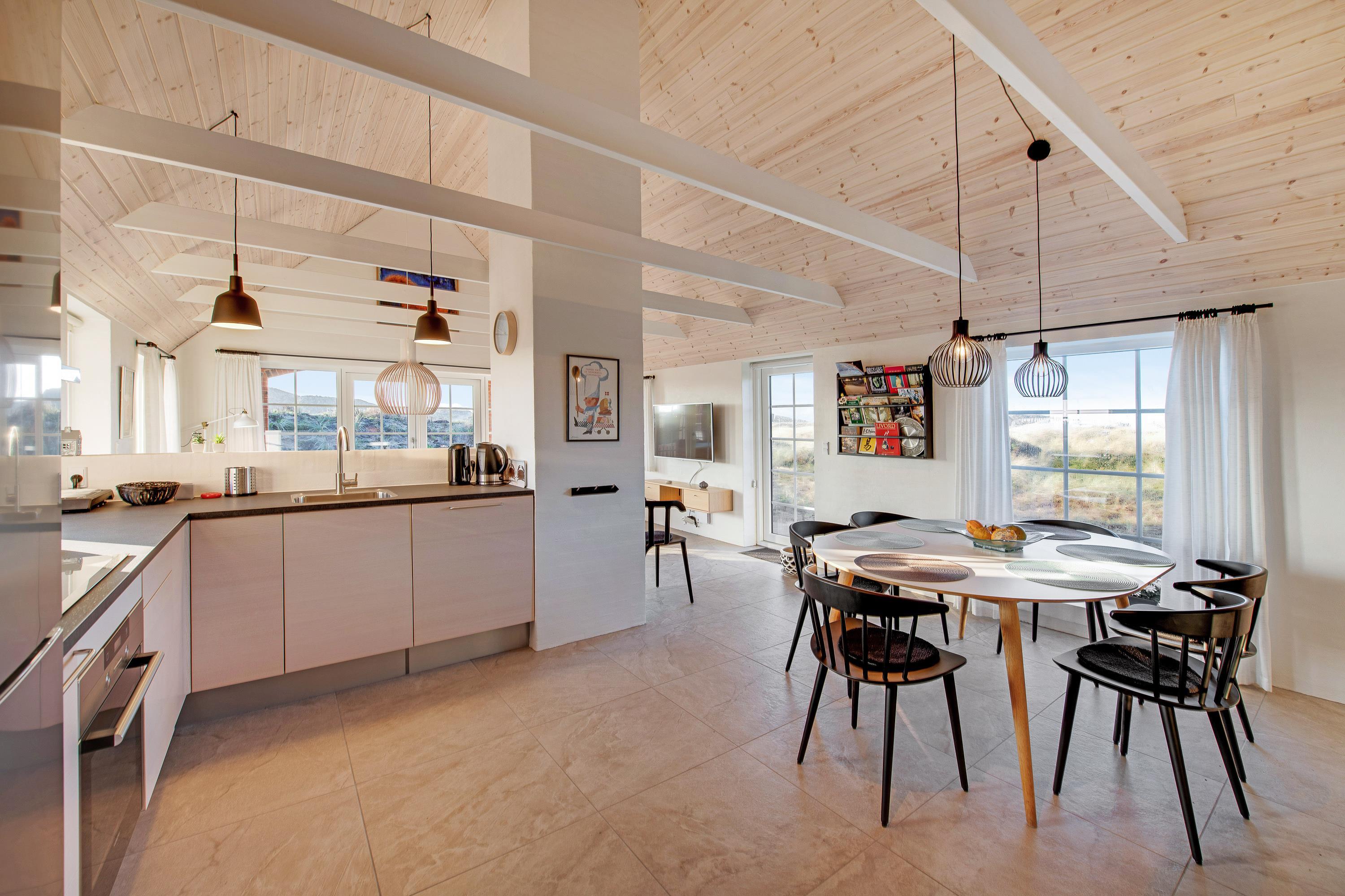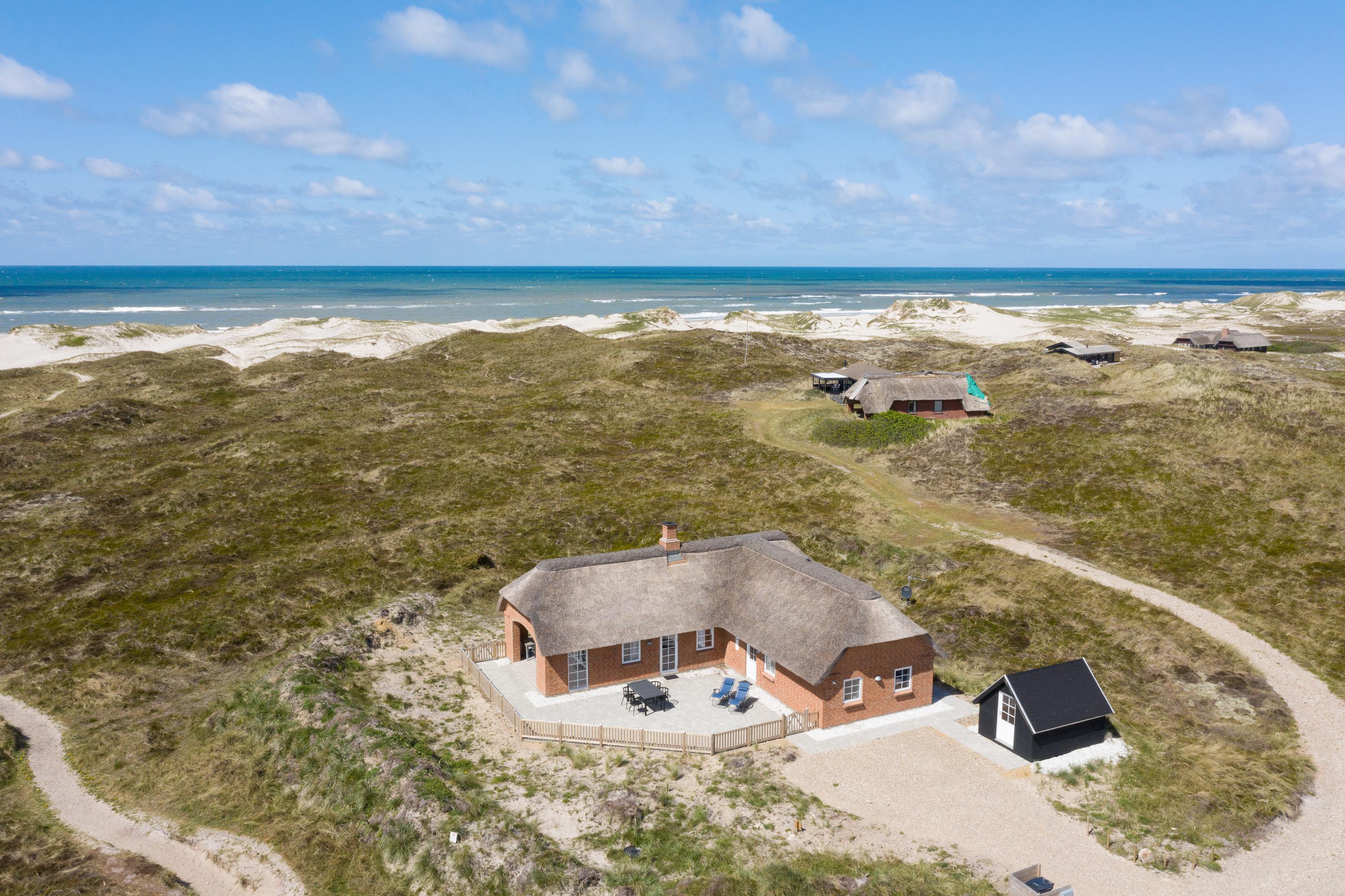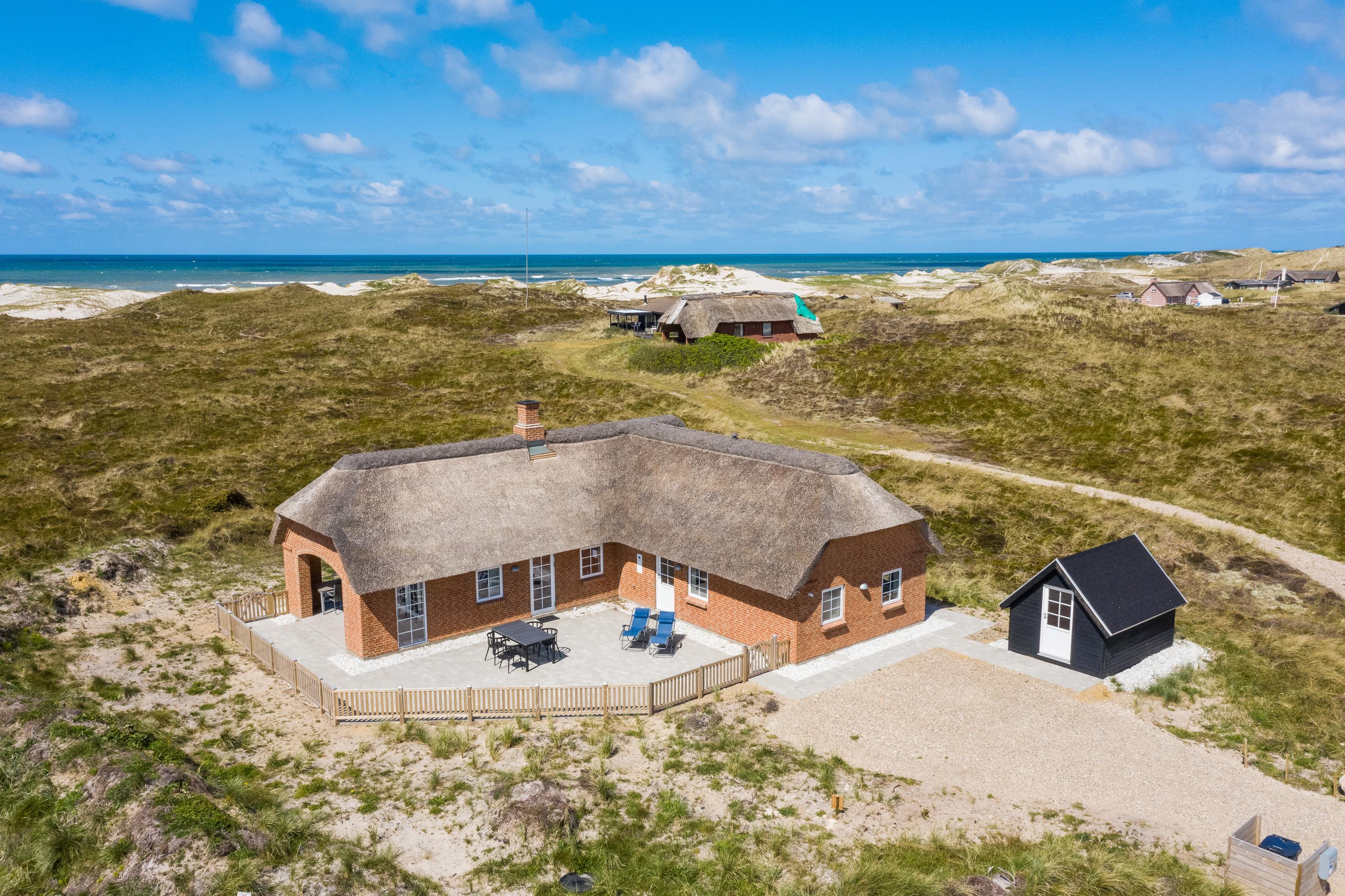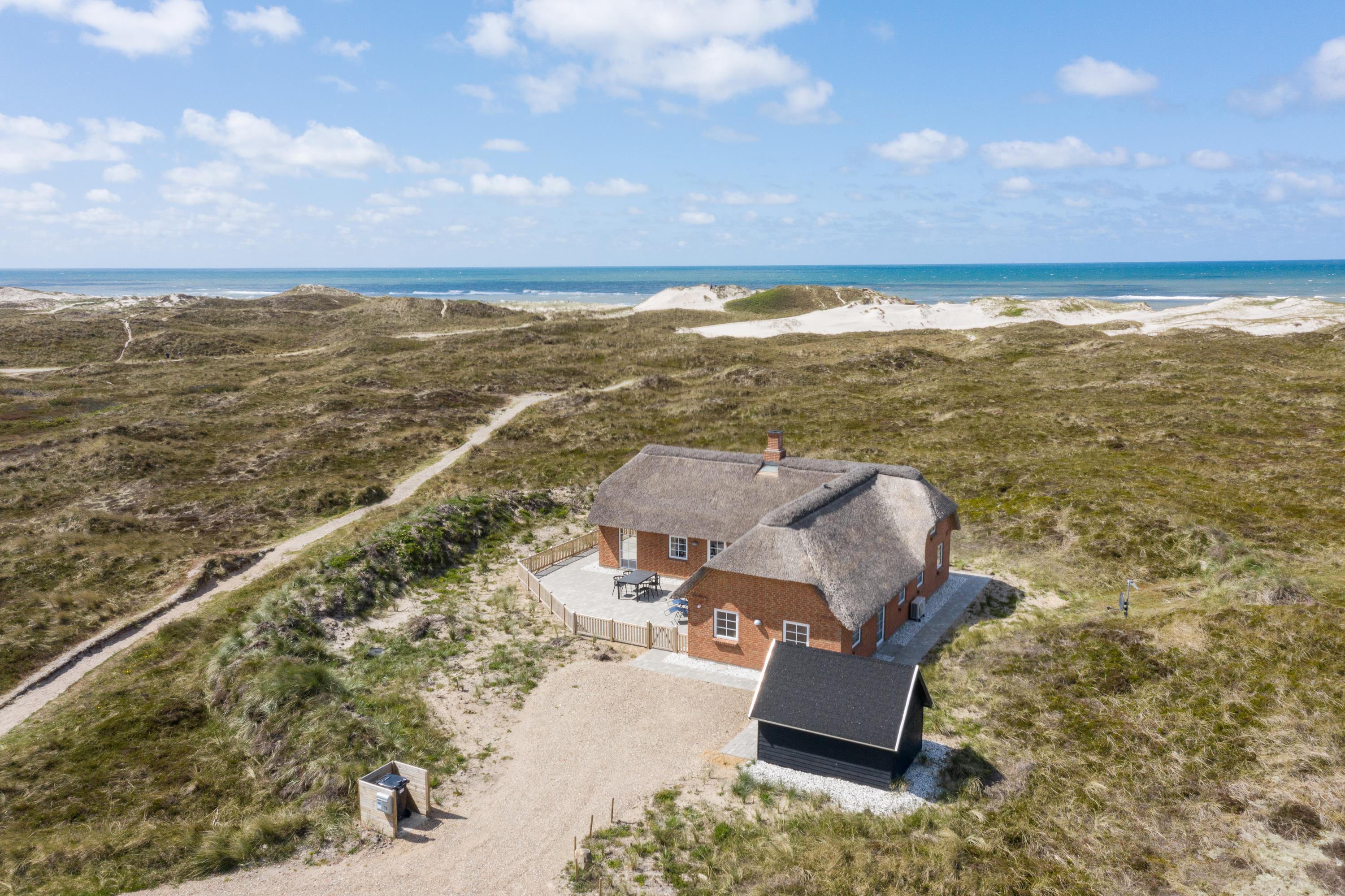 Den første kop morgenkaffe nydes på terrassen med ryggen op af husmuren, der er godt i gang med at optage solens varme. Udsigten er fantastisk – lyngens rødbrune toner blander sig med det lysegrønne spil fra marehalmen, om sommeren synger lærken over sin rede i klitterne og altid har I lyden af bølgerne, som kalder til en morgentur på stranden. Her er det smukt hele året rundt. Indenfor indbyder den stilfulde indretning til mange hyggelige timer med fællesskab og hygge i stuen med brændeovnen eller med fælles madlavning i det åbne moderne køkken med opvaskemaskine.