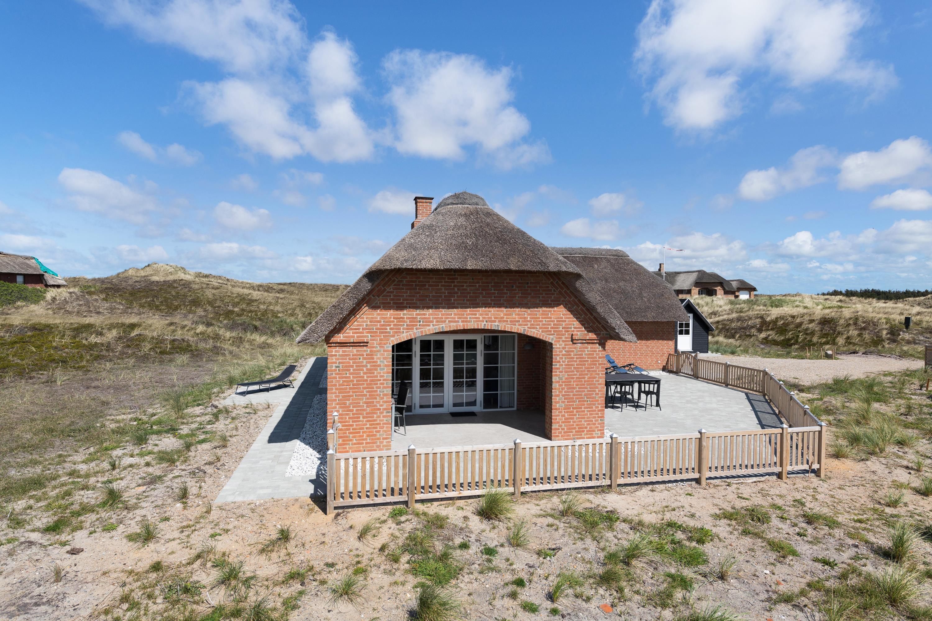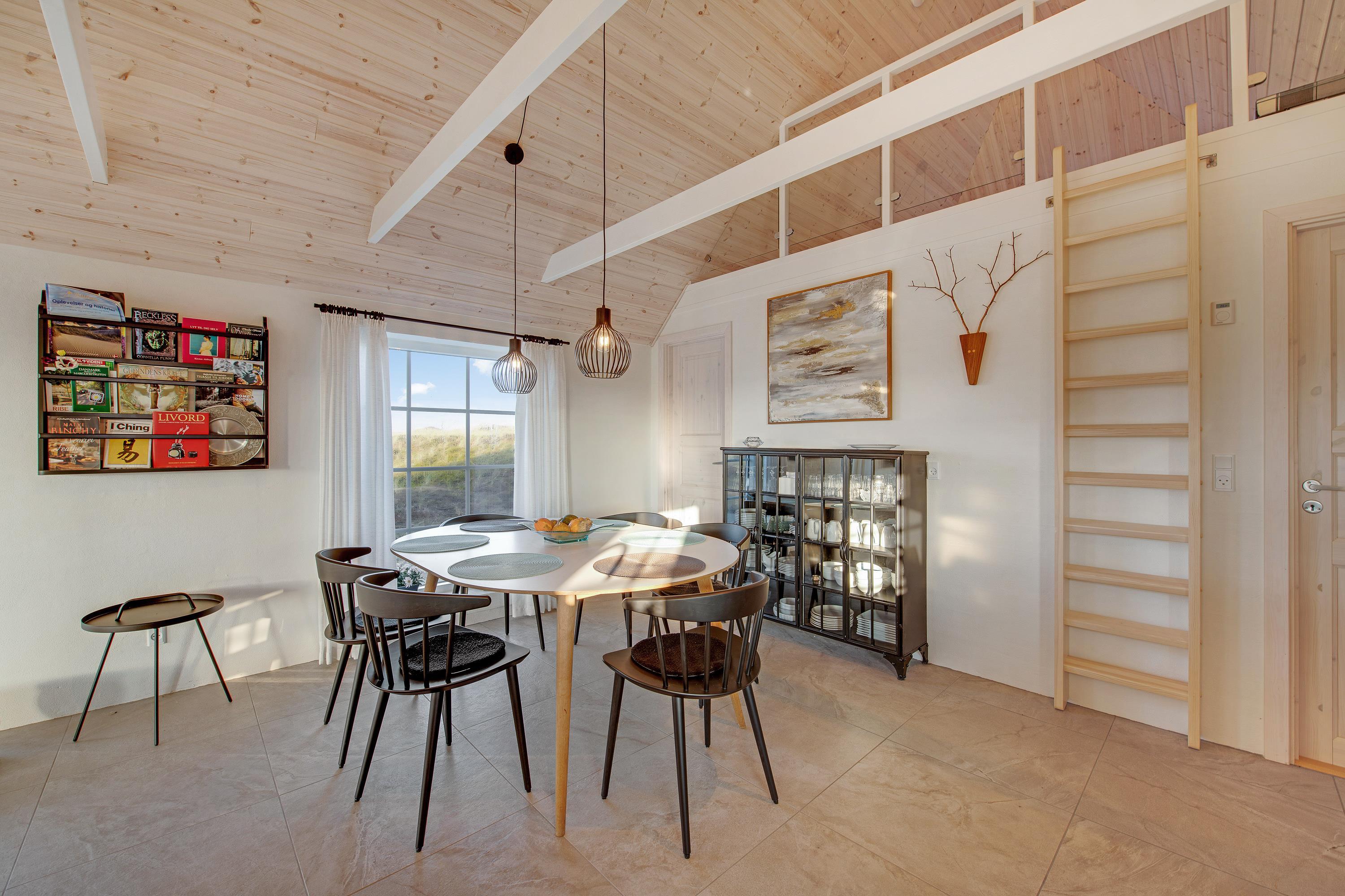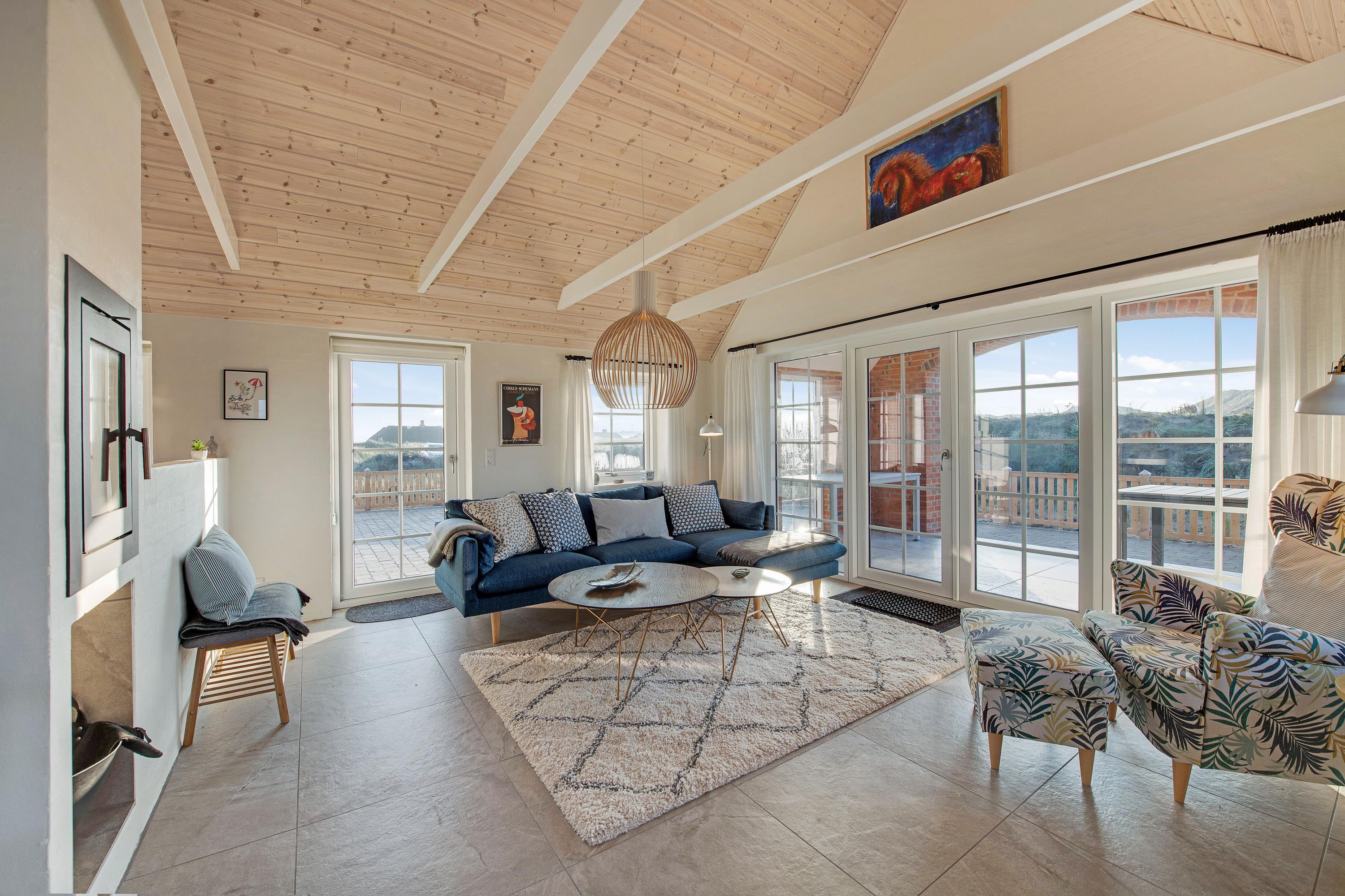Den første kop morgenkaffe nydes på terrassen med ryggen op af husmuren, der er godt i gang med at optage solens varme. Udsigten er fantastisk – lyngens rødbrune toner blander sig med det lysegrønne spil fra marehalmen, om sommeren synger lærken over sin rede i klitterne og altid har I lyden af bølgerne, som kalder til en morgentur på stranden. Her er det smukt hele året rundt. Indenfor indbyder den stilfulde indretning til mange hyggelige timer med fællesskab og hygge i stuen med brændeovnen eller med fælles madlavning i det åbne moderne køkken med opvaskemaskine.