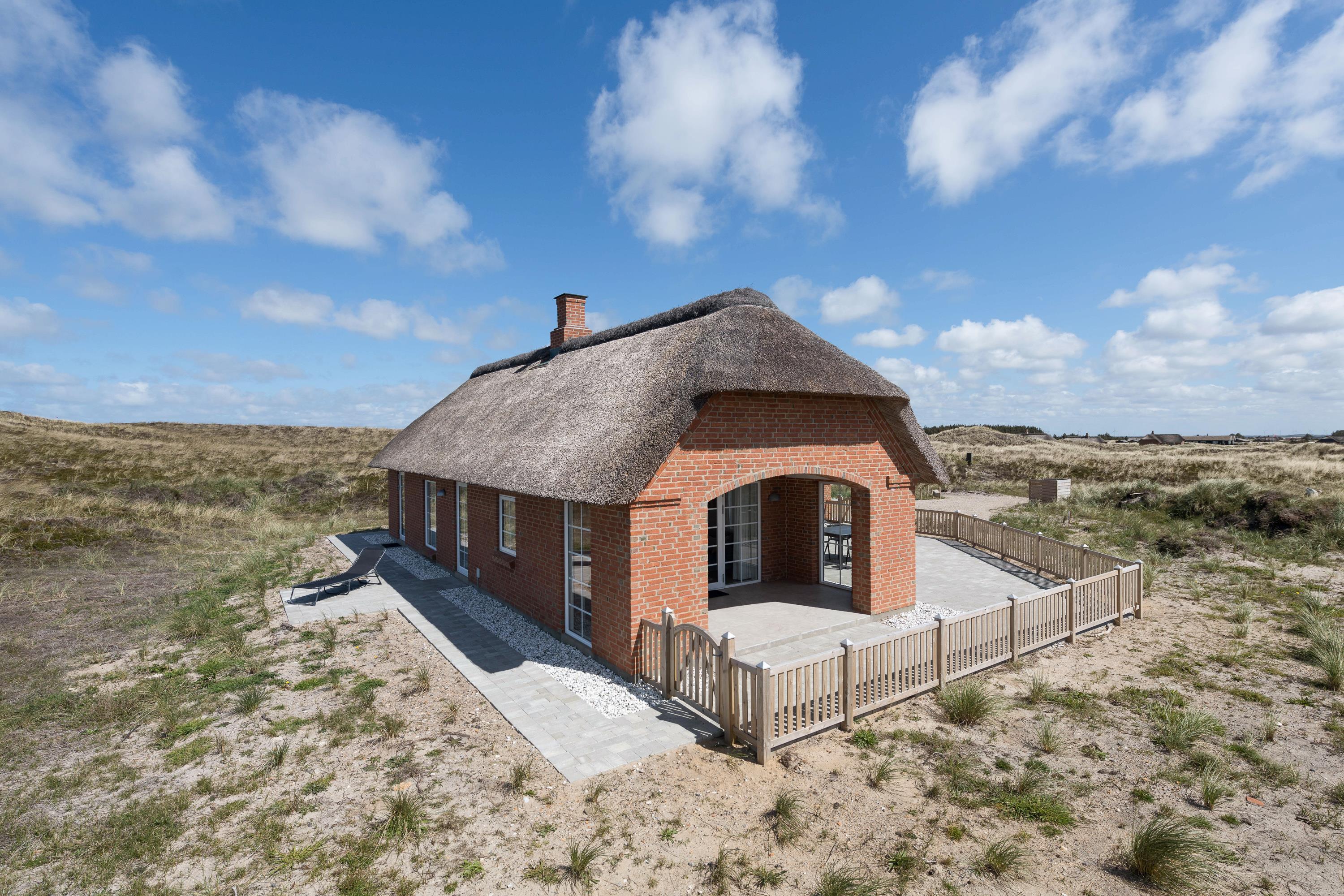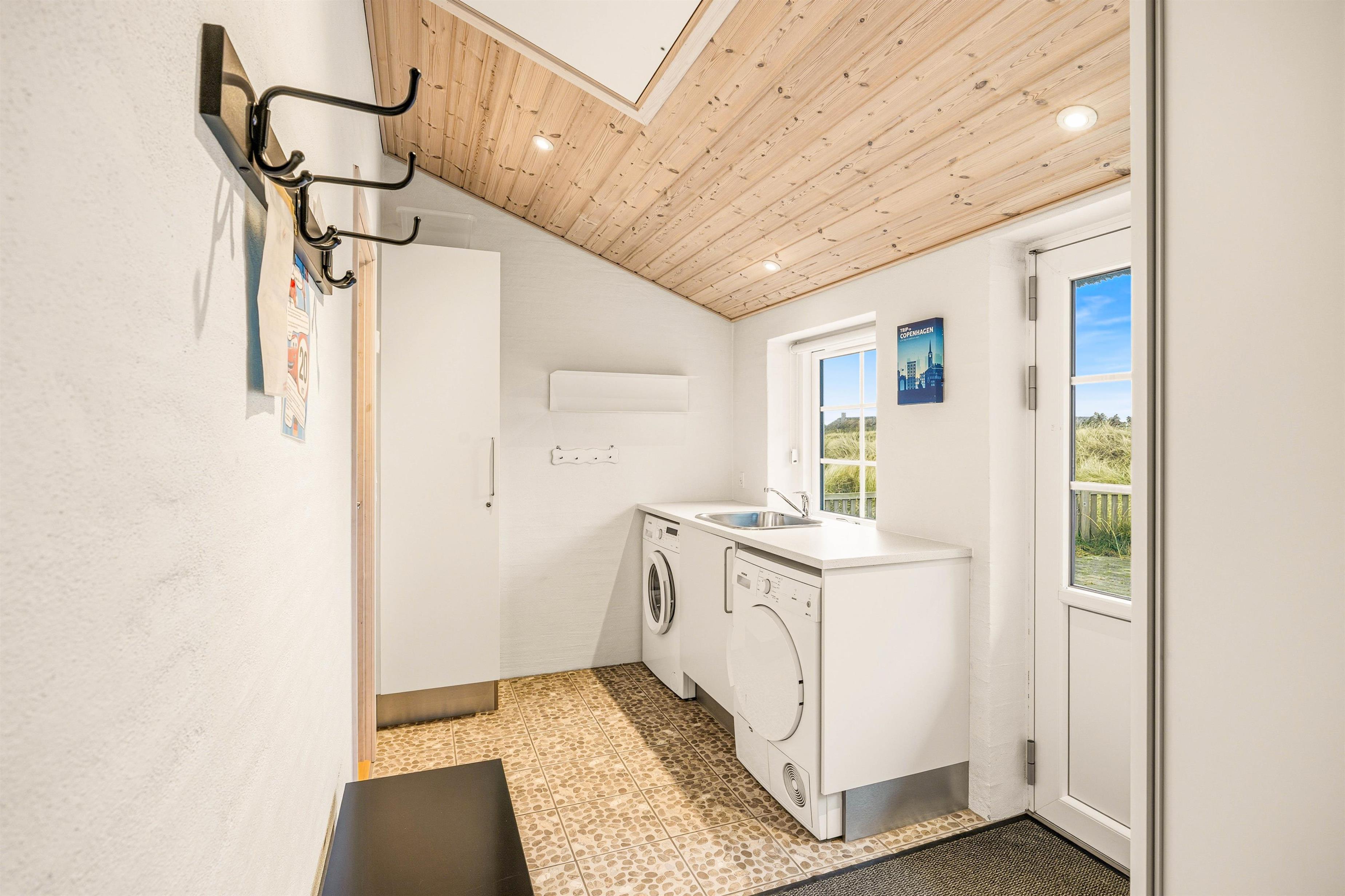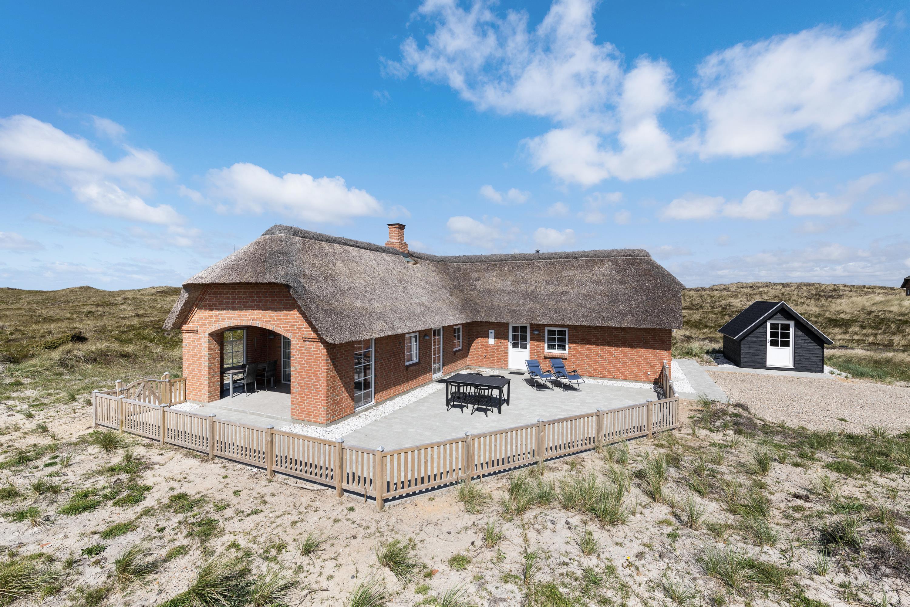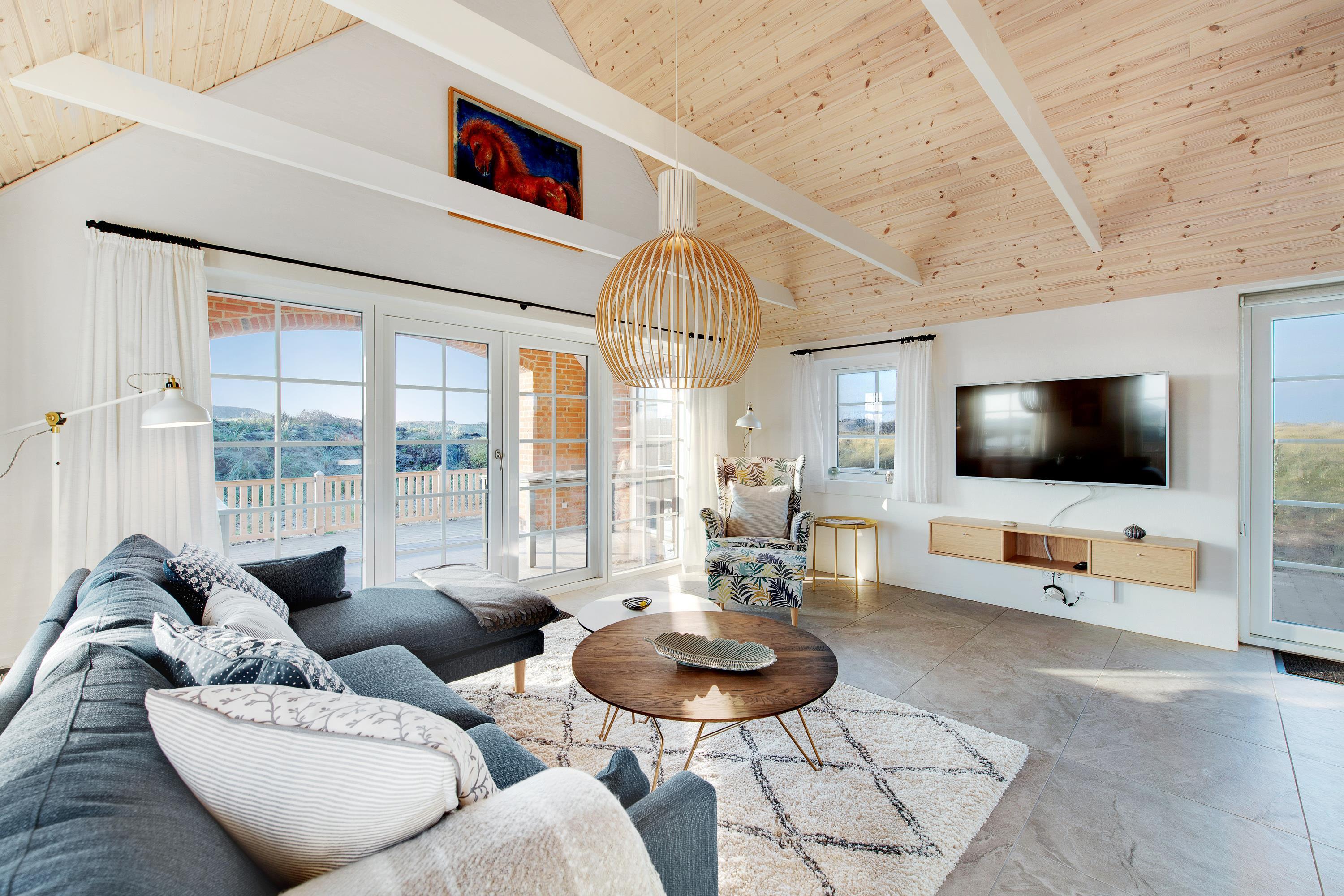 Den første kop morgenkaffe nydes på terrassen med ryggen op af husmuren, der er godt i gang med at optage solens varme. Udsigten er fantastisk – lyngens rødbrune toner blander sig med det lysegrønne spil fra marehalmen, om sommeren synger lærken over sin rede i klitterne og altid har I lyden af bølgerne, som kalder til en morgentur på stranden. Her er det smukt hele året rundt. Indenfor indbyder den stilfulde indretning til mange hyggelige timer med fællesskab og hygge i stuen med brændeovnen eller med fælles madlavning i det åbne moderne køkken med opvaskemaskine.