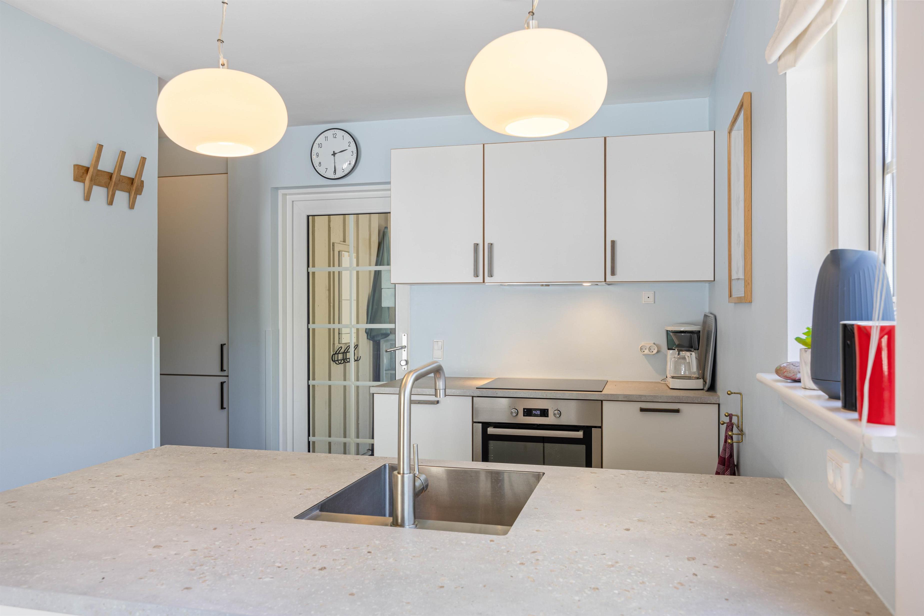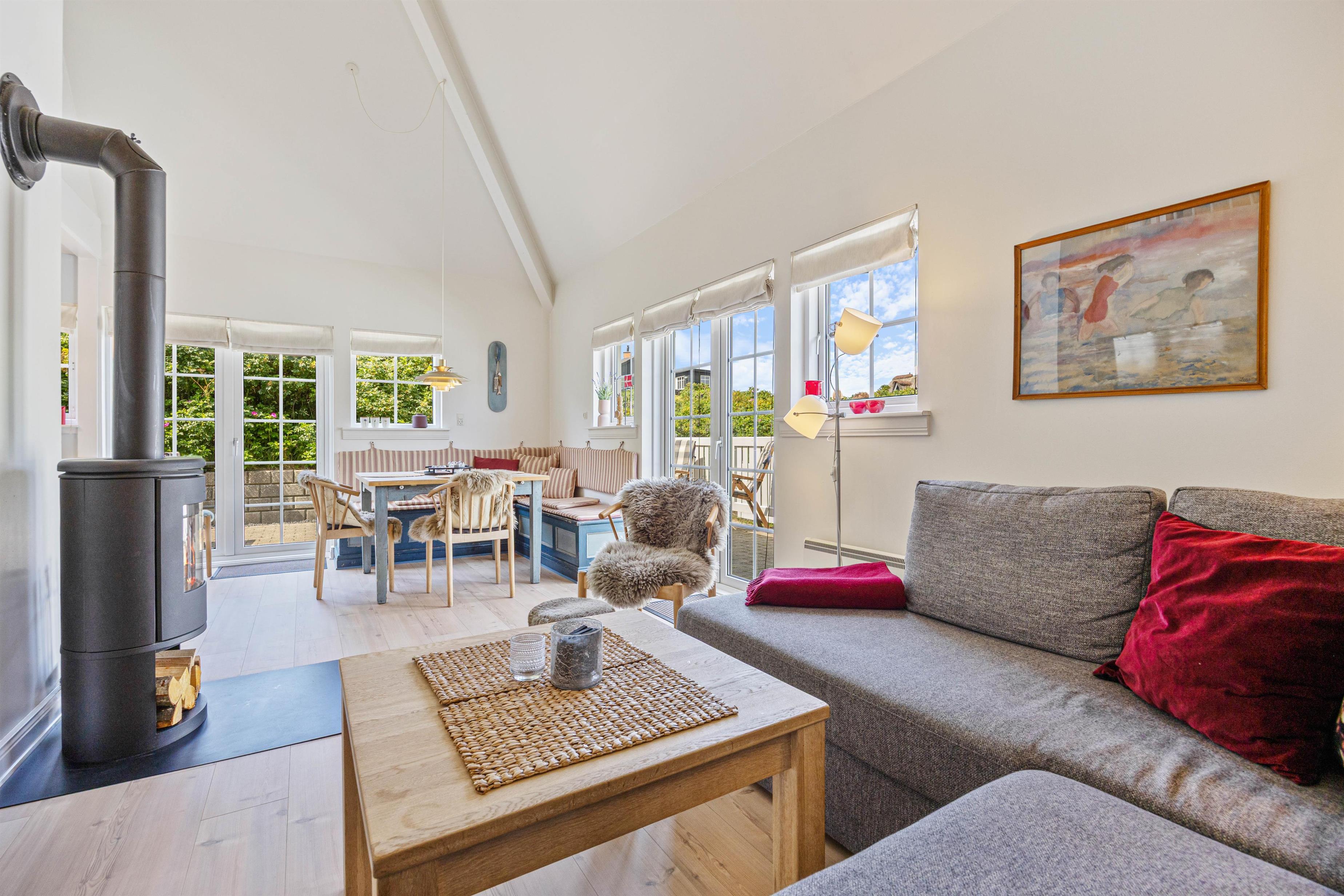Ferielejligheden byder på en hyggelig indretning, hvor der er skabt nogle gode rammer for en afslappende og hyggelig ferie. I stueetagen af lejligheden finder I det veludstyrede samtalekøkken, som ligger i åben forbindelse med spisepladsen og resten af stuen. Her er den hyggelige indretning med til at skabe en behagelig og dejlig atmosfære, hvor I vil kunne føle jer veltilpas og slappe af. Hvis I ønsker at skrue endnu mere op for den hyggelige stemning, kan I tænde op i lejlighedens brændeovn, der altid er garant for at skabe varme og hygge. Derudover er der en energisparende luft-til-luft varmepumpe, som sørger for et behageligt indeklima året rundt.
