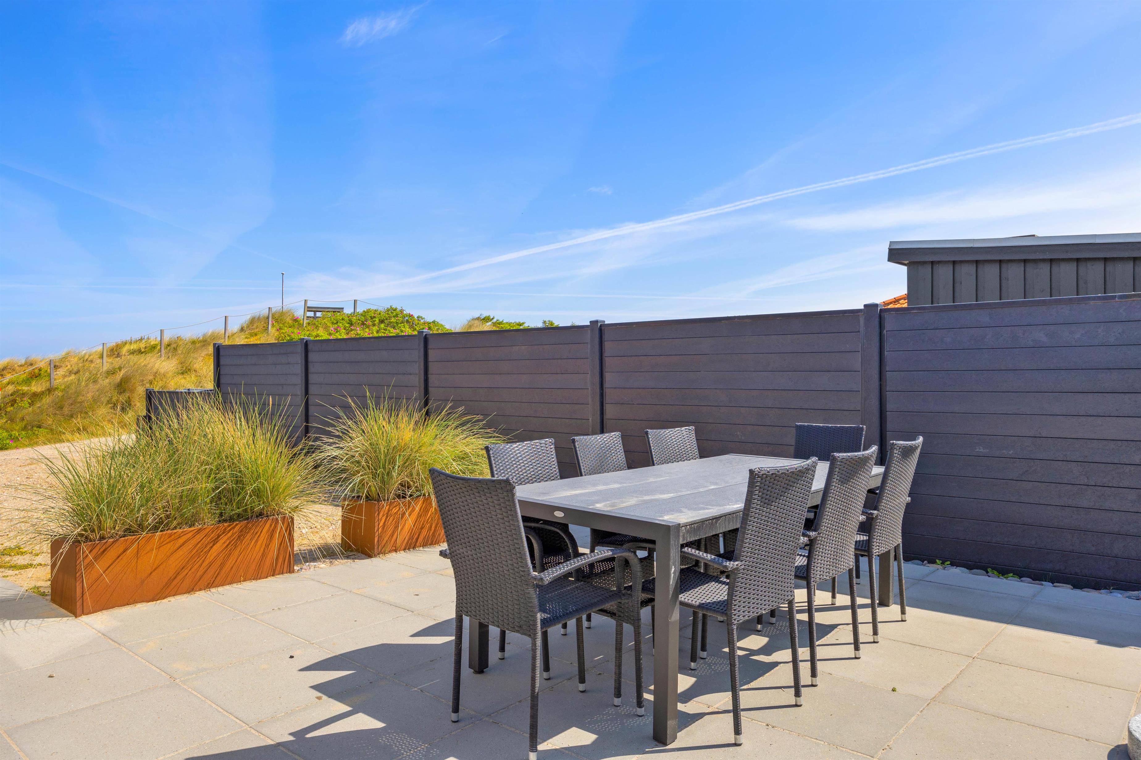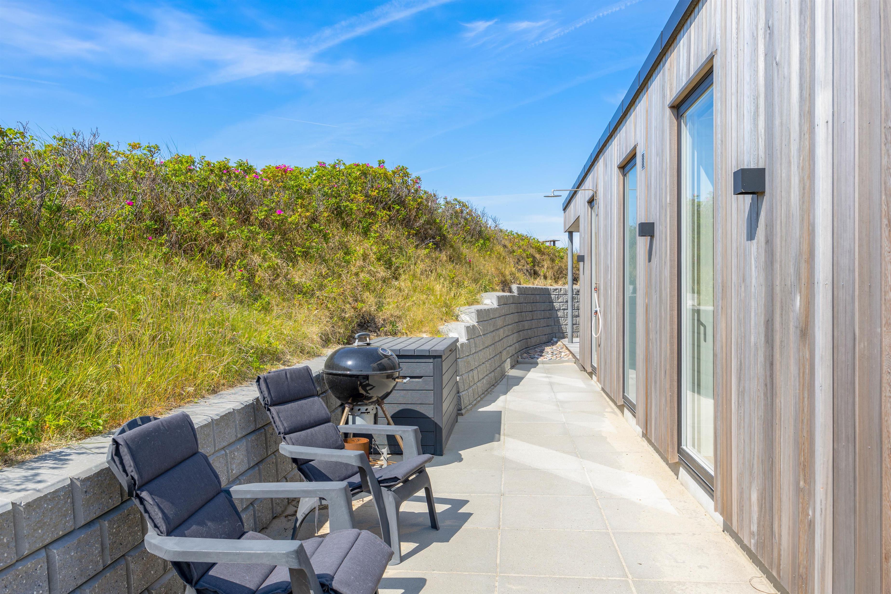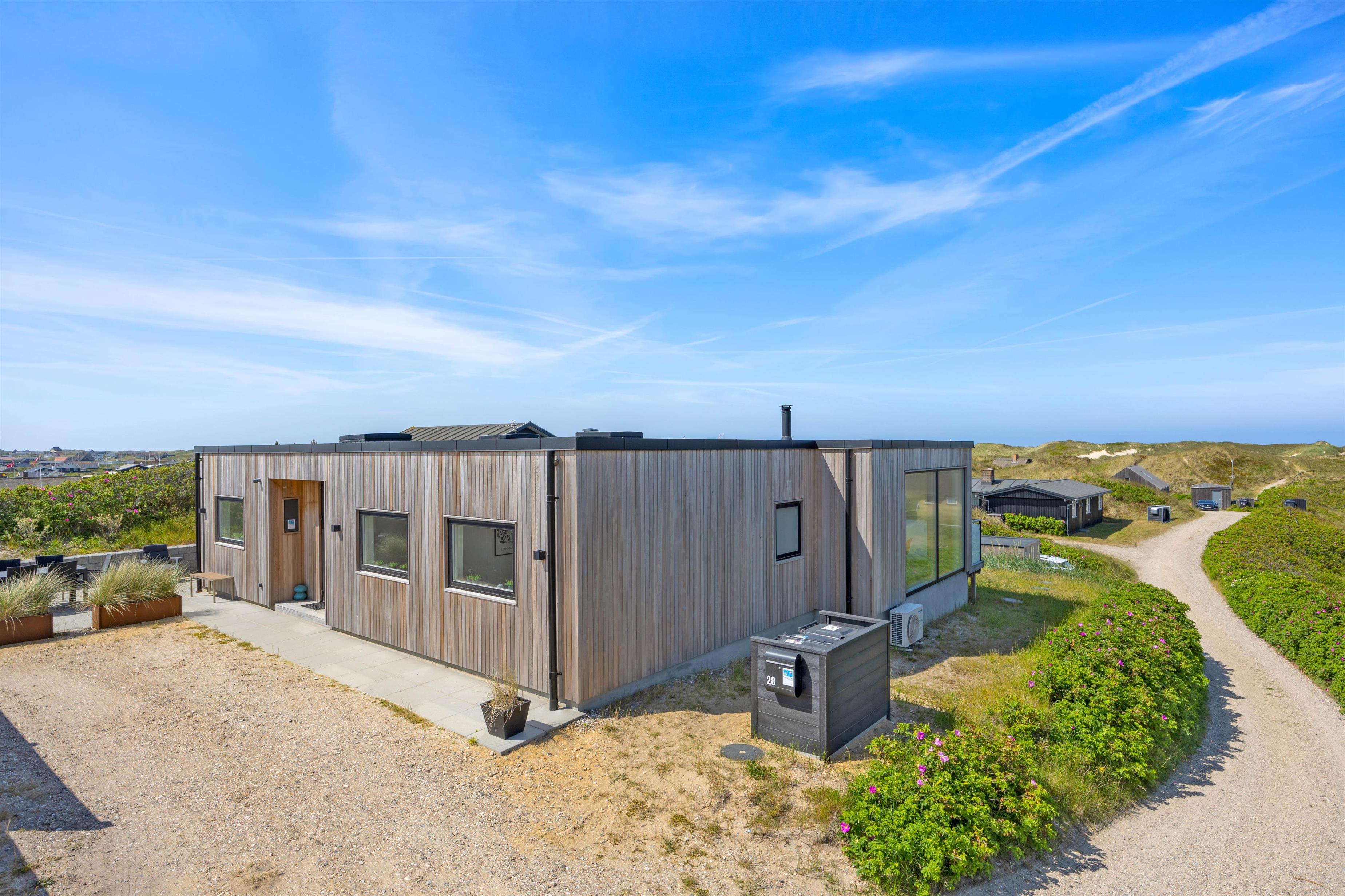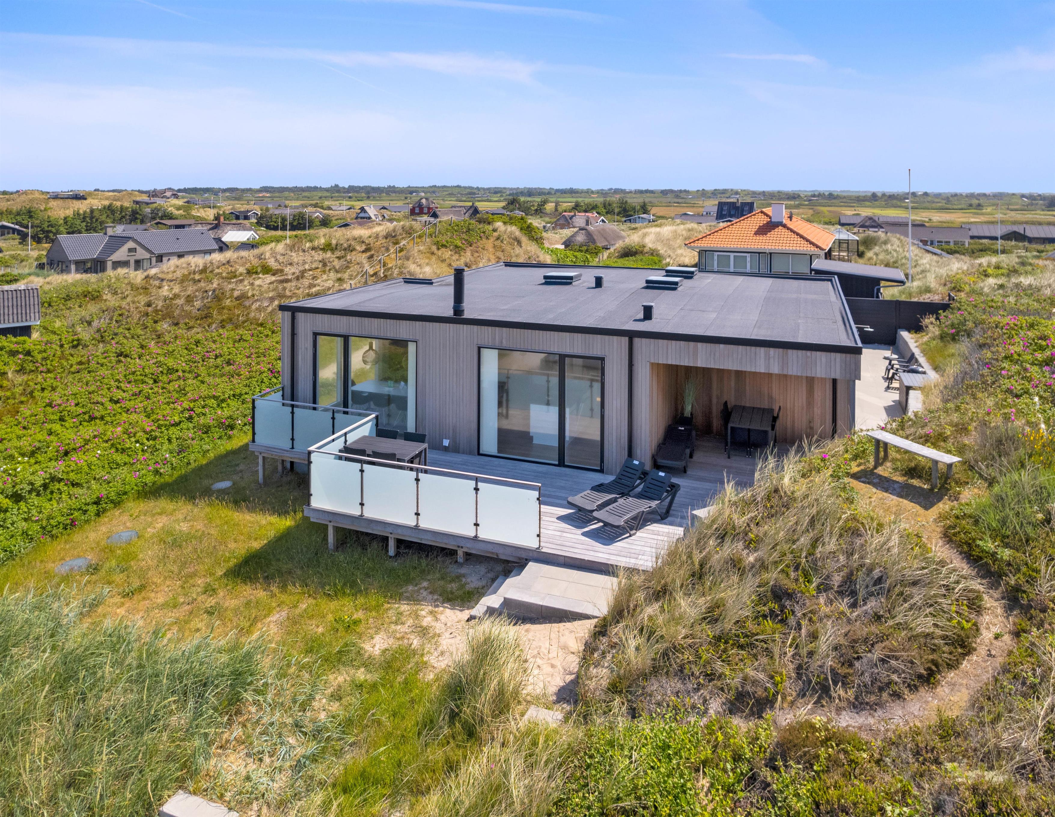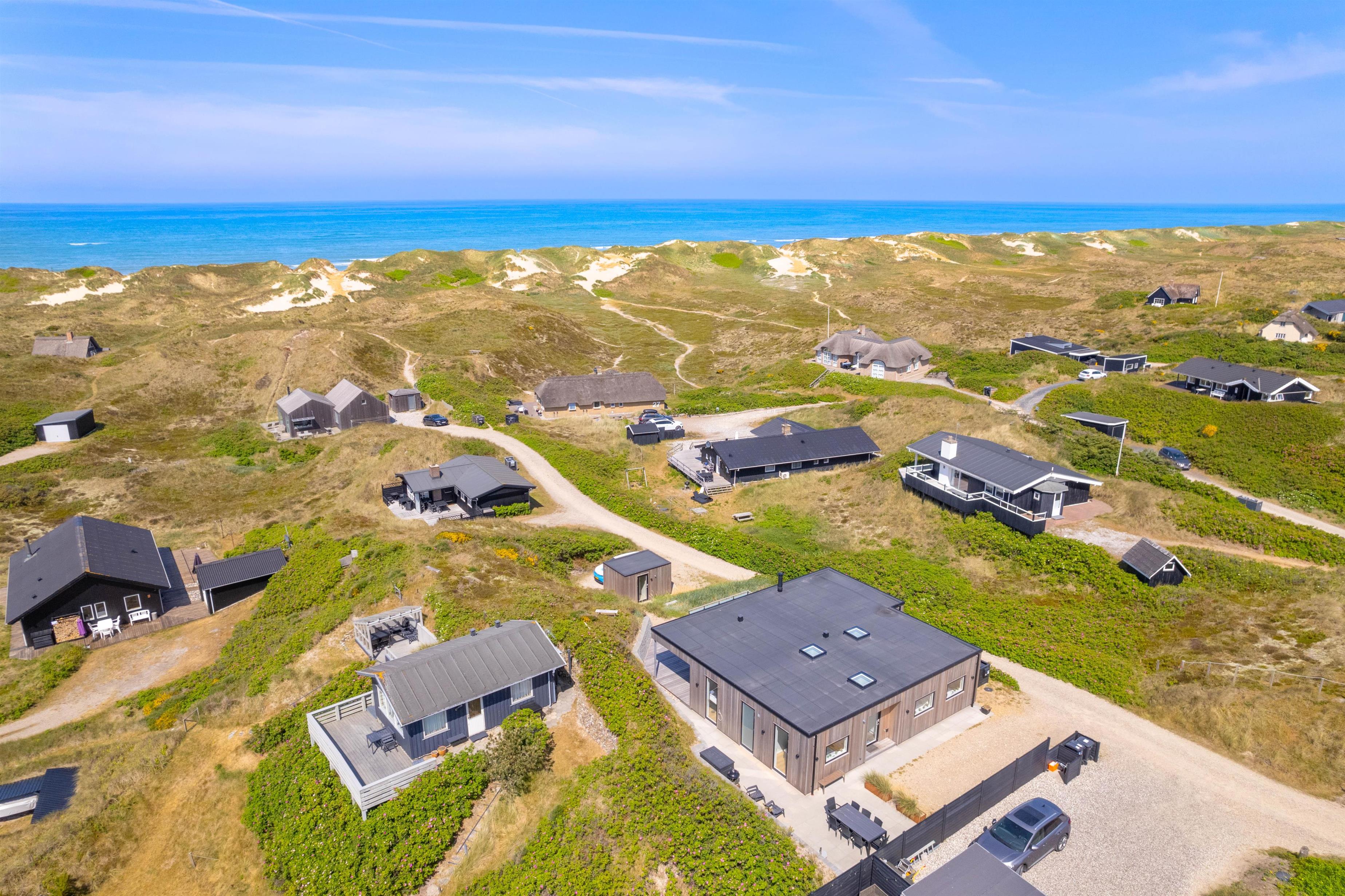 Feriehuset ligger kun 300 meter fra det brusende Vesterhav og har en skøn udsigt fra toppen af klitten ud over havet. Der er mange små stier, som fører fra feriehuset gennem klitlandskabet ned til stranden. Feriehuset har desuden en skøn udebruser, hvor man kan skylle sandet af fødderne eller blot køle kroppen af efter en hed dag i solen. Udebruseren kan benyttes fra april månede frem til november måned. Den afskærmede og åbne terrasse på 42m2 indbyder til afslapning med solvogne og havemøbler, og I kan samles om grillen om aftenen, mens I nyder solnedgangen over den jyske vestkyst.