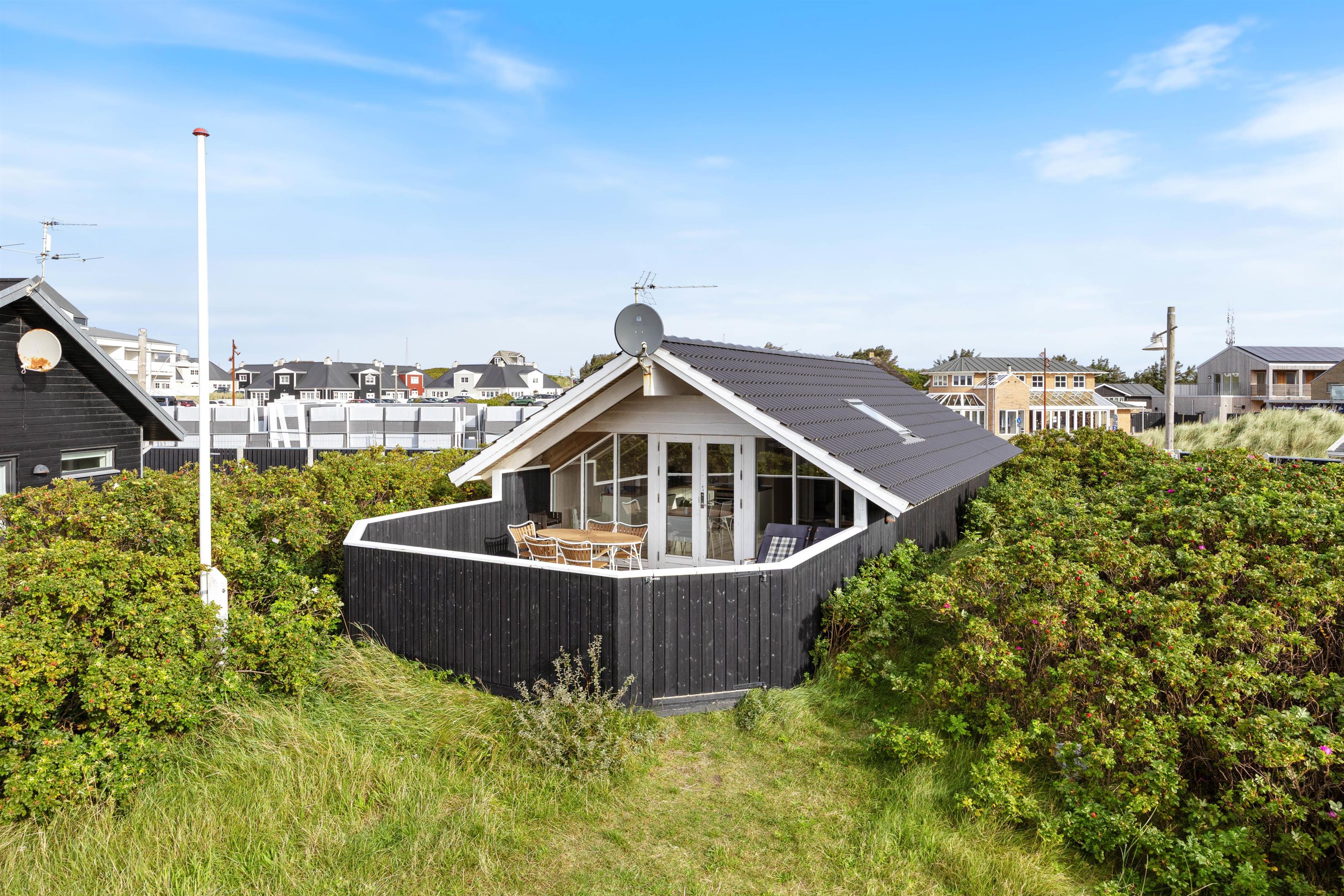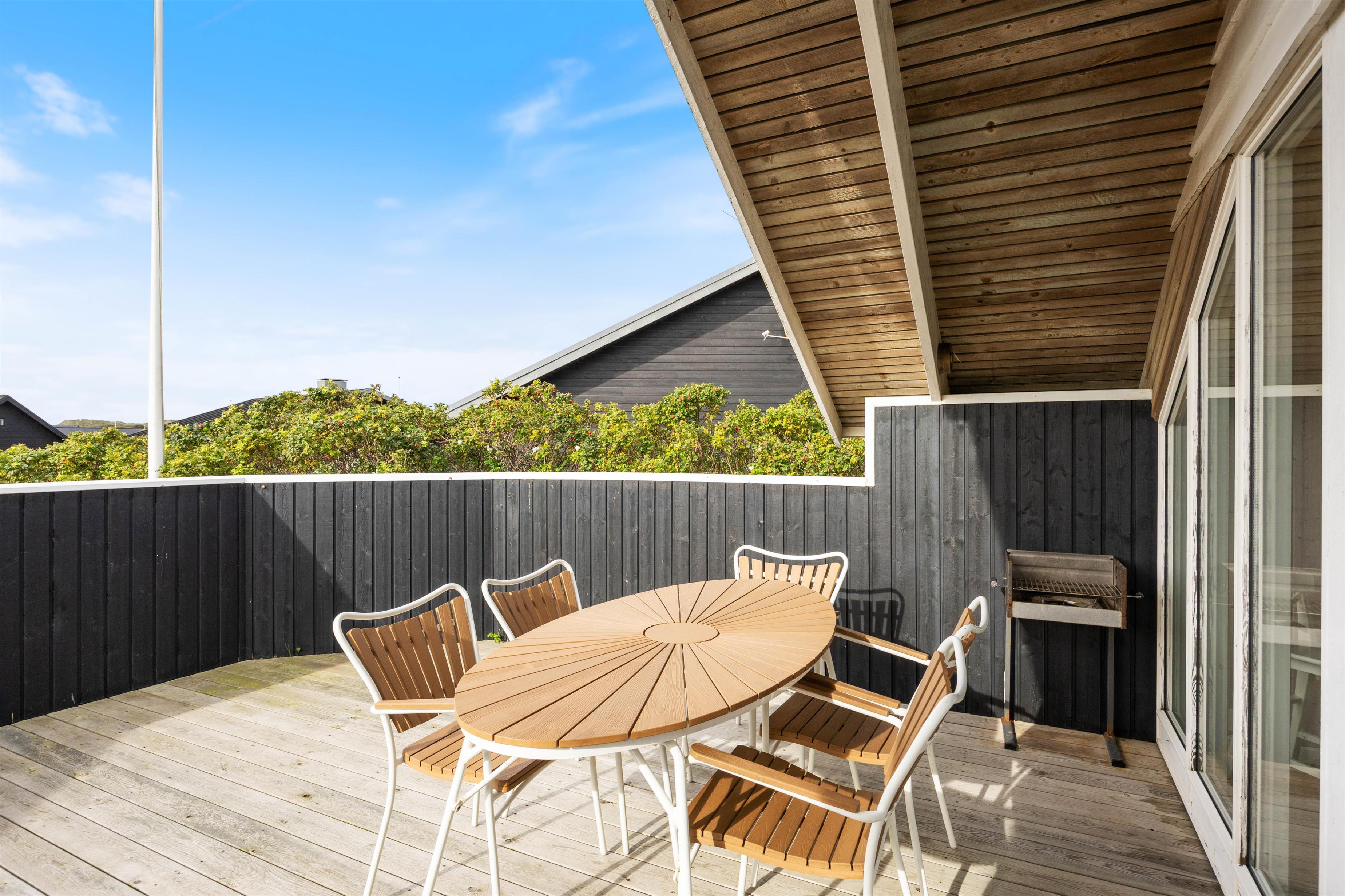 Den sydvendte terrasse er helt lukket og sørger for både læ og privatliv. Her kan man også nyde skønne grillaftener, idet terrassen også er delvist overdækket. Fra terrassen kan man tydeligt både høre og dufte Vesterhavet, hvilket er helt fantastisk. Ønsker man sig en is eller at indtage en frokost på en af de nærliggende restauranter, er man kun ca. 2 minutters gang væk. Søndervig har masser at byde på, men hvis I ønsker at se mere end bare søndervig, kan det helt klart anbefales at besøge de 2 nabobyer, Hvide Sande og Ringkøbing. Her finder I også et væld af butikker, hvor jeres shoppetrang kan blive stillet, samt begge byer råder over et hav af forskellige restauranter og aktivitetsmuligheder.