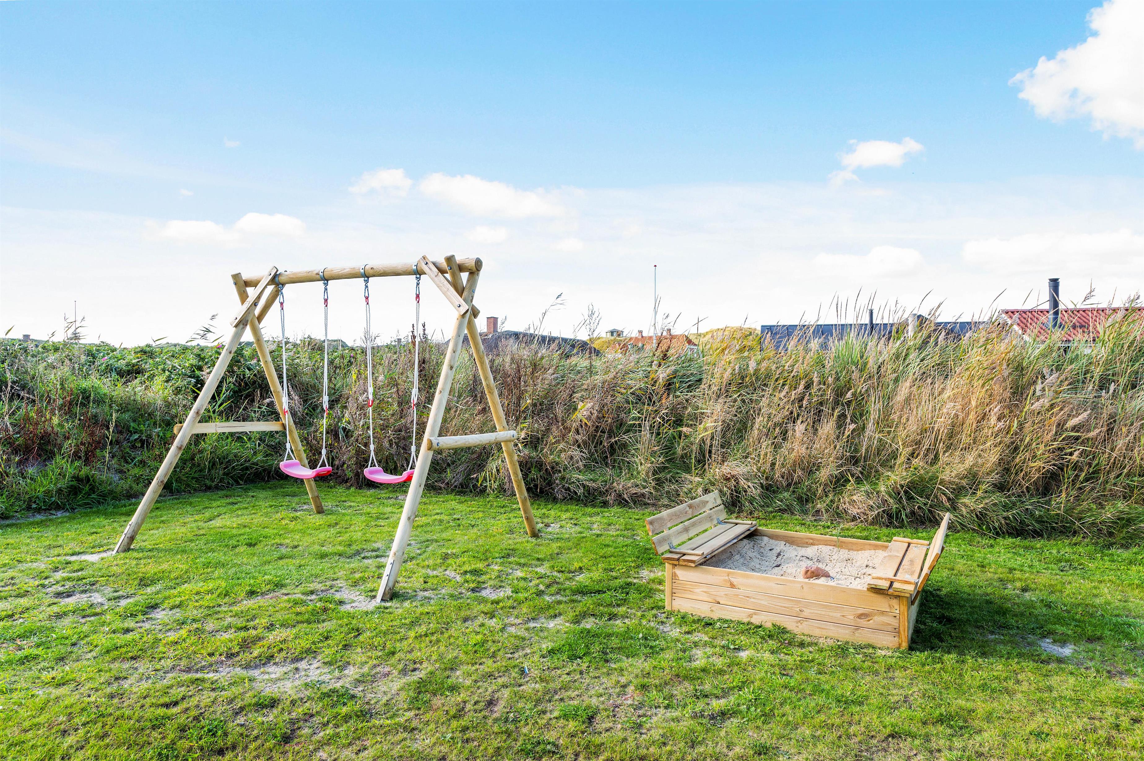 Udenfor har sommerhuset el-ladestik til elbil. Fra den åbne og overdækkede terrasse kan I nyde de naturskønne omgivelser, mens I daser i liggestolene eller samles rundt om havebordet til en lækker frokost. Der står selvfølgelig også en grill til rådighed, og imens I tilbereder en dejlig middag i aftensolen, kan børnene lege på den 1200 m2 store naturgrund i gyngerne eller sandkassen.