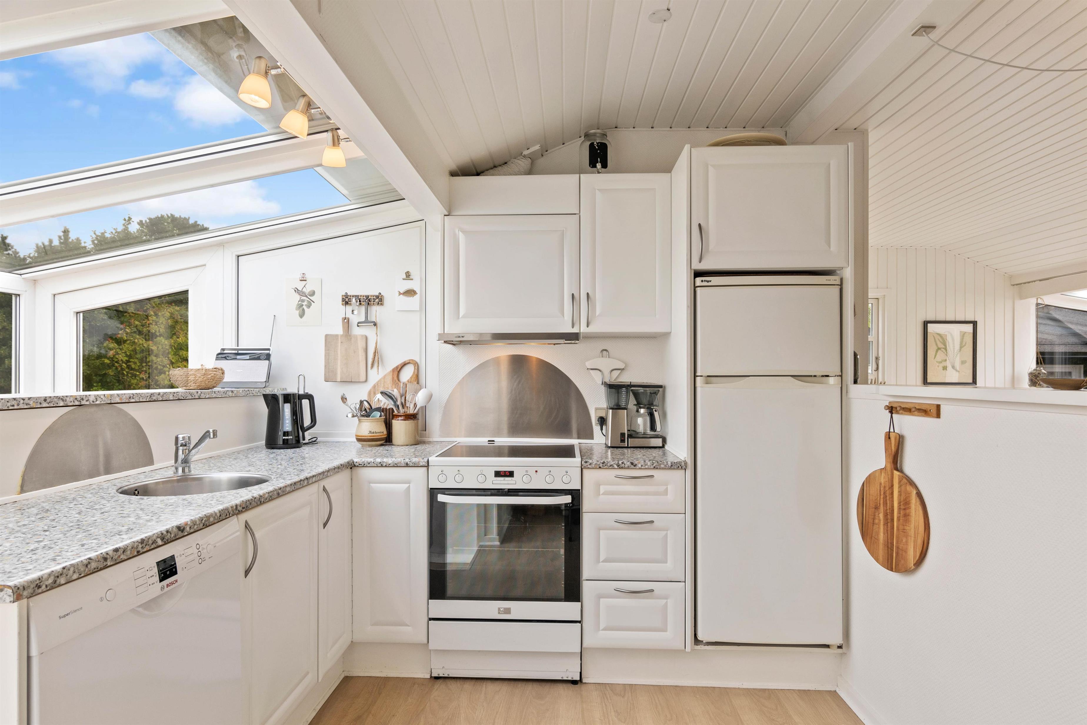Sommerhuset er hyggeligt, meget traditionelt og smagsfuldt indrettet. Træbeklædningen samt møbleringen i feriehuset afspejler typisk dansk sommerhusstil, dog kommer I ikke at undvære de moderne faciliteter som for eksempel opvaskemaskine og vaskemaskine.