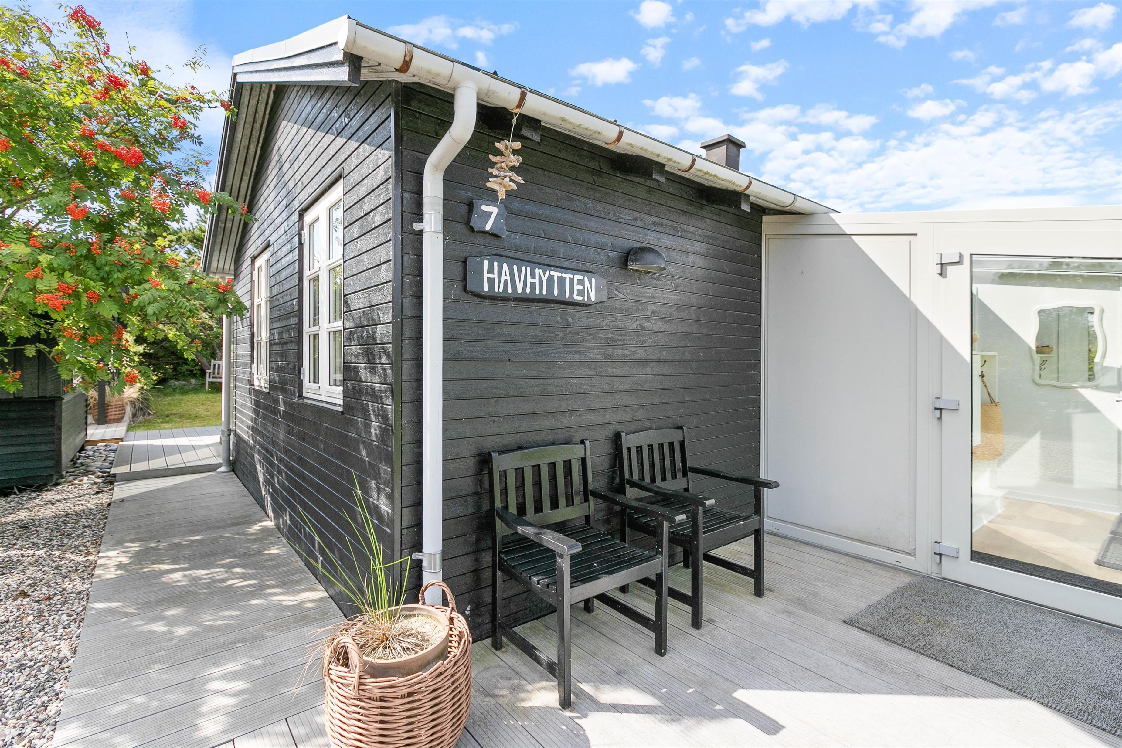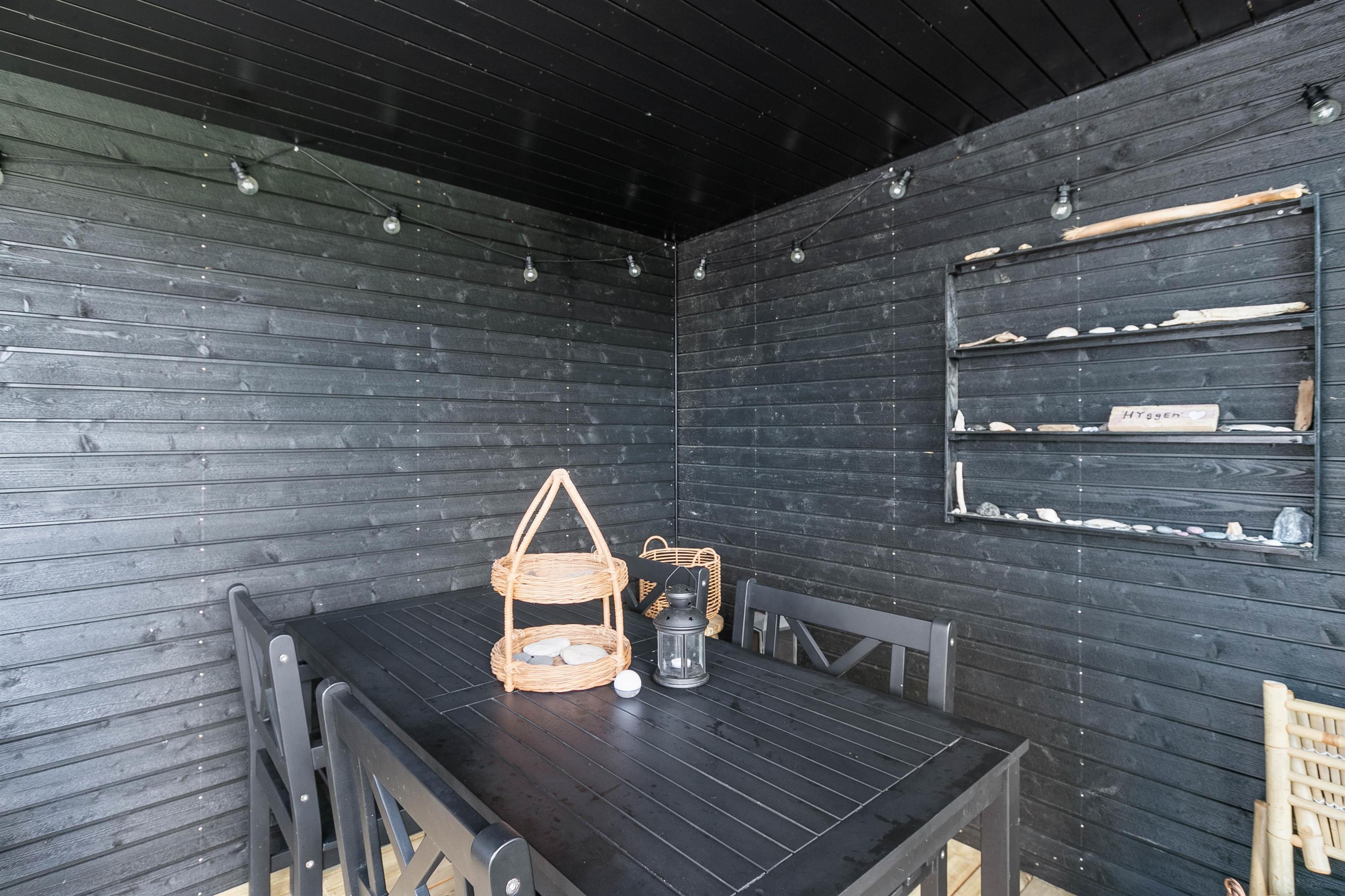 Rundt om det lille feriehus finder I på terrasserne flere siddemuligheder. Uanset om det blæser, eller om solen skinner, så har I rig mulighed for at finde en hyggelig plads, hvor I kan slå jer ned. Den overdækkede terrasse gør også, at I kan sidde ude og nyde ferien, selv om der skulle komme en regnbyge.
