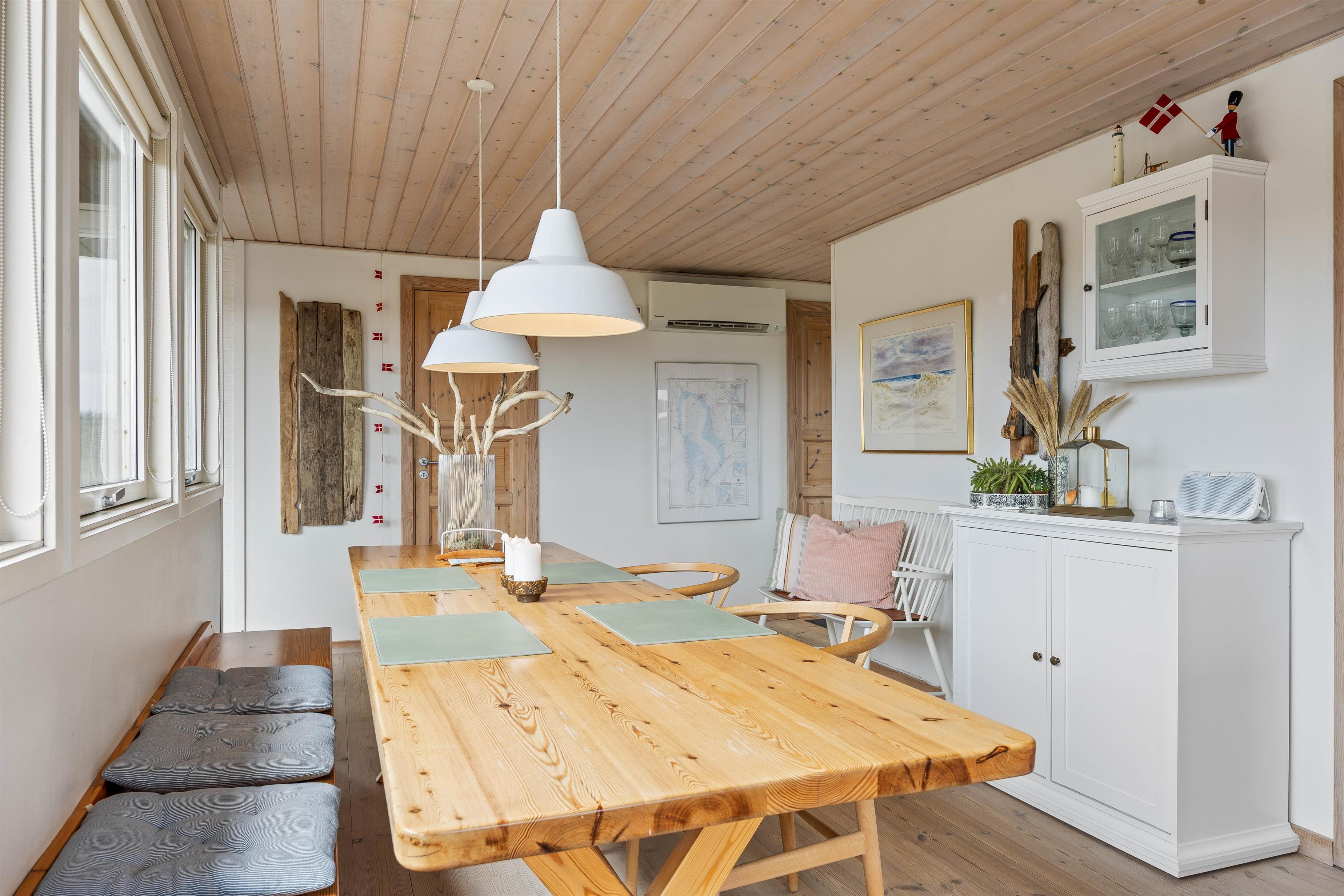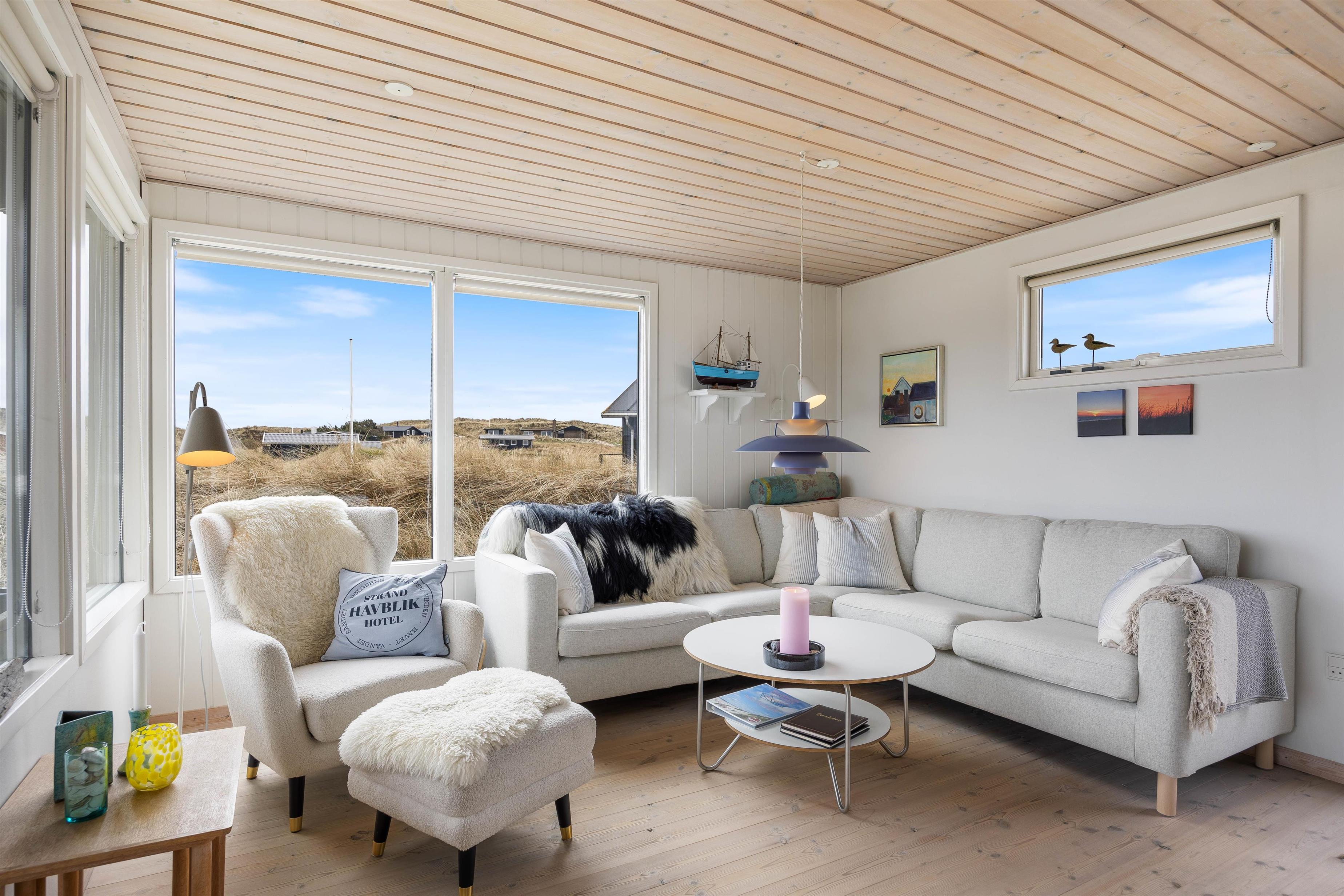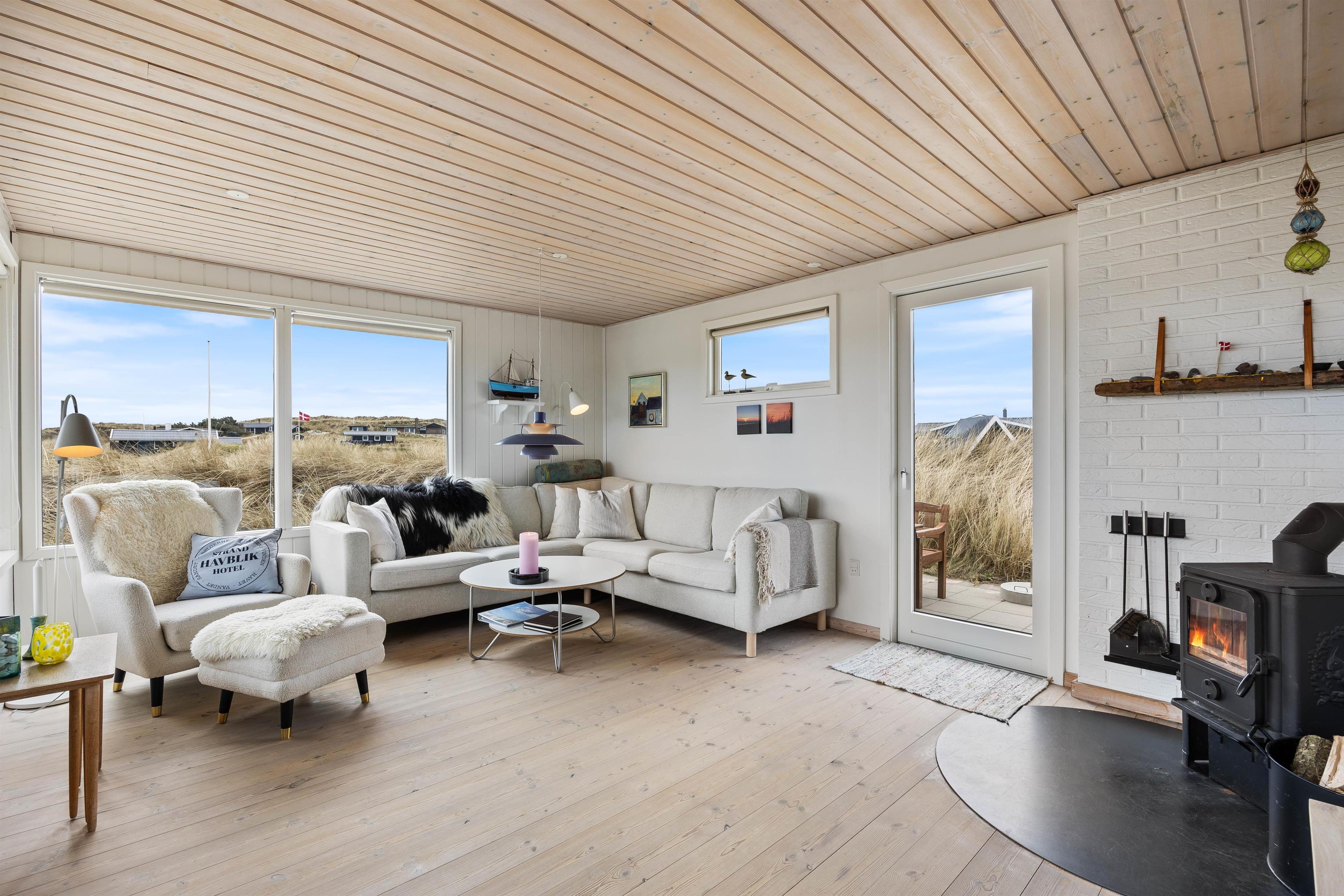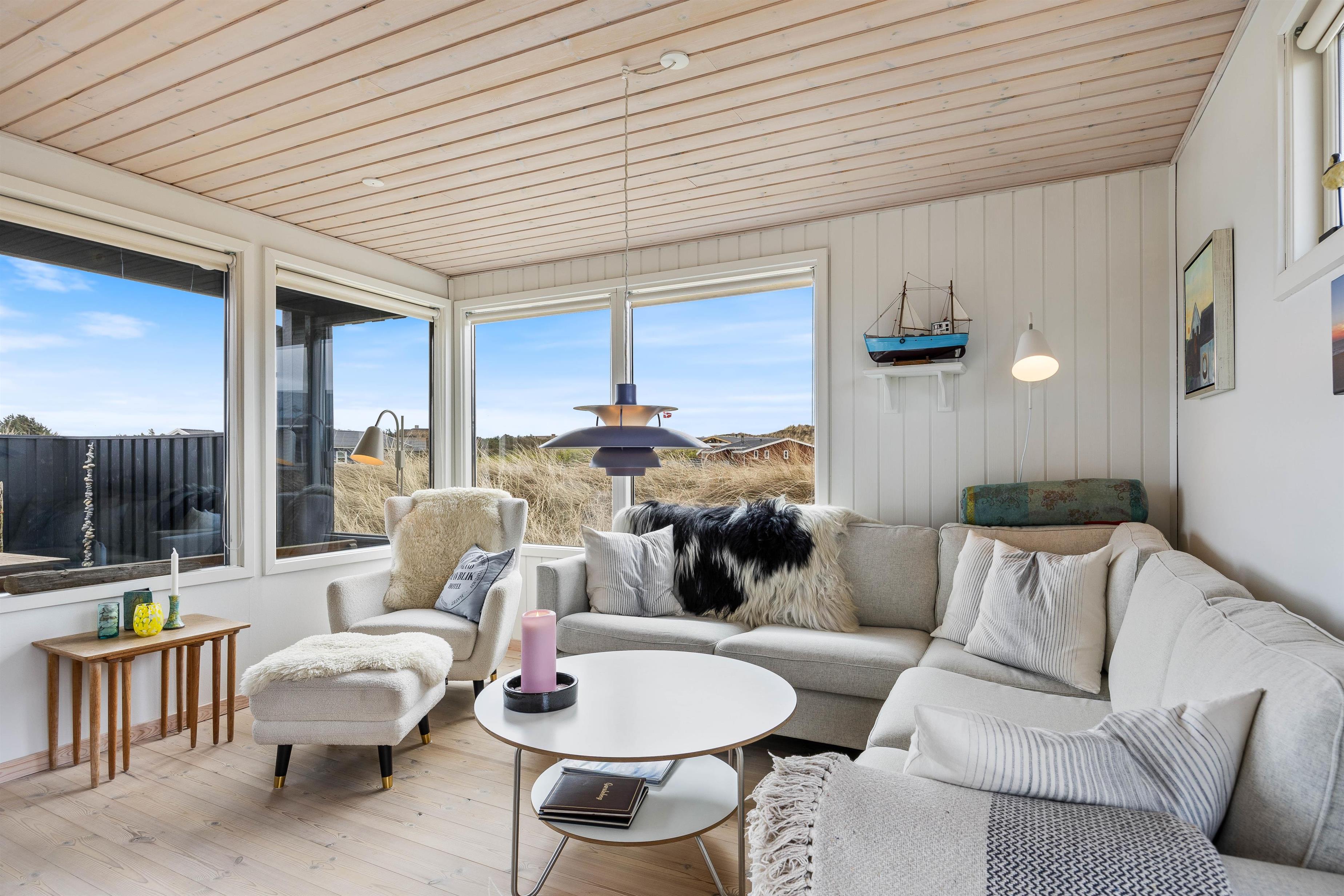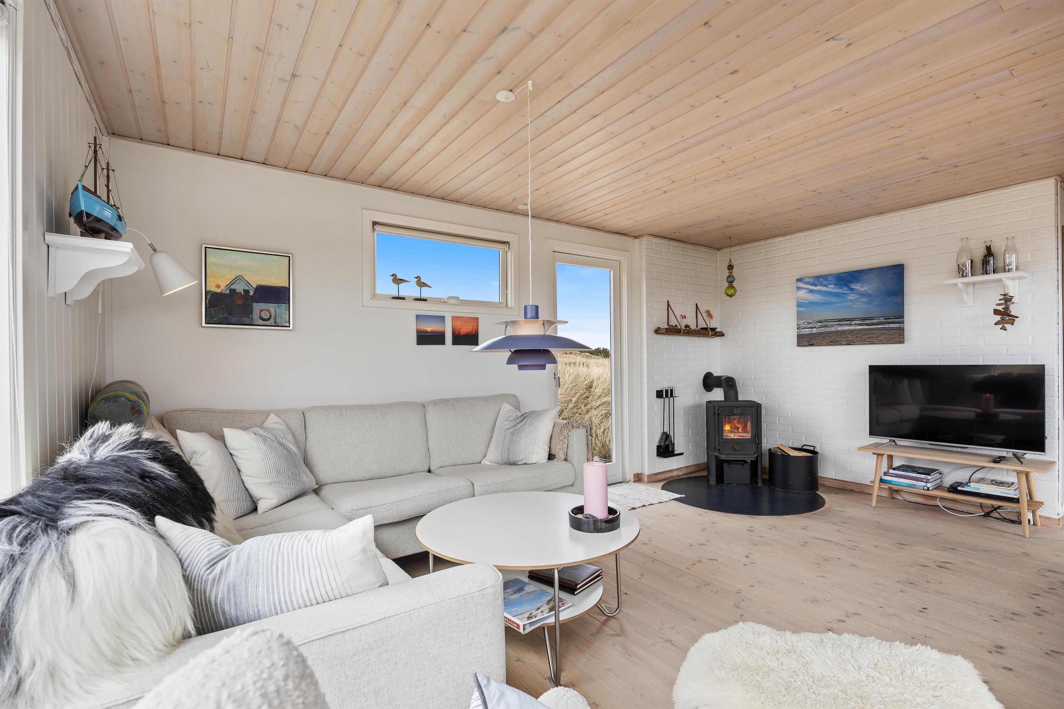 Hele sommerhuset har hvidmalede vægge og lofter, og de store vinduespartier skaber ikke mindst lyse og indbydende omgivelser. Fra den skønne opholdsstue er der direkte udsyn til naturområdet, der omgiver sommerhuset, og her føler I jer straks godt tilpas. Opholdsstuen er lys og venlig, og her kan familien samles foran brændeovnen til en god film på sommerhusets fladskærms-tv.