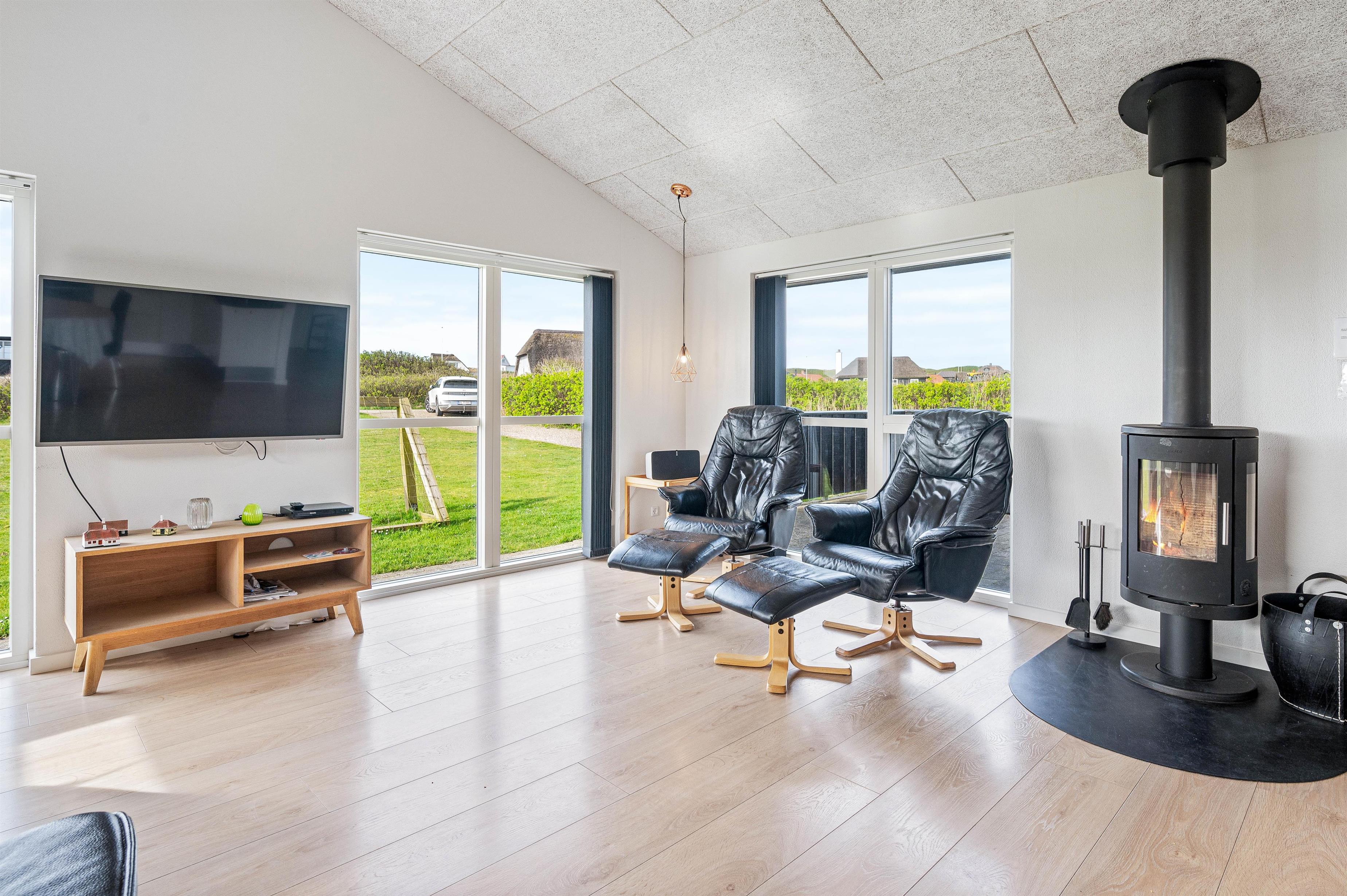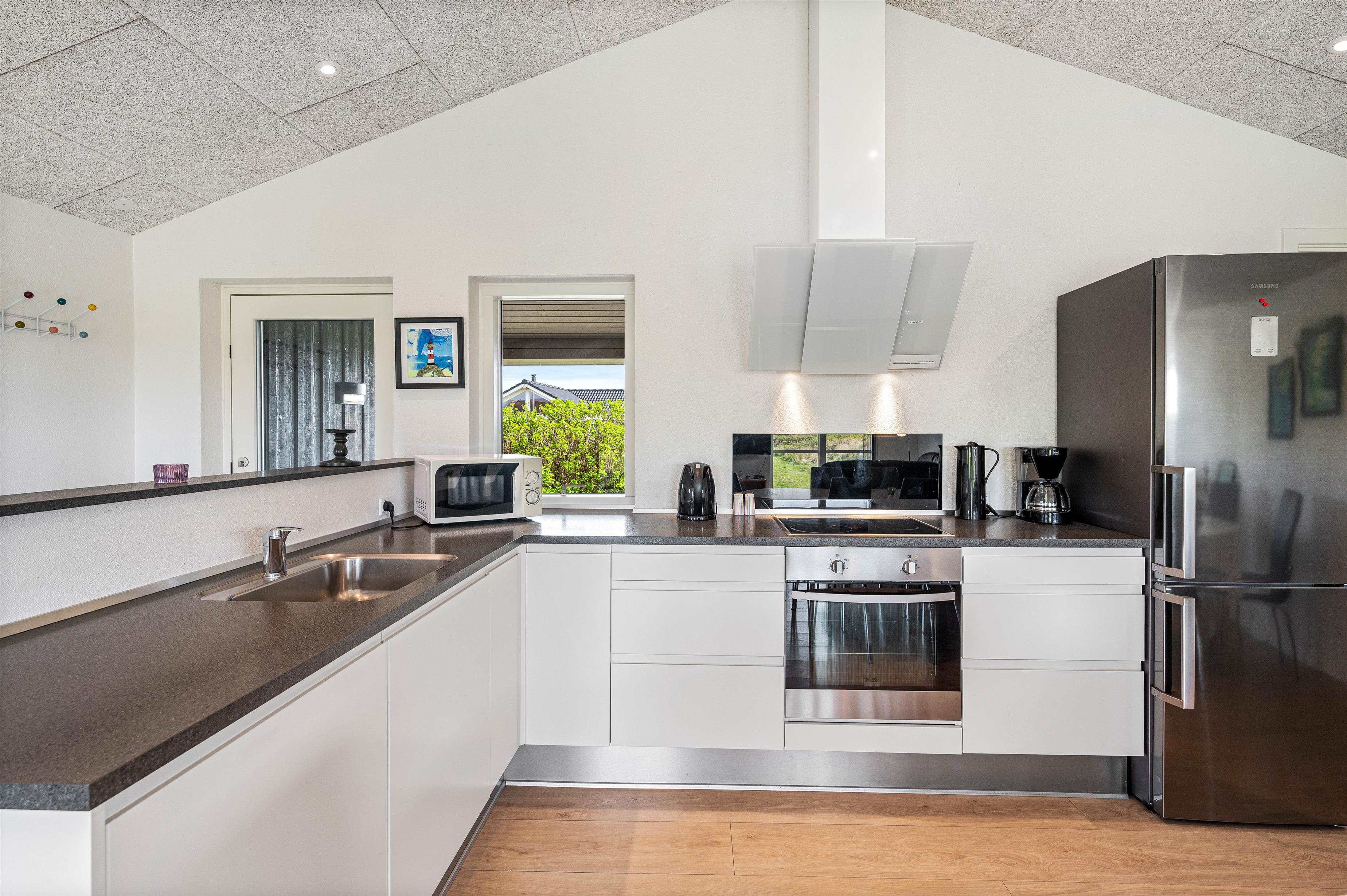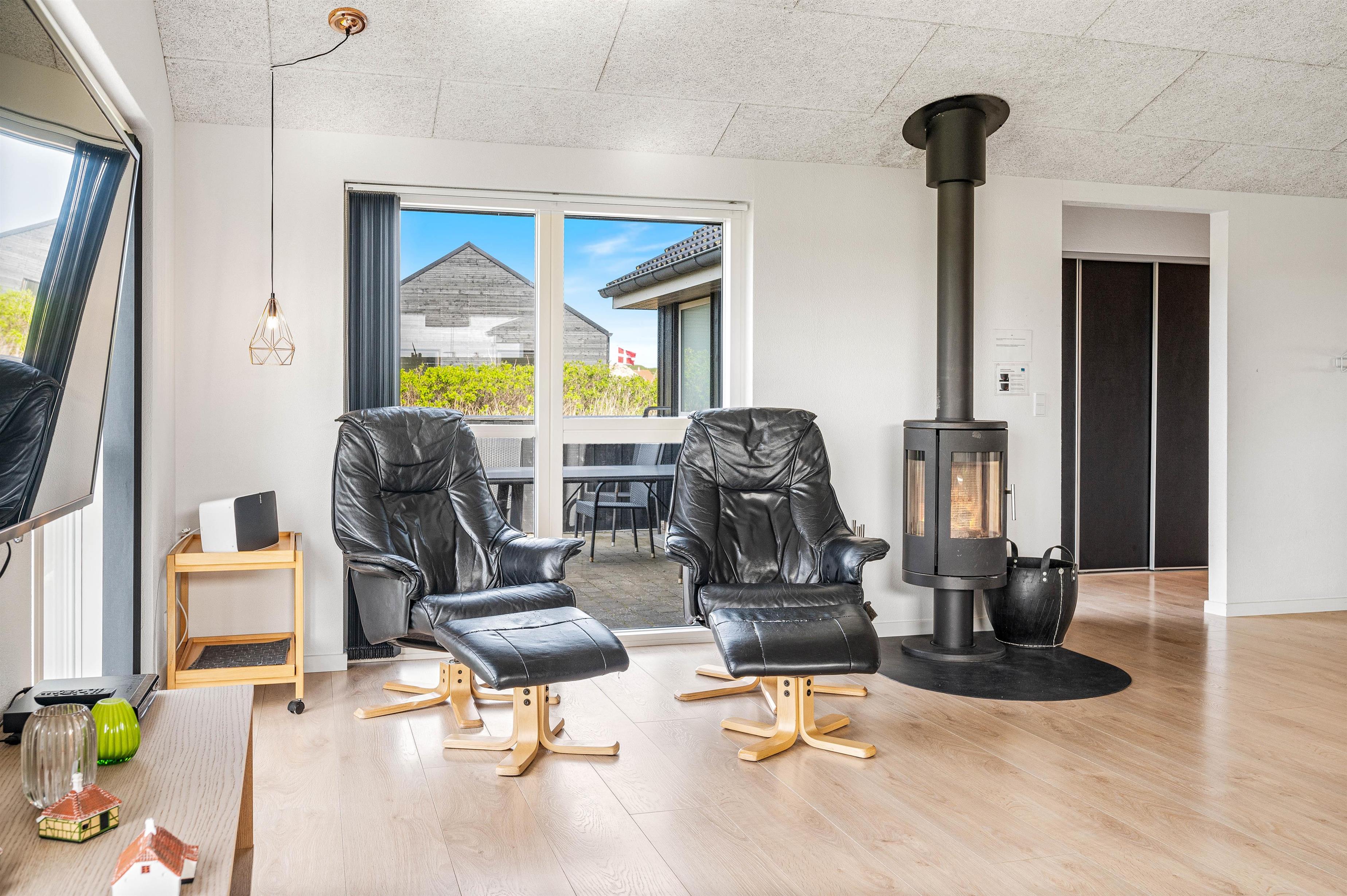 Sommerhusets moderne faciliteter sikrer, at jeres ophold vil være komfortabelt og bekvemt. Køkkenet er udstyret med en opvaskemaskine og en 90 L separat fryser, hvilket især er ideelt ved længere ophold og sikrer at I kan bruge tid på at nyde jeres ferie. Der er desuden en vaskemaskine og en tørretumbler til rådighed, således I kun behøver at pakke jeres yndlingstøj. Brændeovnen skaber en fantastisk hyggelig og varm atmosfære, som også komplementeres af husets økonomiske luft-til-luft varmepumpe.