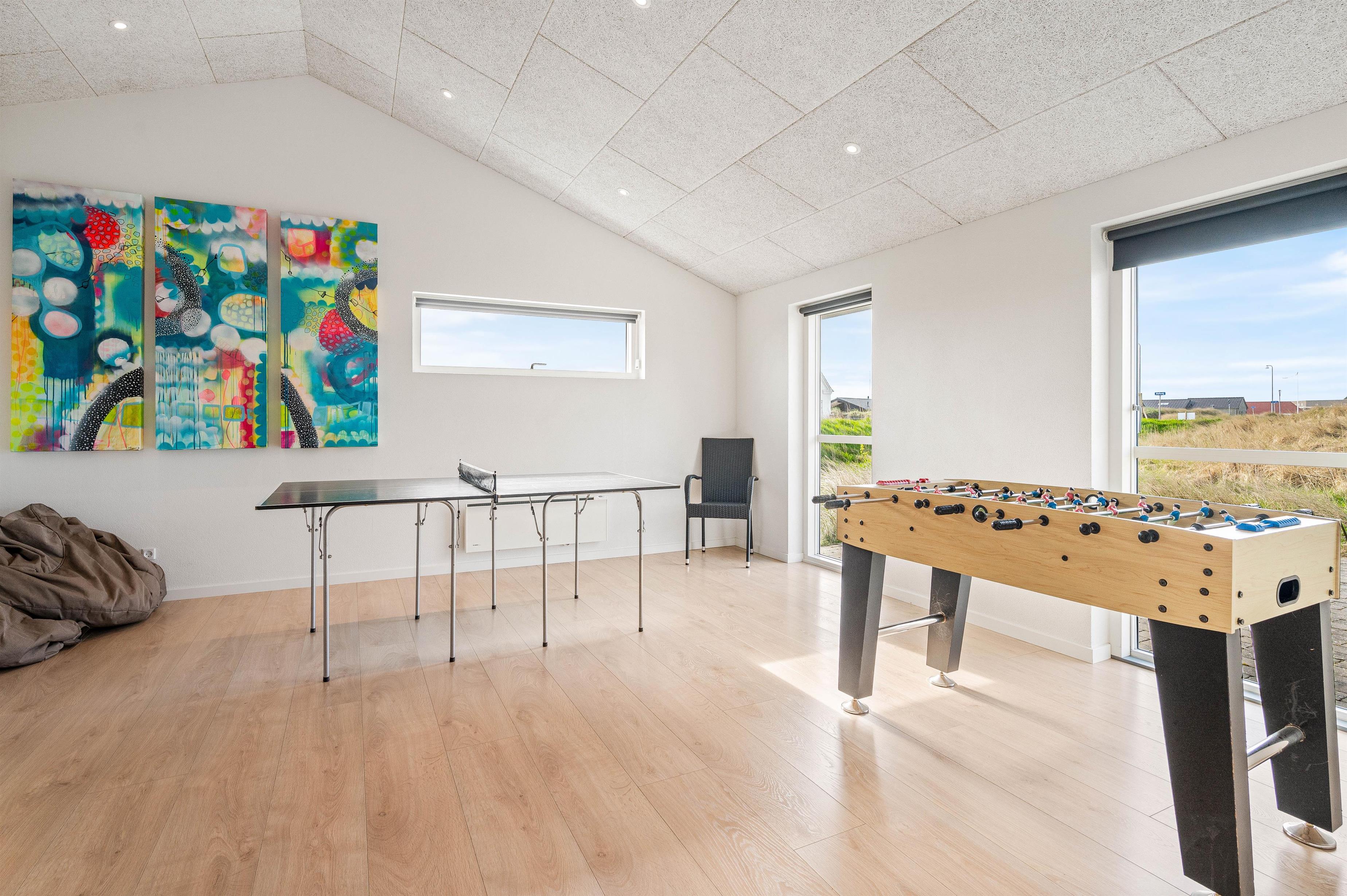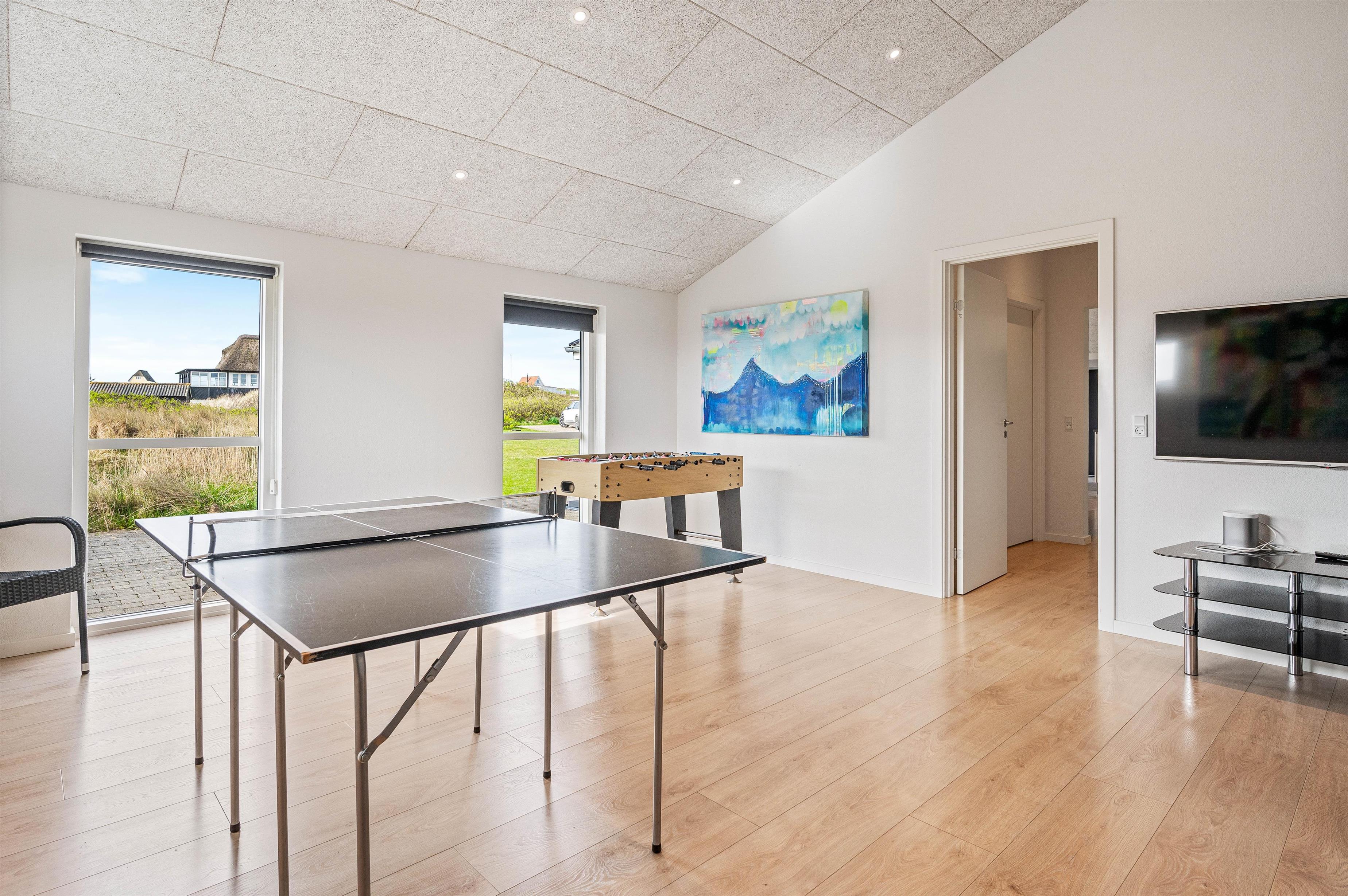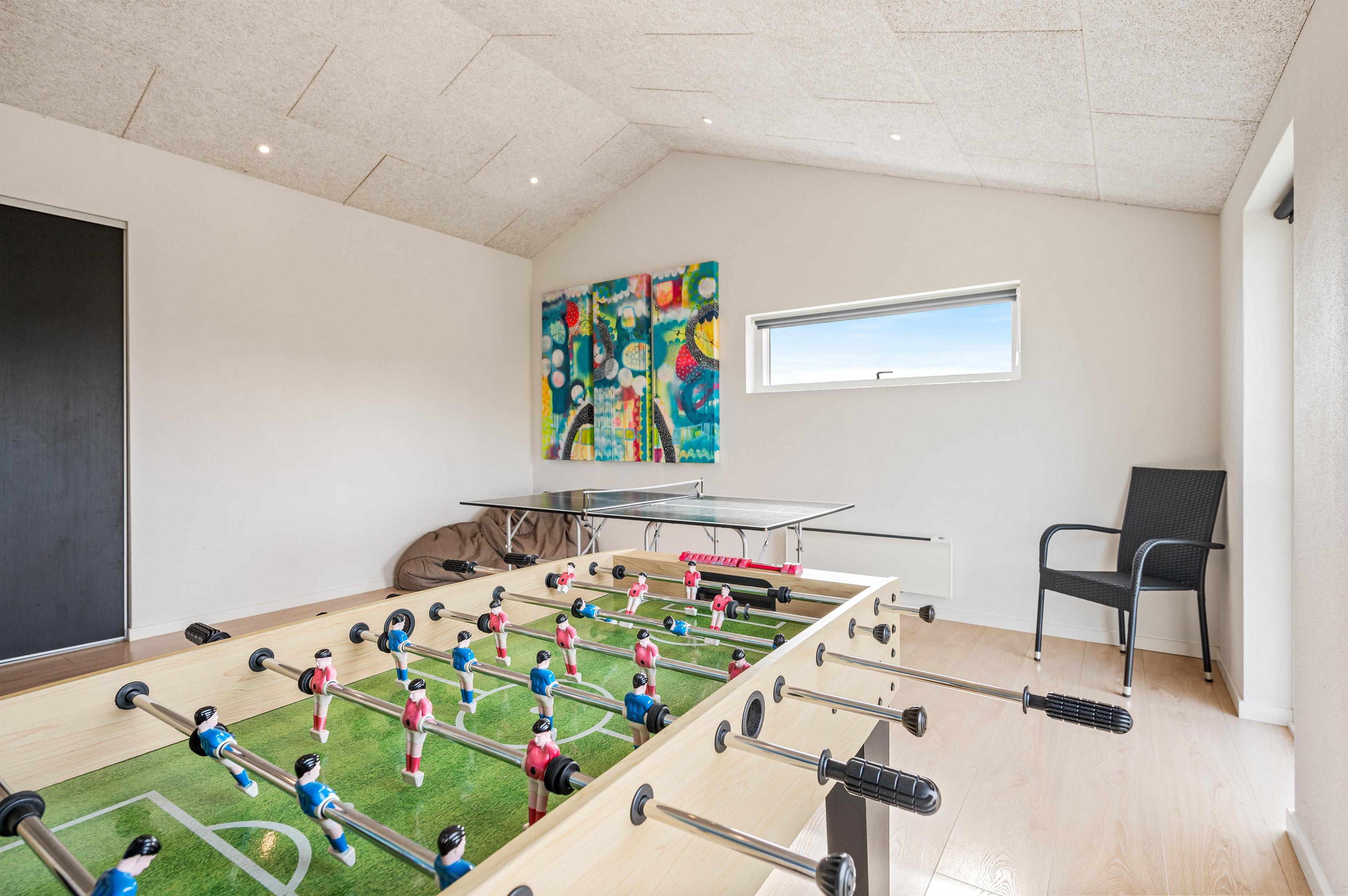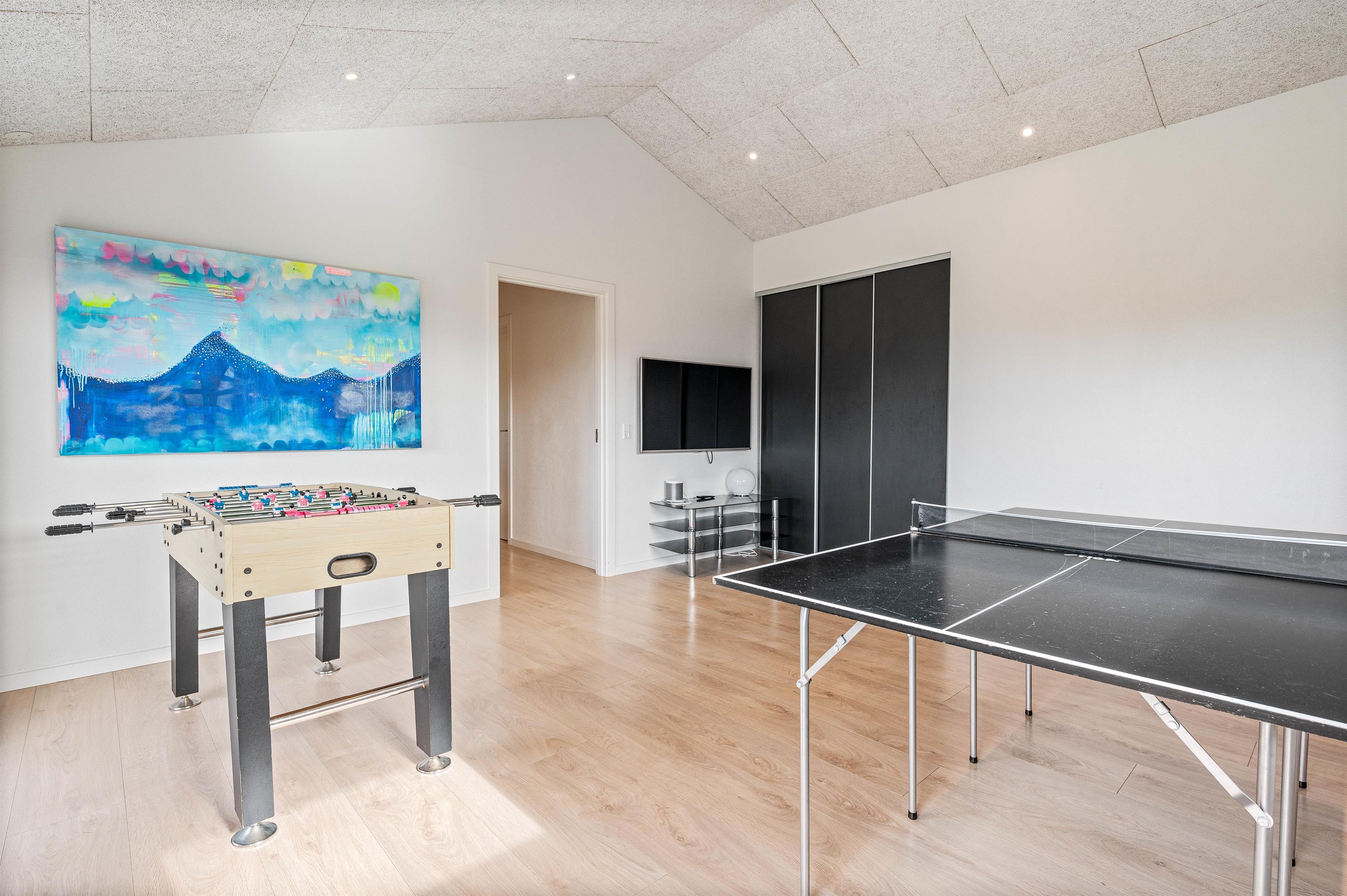 Sommerhuset er både ideelt til dem der ønsker en afslappende ferie, men det er i den grad også perfekt for de der ønsker en aktiv og aktivitetesrig ferie. På Hafavej 2 finder I jeres eget aktivitetsrum, hvor I både kan dyste i bordtennis og bordfodbold og kåre feriens mester. Derudover er sommerhuset udstyret med hurtigt fiber-internet og et stort fladskærms TV. Her kan børnene tilslutte deres egen medbragte spillekonsol, hvilket lægger op til mange timers sjov og hygge.