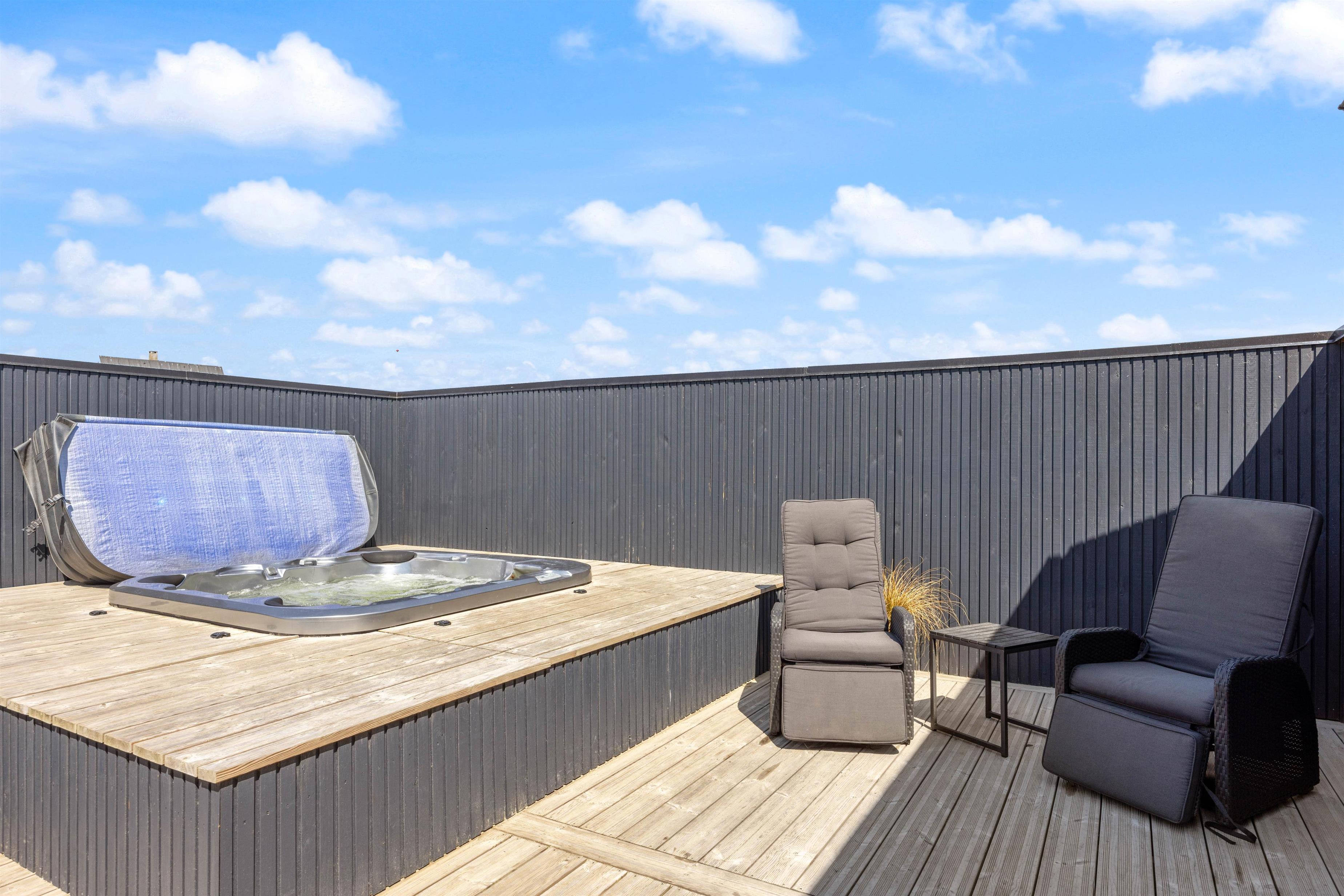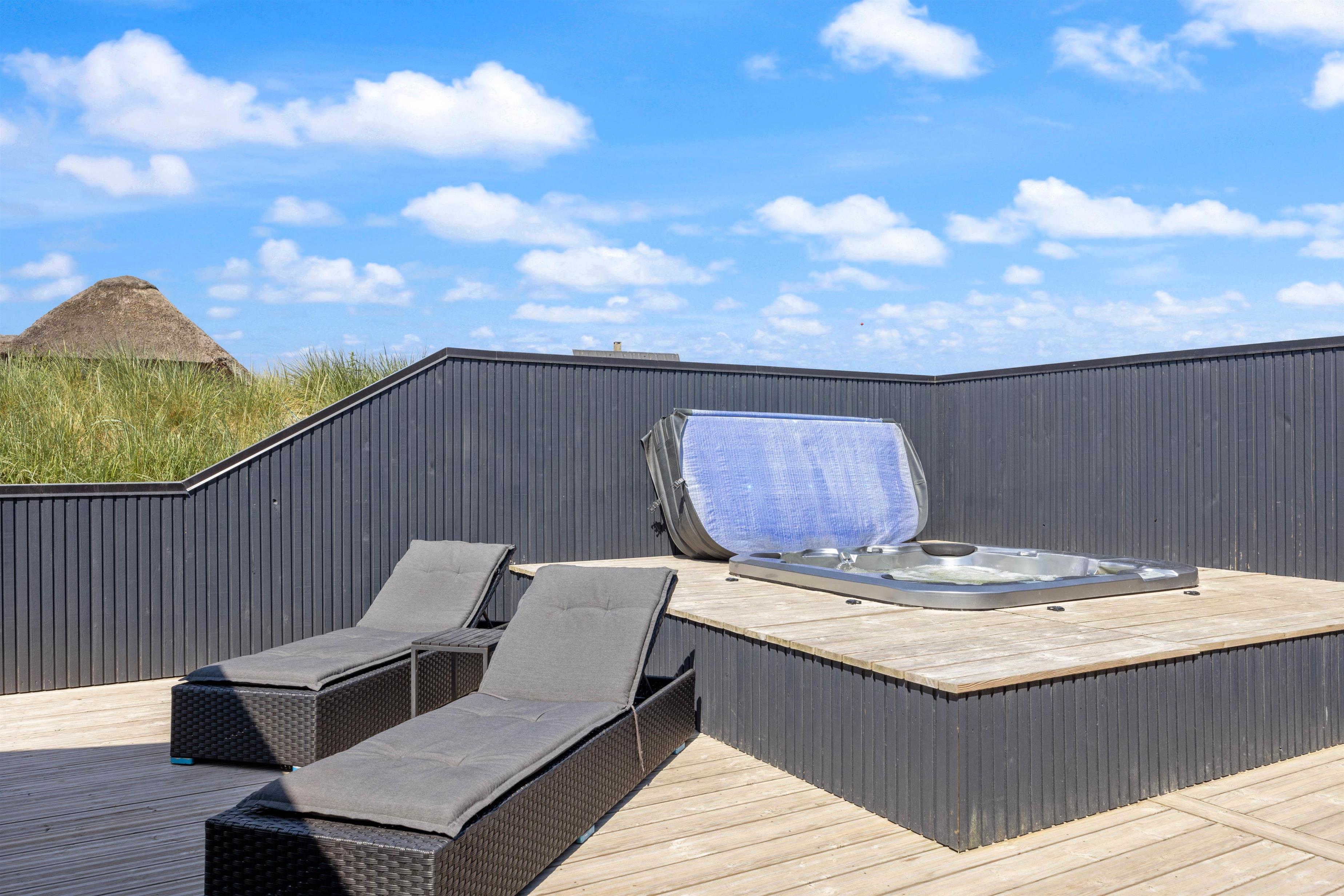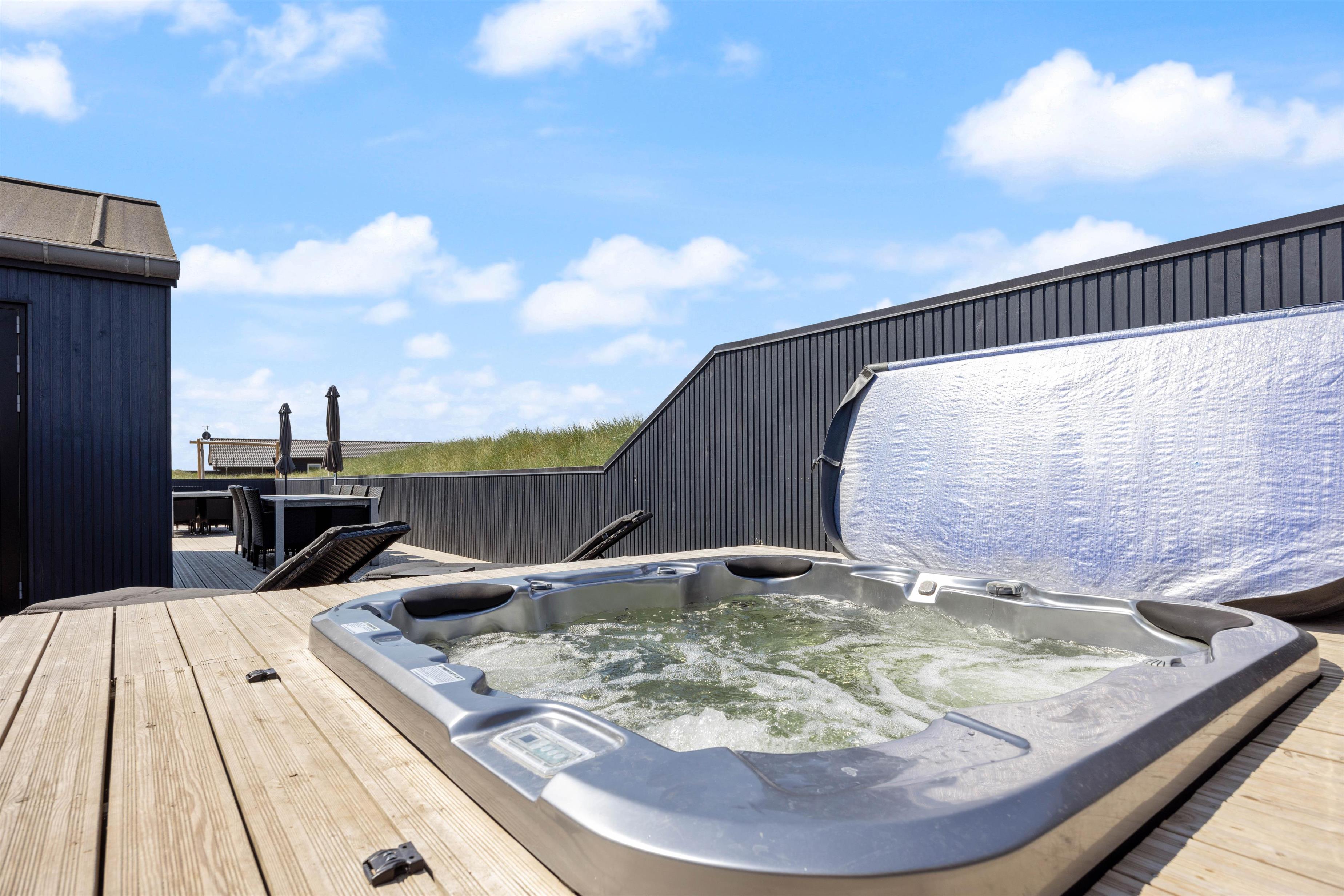 Drømmer I om en ferie med afslapning og selvforkælelse? Det ene af sommerhusets badeværelser er indrettet med spabad og sauna, så I kan tanke nye kræfter i varmen. I kan også vælge at søge mod den lukkede terrasse, hvor et stort, udendørs spabad står klar til at give jer masser af skønne wellness-stunder i det fri. Har i været en tur på stranden, har i også mulighed for at benytte jer af feriehusets udebruser, til at skylle sandet af kroppen. OBS. Udebruseren er åben fra april-november.