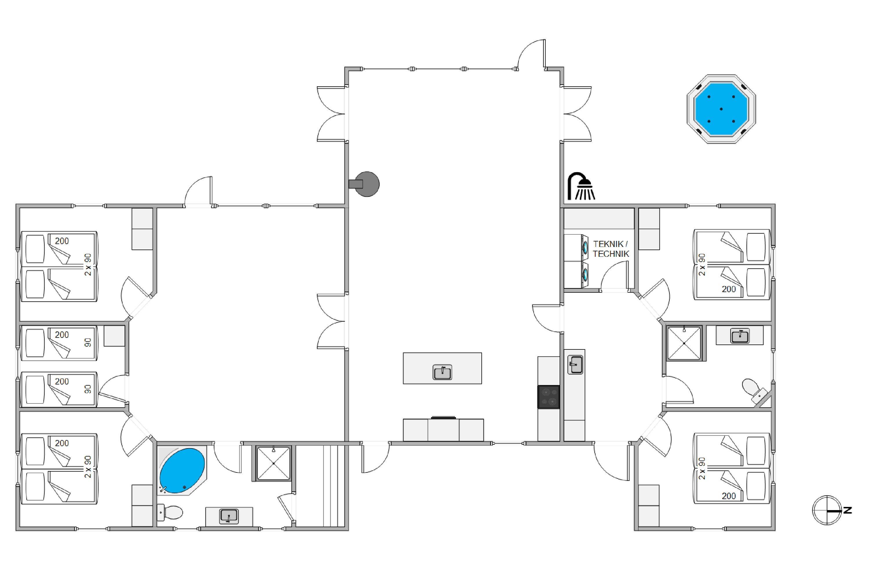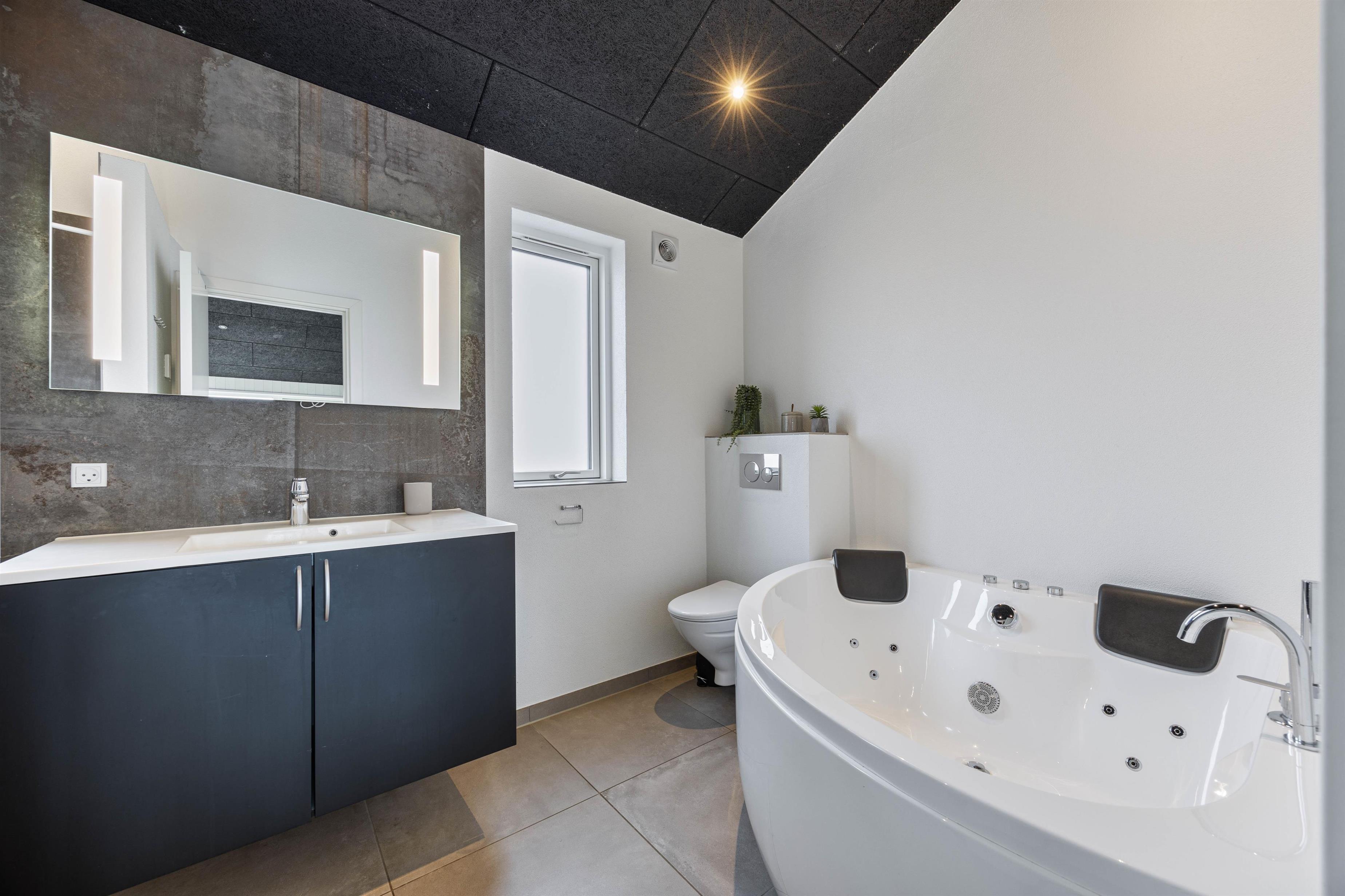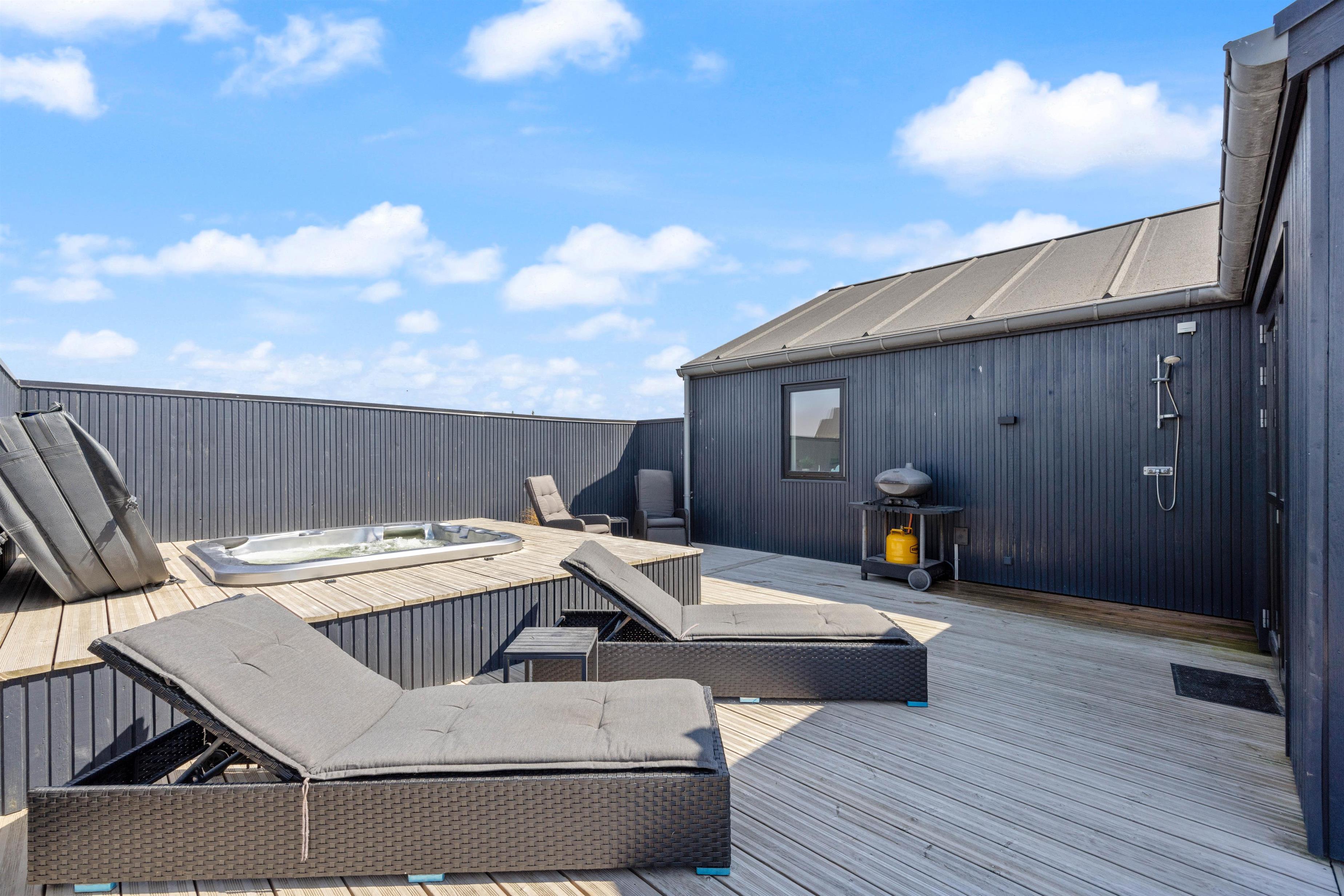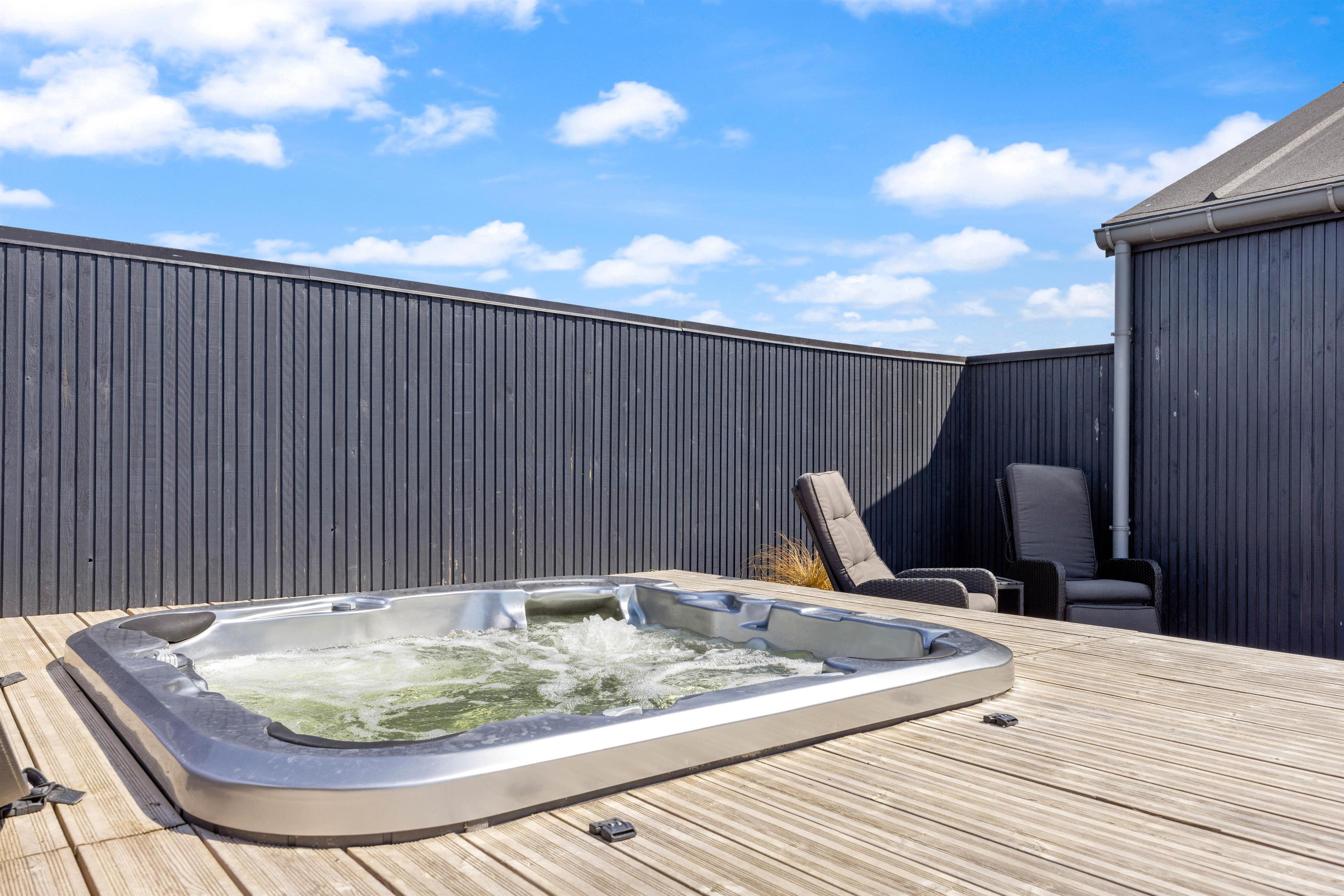 Drømmer I om en ferie med afslapning og selvforkælelse? Det ene af sommerhusets badeværelser er indrettet med spabad og sauna, så I kan tanke nye kræfter i varmen. I kan også vælge at søge mod den lukkede terrasse, hvor et stort, udendørs spabad står klar til at give jer masser af skønne wellness-stunder i det fri. Har i været en tur på stranden, har i også mulighed for at benytte jer af feriehusets udebruser, til at skylle sandet af kroppen. OBS. Udebruseren er åben fra april-november.