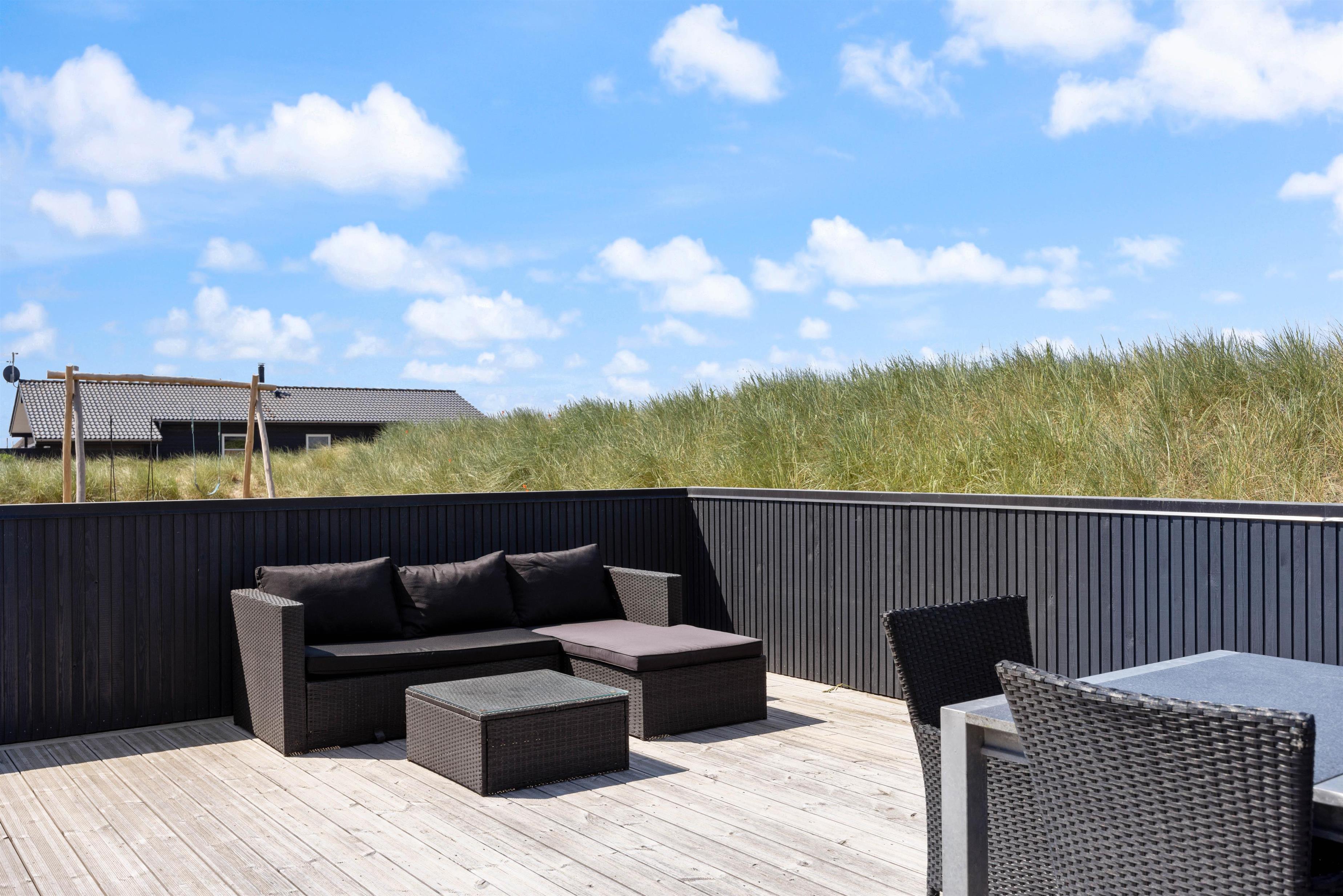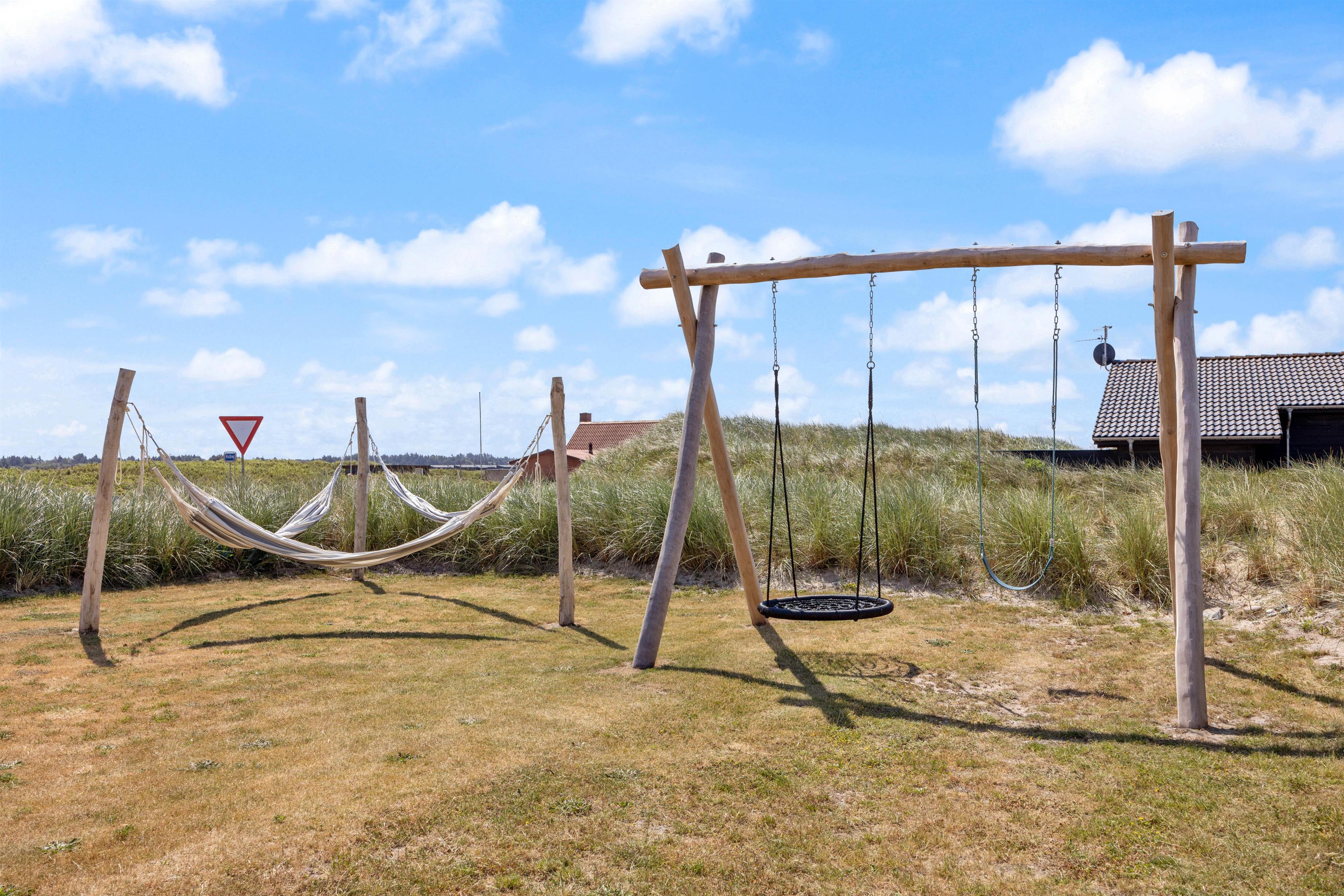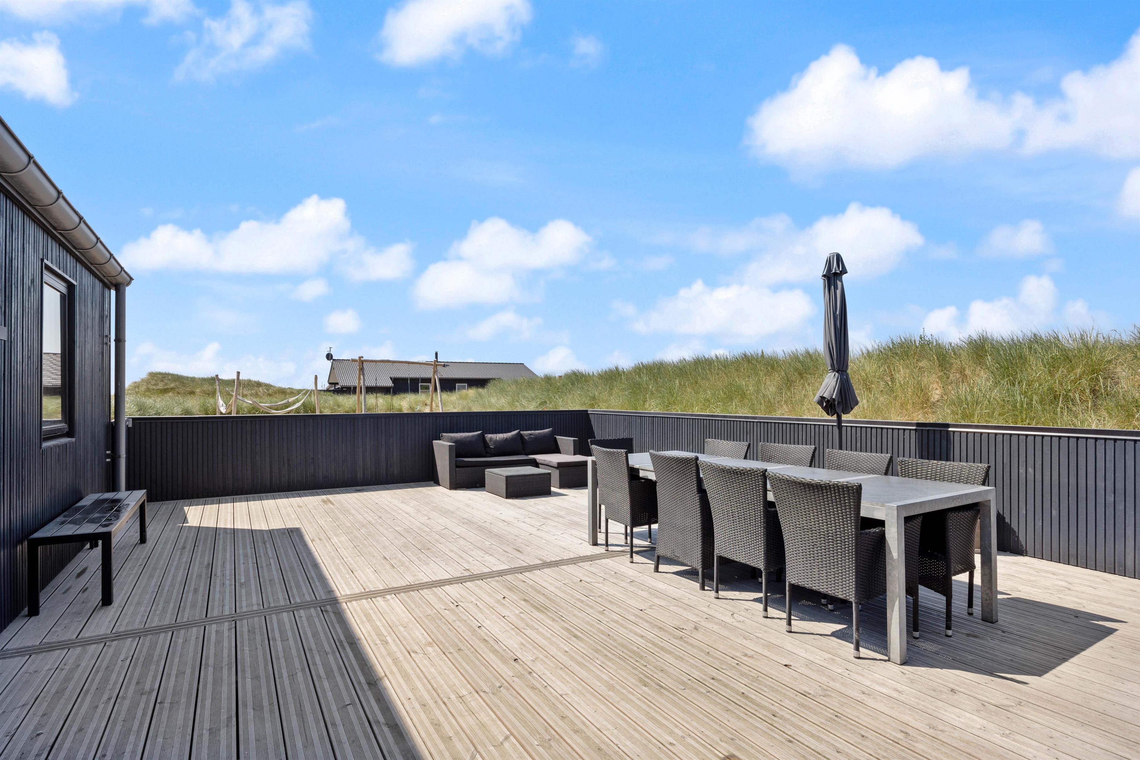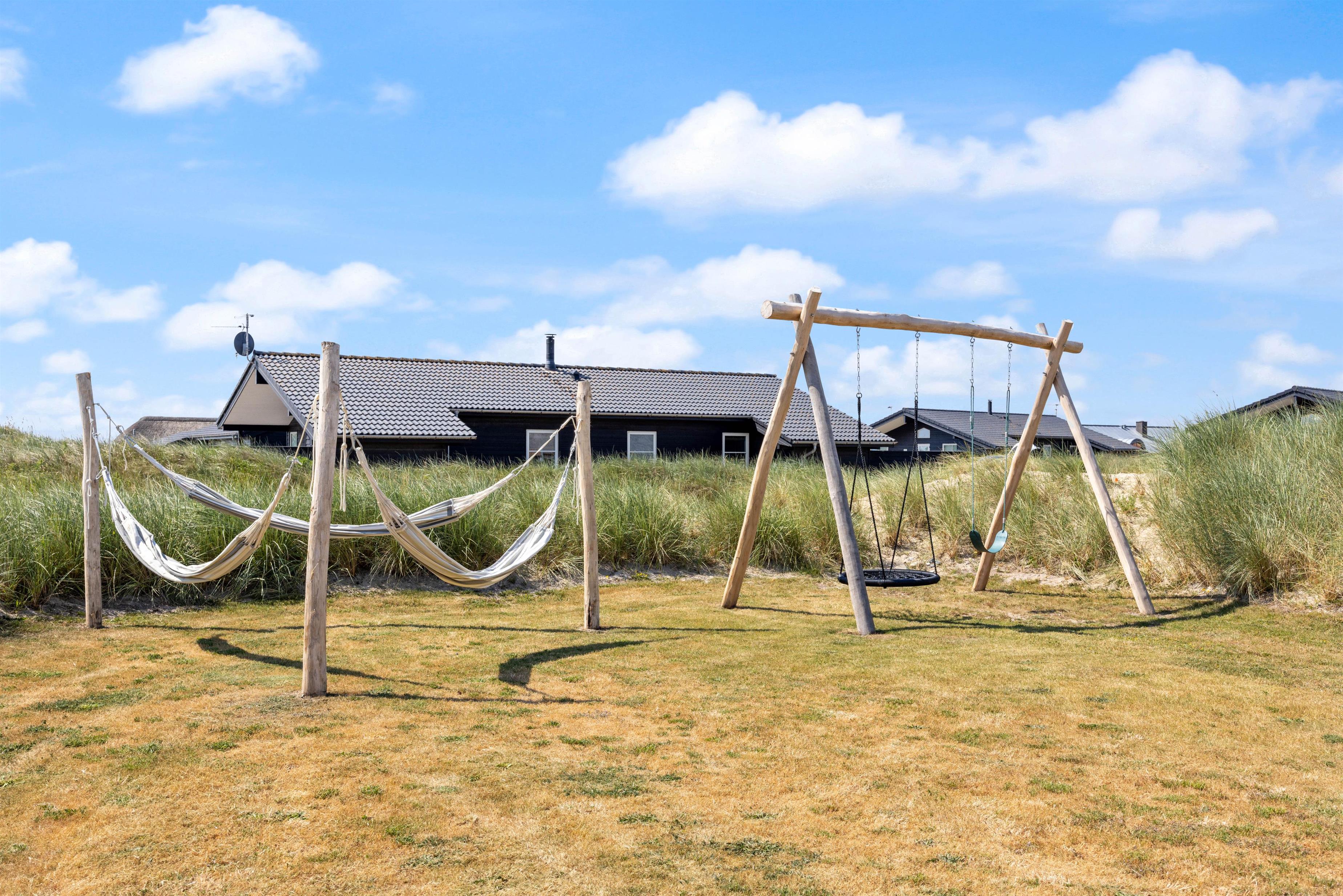 En stor, lukket træterrasse løber rundt om feriehuset og giver jer de bedste forudsætninger for at nyde den friske luft. Her finder alle 10 feriegæster nemt en plads i solen, og I kan uden betænkeligheder lade hundene vandre omkring på den lukkede terrasse, mens I tilbereder middagen på grillen eller læner jer tilbage i udespaen. Der er også både et gyngestativ og en hængekøje til rådighed.