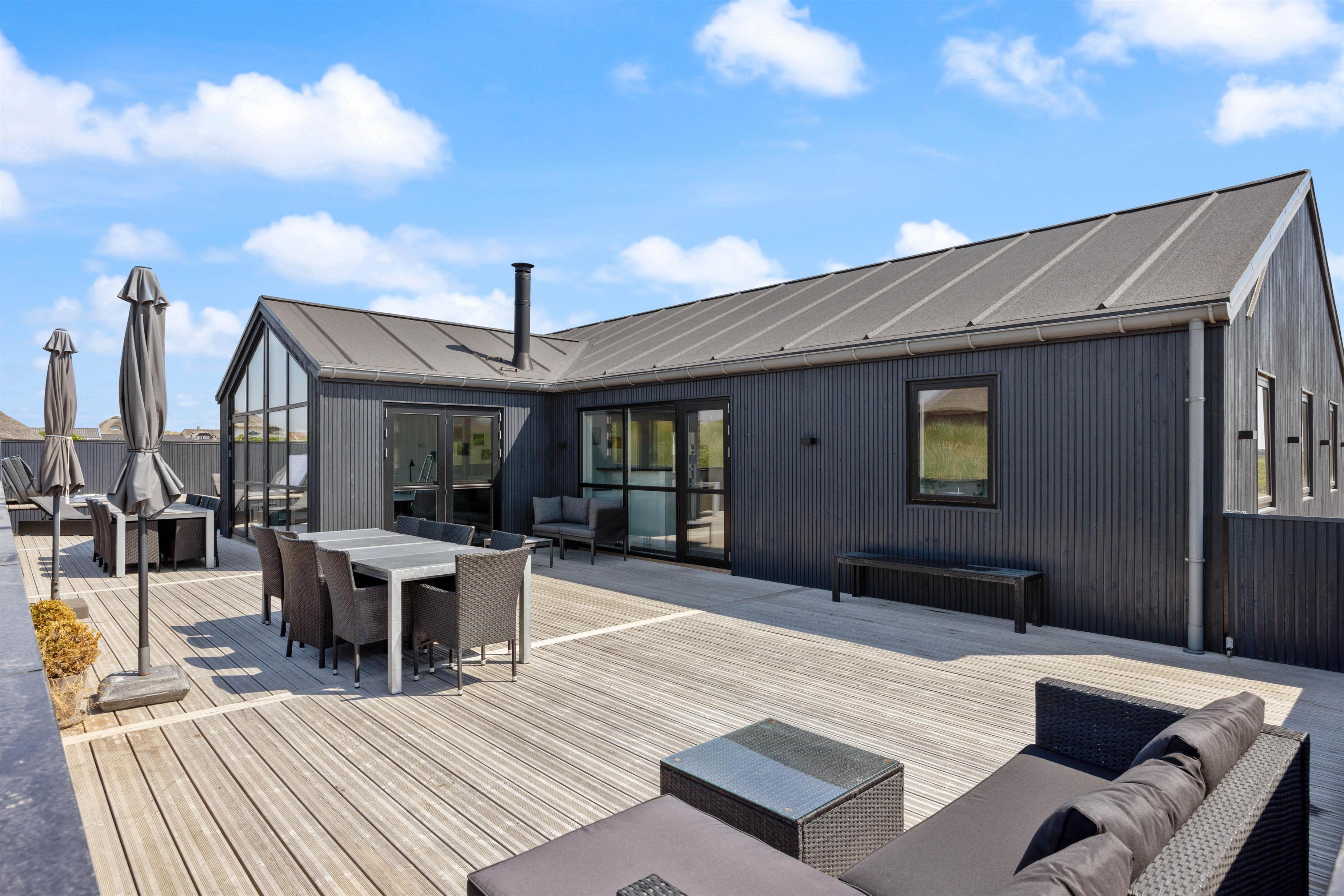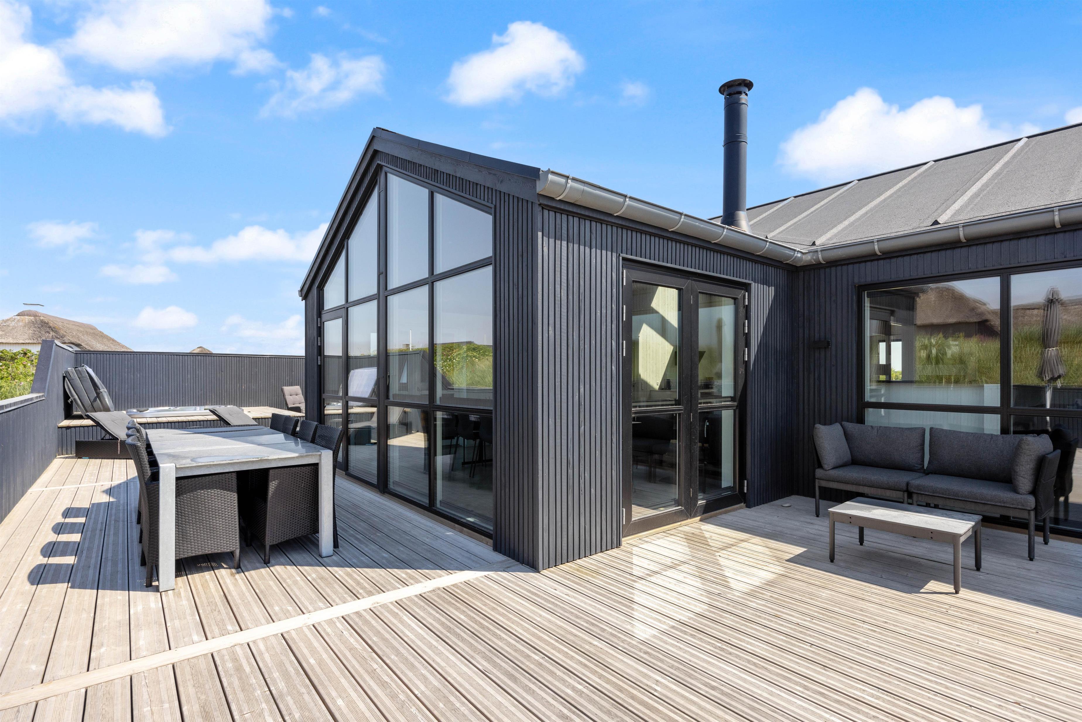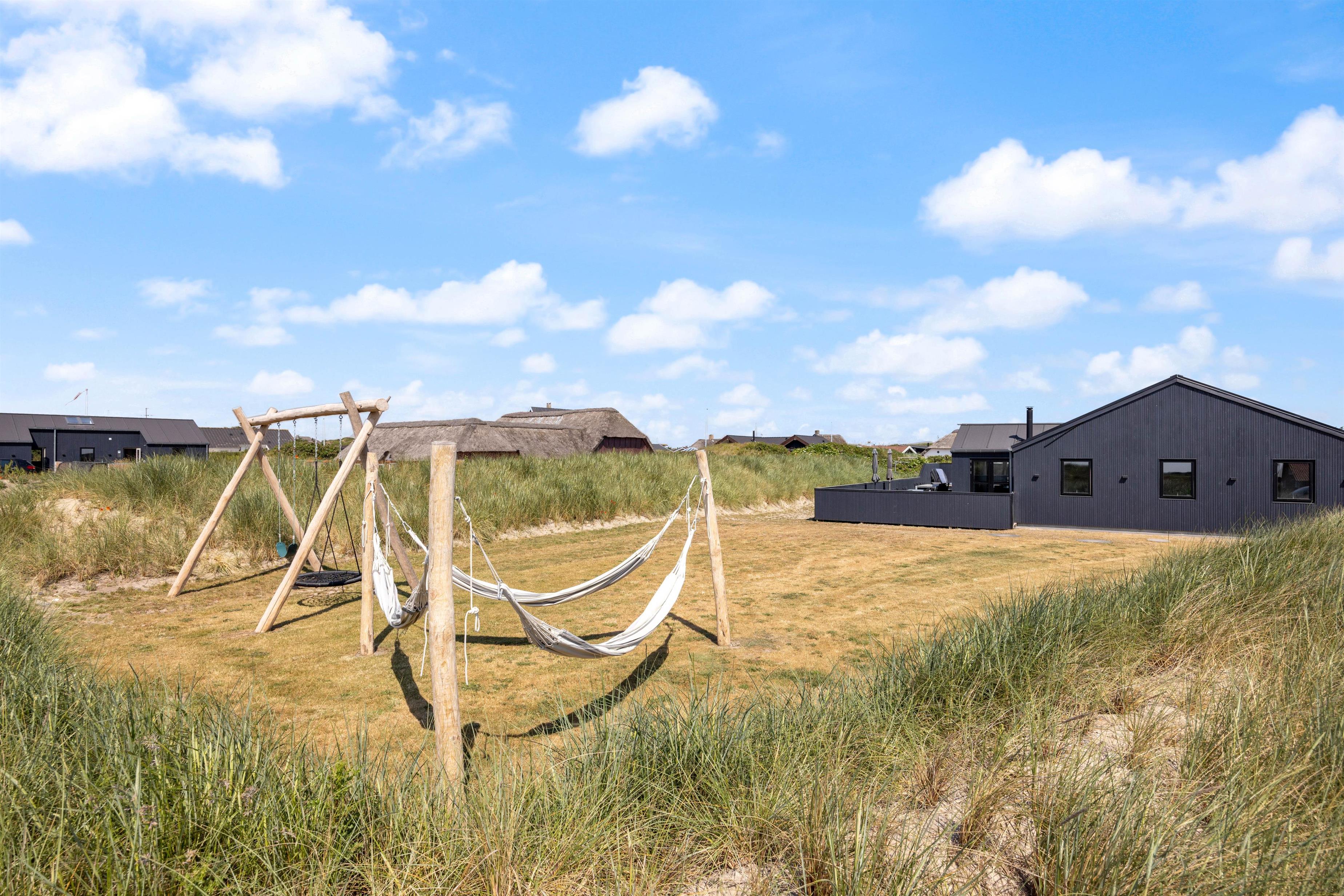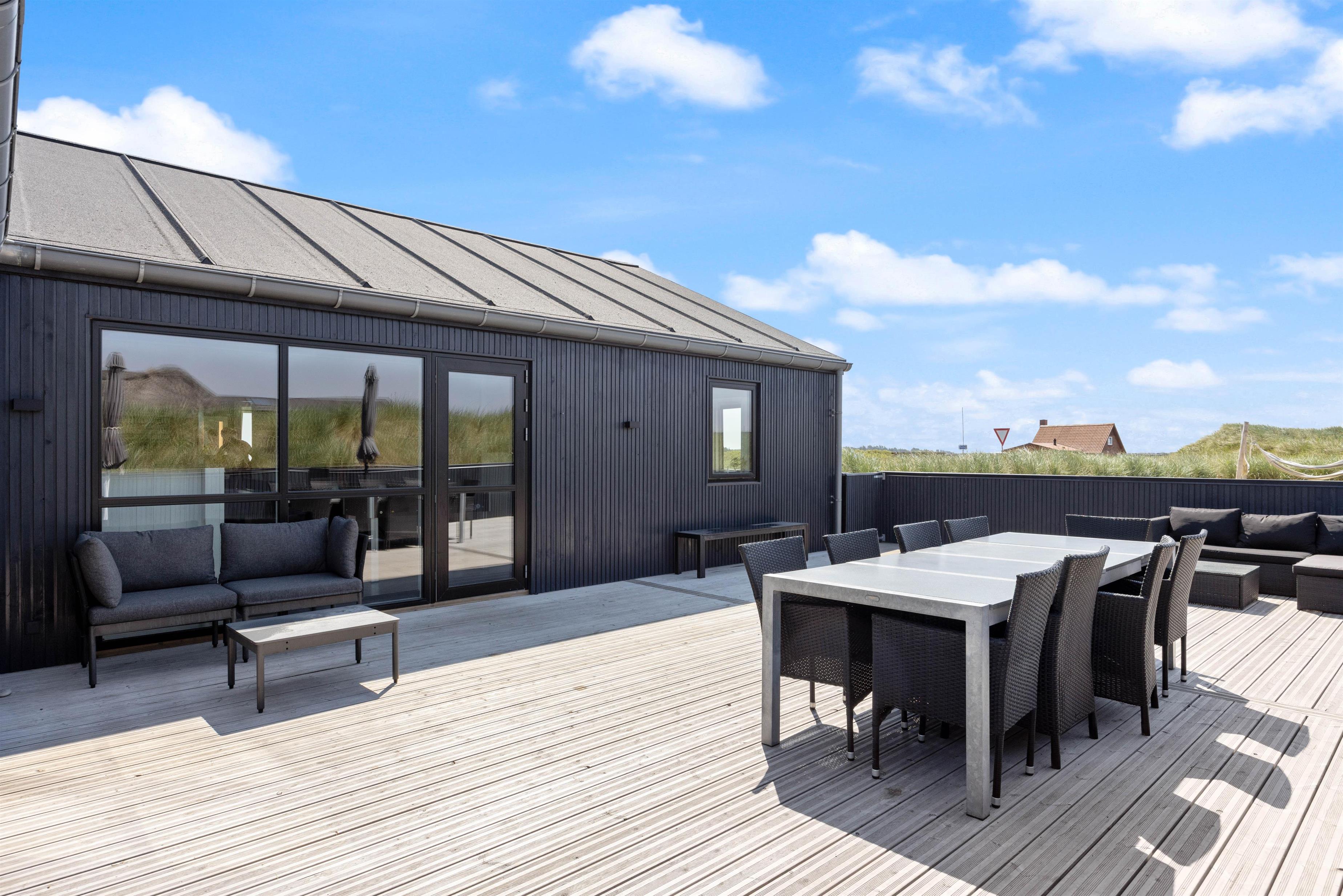 En stor, lukket træterrasse løber rundt om feriehuset og giver jer de bedste forudsætninger for at nyde den friske luft. Her finder alle 10 feriegæster nemt en plads i solen, og I kan uden betænkeligheder lade hundene vandre omkring på den lukkede terrasse, mens I tilbereder middagen på grillen eller læner jer tilbage i udespaen. Der er også både et gyngestativ og en hængekøje til rådighed.