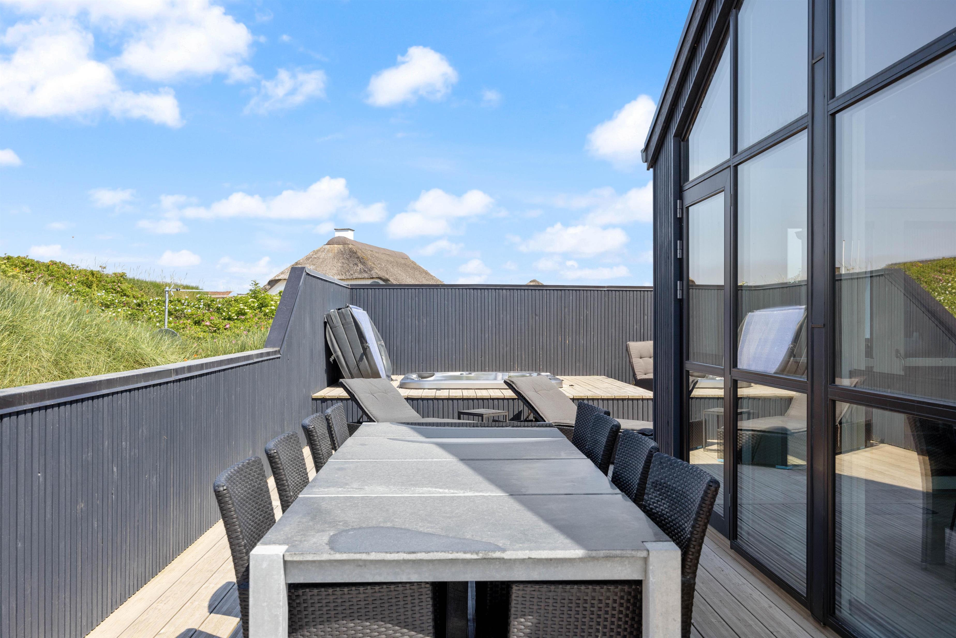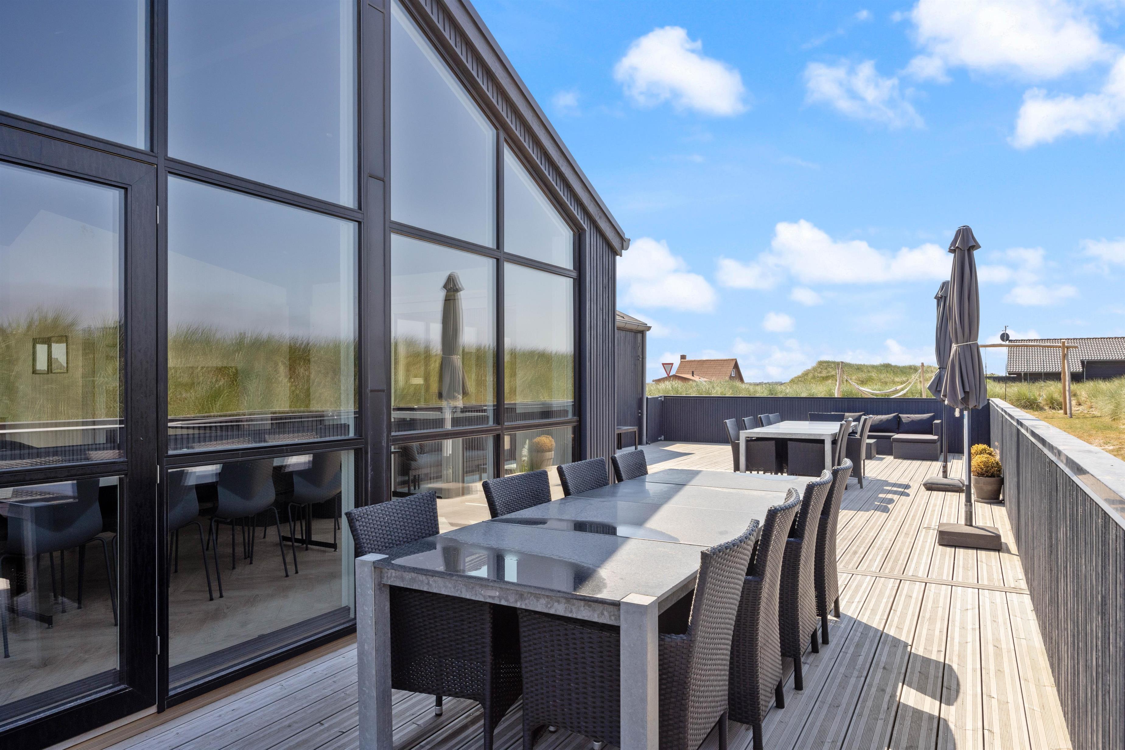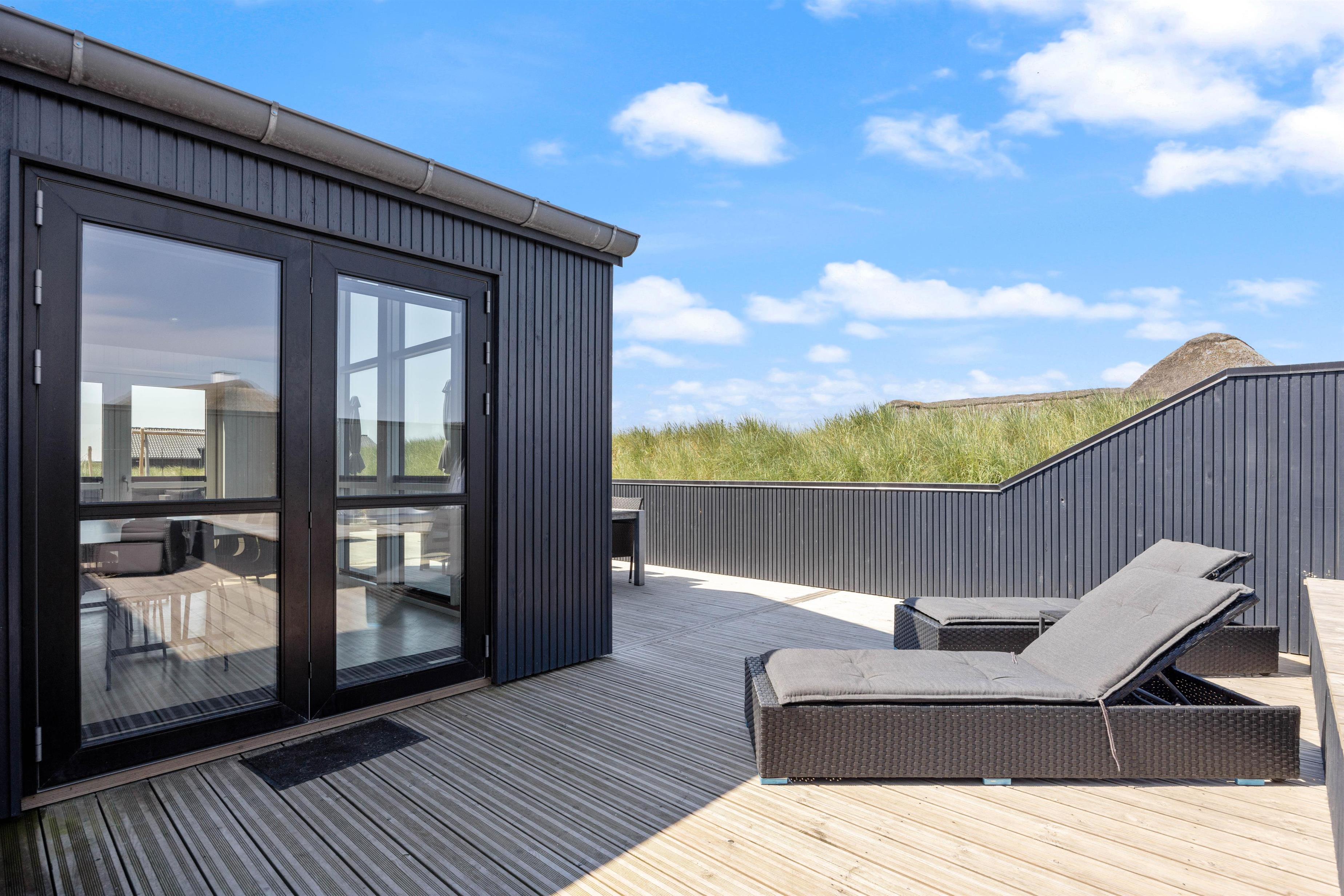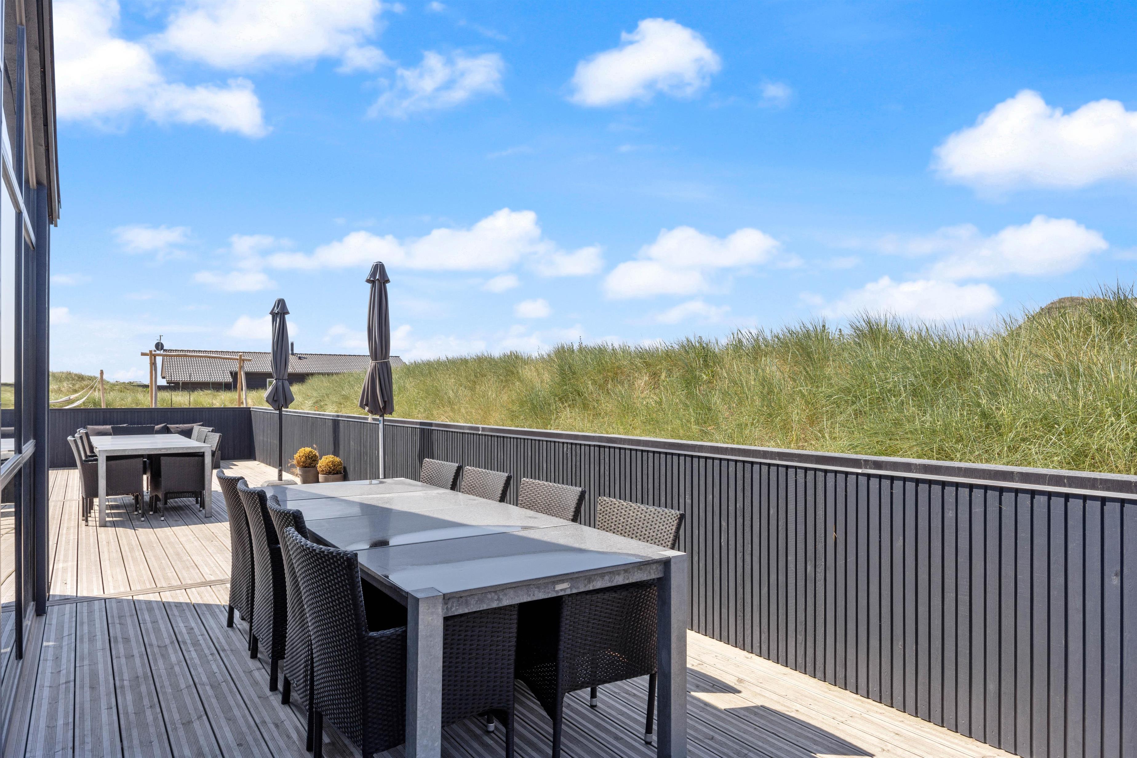 En stor, lukket træterrasse løber rundt om feriehuset og giver jer de bedste forudsætninger for at nyde den friske luft. Her finder alle 10 feriegæster nemt en plads i solen, og I kan uden betænkeligheder lade hundene vandre omkring på den lukkede terrasse, mens I tilbereder middagen på grillen eller læner jer tilbage i udespaen. Der er også både et gyngestativ og en hængekøje til rådighed.