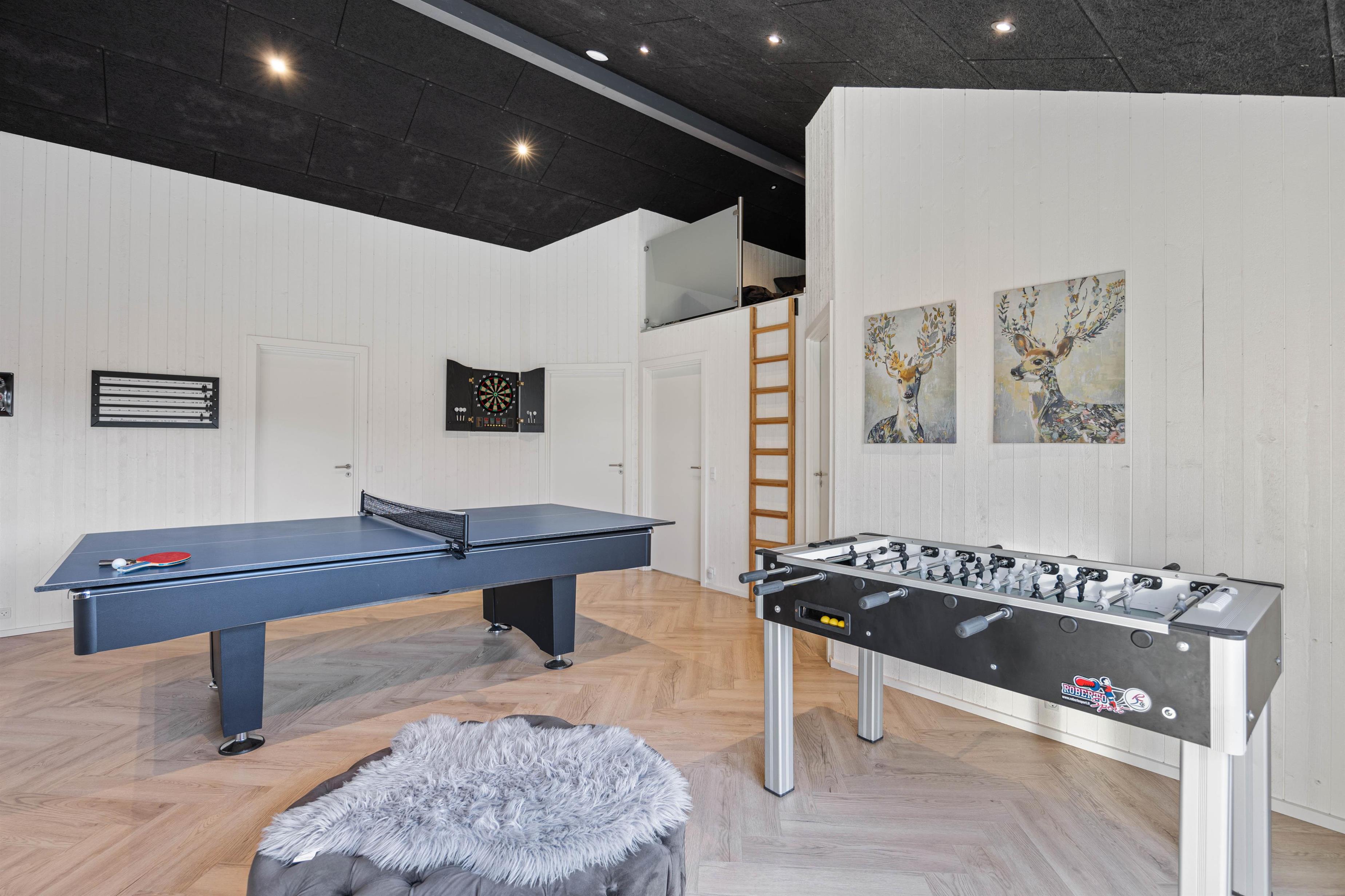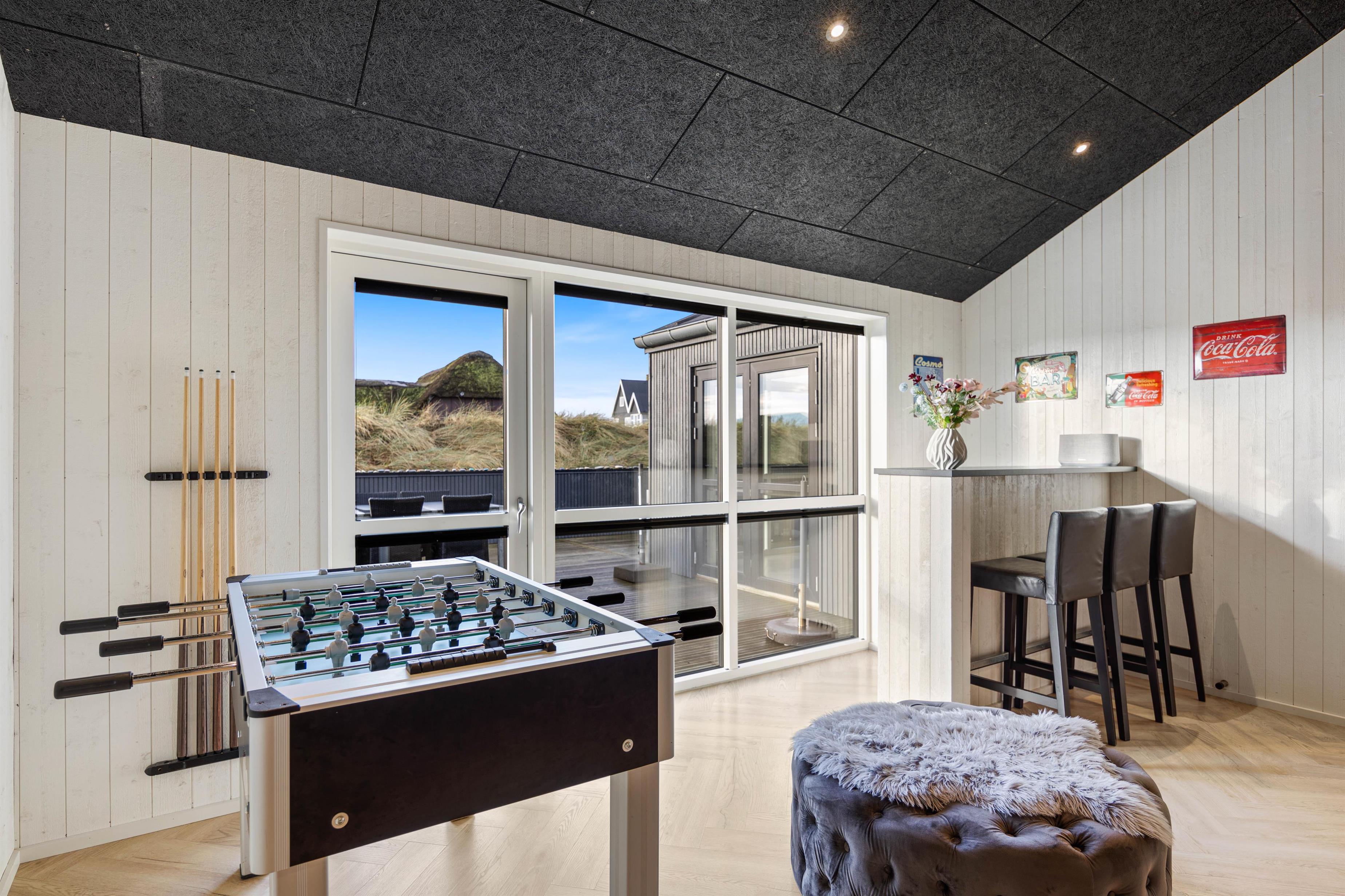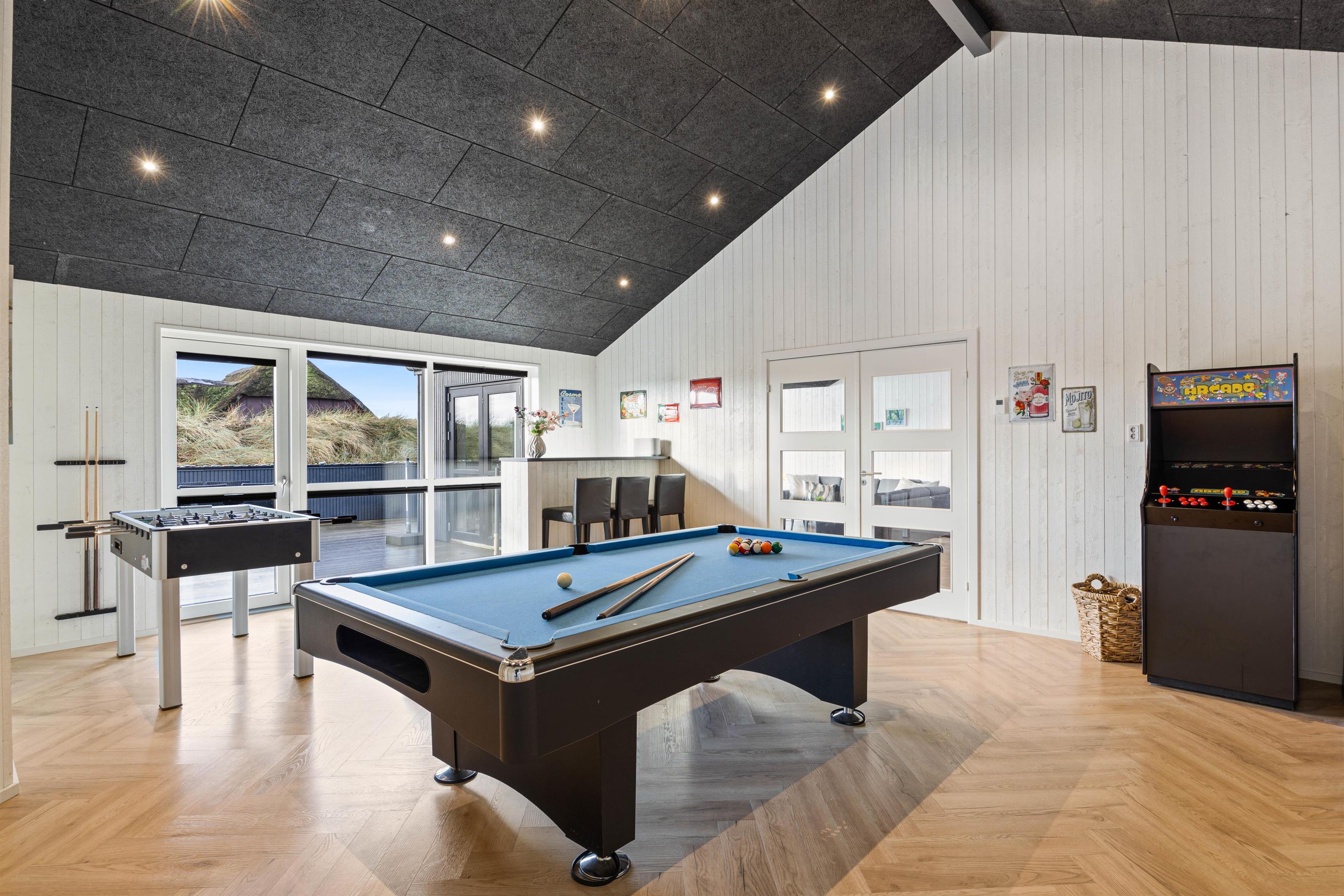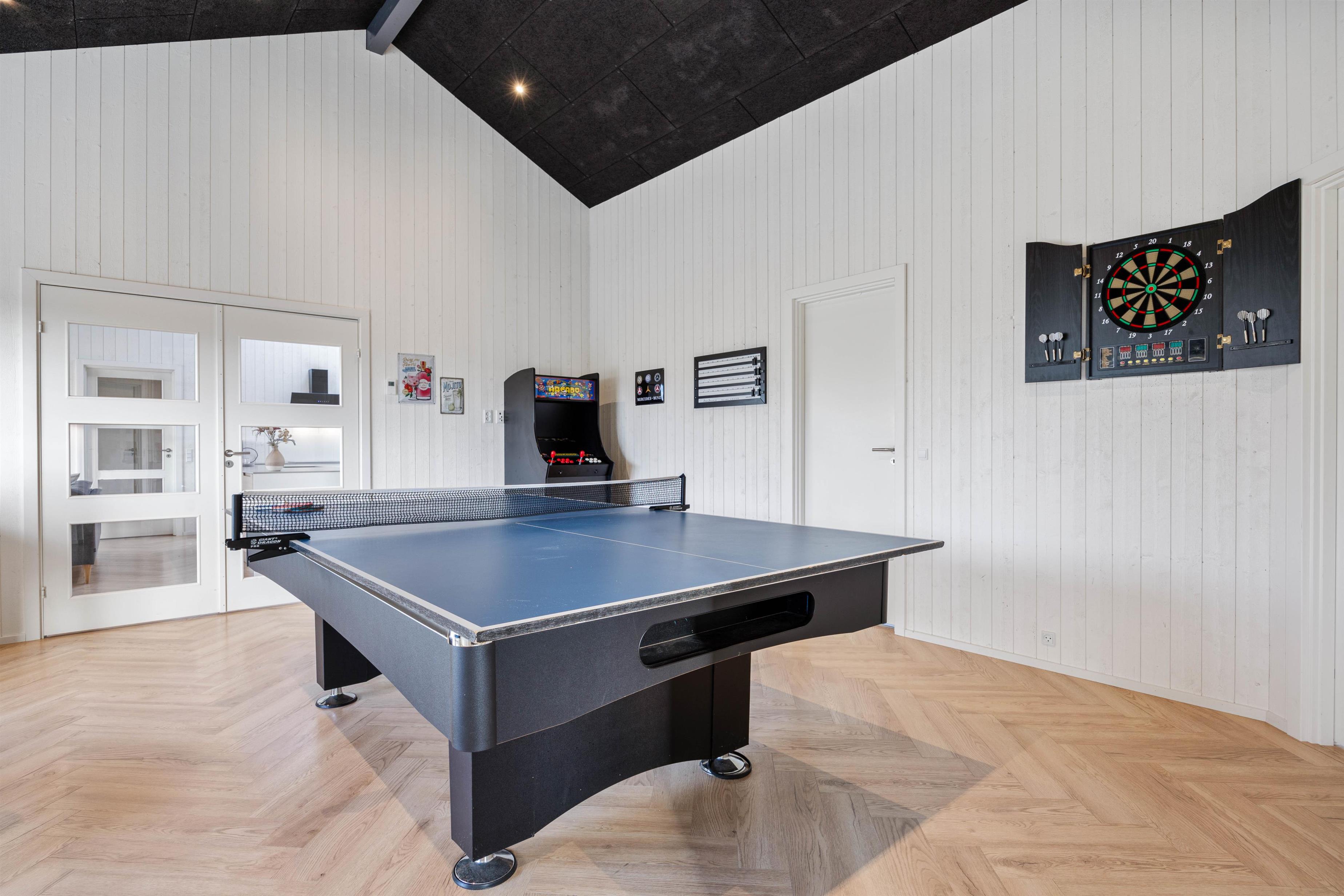 Er I mere til sjov og spil? Så vil I helt sikkert være godt beskæftigede i feriehusets aktivitetsrum, der er indrettet med billardbord, bordfodbold, dart og en arkade maskine. Her kan I udfordre hinanden på kryds og tværs, og måske skal feriens ultimative mester kåres i en nervepirrende turnering?