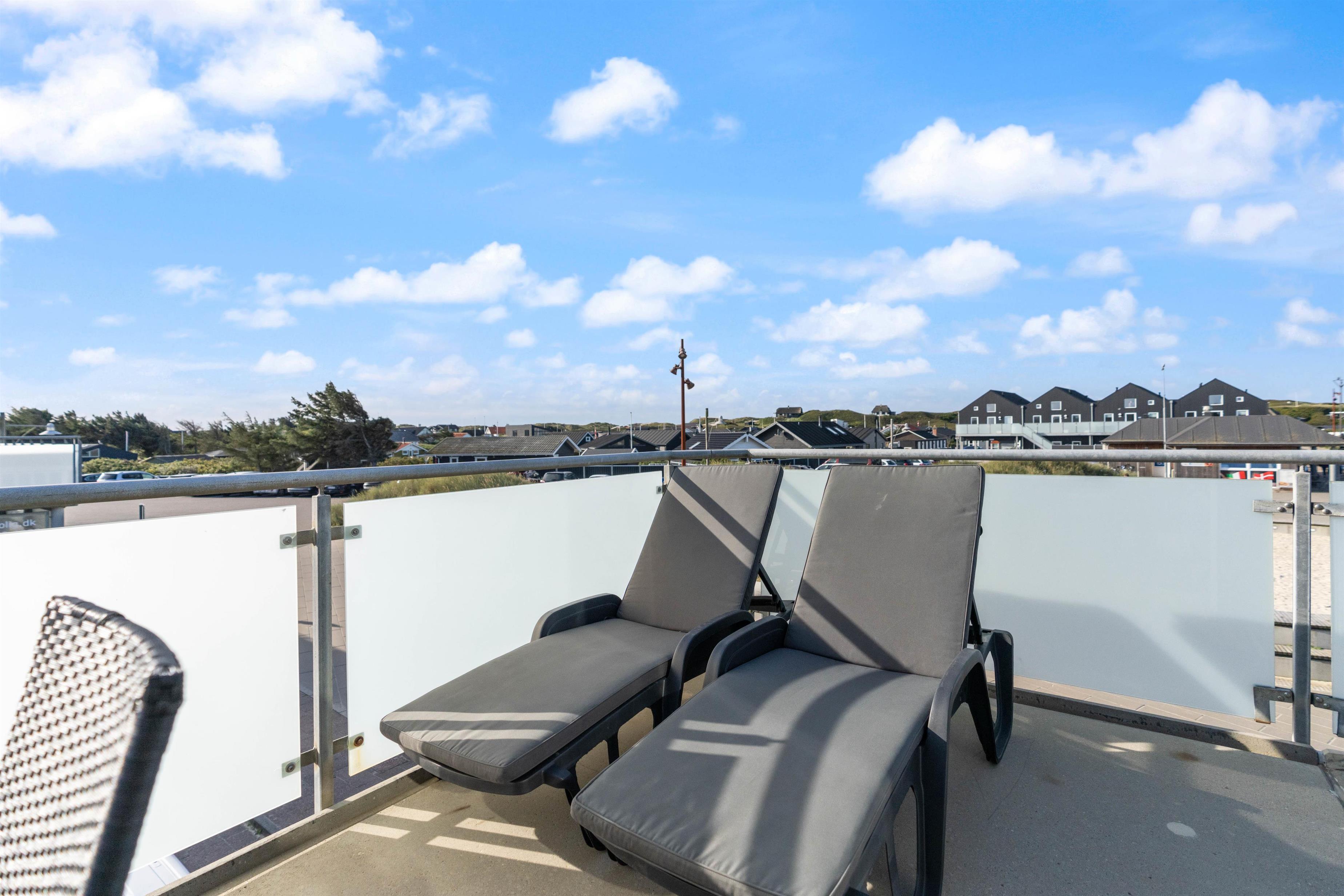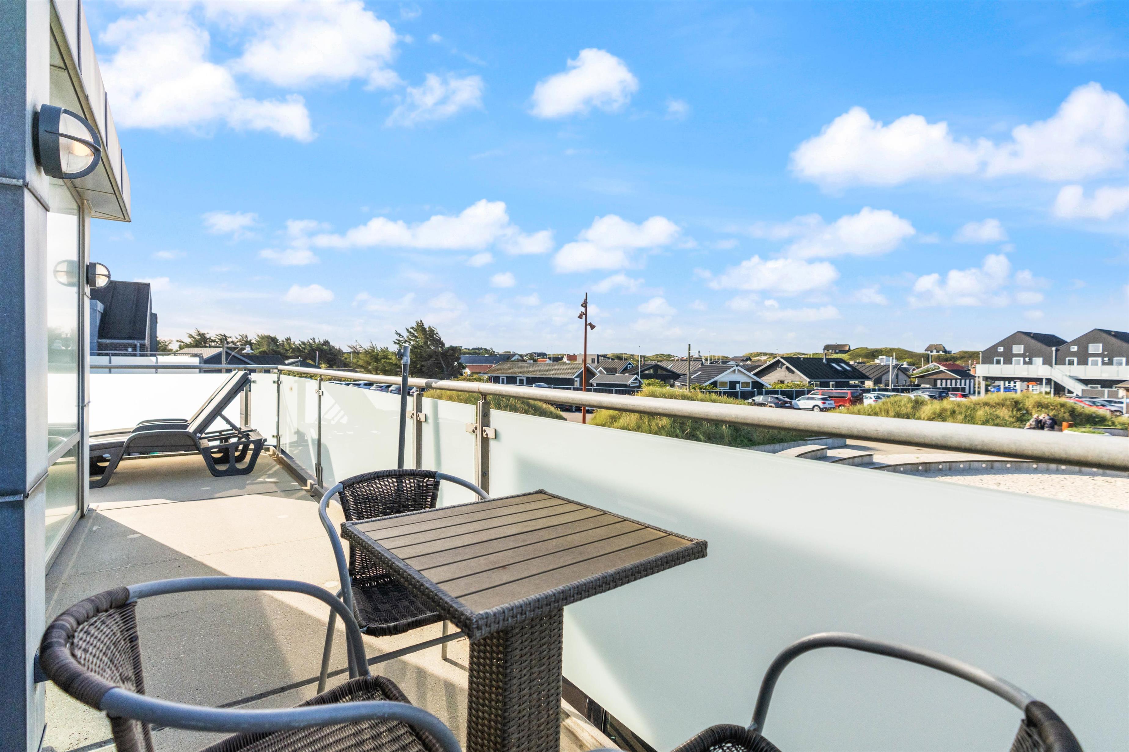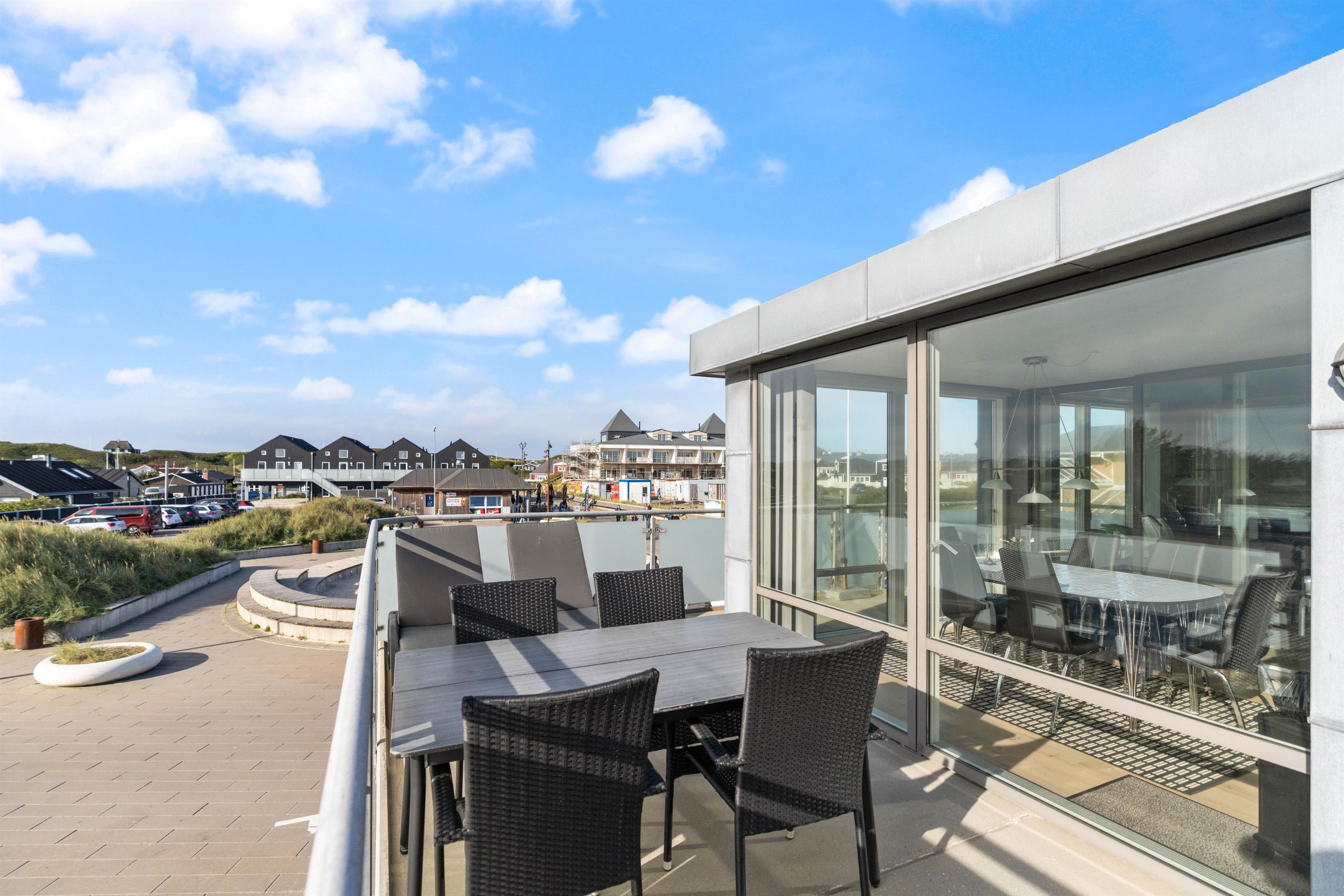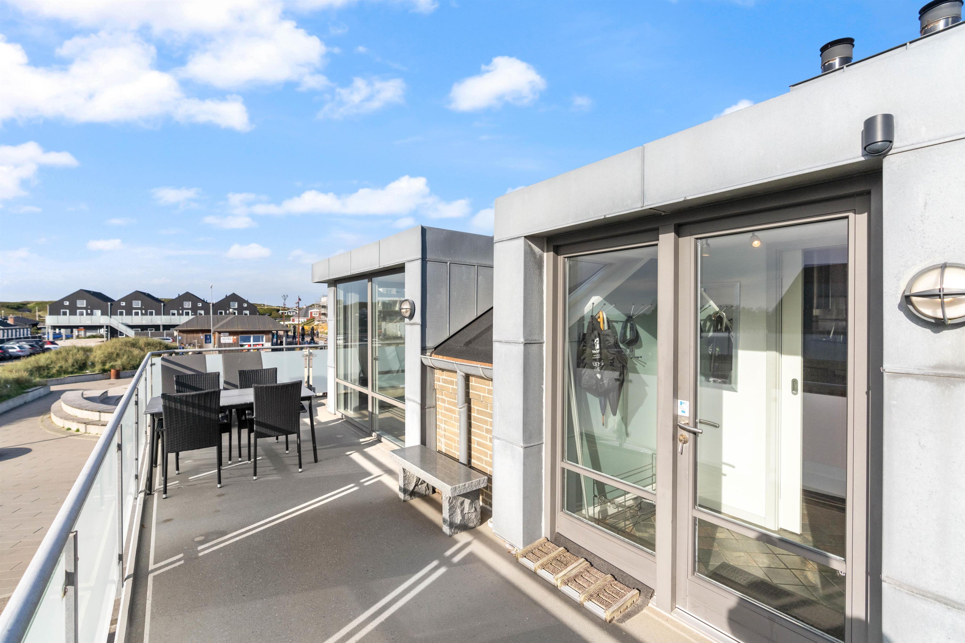 Fra stuen er der udgang til en dejlig udestue, hvor alle dørene ud til tagterrassen kan slås op. Tagterrassen er uden tvivl det perfekte sted at tilbringe de solrige dage på ferien. Her har I havemøbler til rådighed, så I kan finde jer godt til rette og slappe af i solen.