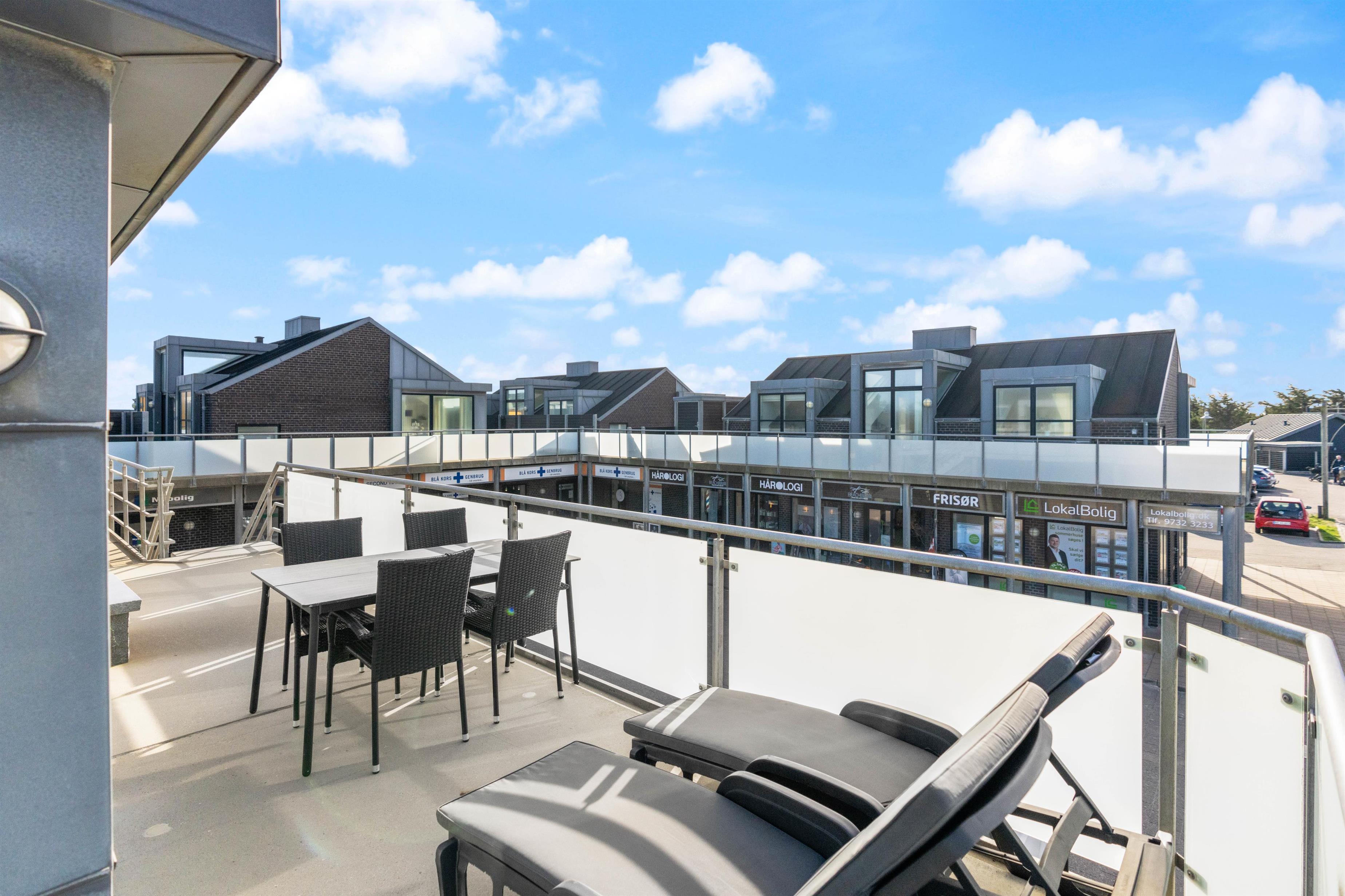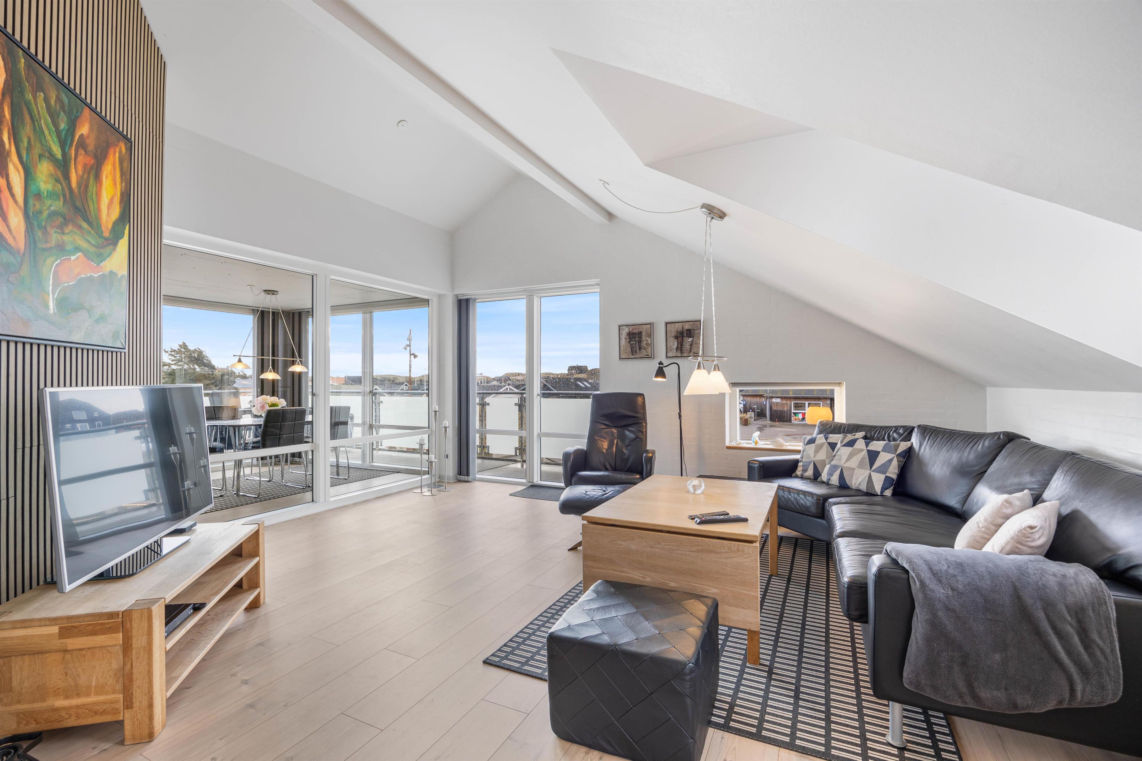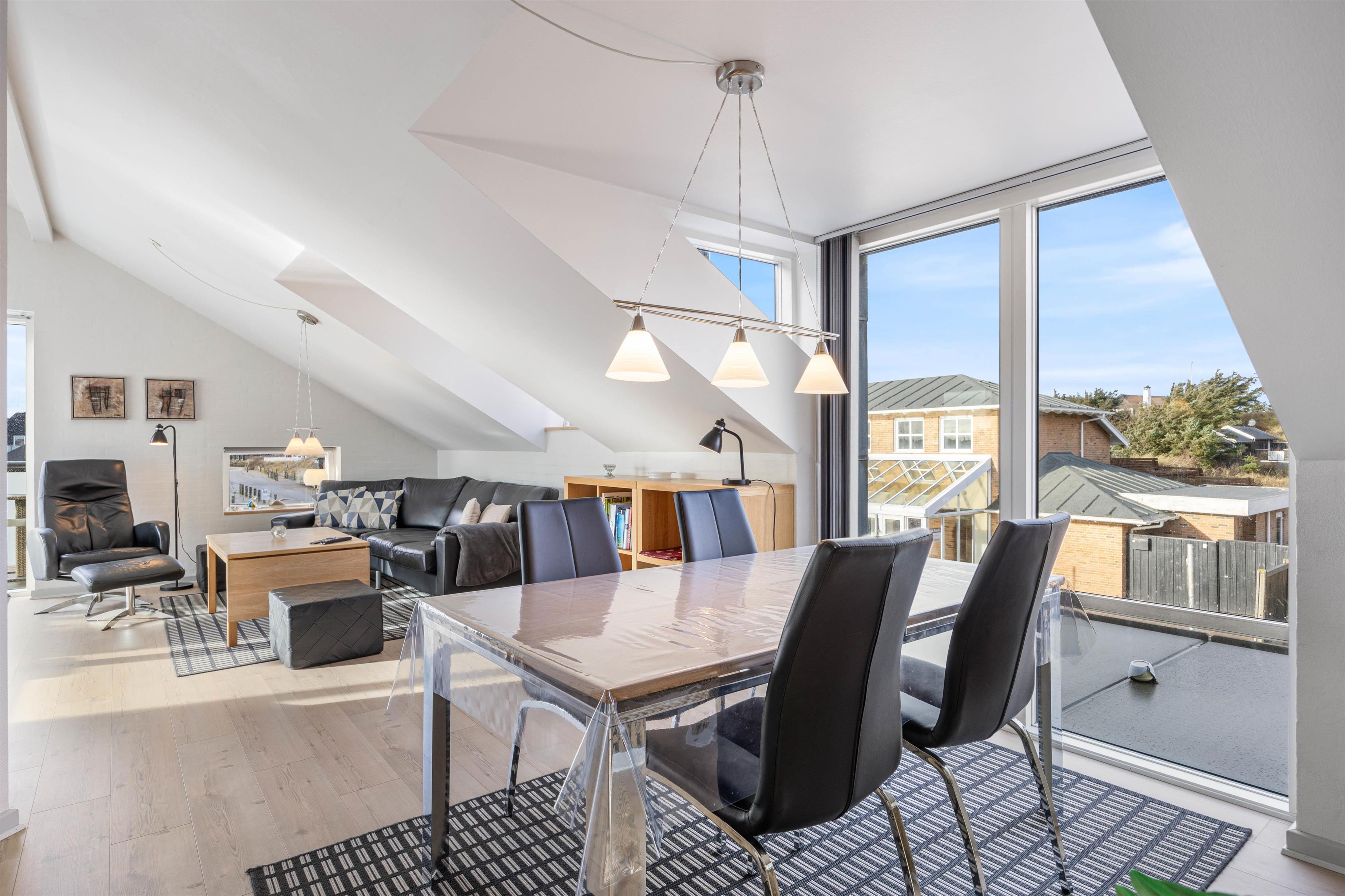 Fra stuen er der udgang til en dejlig udestue, hvor alle dørene ud til tagterrassen kan slås op. Tagterrassen er uden tvivl det perfekte sted at tilbringe de solrige dage på ferien. Her har I havemøbler til rådighed, så I kan finde jer godt til rette og slappe af i solen.