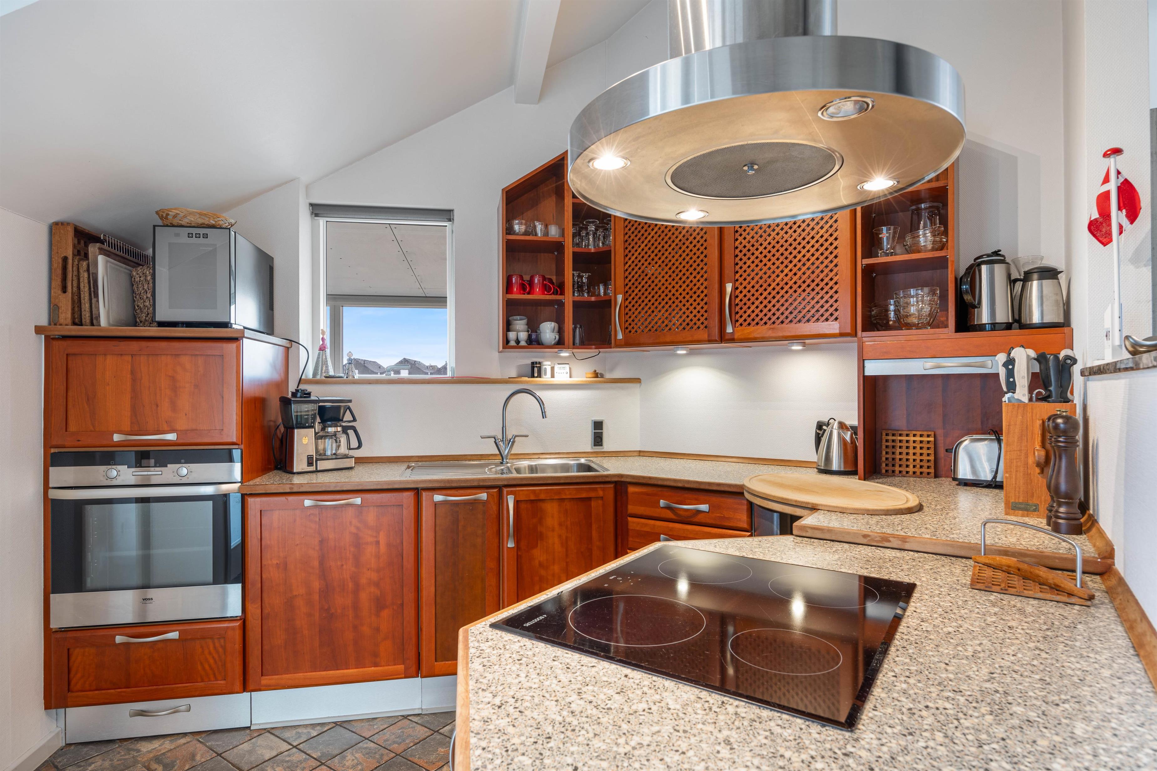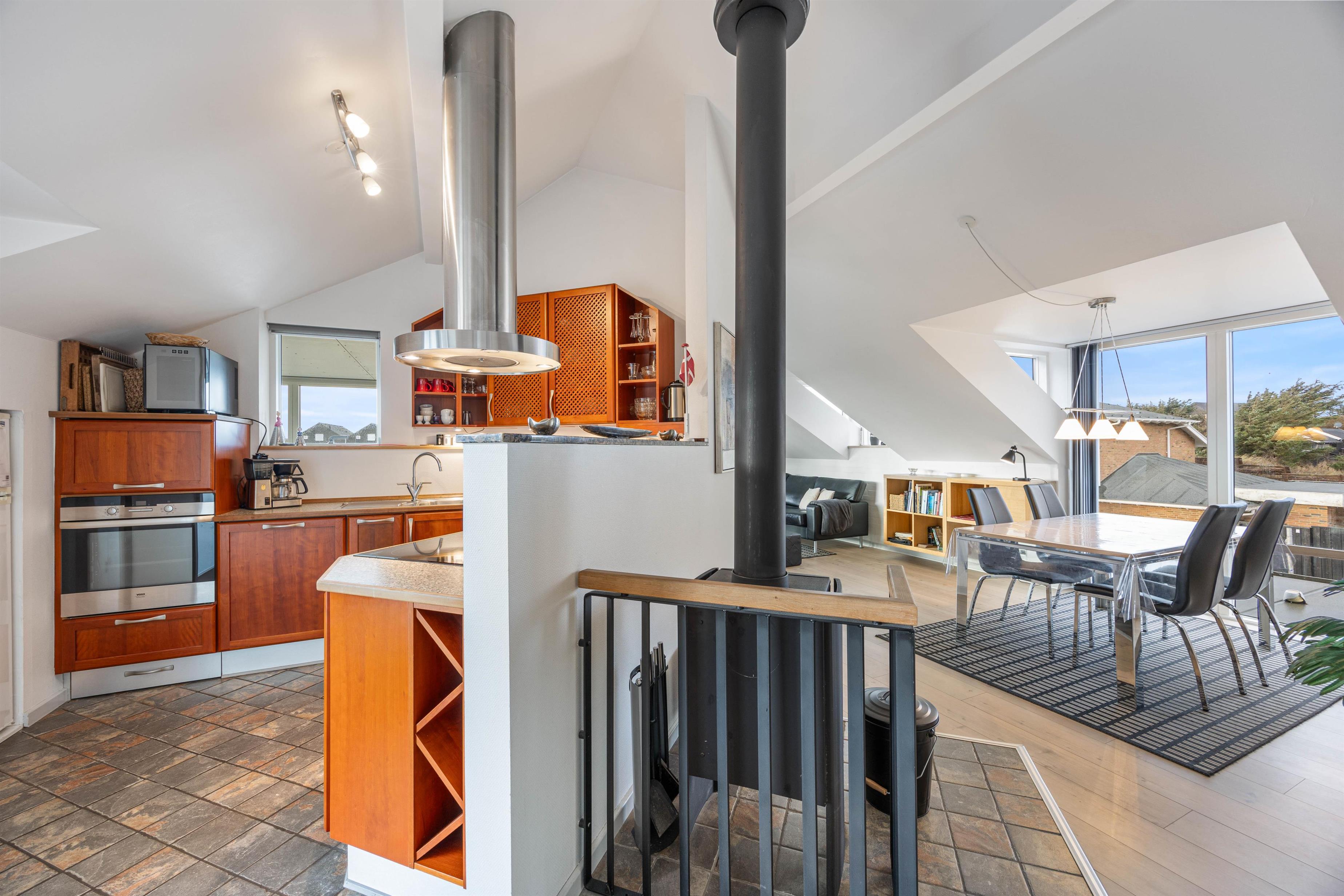 Køkkenet er lækkert og veludstyret med blandt andet opvaskemaskine og mikroovn. Køkkenet ligger i åben forbindelse med den lyse og rummelige spise- og opholdsstue. I stuen er der lagt op til mange hyggelige stunder med gode film i tv’et eller sjove spil omkring bordet. Den gode brændeovn skruer op for hyggen og varmen med sin knitren i baggrunden. Ellers sørger den energivenlige varmepumpe for, at I altid har et godt indeklima.