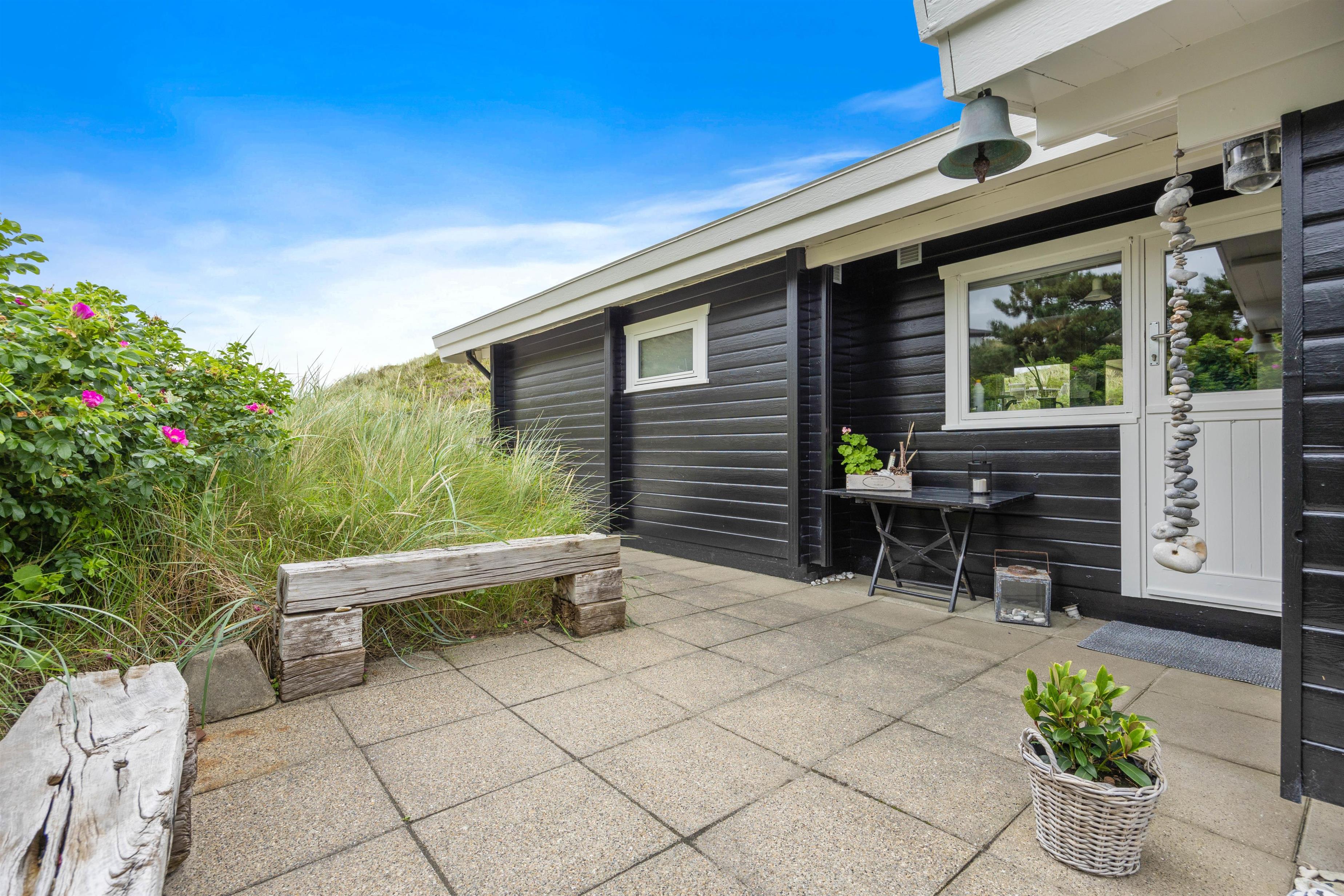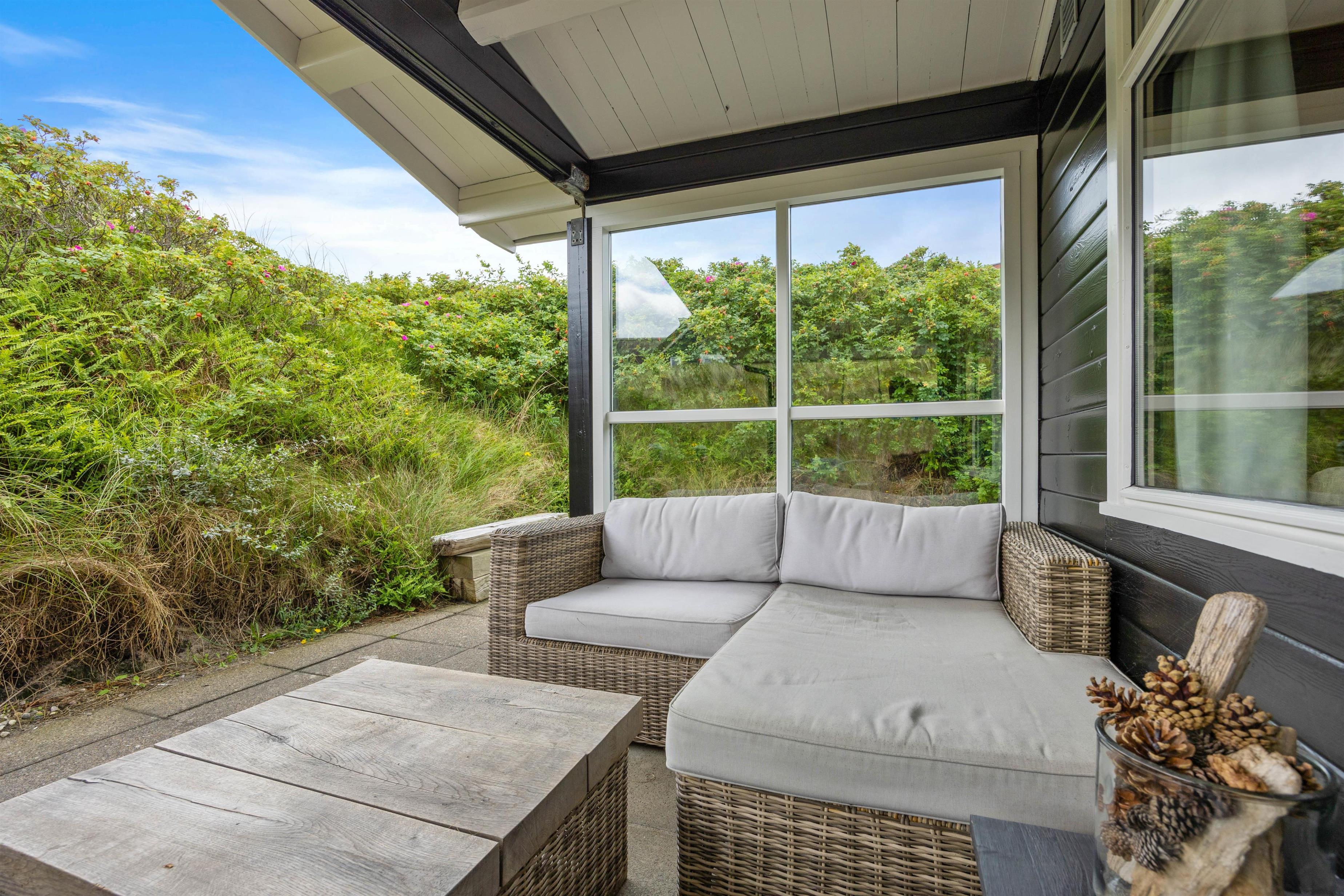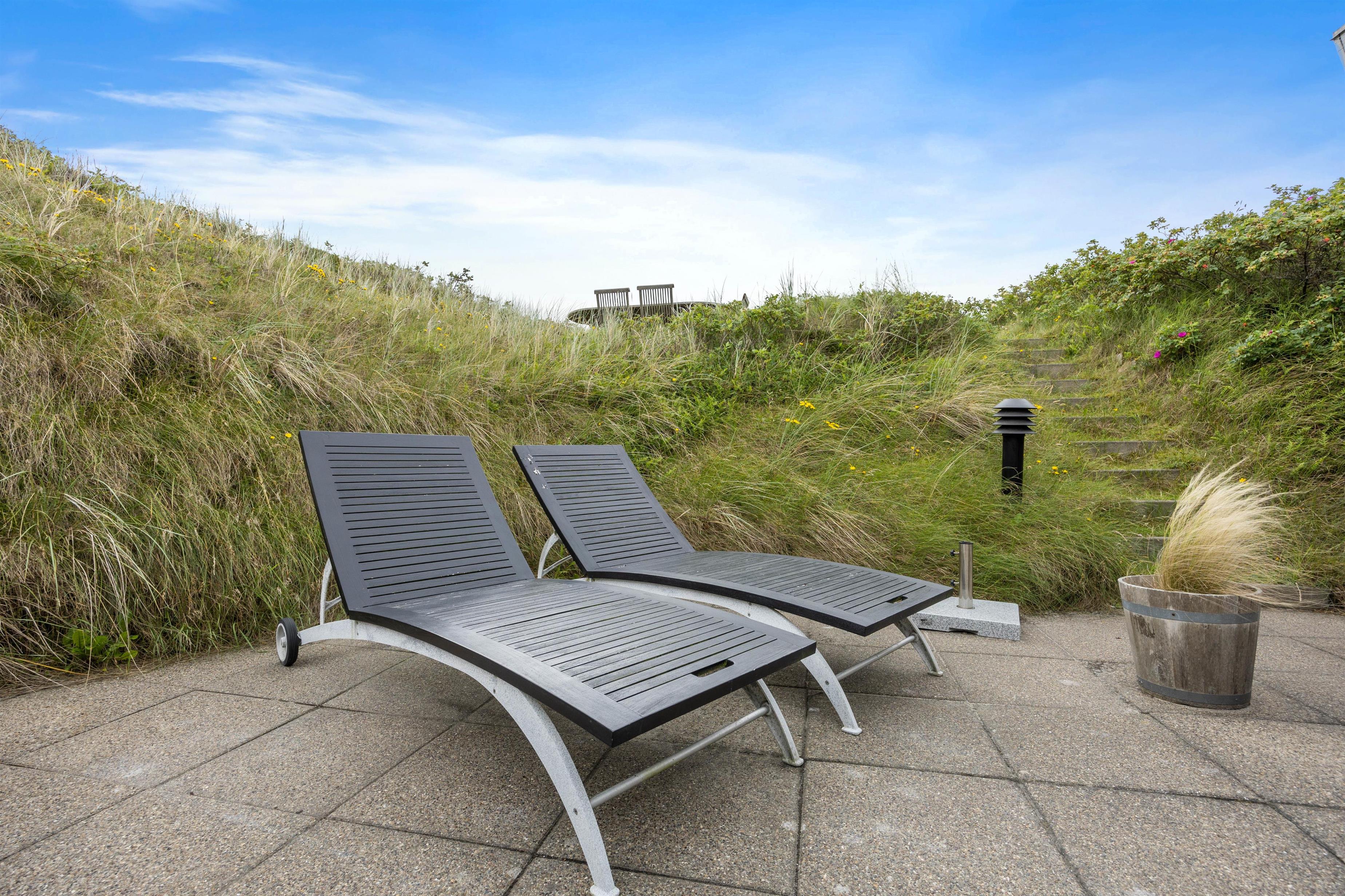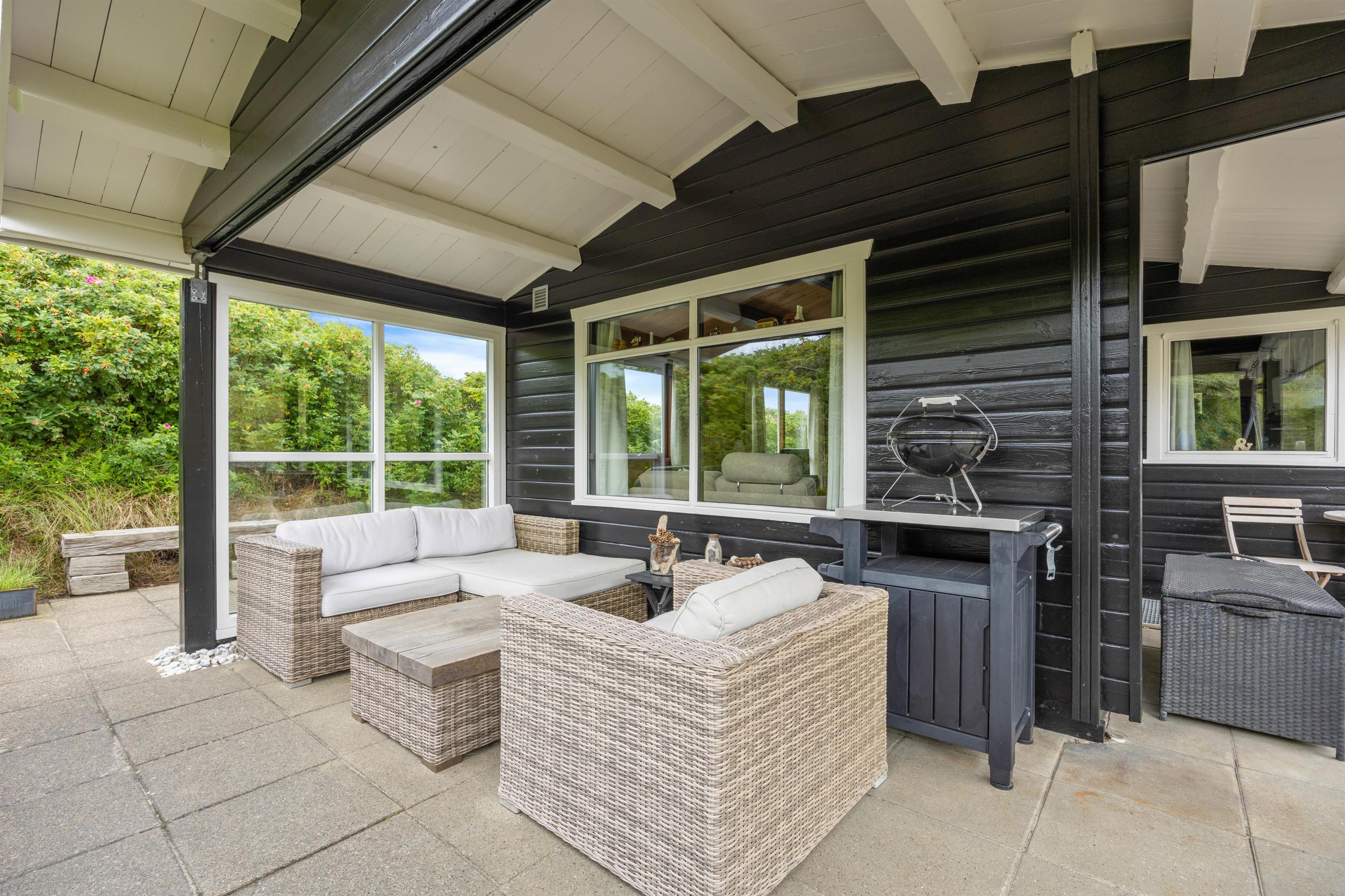 Husets største terrasse mod syd er godt i læ af klitten og huset, så her vil I nemt kunne finde en lækrog, og skulle der falde en dråbe sommerregn kan I krybe ind i læ i loungemøblerne på den overdækkede terrasse.